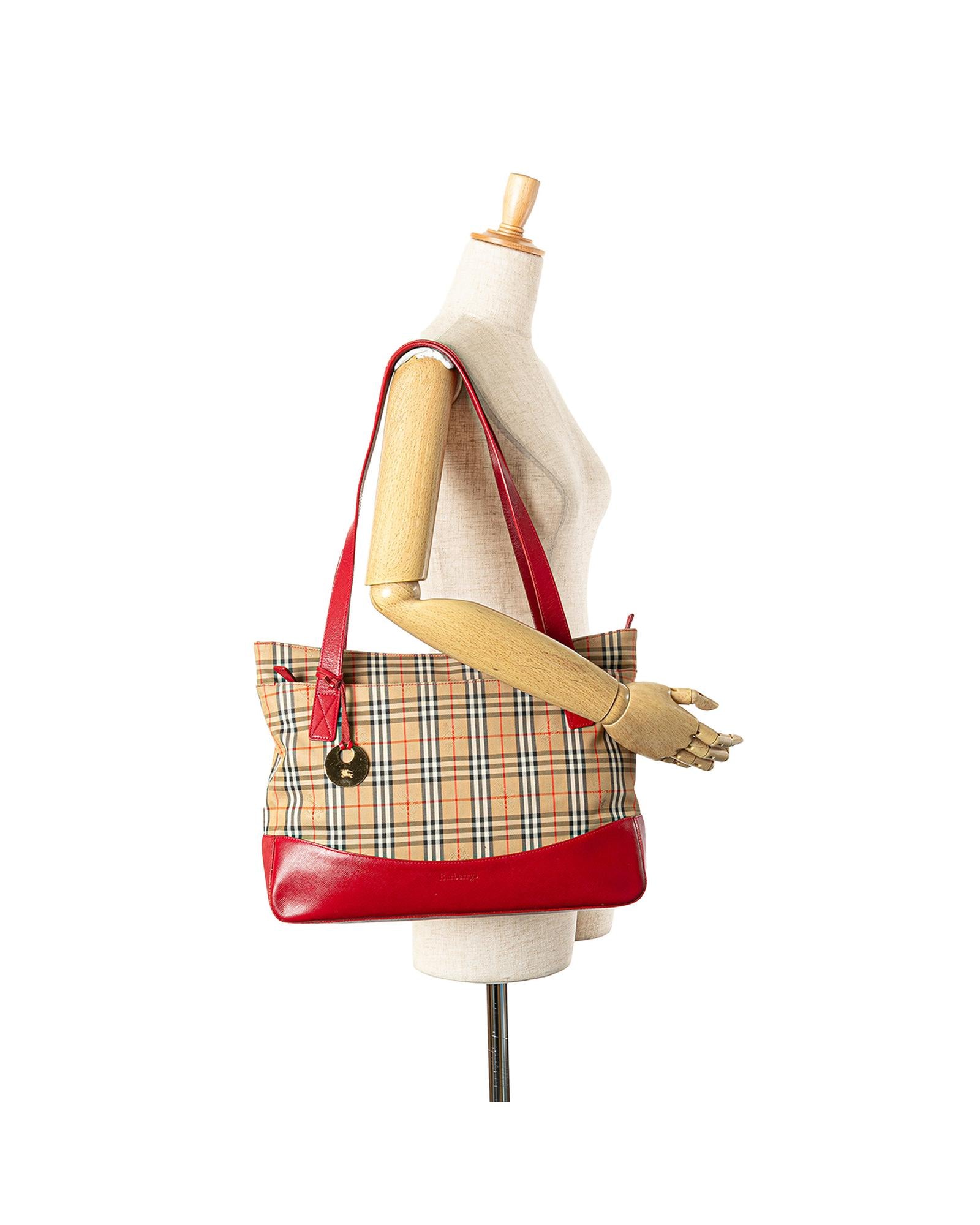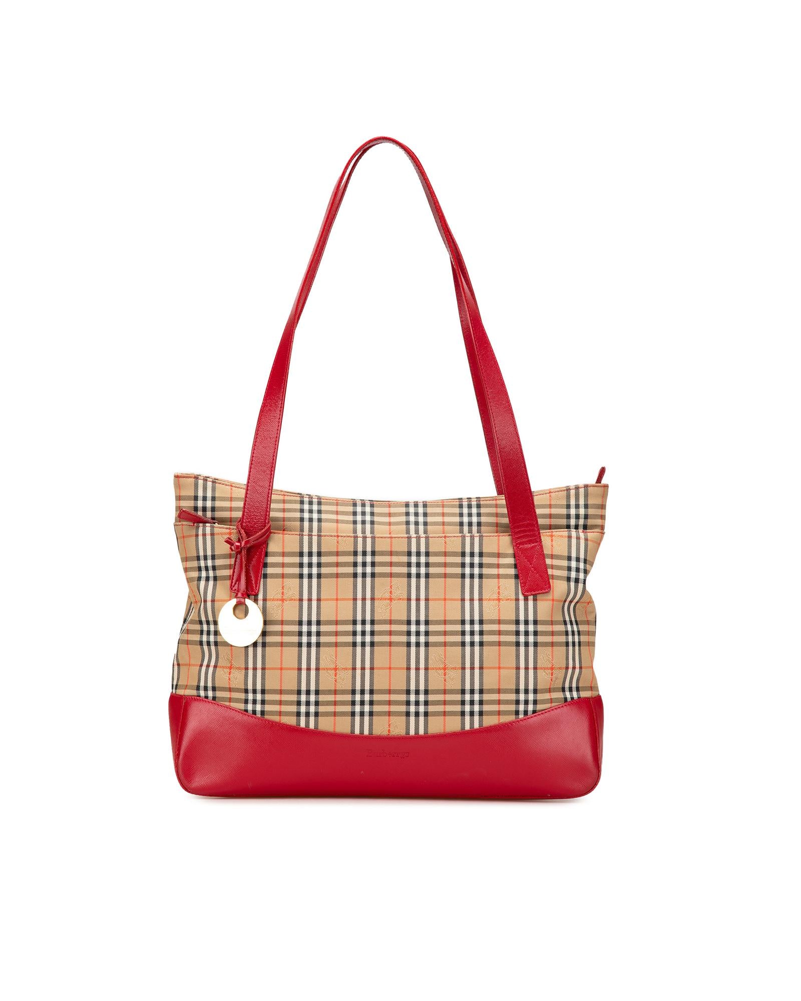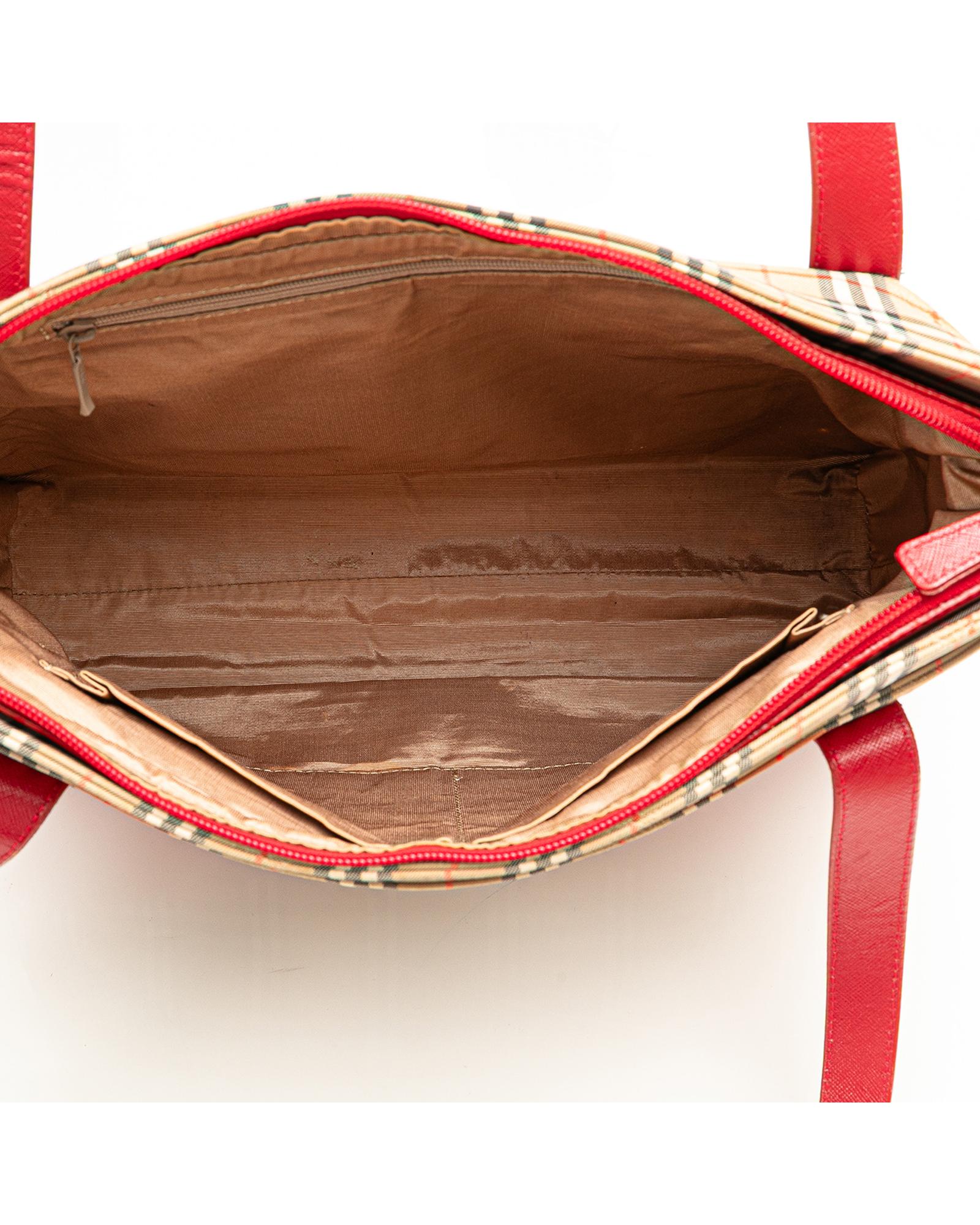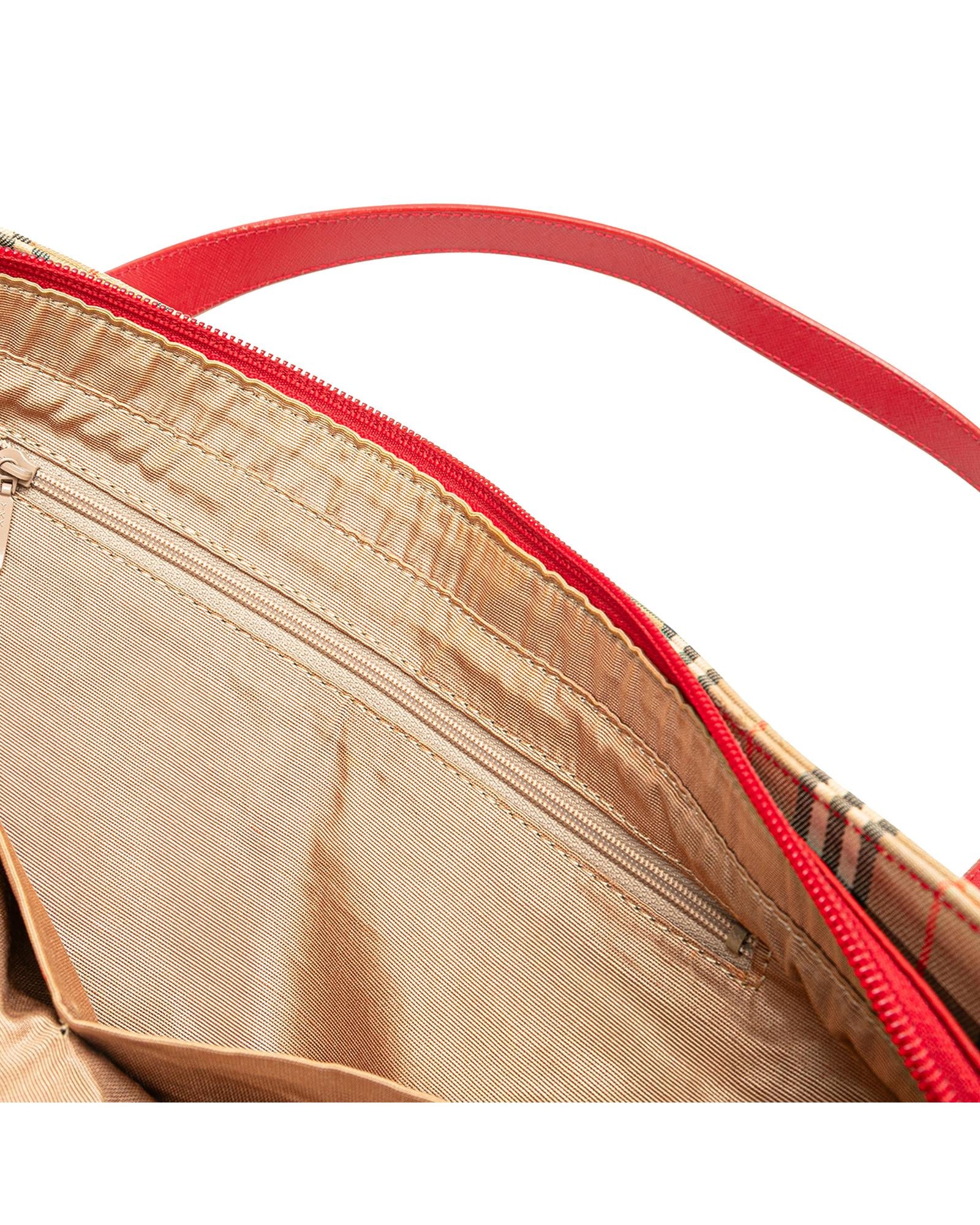 This tote bag features a haymarket check canvas body with leather trim flat leather straps a top zip closure an exterior front zip compartment and interior zip and slip pockets.Brand: Burberry Vintage