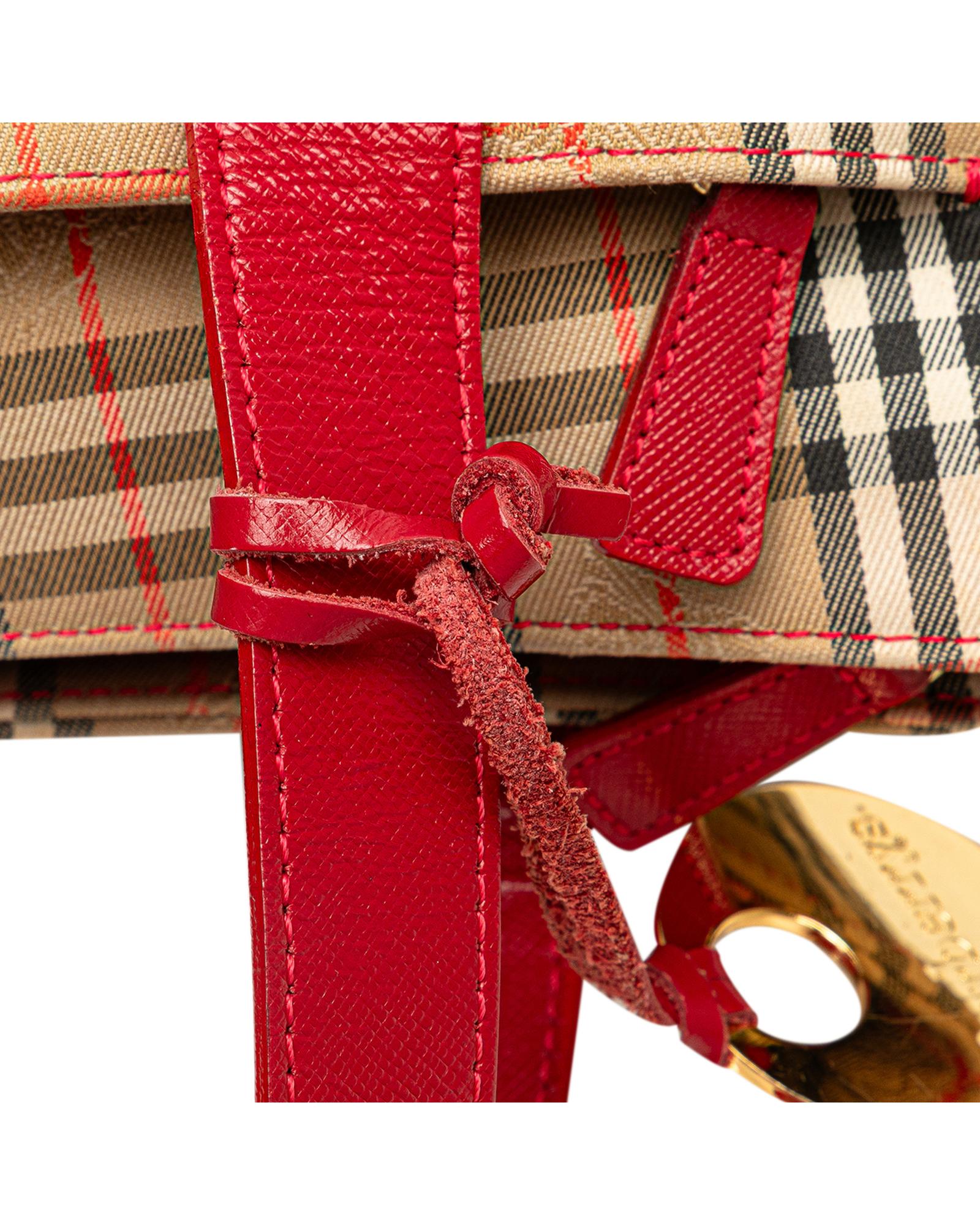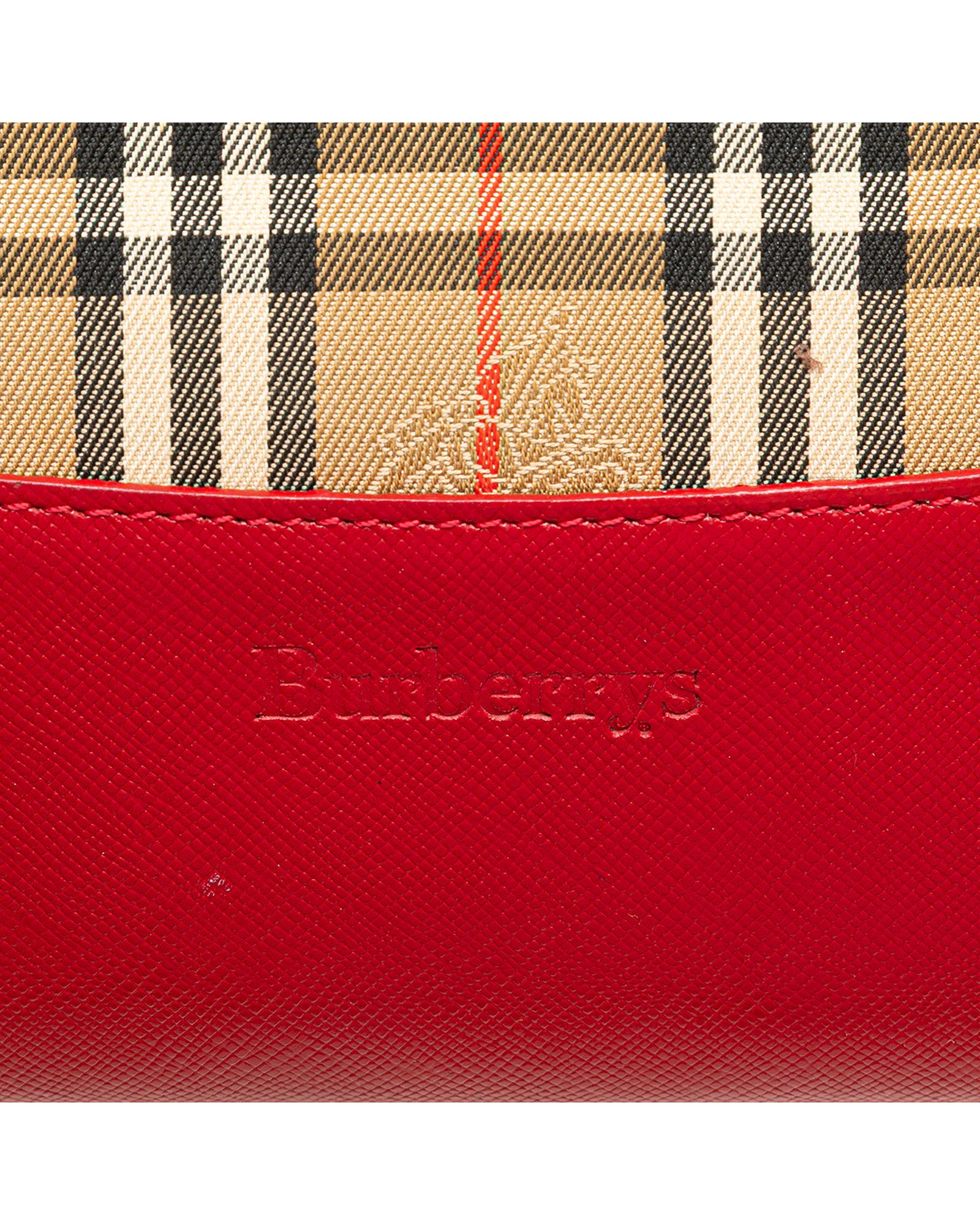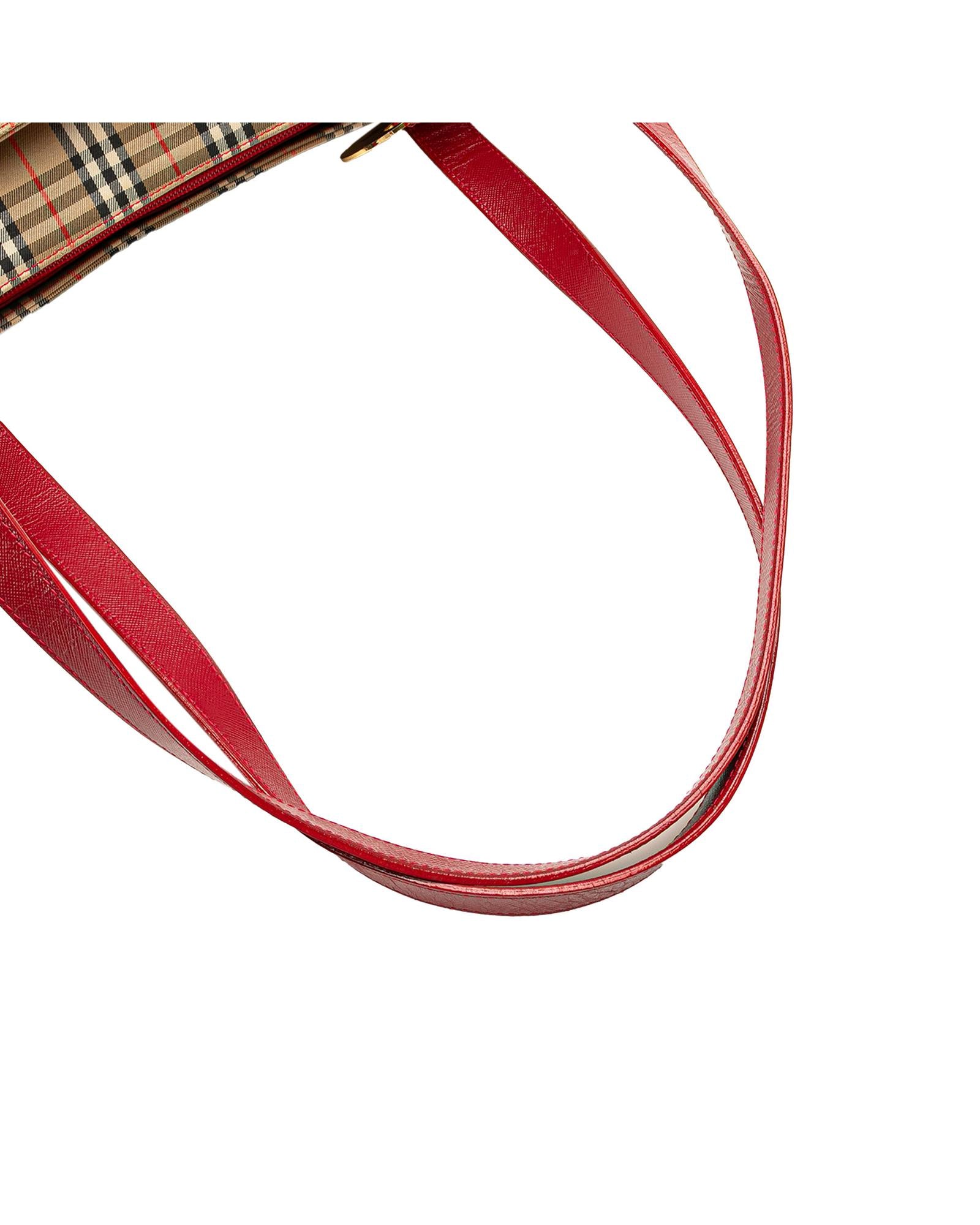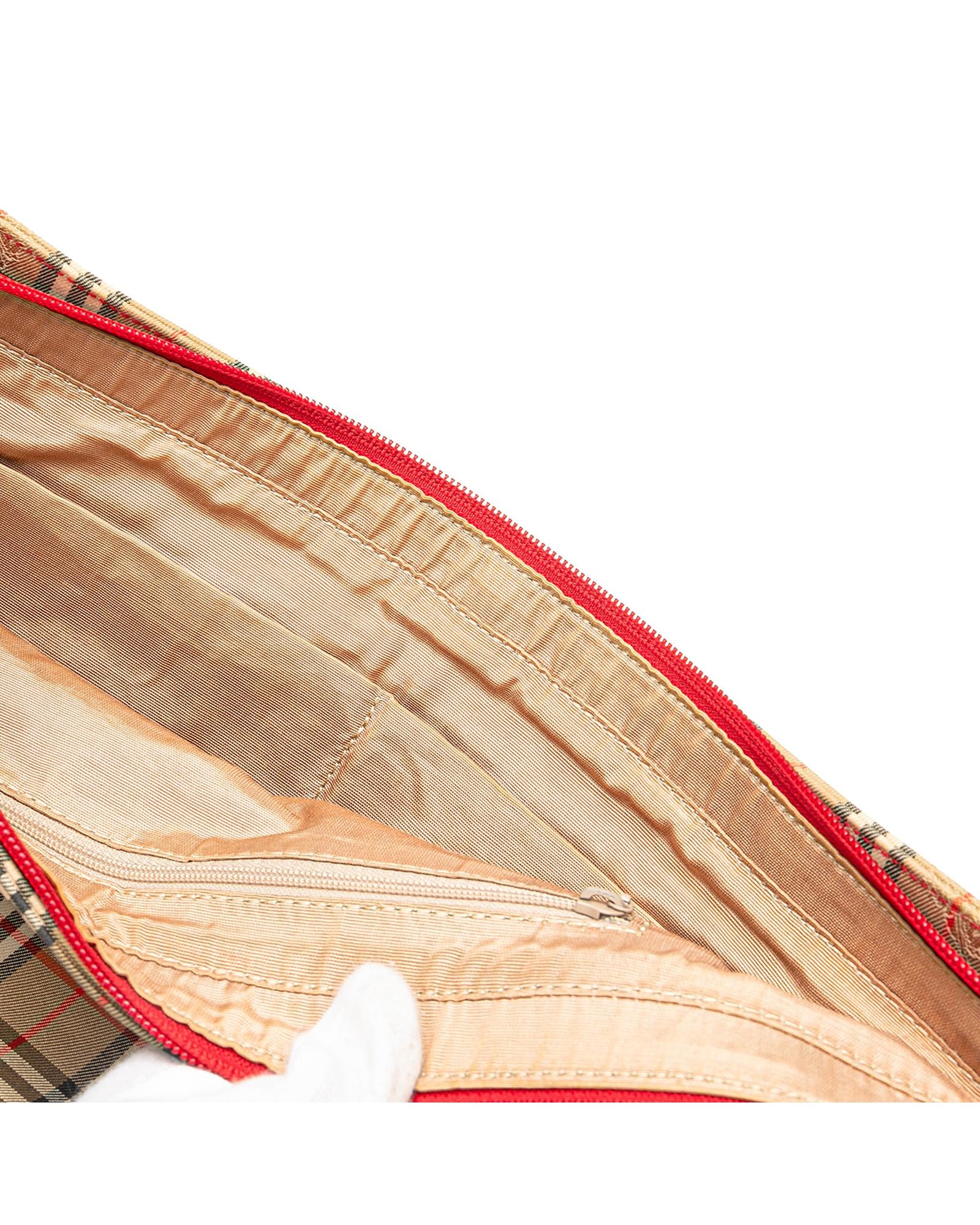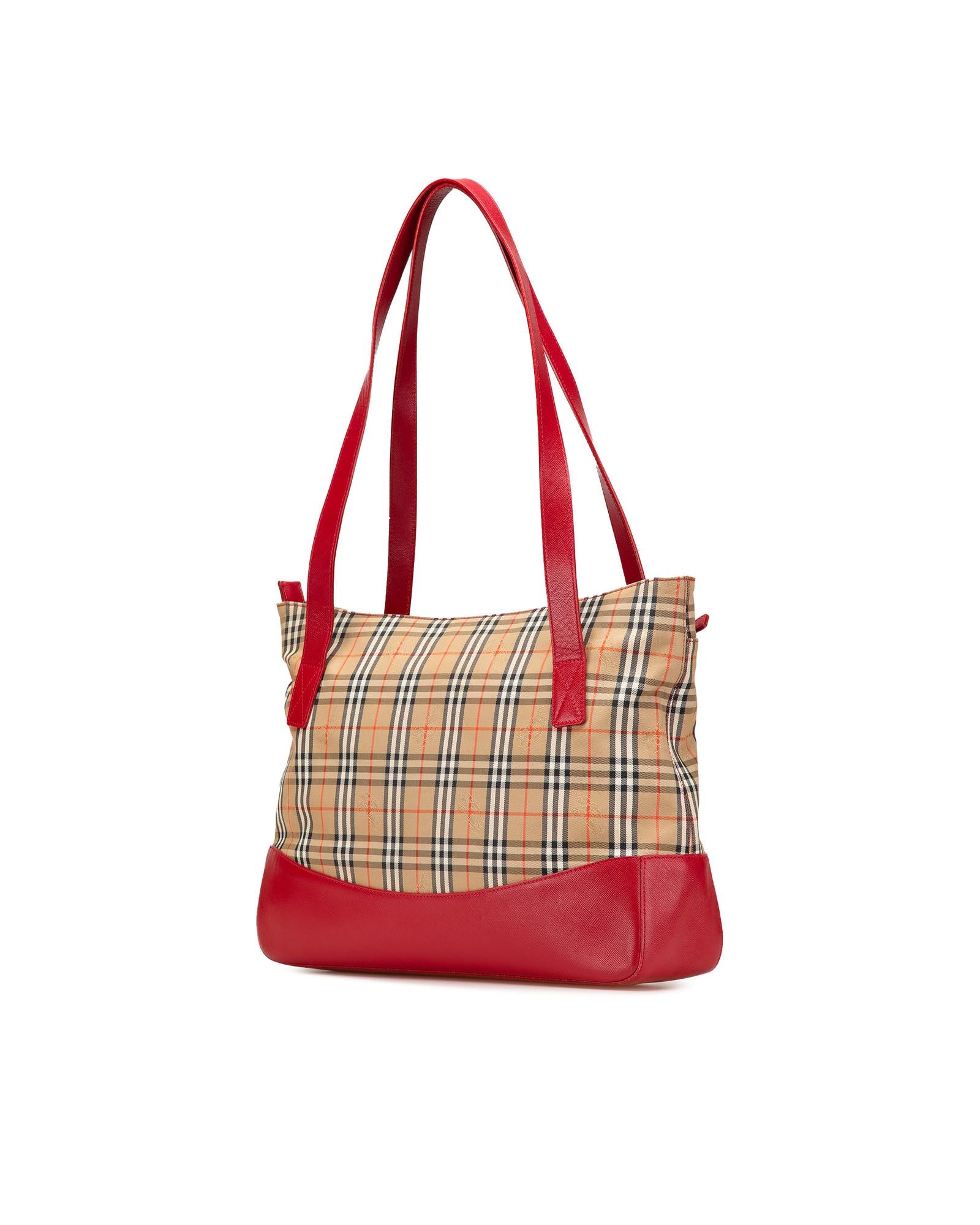 This tote bag features a haymarket check canvas body with leather trim flat leather straps a top zip closure an exterior front zip compartment and interior zip and slip pockets.Brand: Burberry Vintage