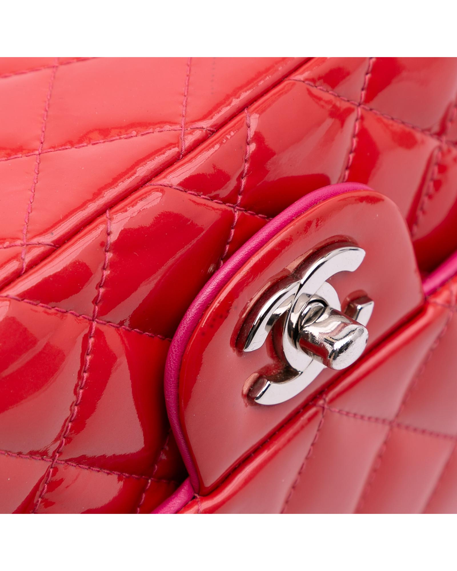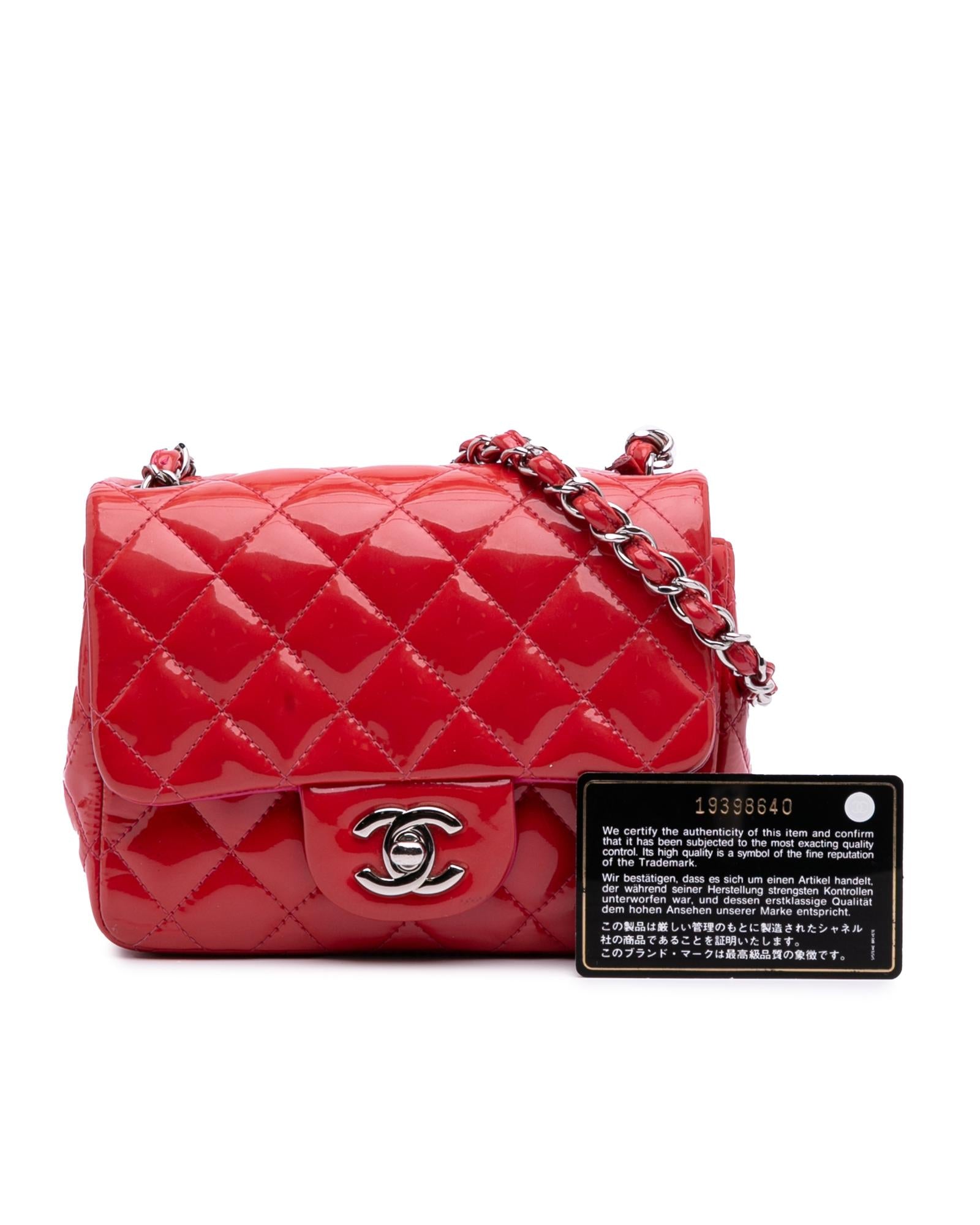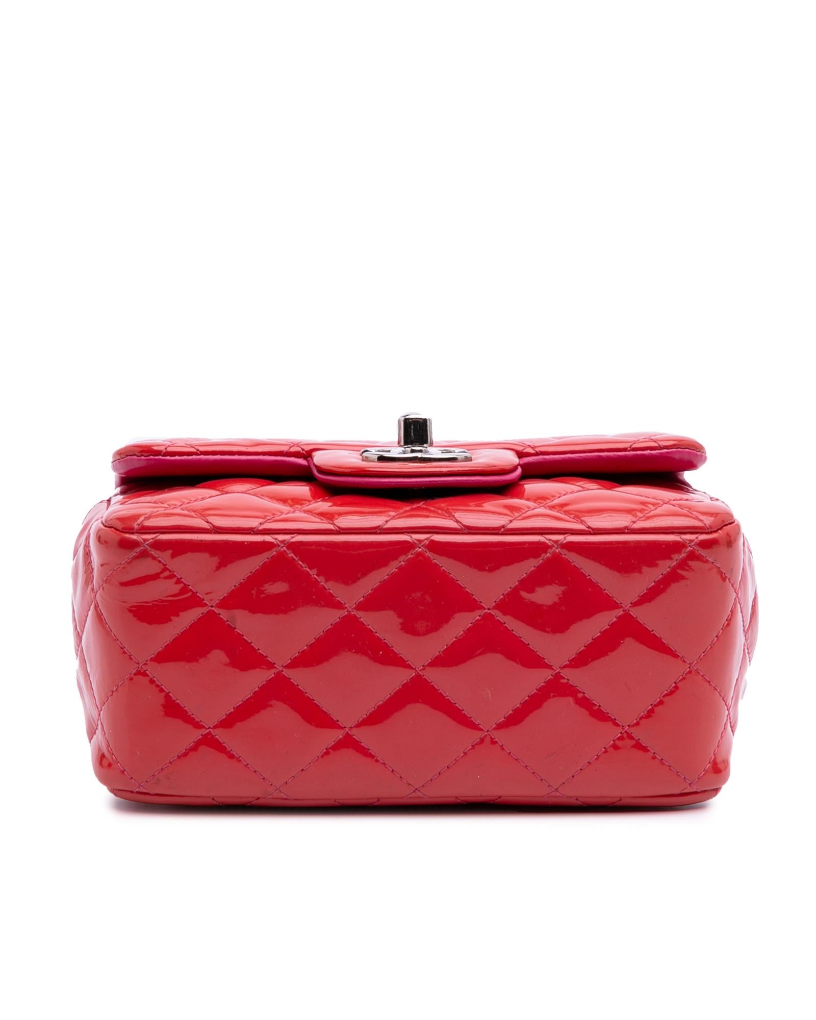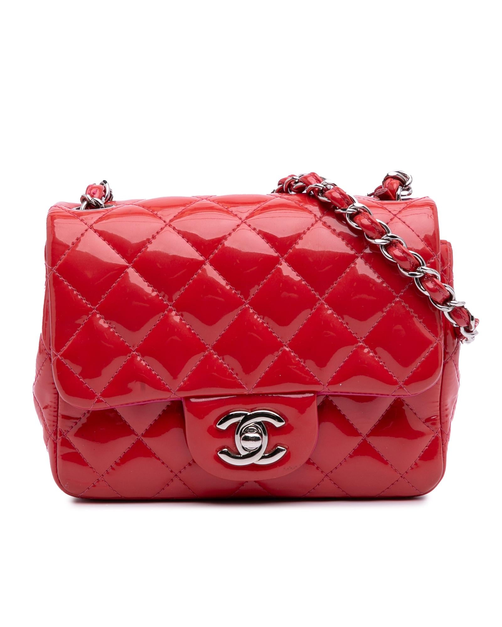 This flap bag features a quilted patent leather body a leather woven chain shoulder strap a front flap with interlocking Cs and a twist lock closure and interior zip and slip pockets.Brand: Chanel