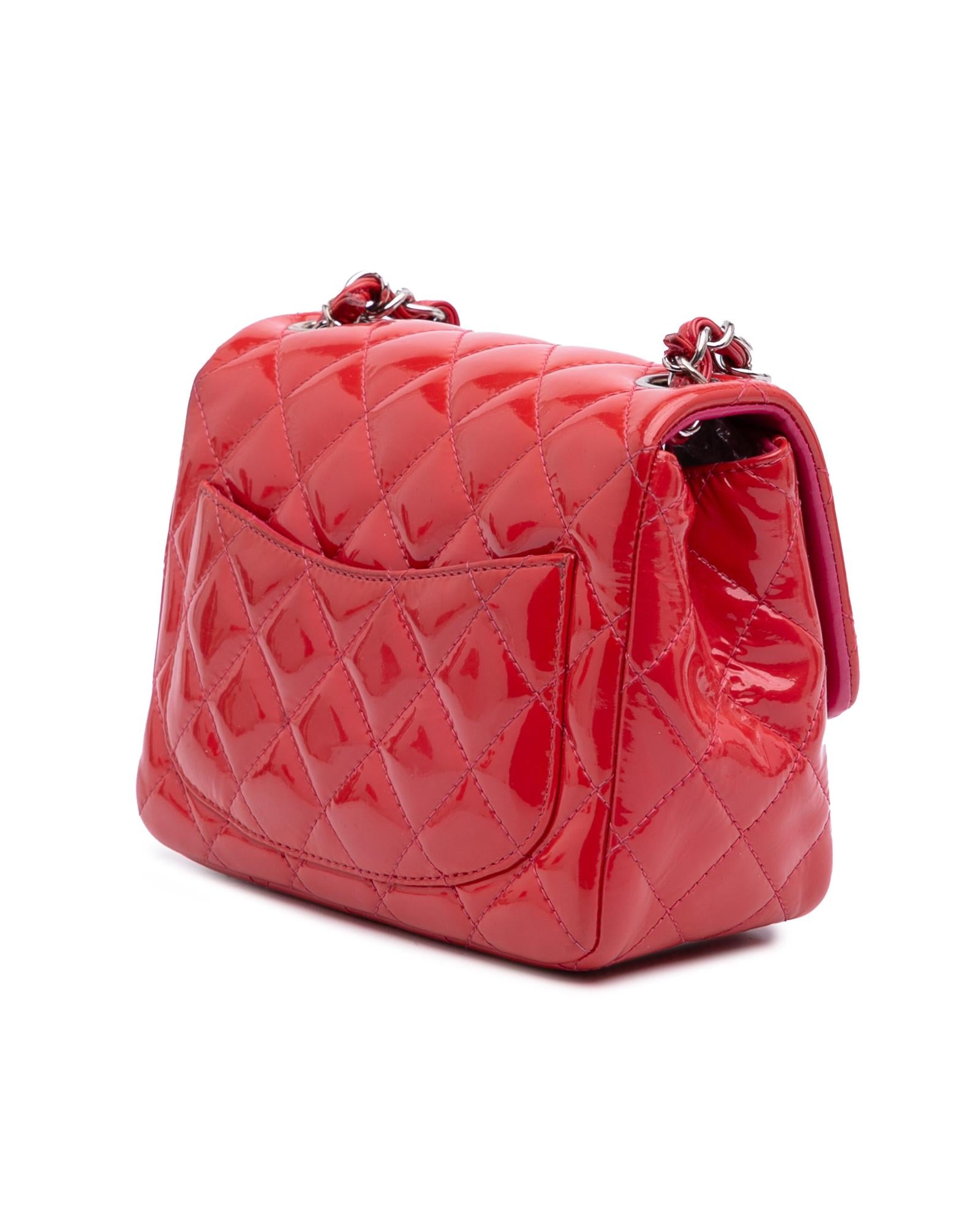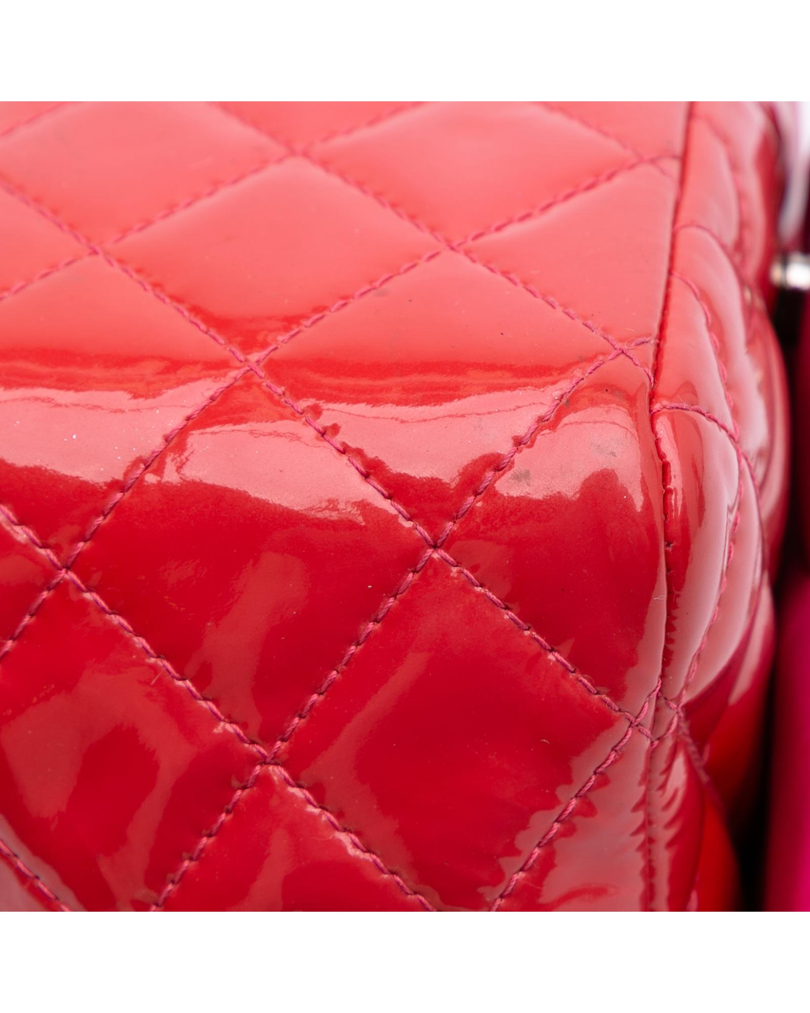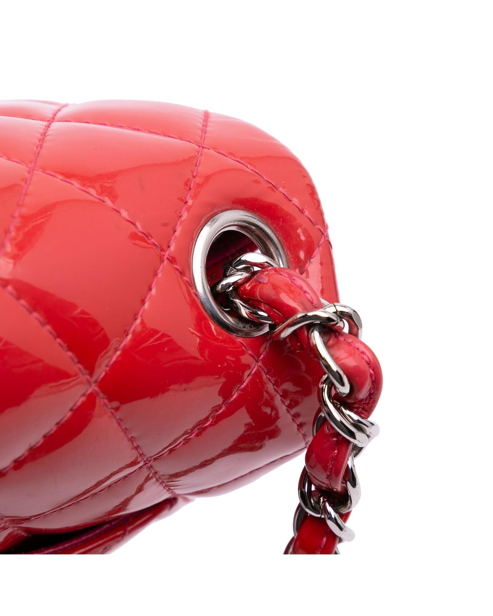 This flap bag features a quilted patent leather body a leather woven chain shoulder strap a front flap with interlocking Cs and a twist lock closure and interior zip and slip pockets.Brand: Chanel