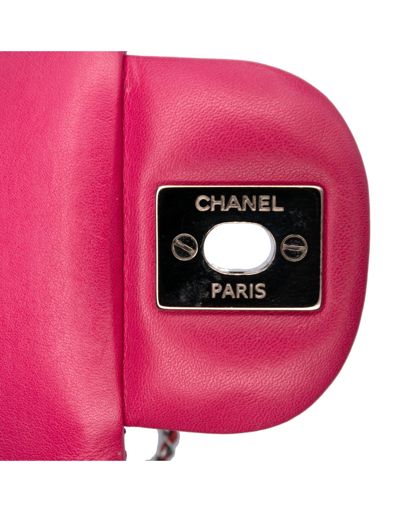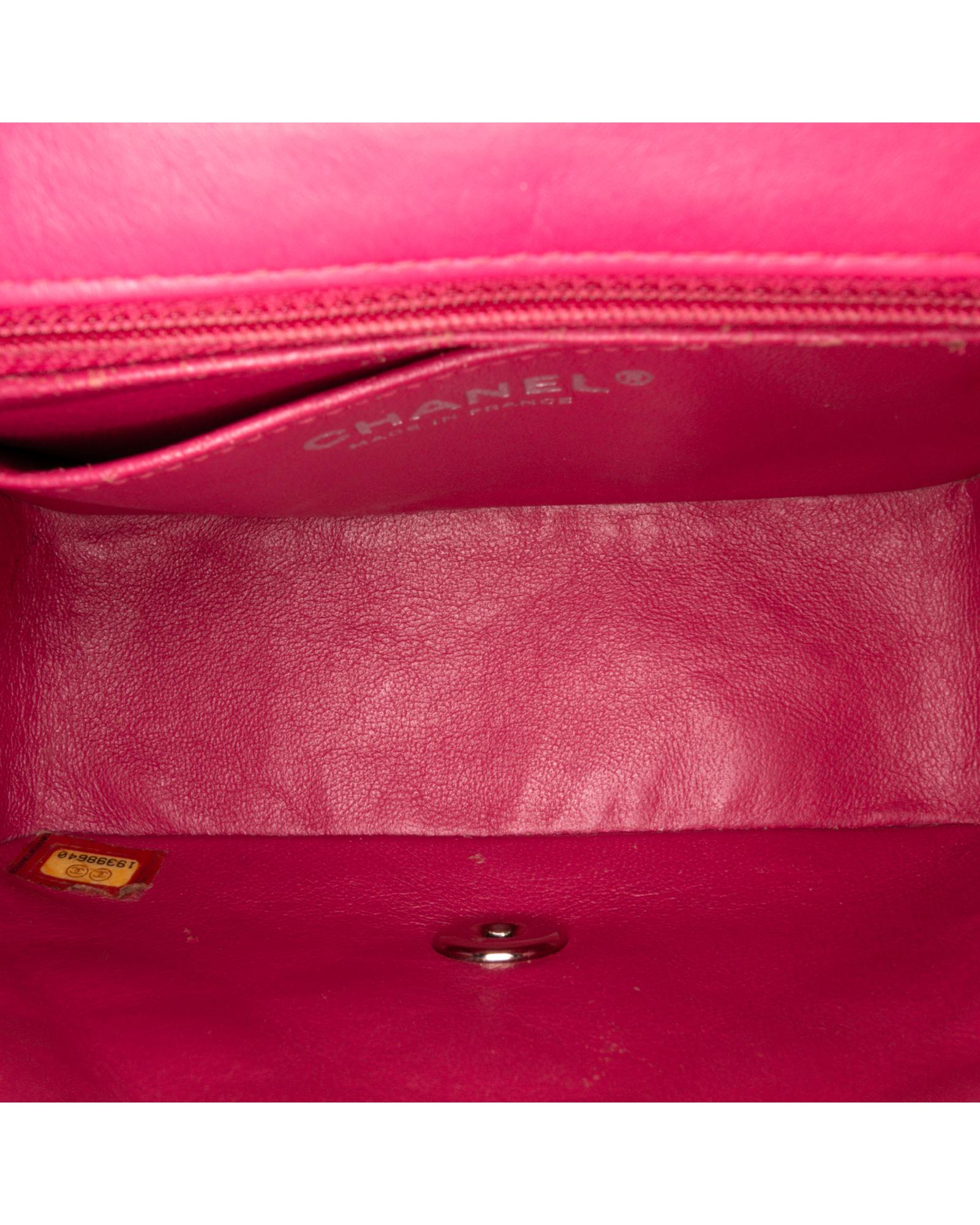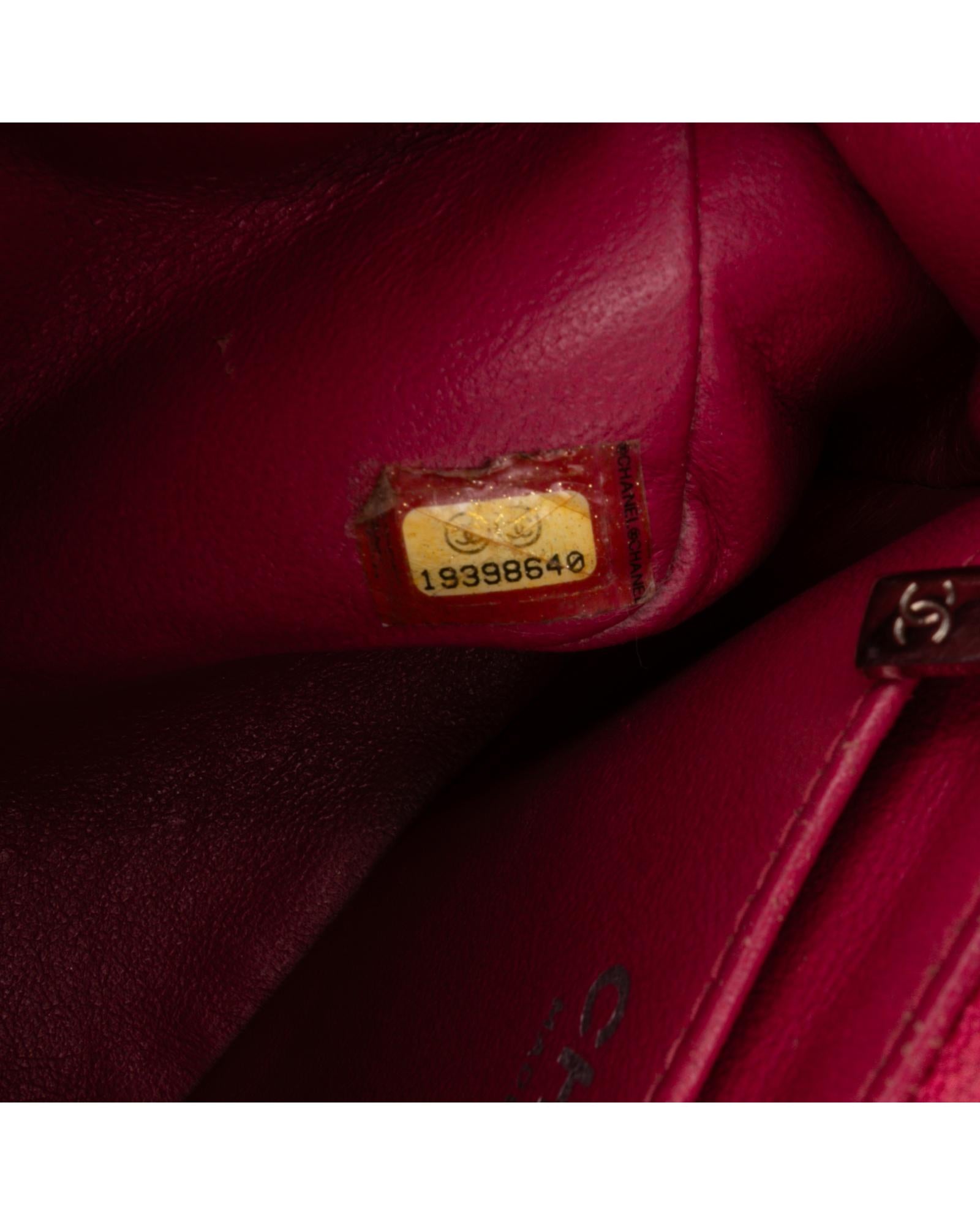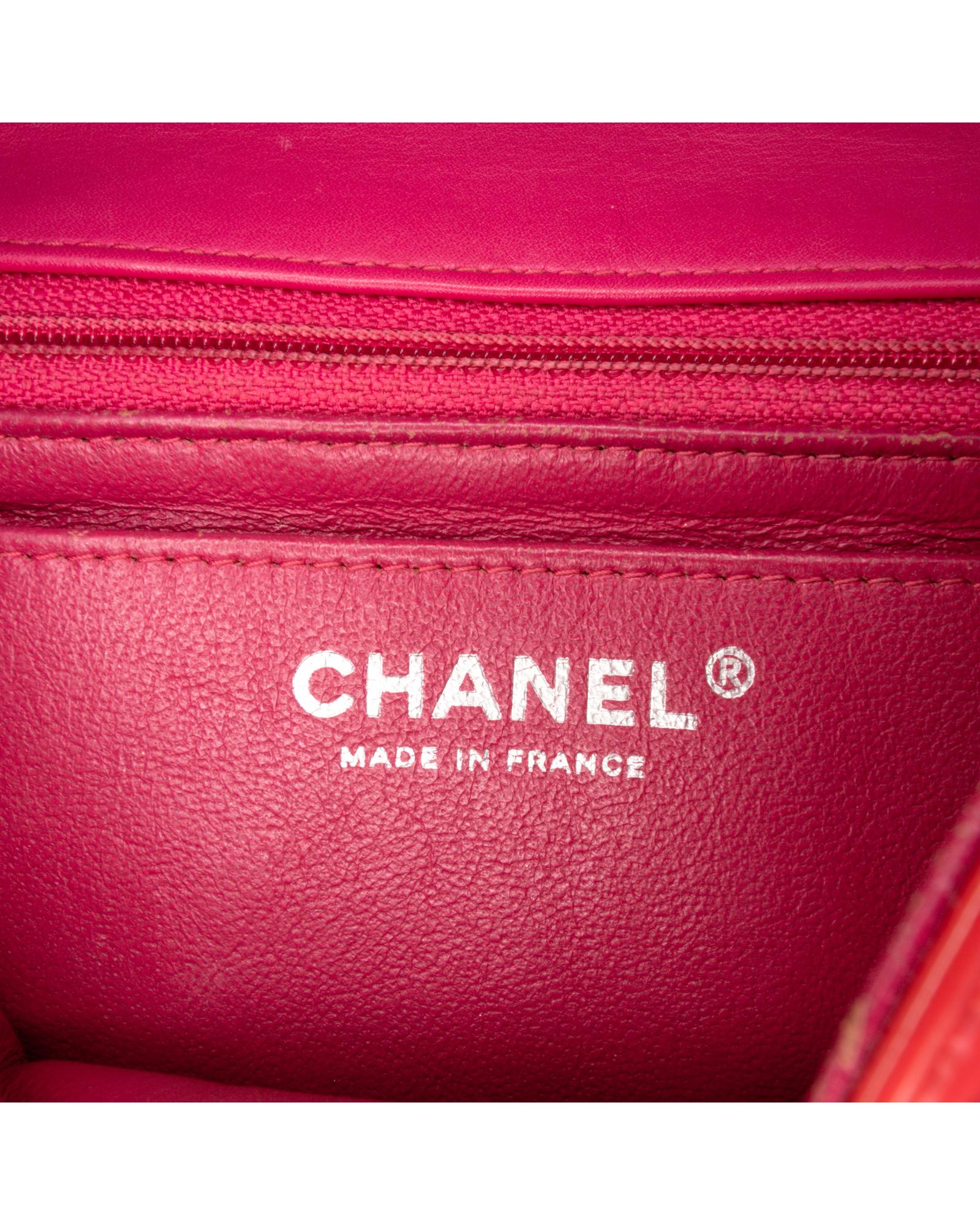This flap bag features a quilted patent leather body a leather woven chain shoulder strap a front flap with interlocking Cs and a twist lock closure and interior zip and slip pockets.Brand: Chanel
