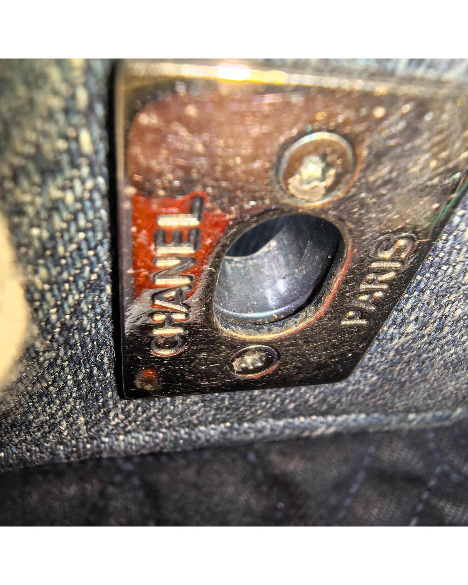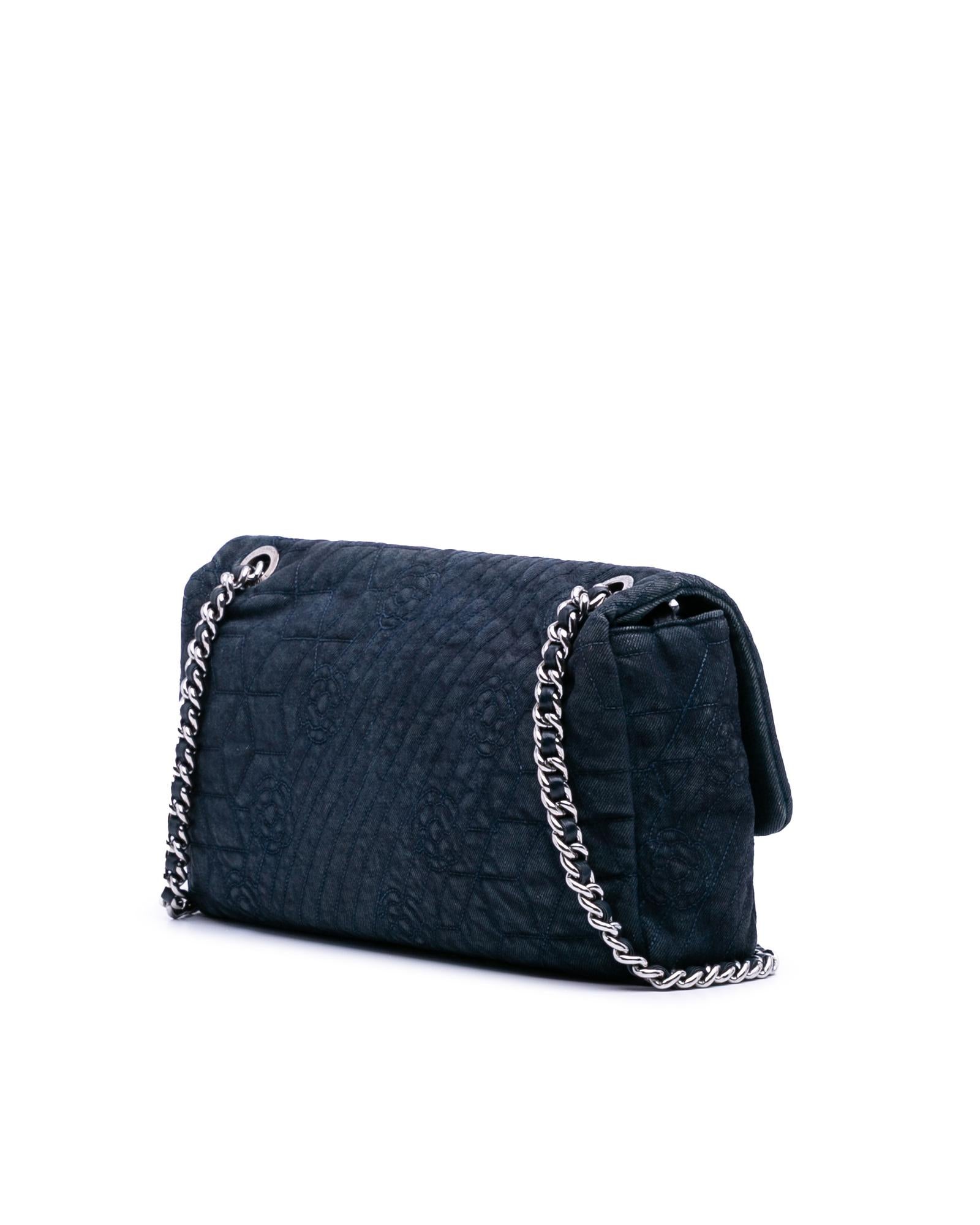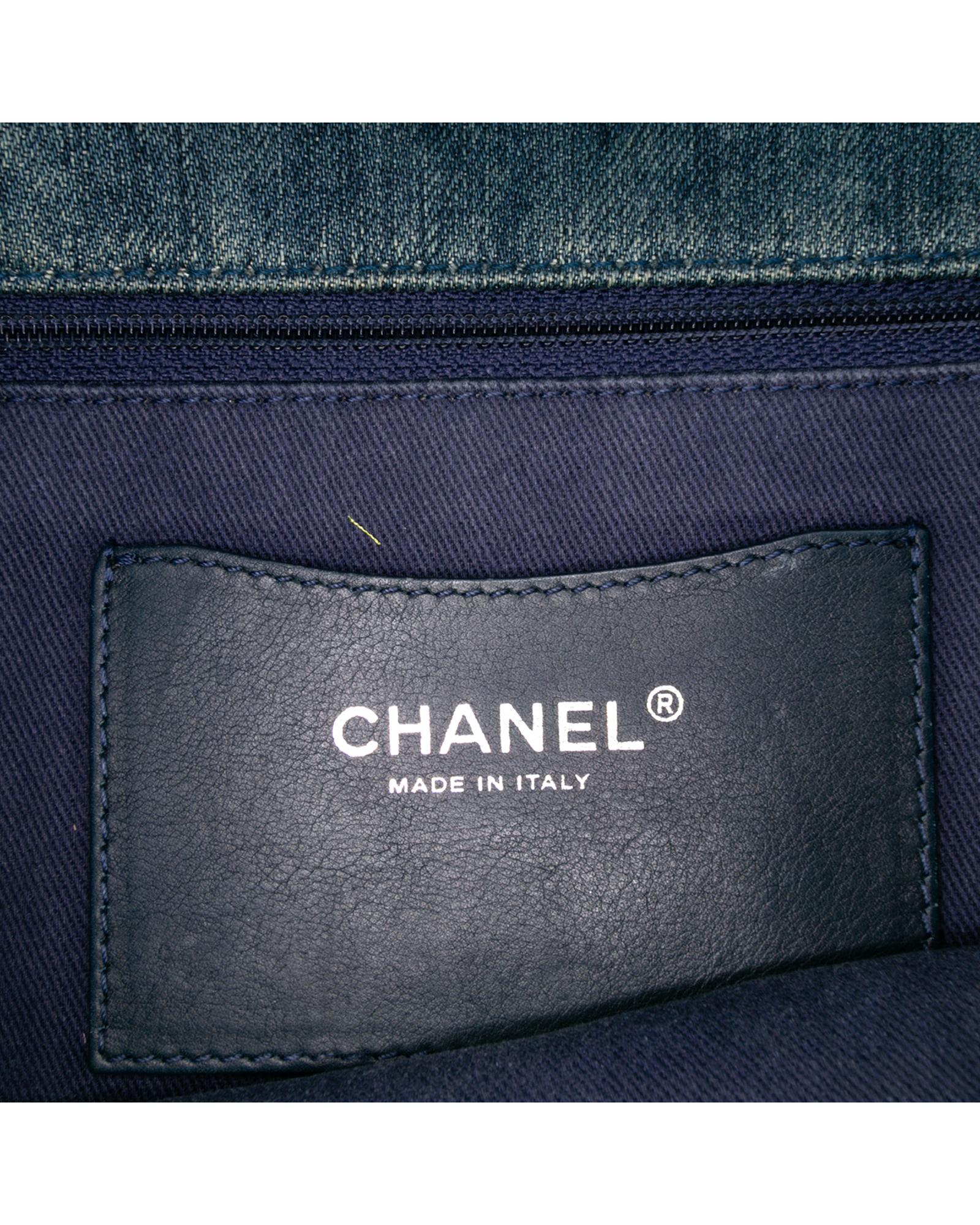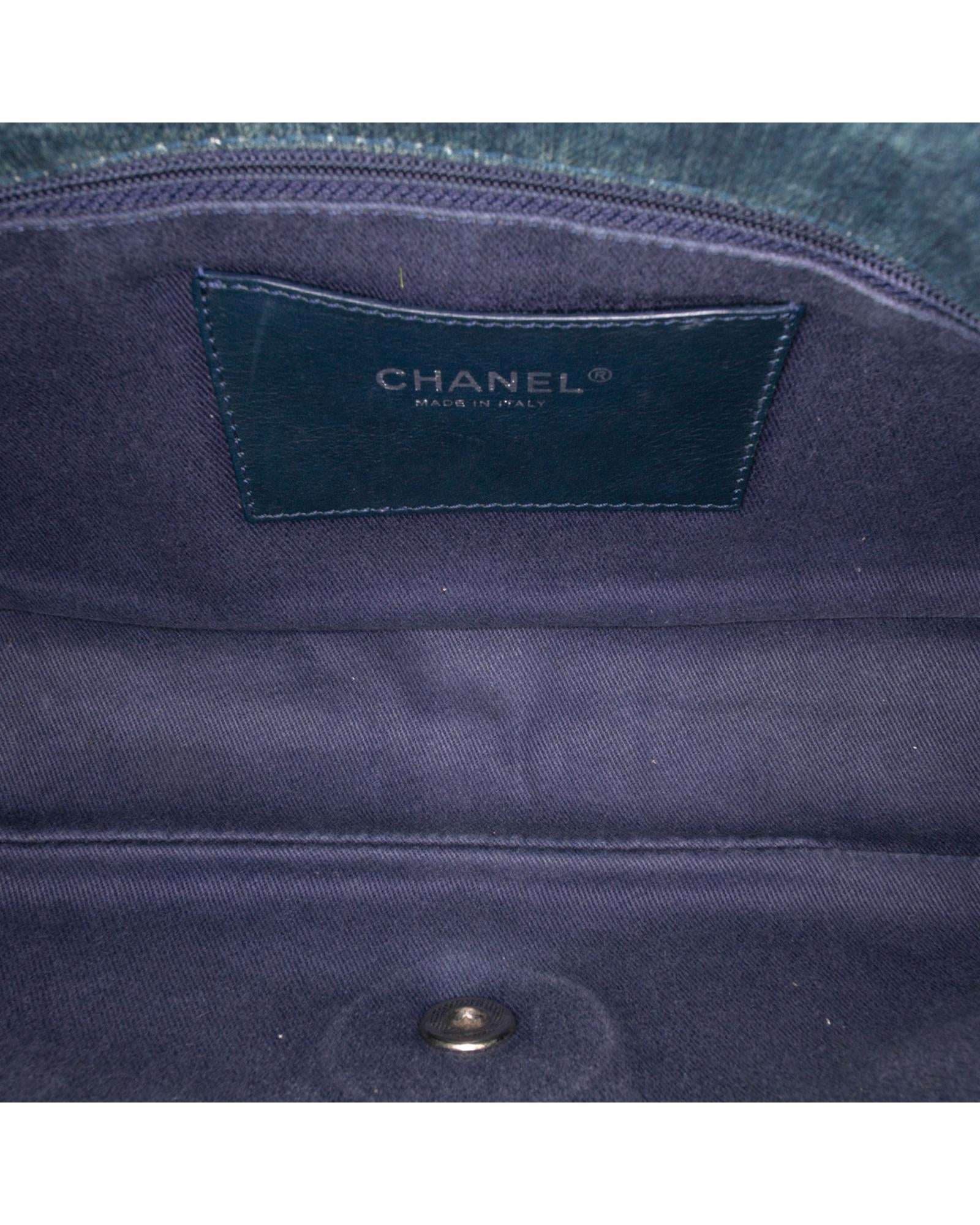 This crossbody bag features an embroidered denim body a leather-woven chain strap with leather shoulder guard a flap with CC turn lock closure and interior zip and slip pockets. Exterior front and lining are repainted.Brand: Chanel