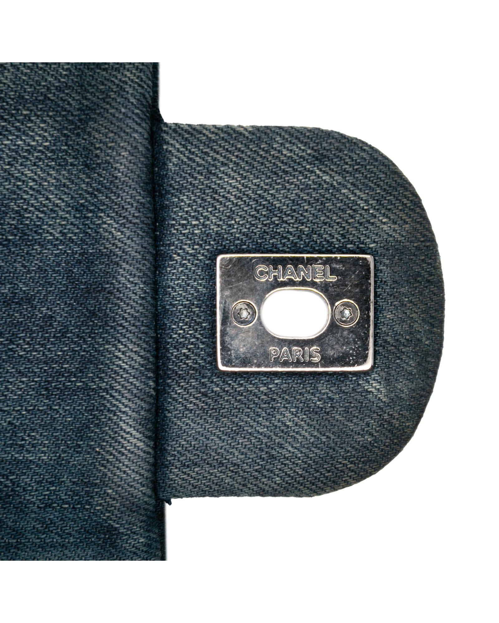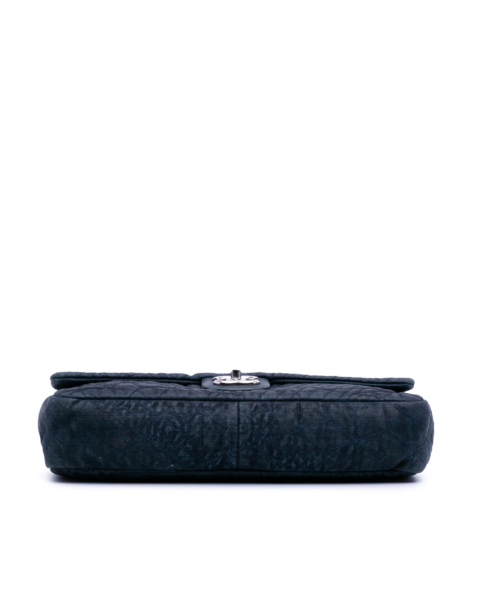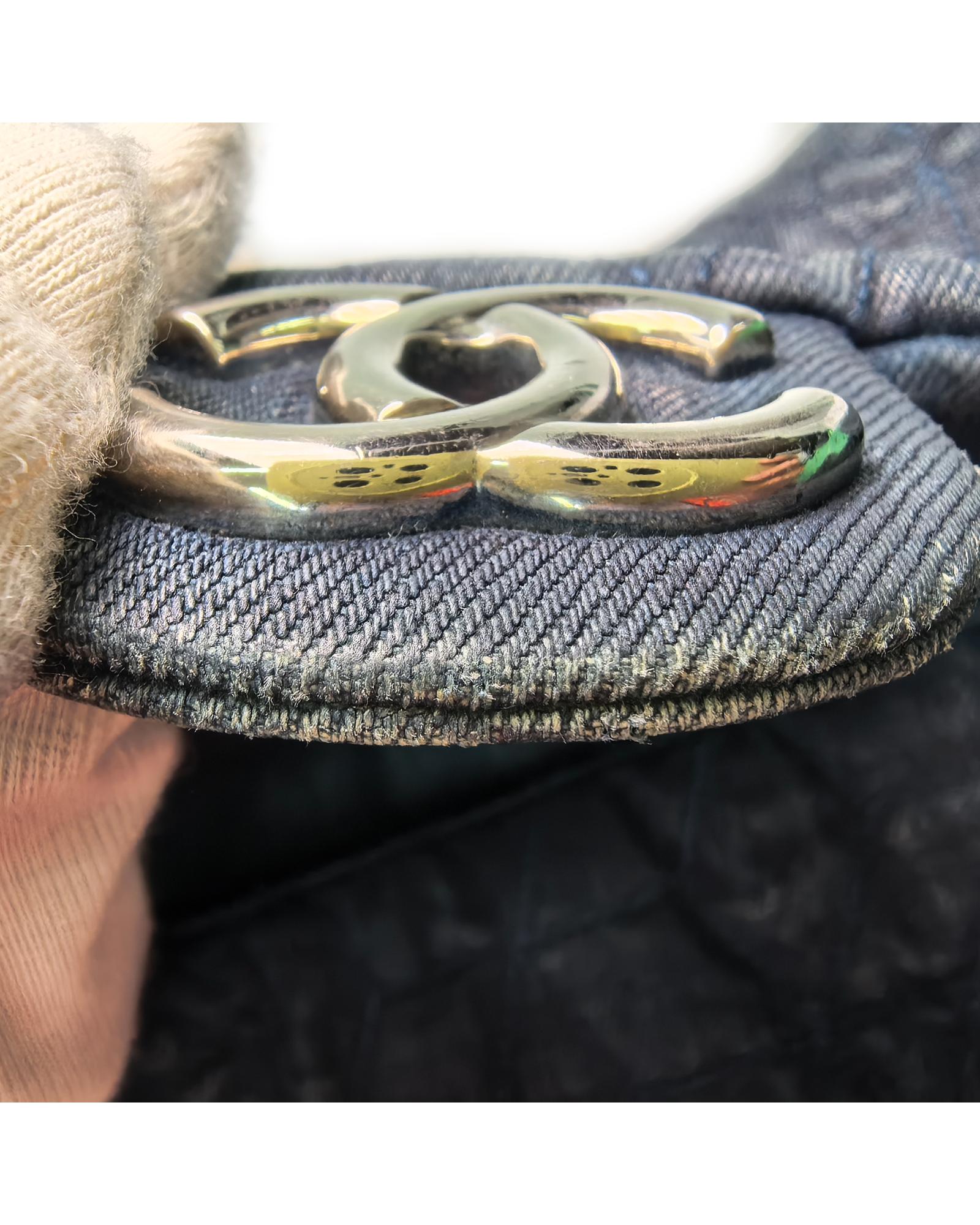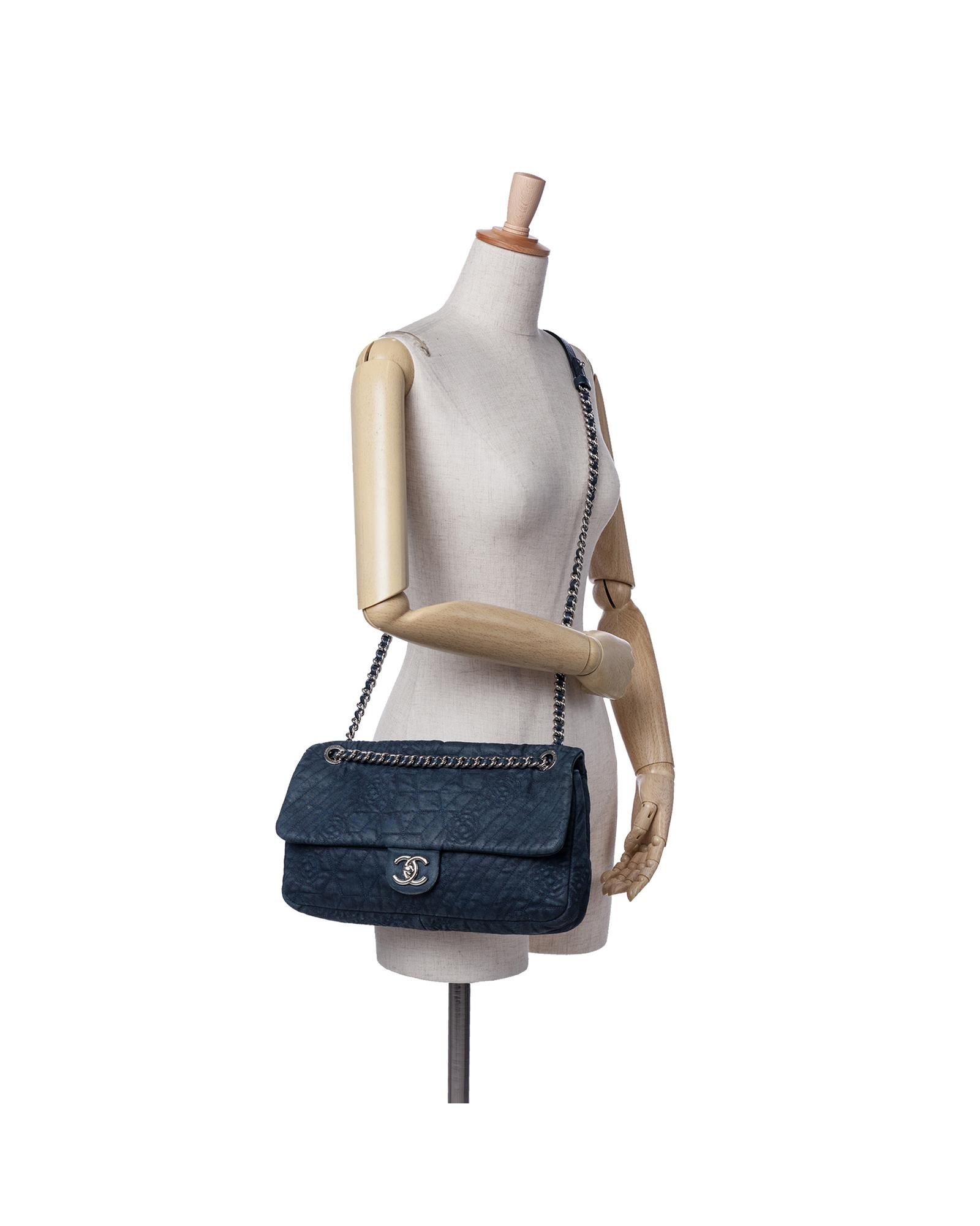 This crossbody bag features an embroidered denim body a leather-woven chain strap with leather shoulder guard a flap with CC turn lock closure and interior zip and slip pockets. Exterior front and lining are repainted.Brand: Chanel