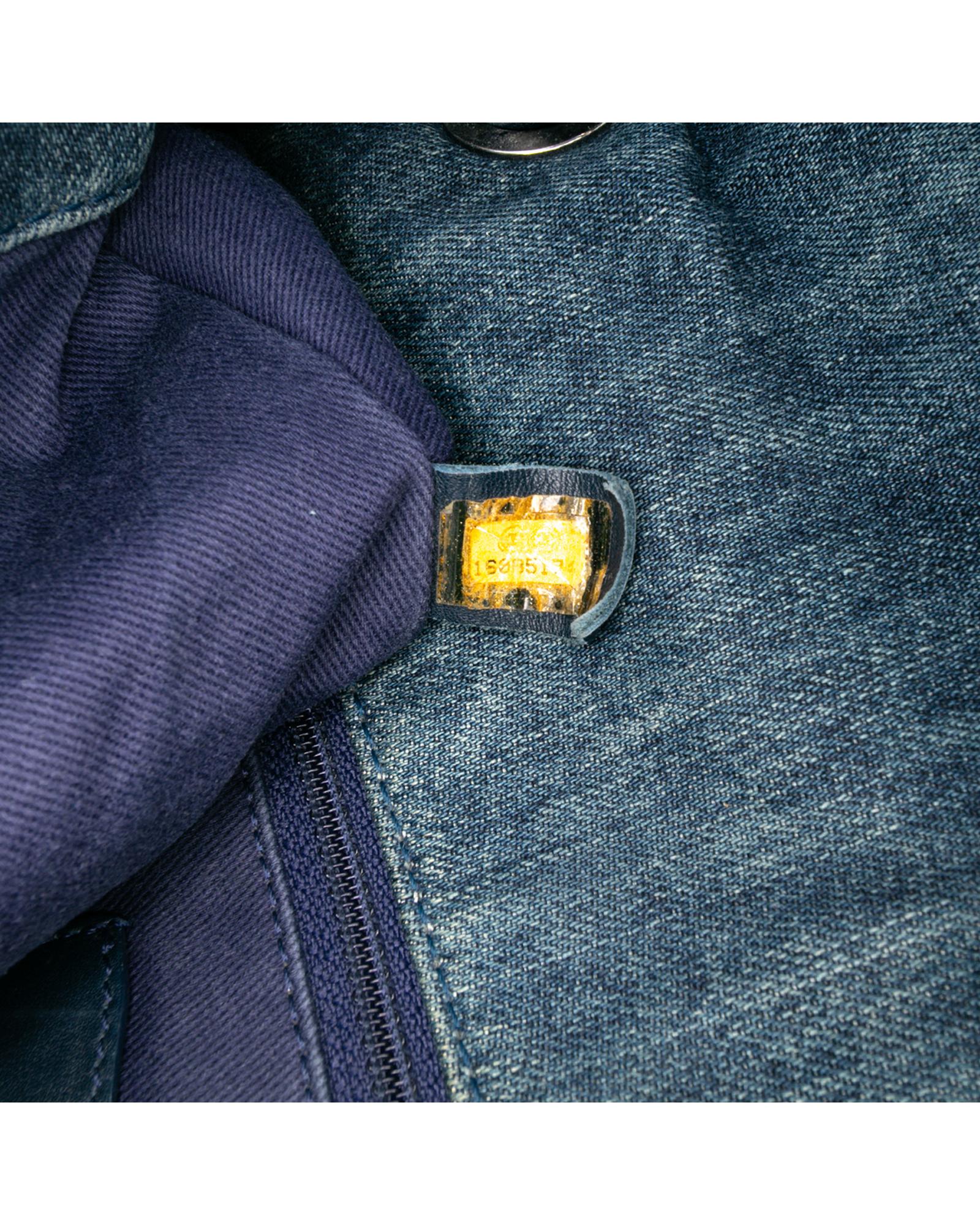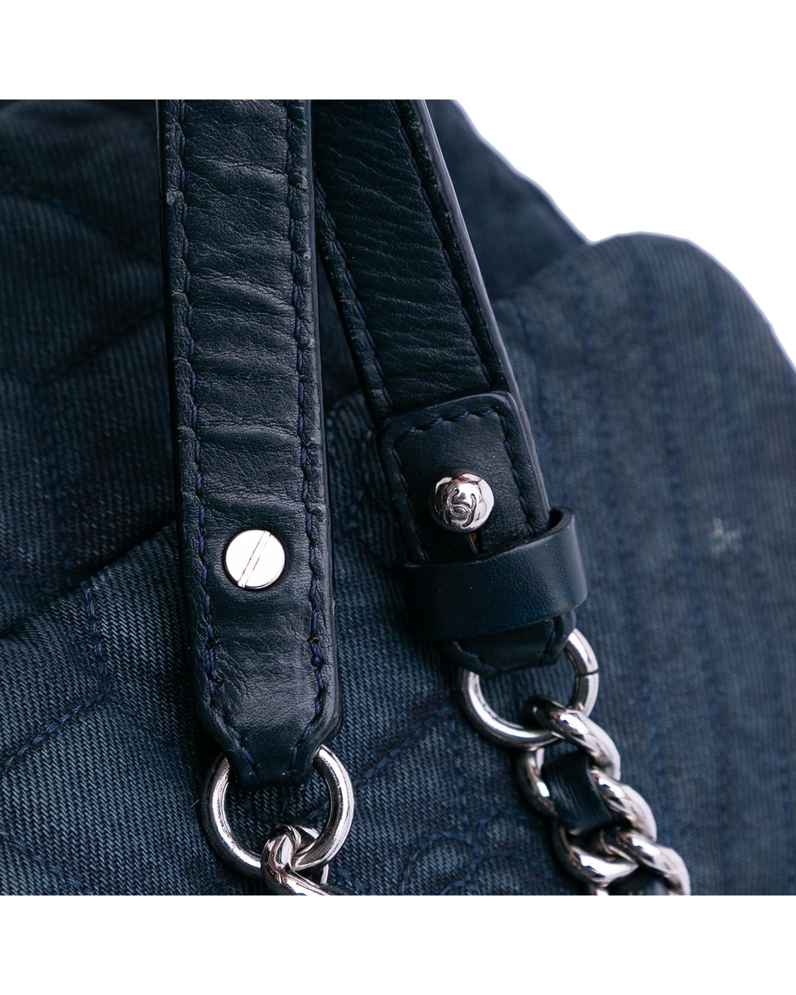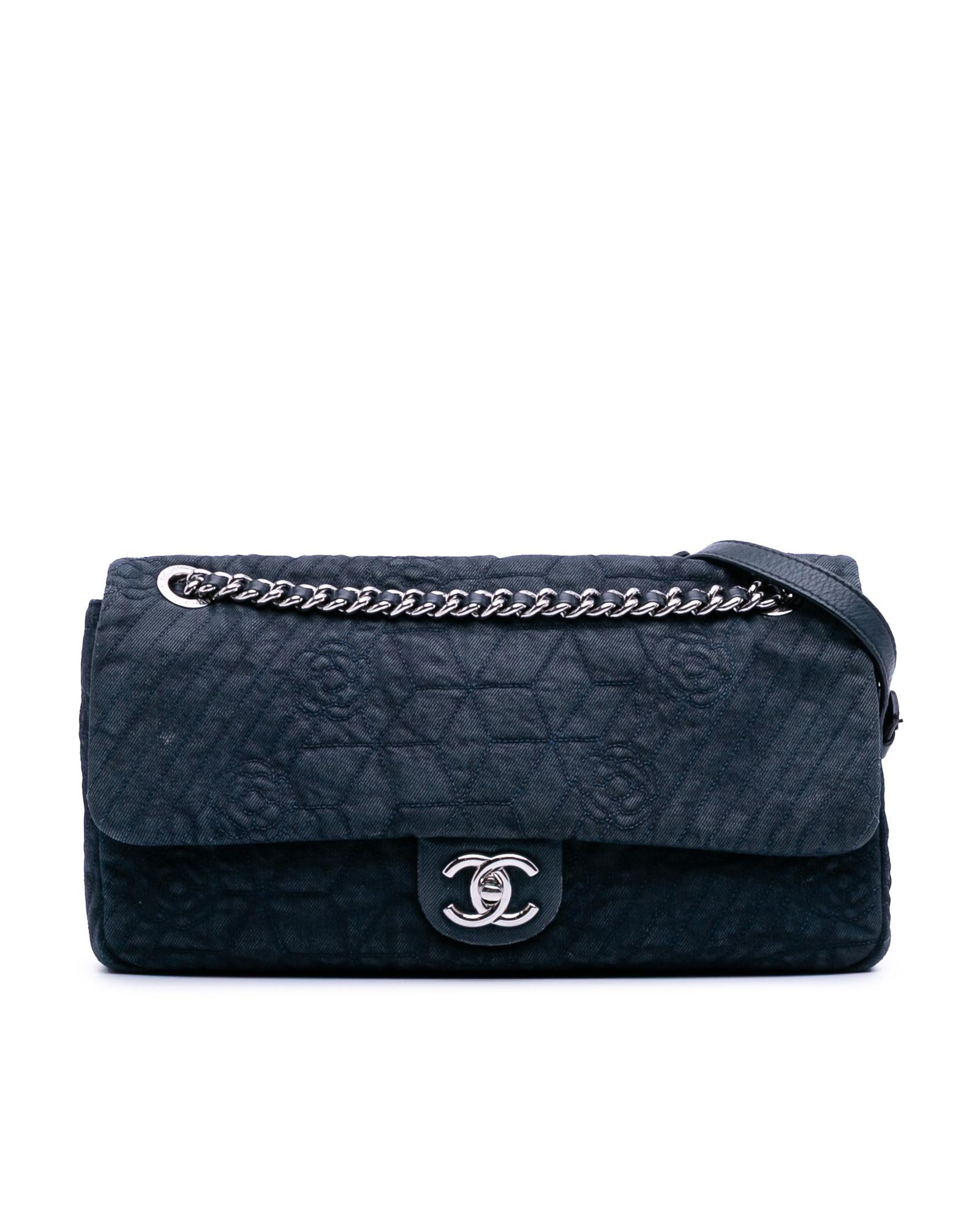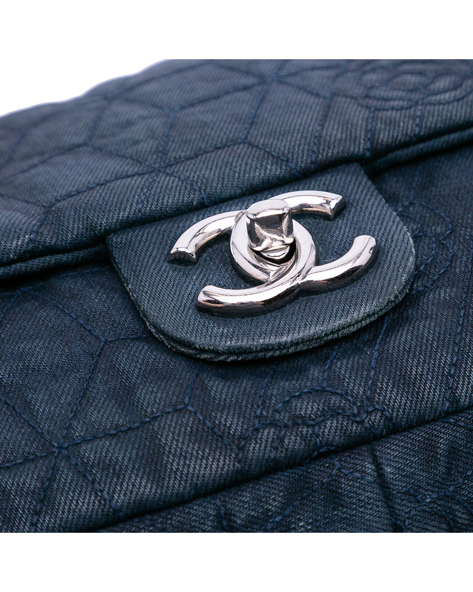 This crossbody bag features an embroidered denim body a leather-woven chain strap with leather shoulder guard a flap with CC turn lock closure and interior zip and slip pockets. Exterior front and lining are repainted.Brand: Chanel