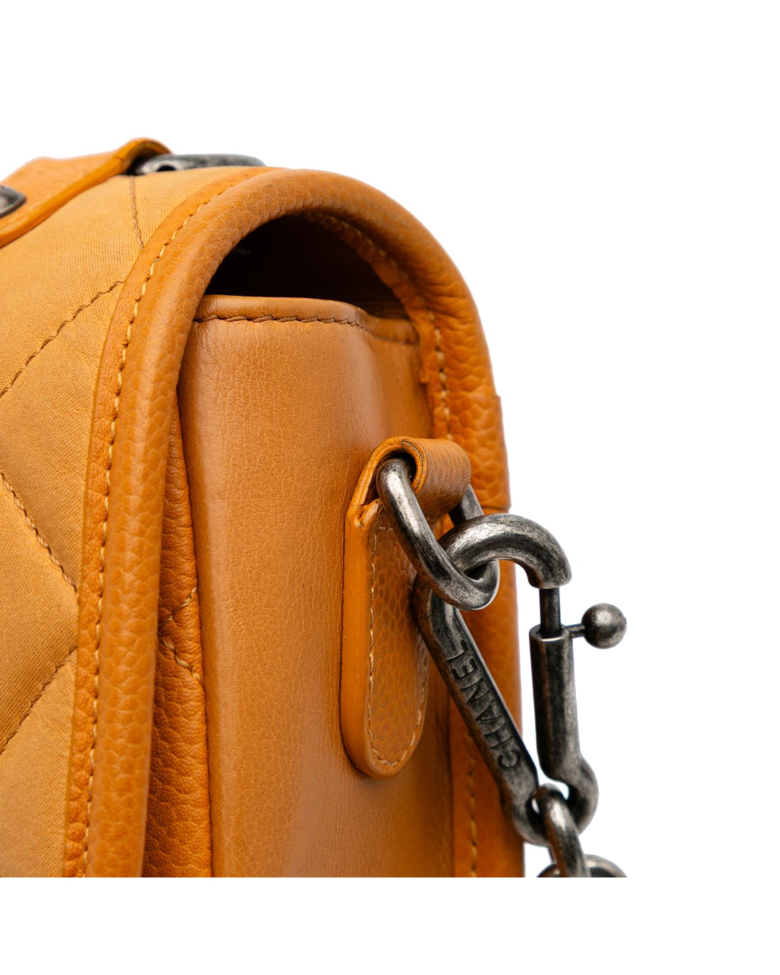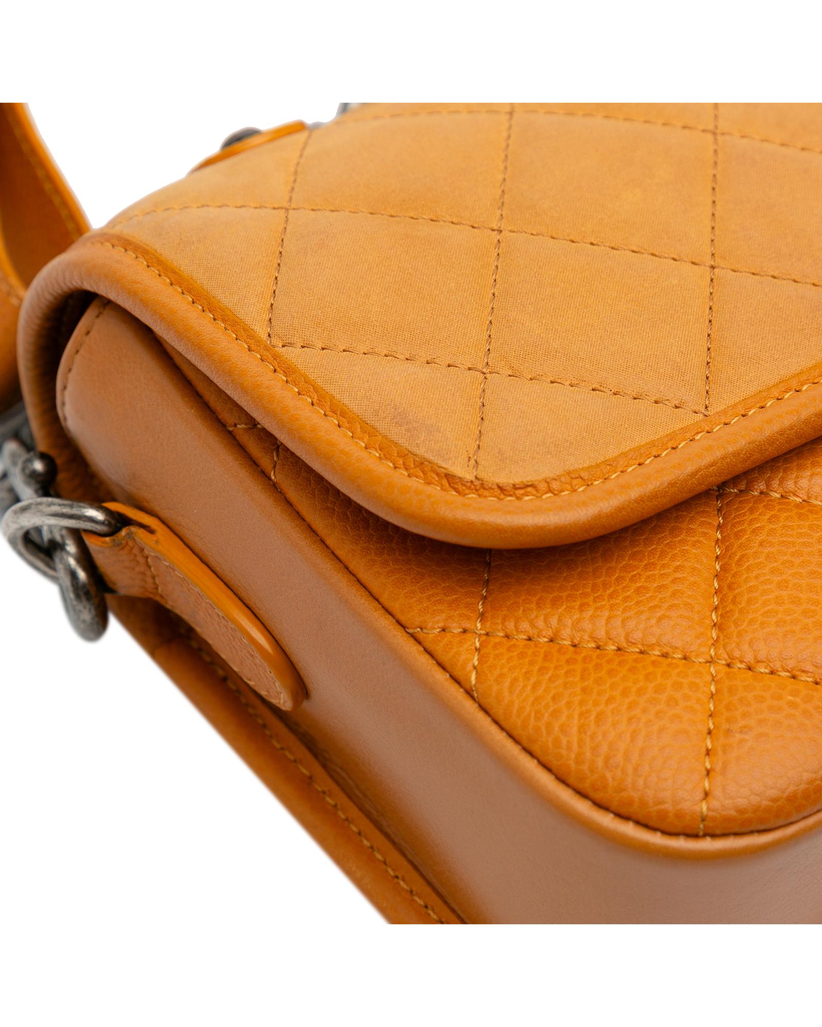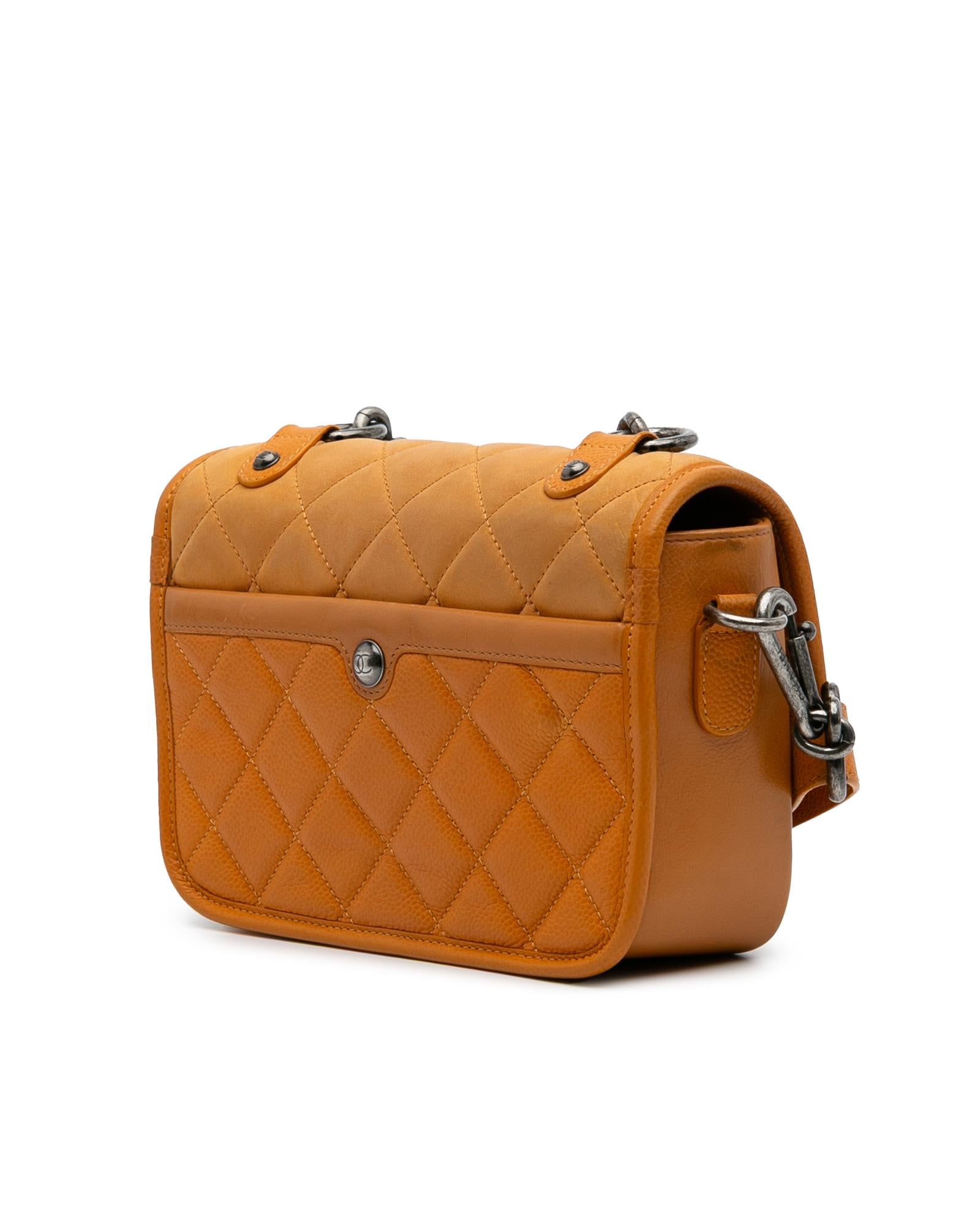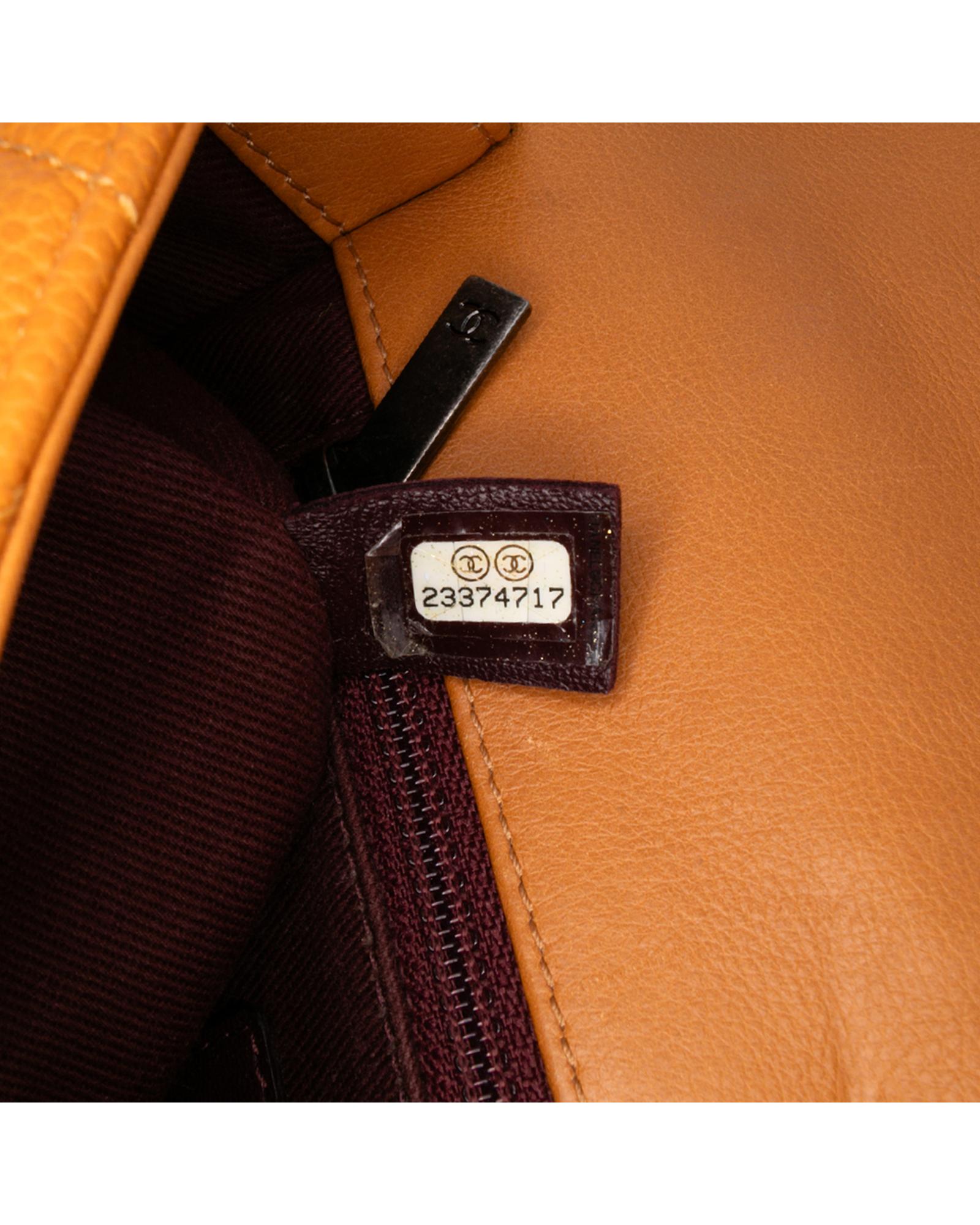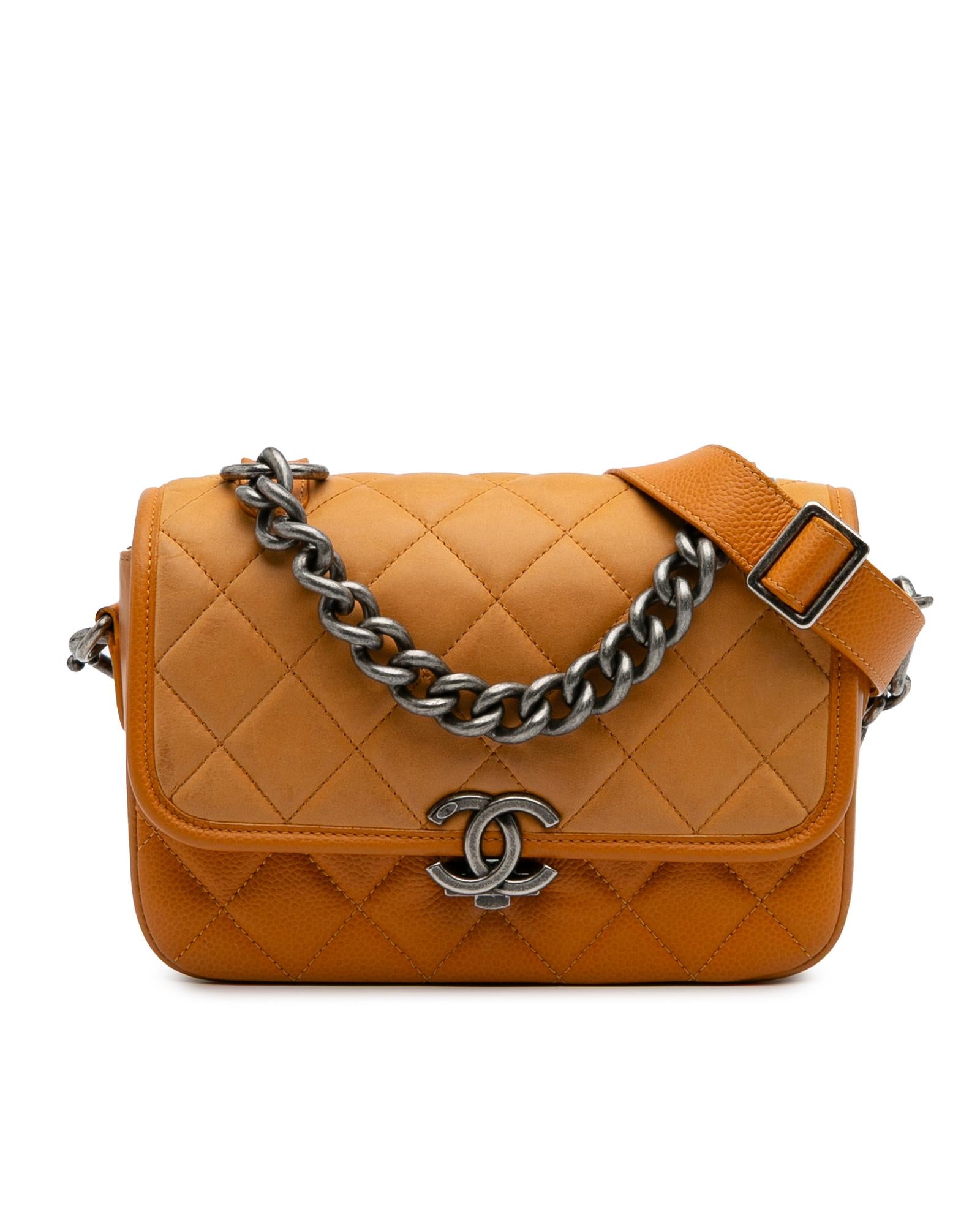 This satchel features a quilted calfskin and caviar leather body a chain link handle a detachable flat leather strap a front flap with push lock closure an exterior back slip pocket and an interior zip pocket.