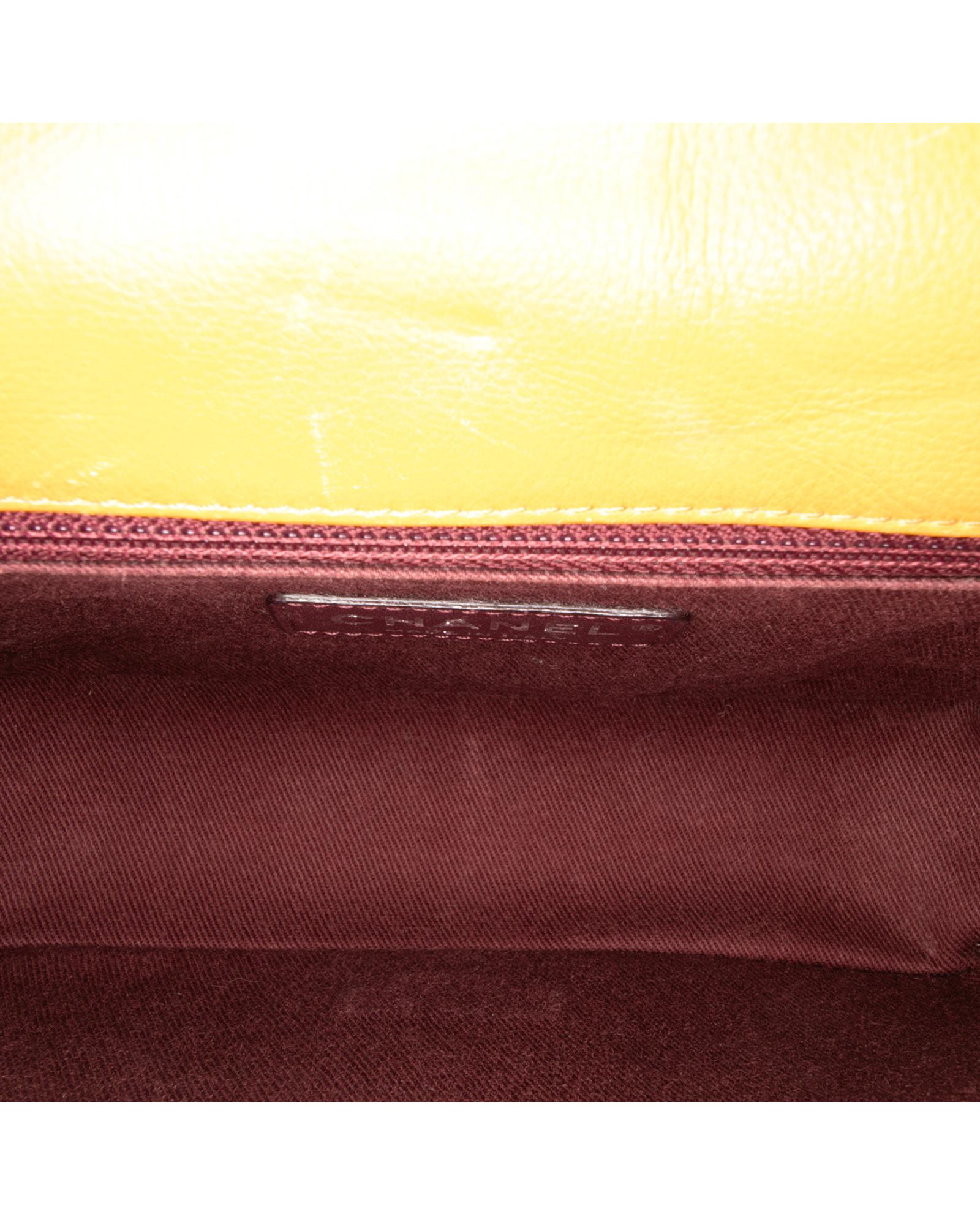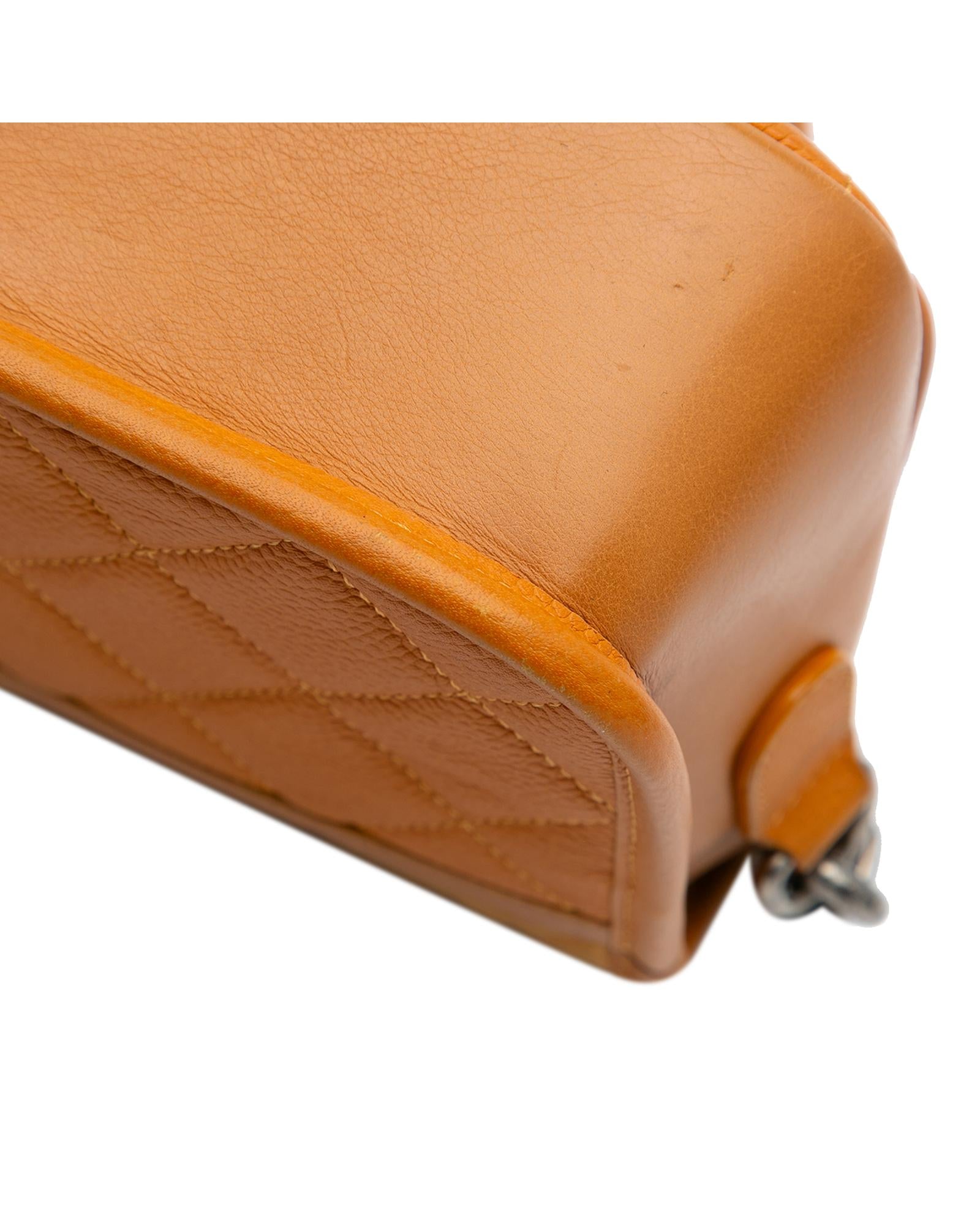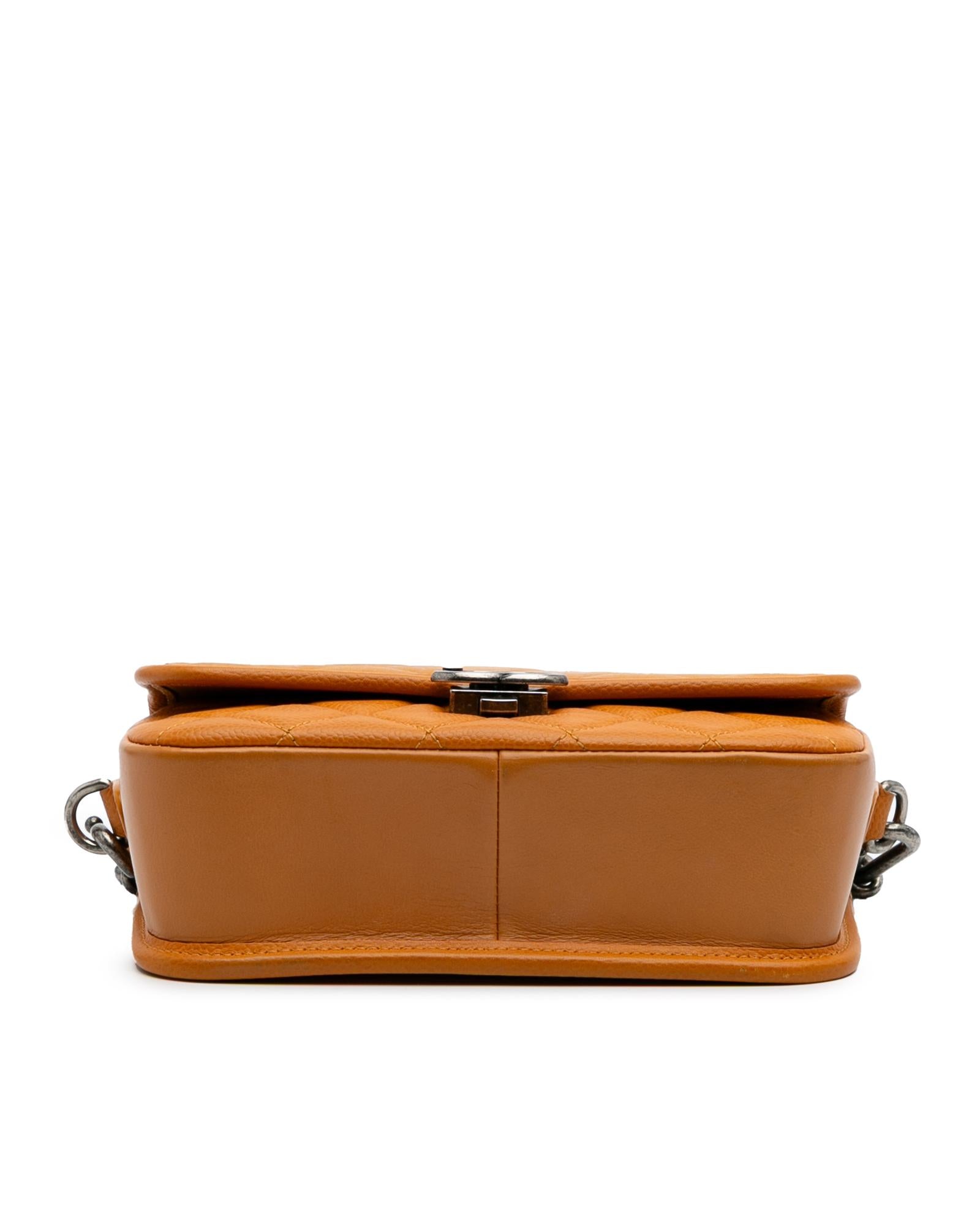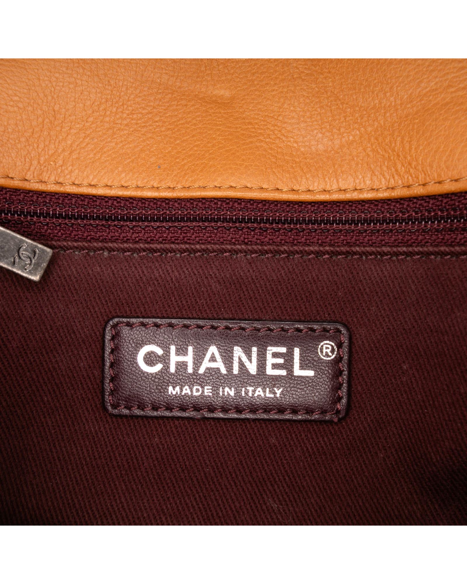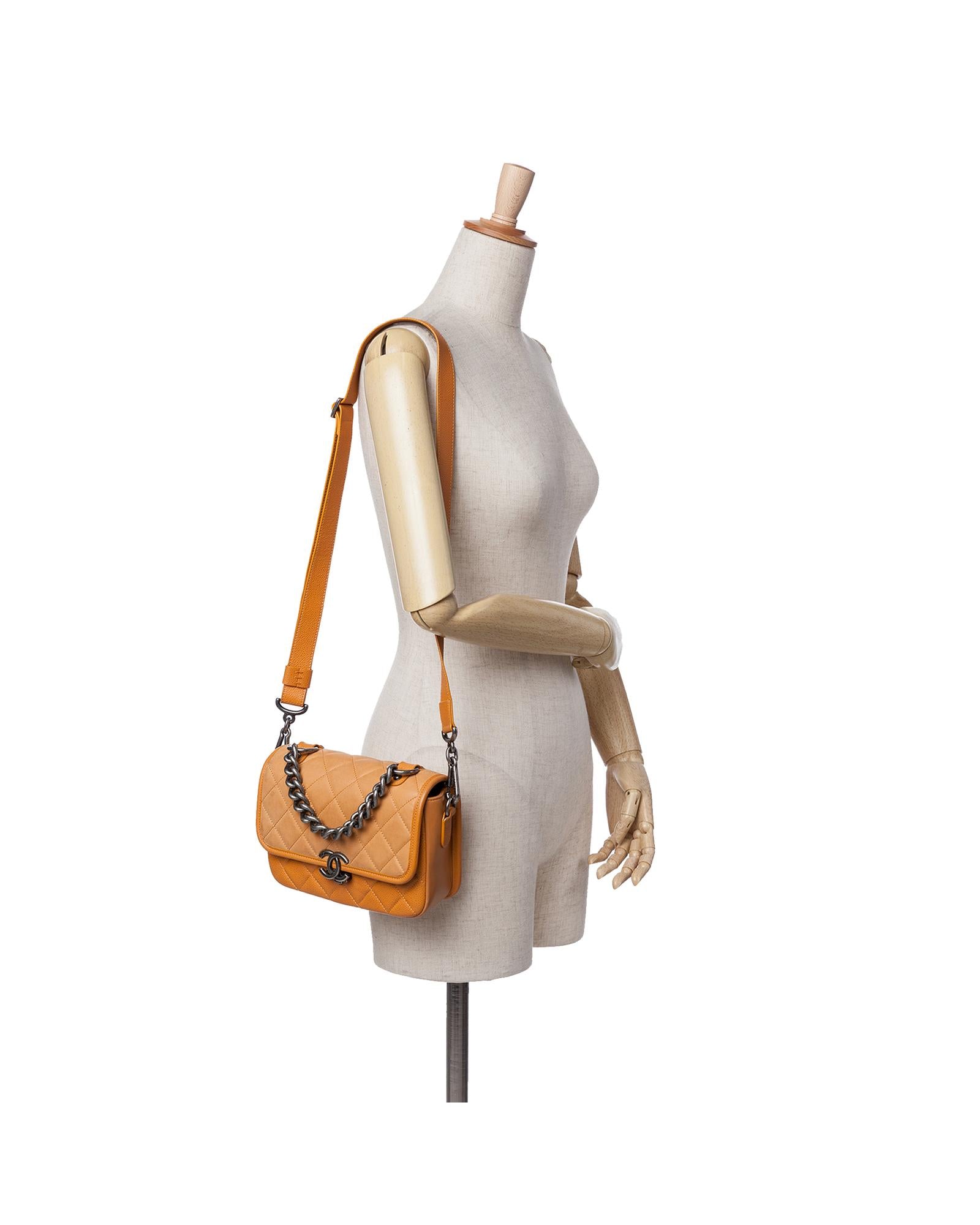 This satchel features a quilted calfskin and caviar leather body a chain link handle a detachable flat leather strap a front flap with push lock closure an exterior back slip pocket and an interior zip pocket.