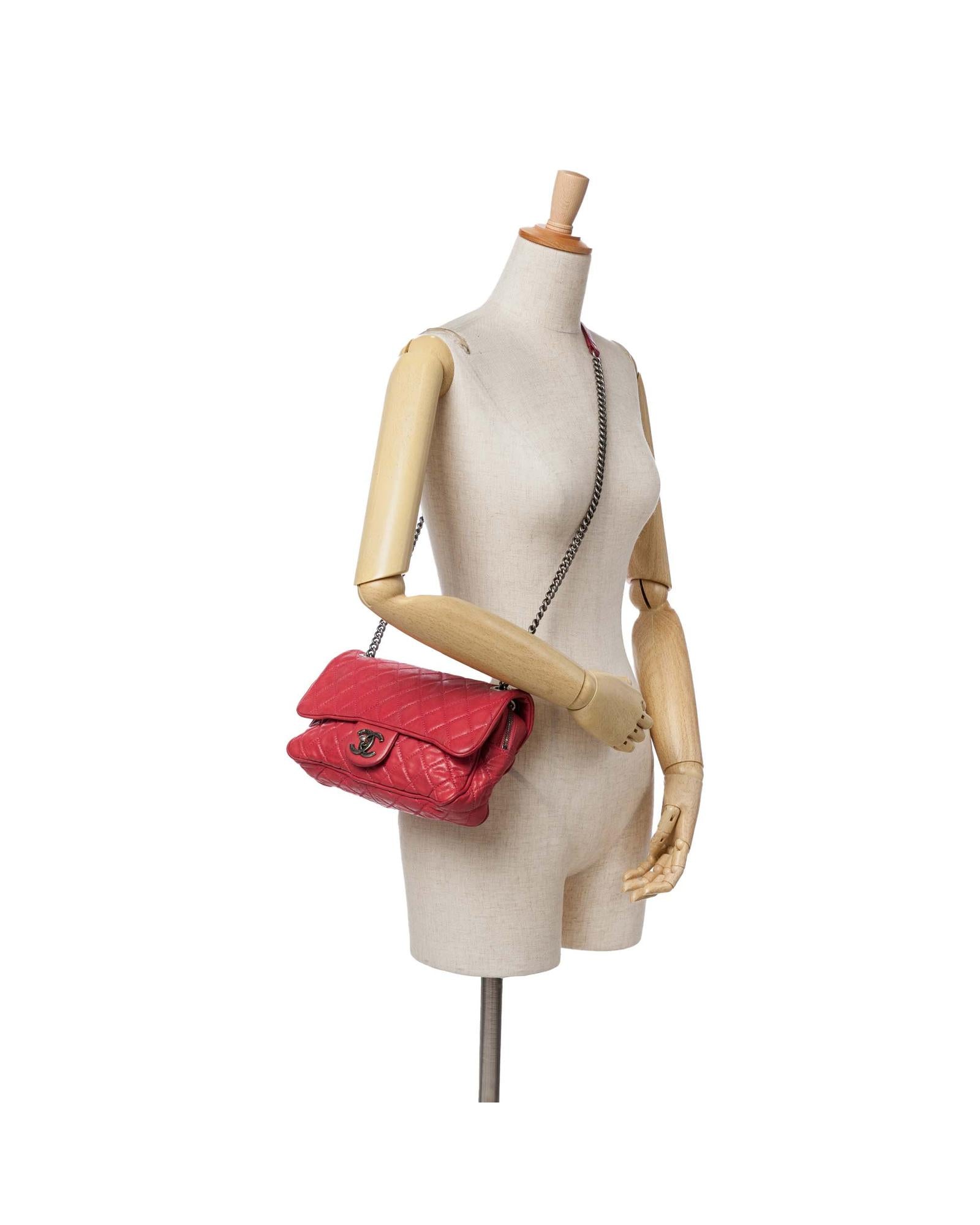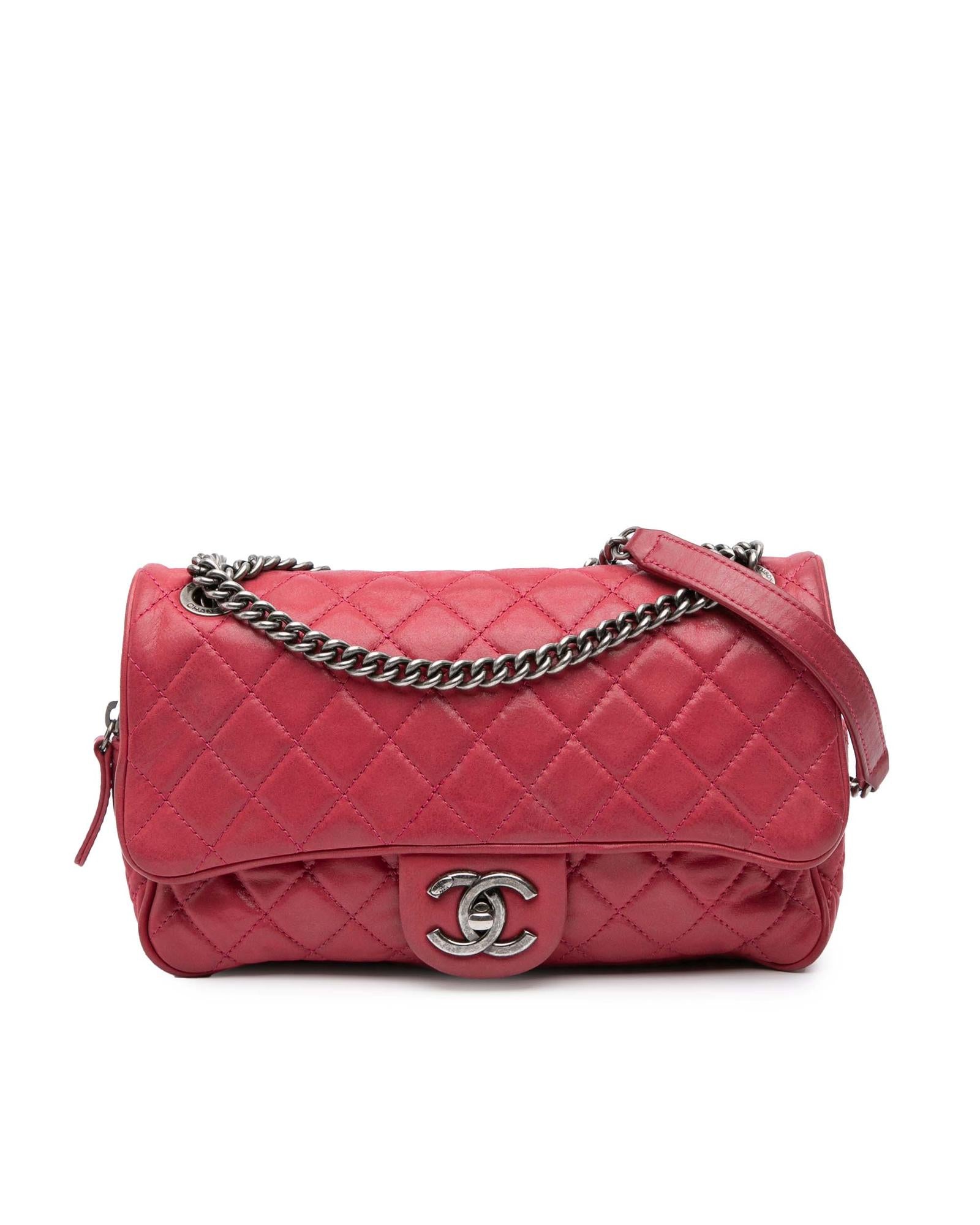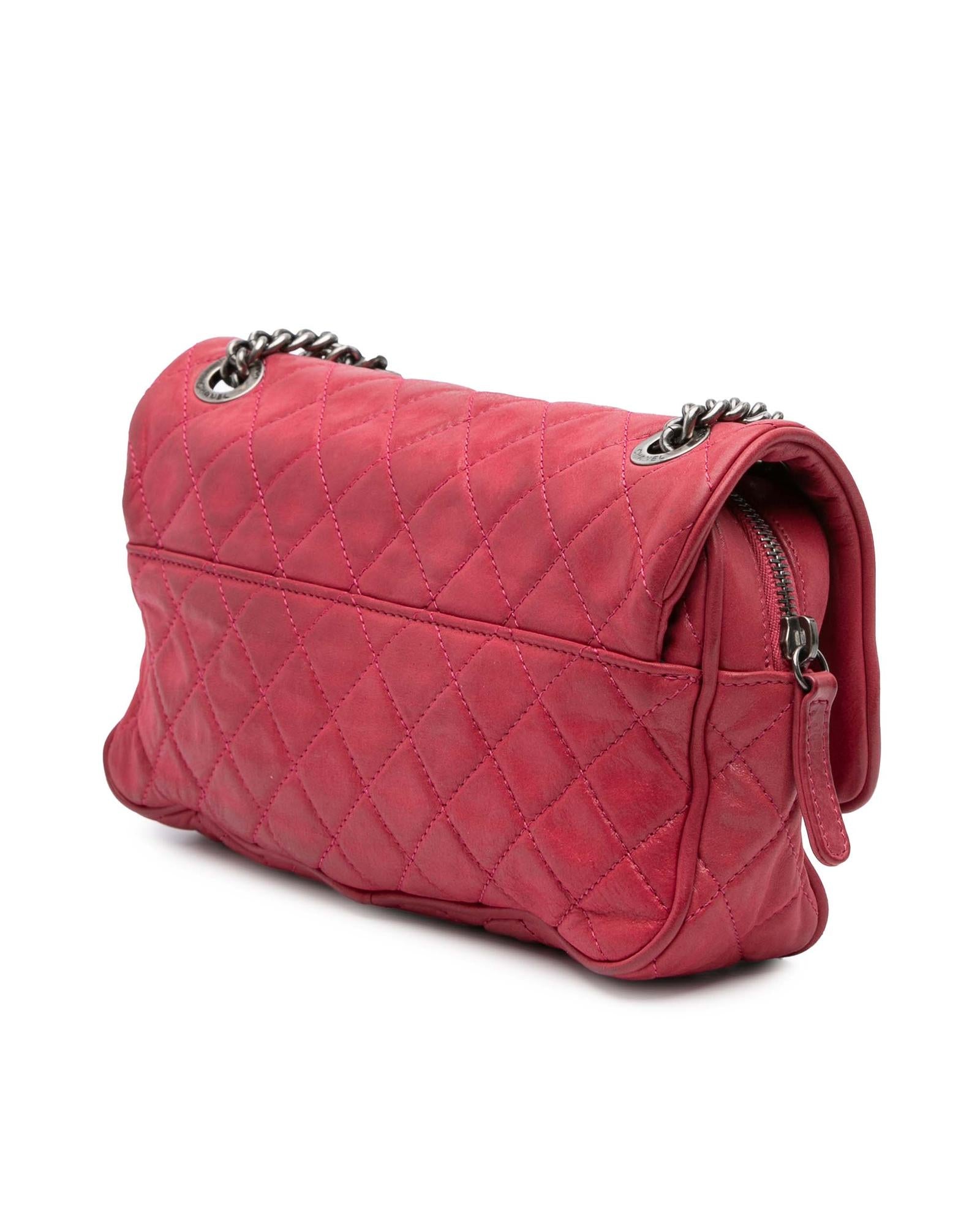 This flap bag features a quilted leather body a chain link strap with leather shoulder guard a front flap with CC turn lock closure a top zip closure and interior zip and slip pockets.