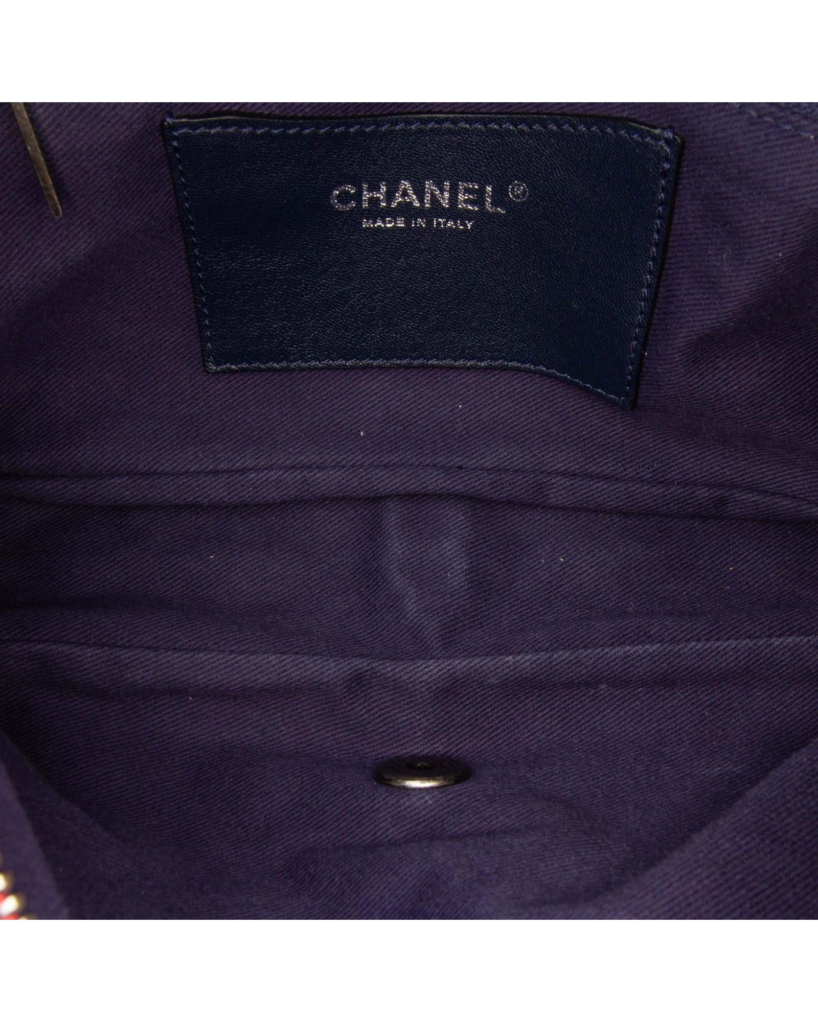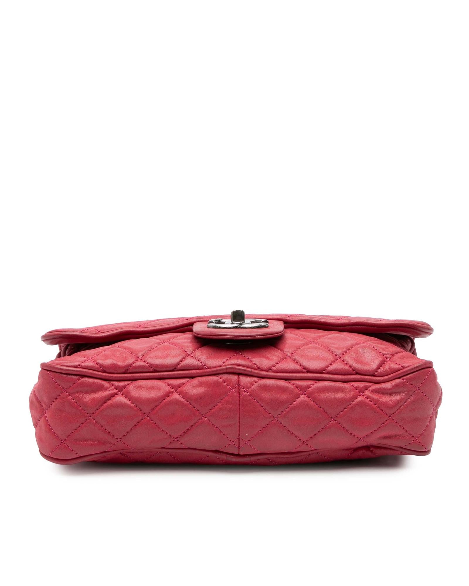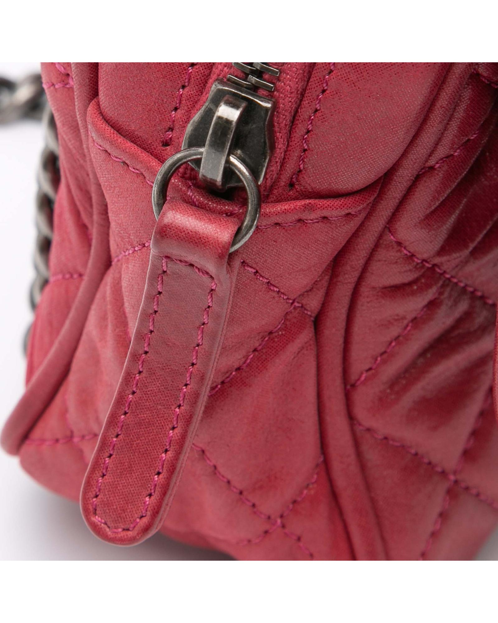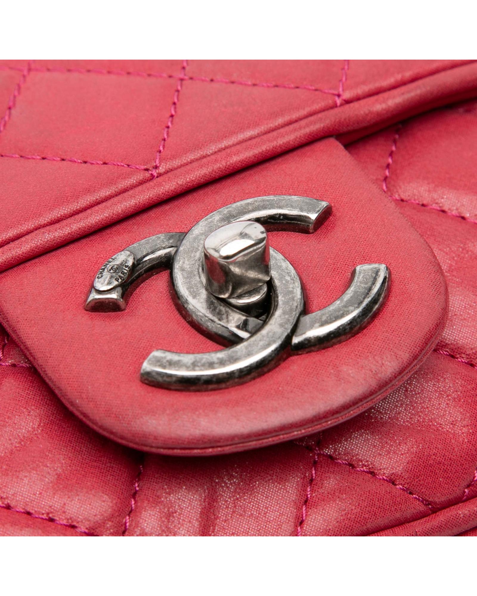 This flap bag features a quilted leather body a chain link strap with leather shoulder guard a front flap with CC turn lock closure a top zip closure and interior zip and slip pockets.