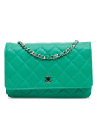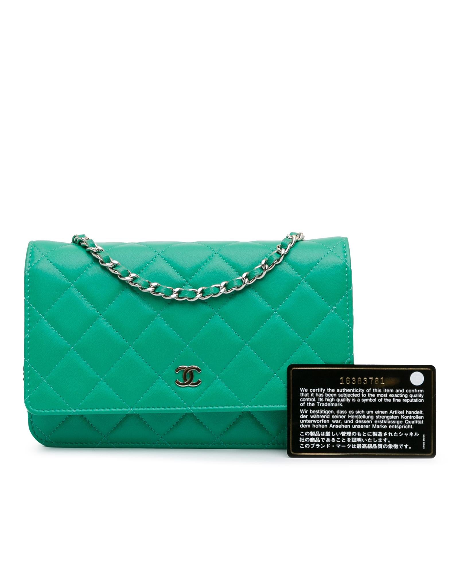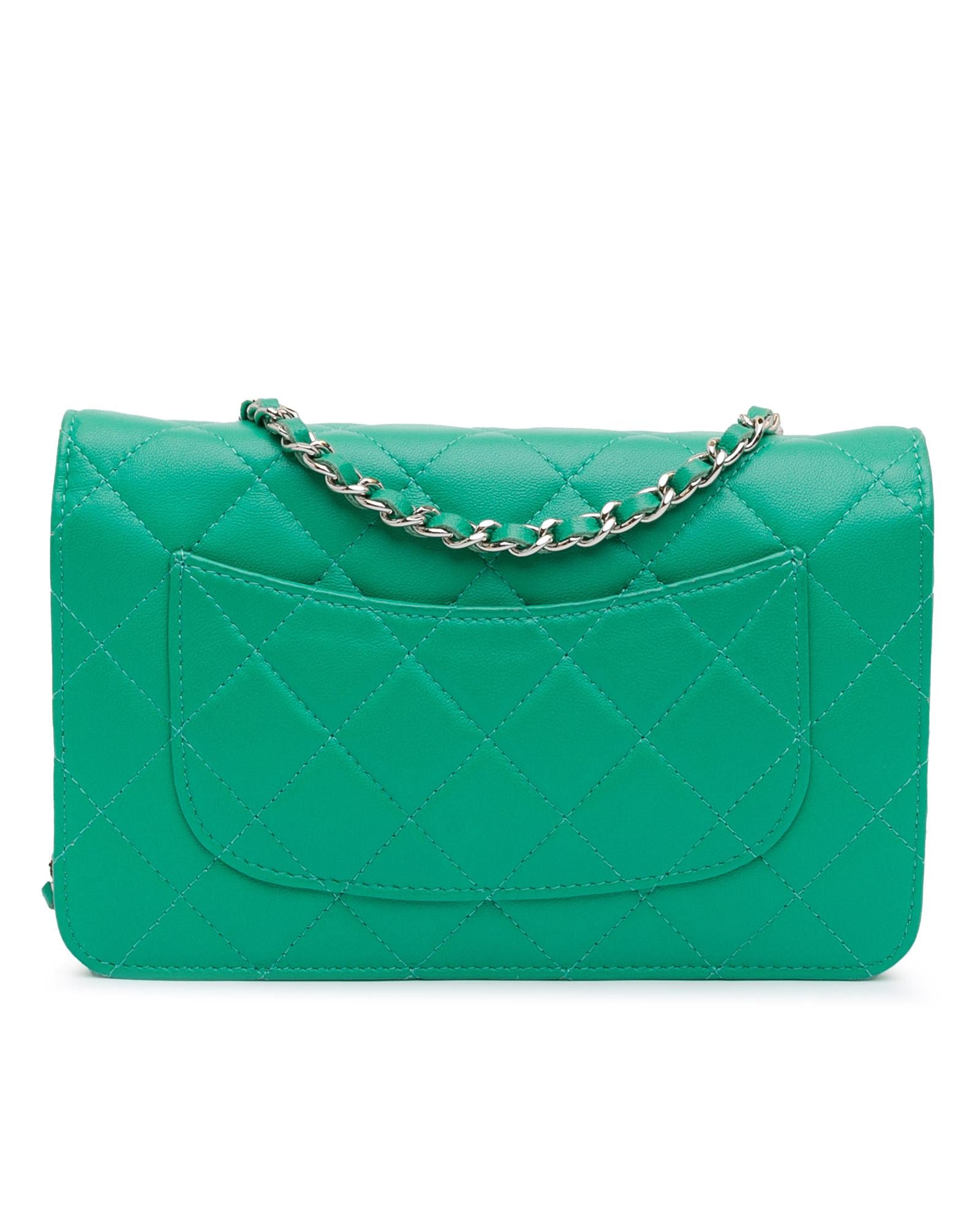 This wallet on chain features a quilted lambskin leather body a leather woven chain link shoulder strap a flap with a snap button clasp closure an exterior back slip pocket and interior zip and slip pockets.