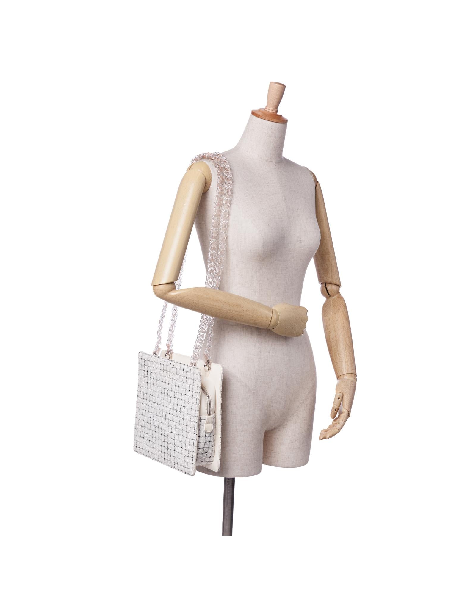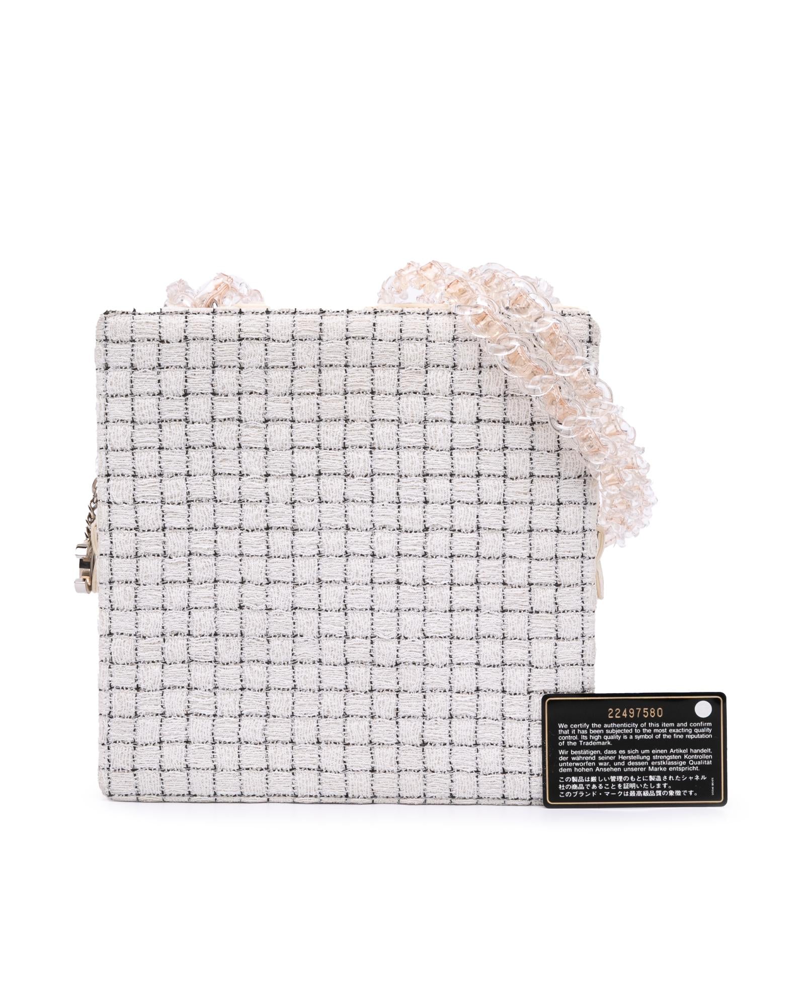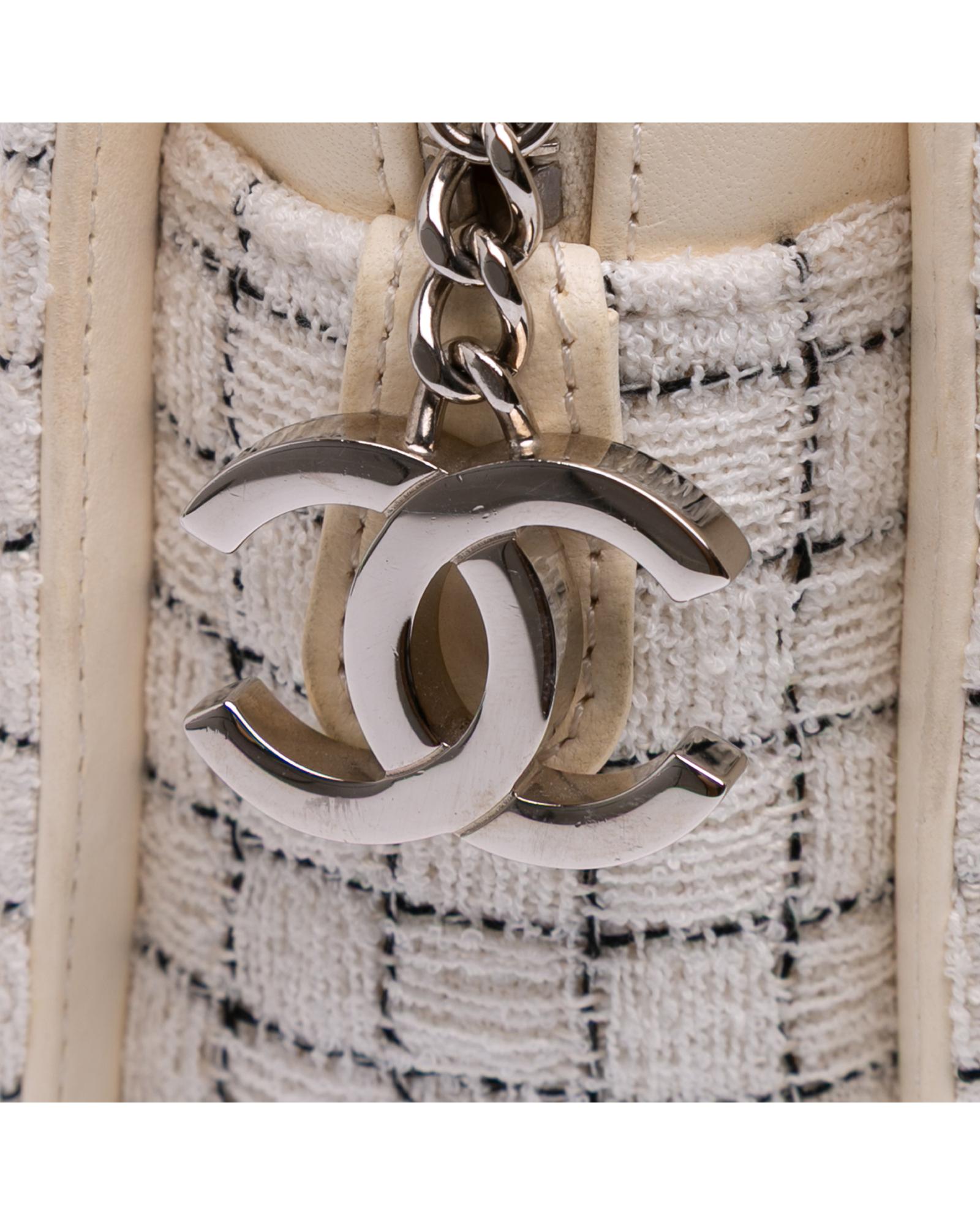 This shoulder bag features a tweed body with leather trim resin chain straps a top zip closure and an interior zip pocket.Brand: Chanel
