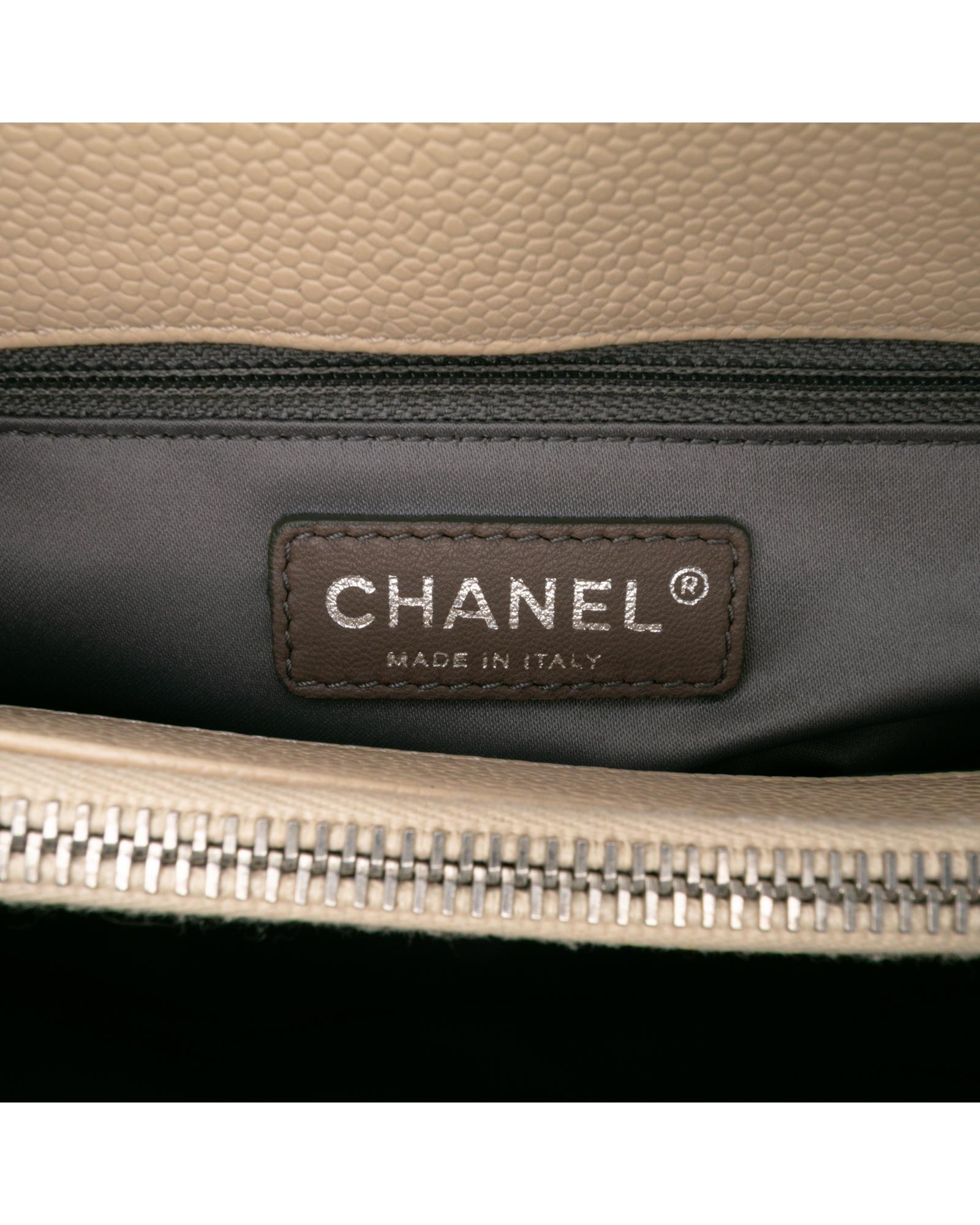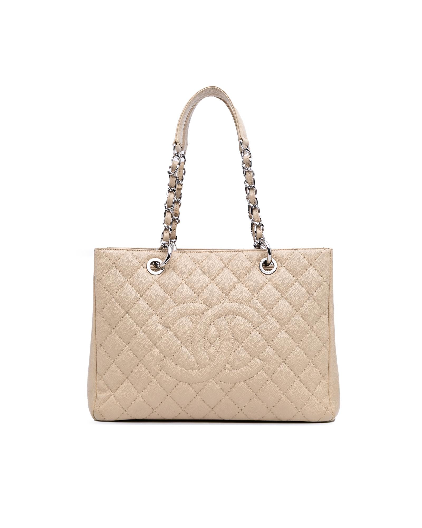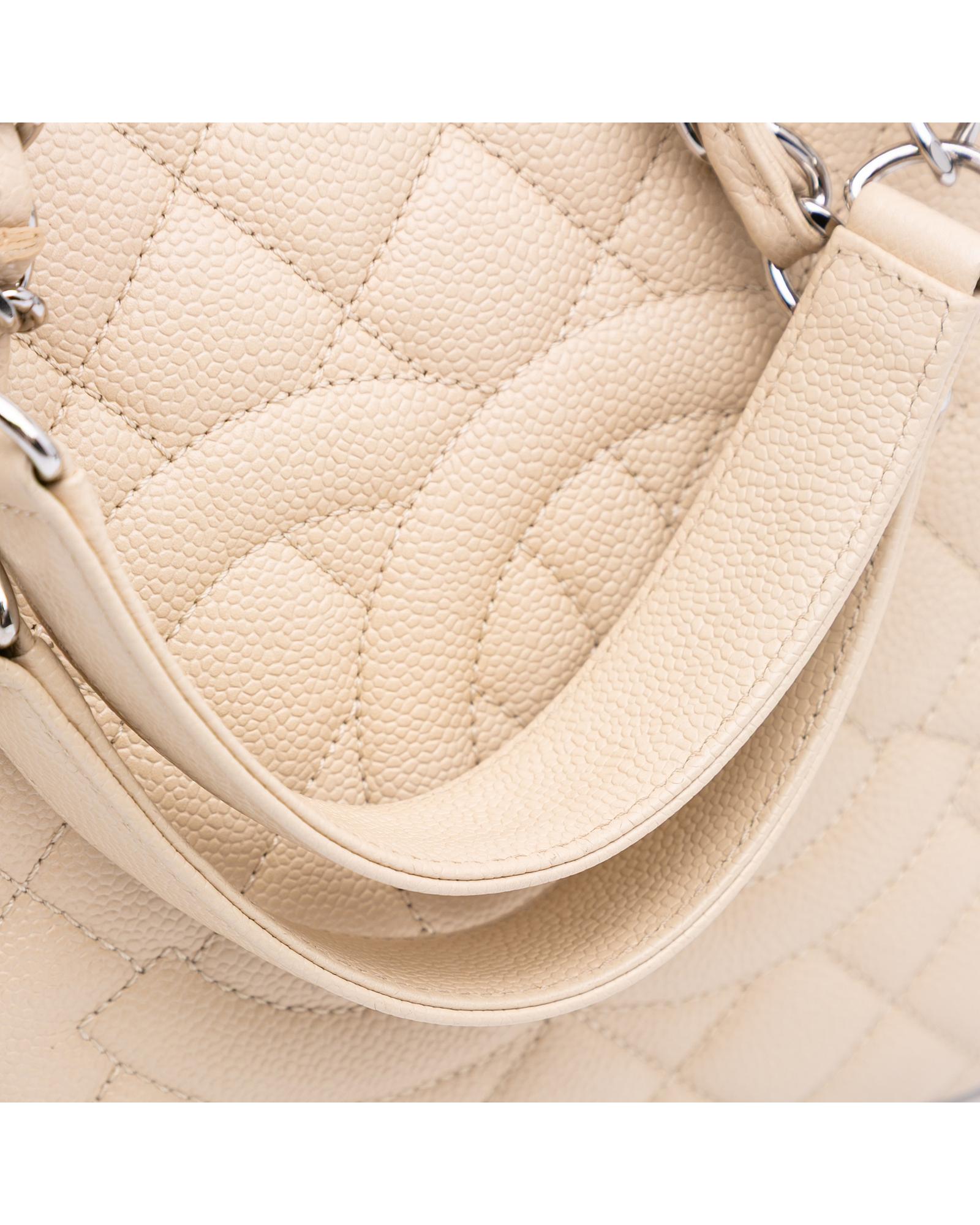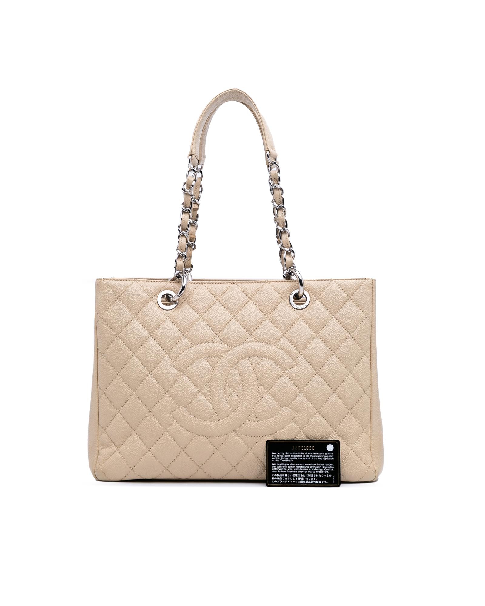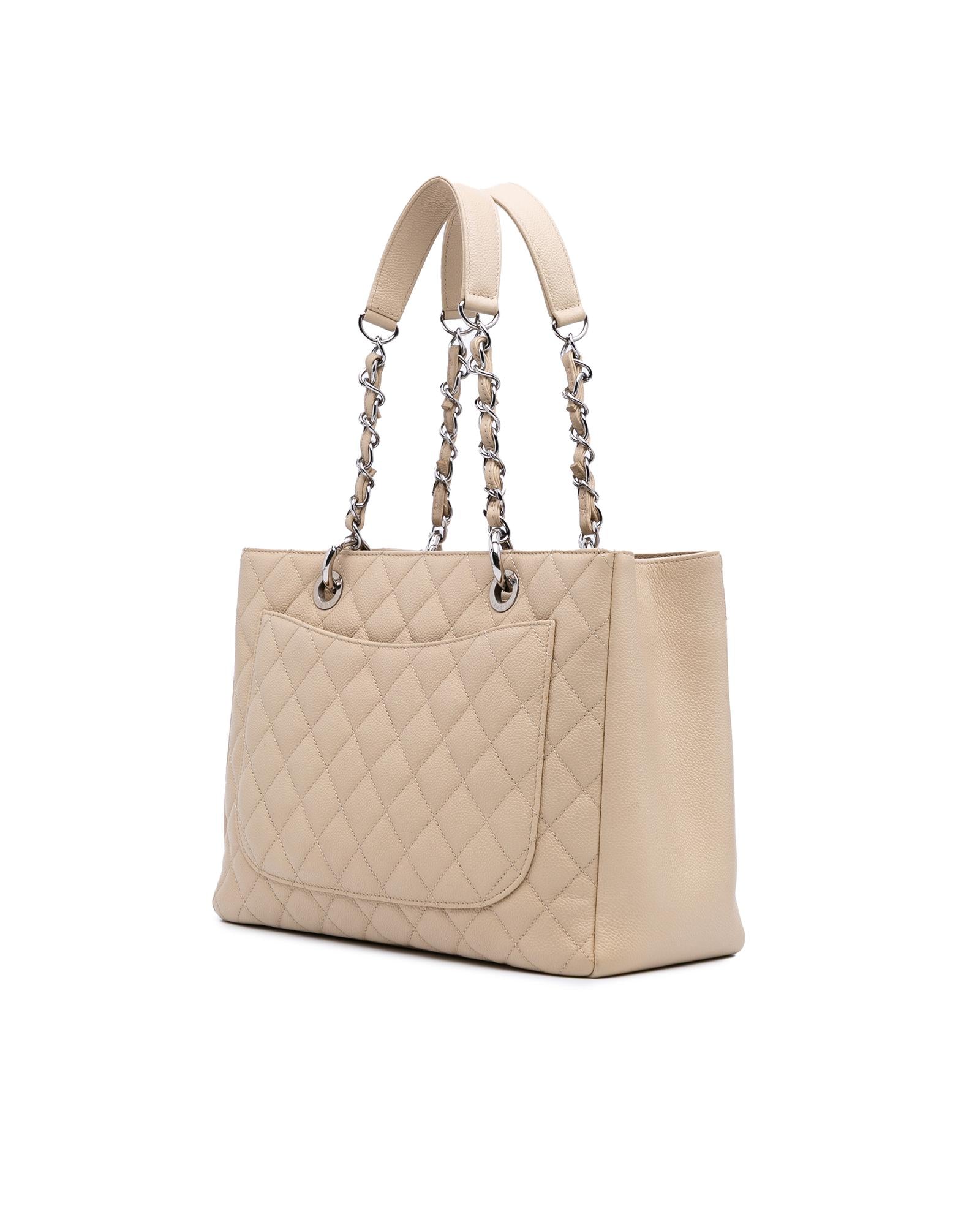 The Grand Shopping Tote features a quilted caviar leather body leather woven chain shoulder straps an open top an exterior slip pocket and interior zip and slip pockets.Brand: Chanel