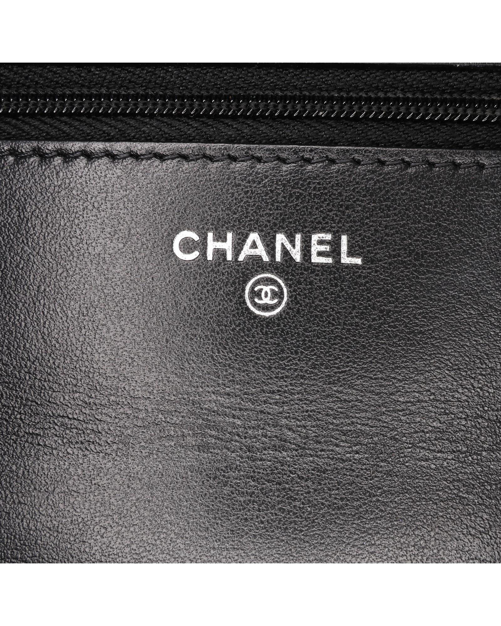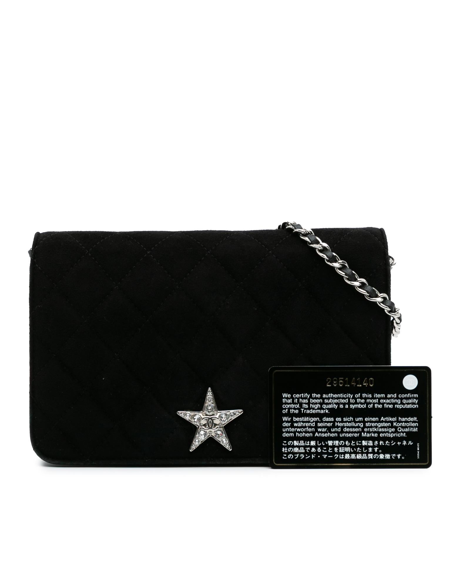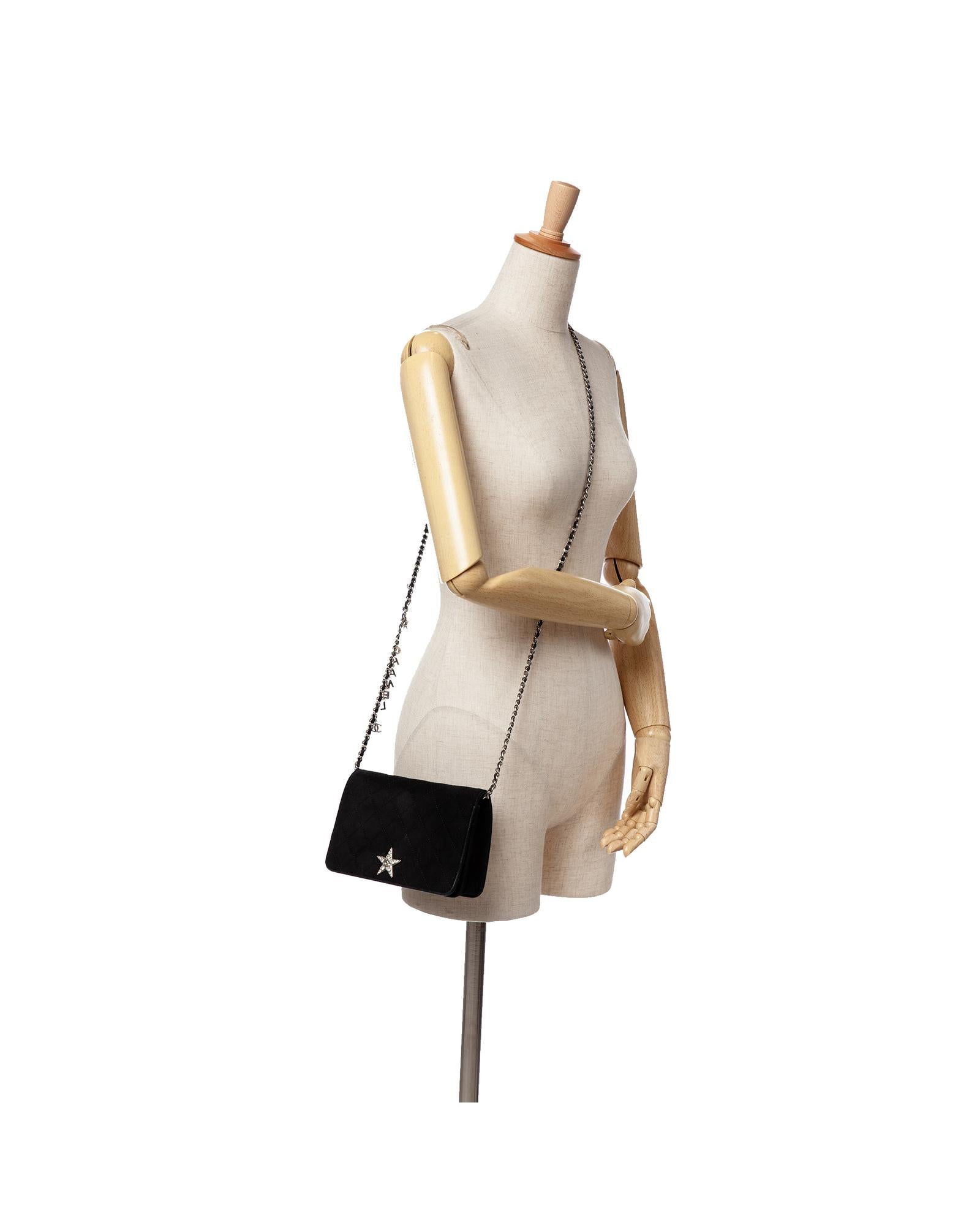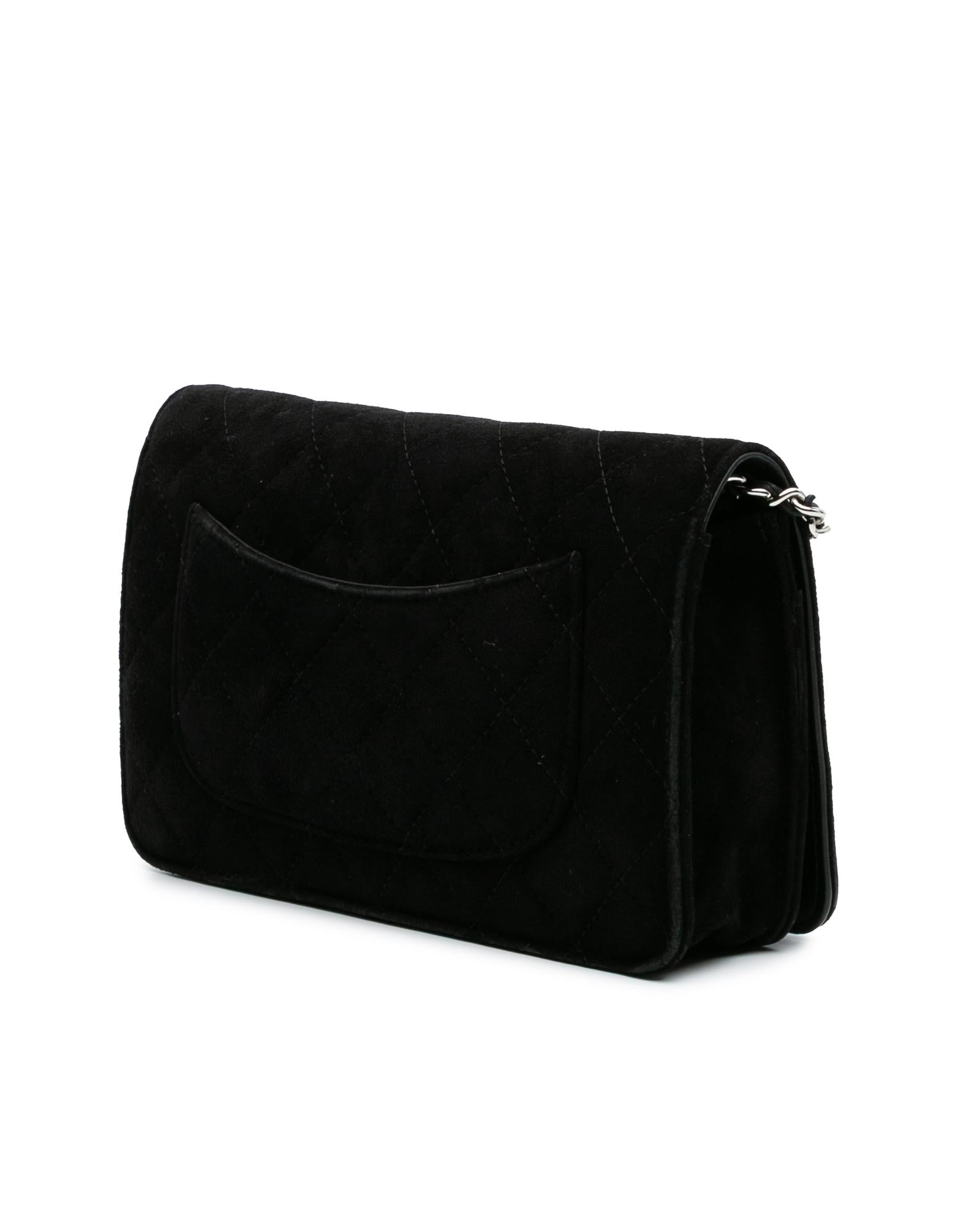 This wallet on chain features an suede leather body leather woven chain strap with charms a top flap with magnetic closure and interior zip and slip pockets.Brand: Chanel