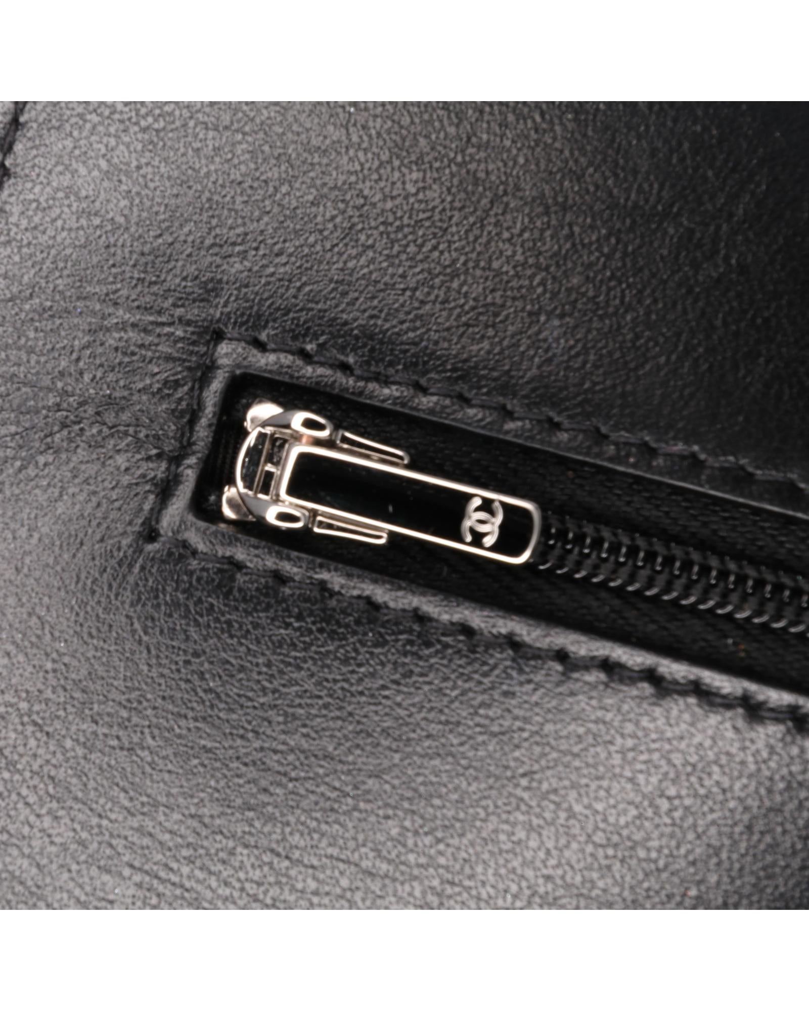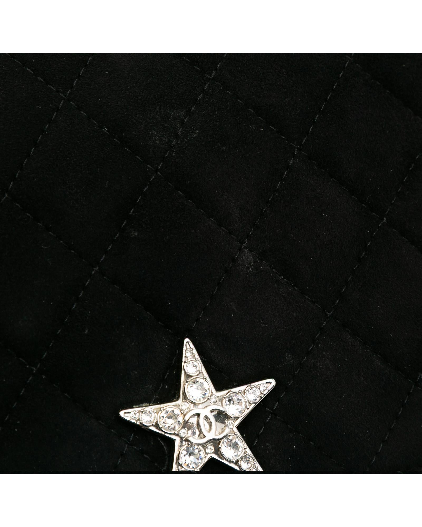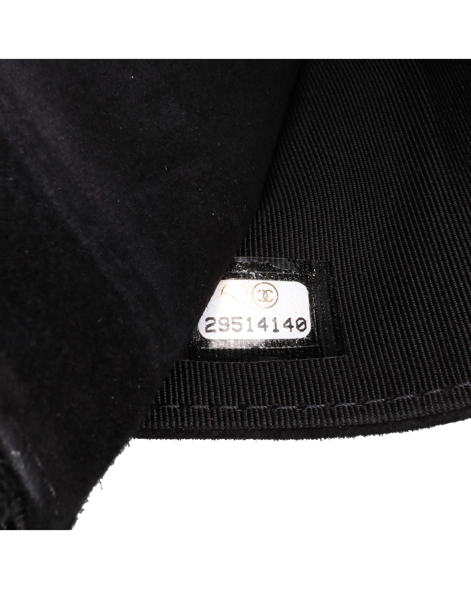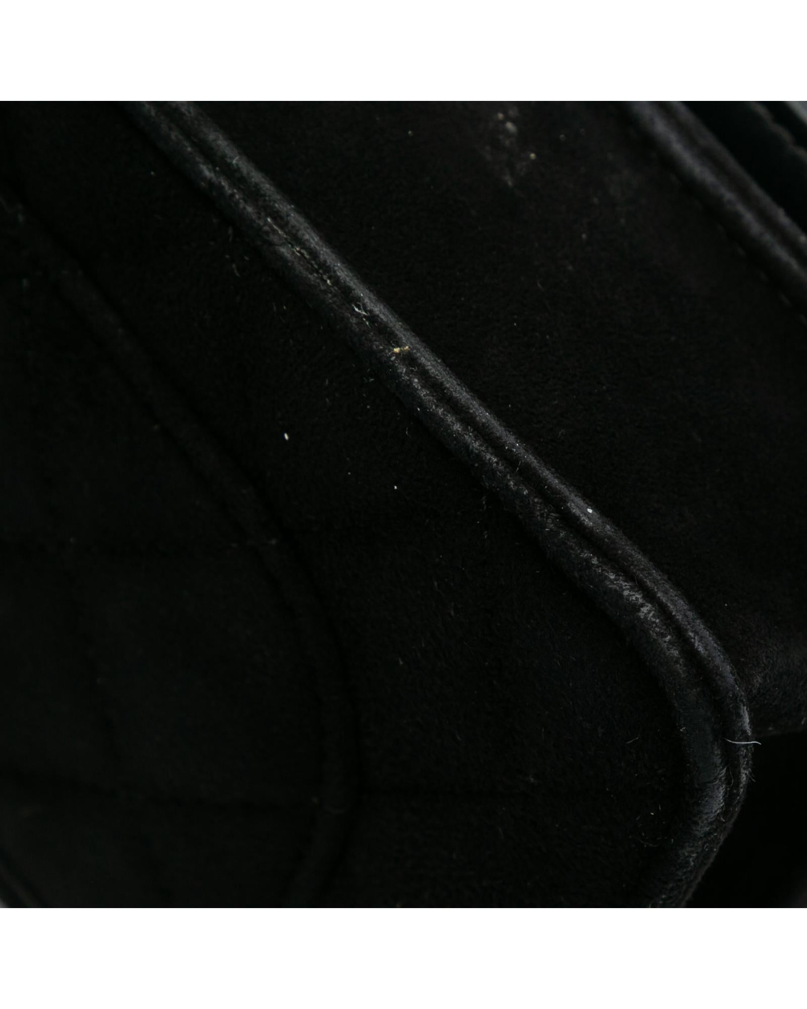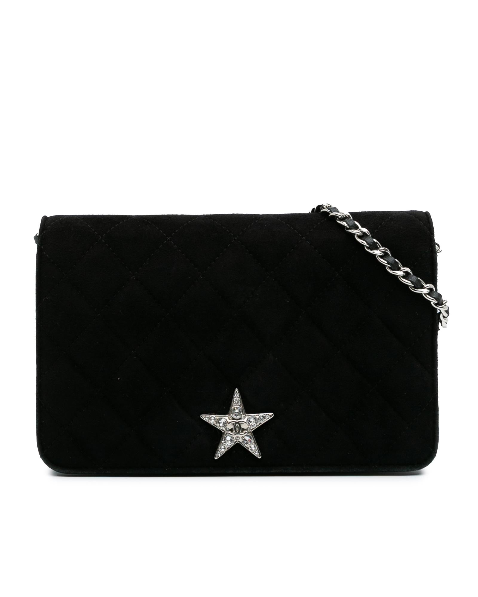 This wallet on chain features an suede leather body leather woven chain strap with charms a top flap with magnetic closure and interior zip and slip pockets.Brand: Chanel