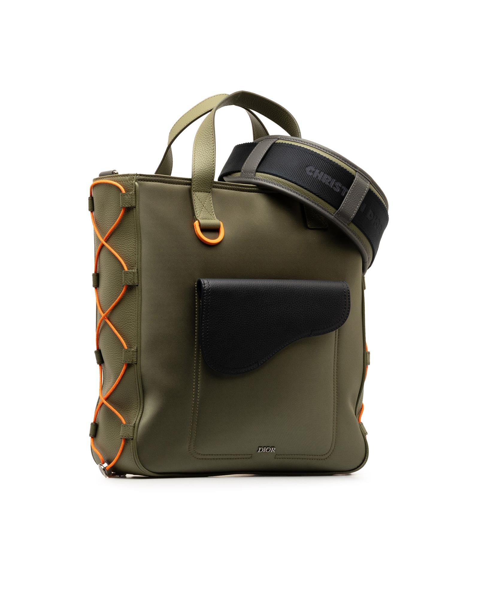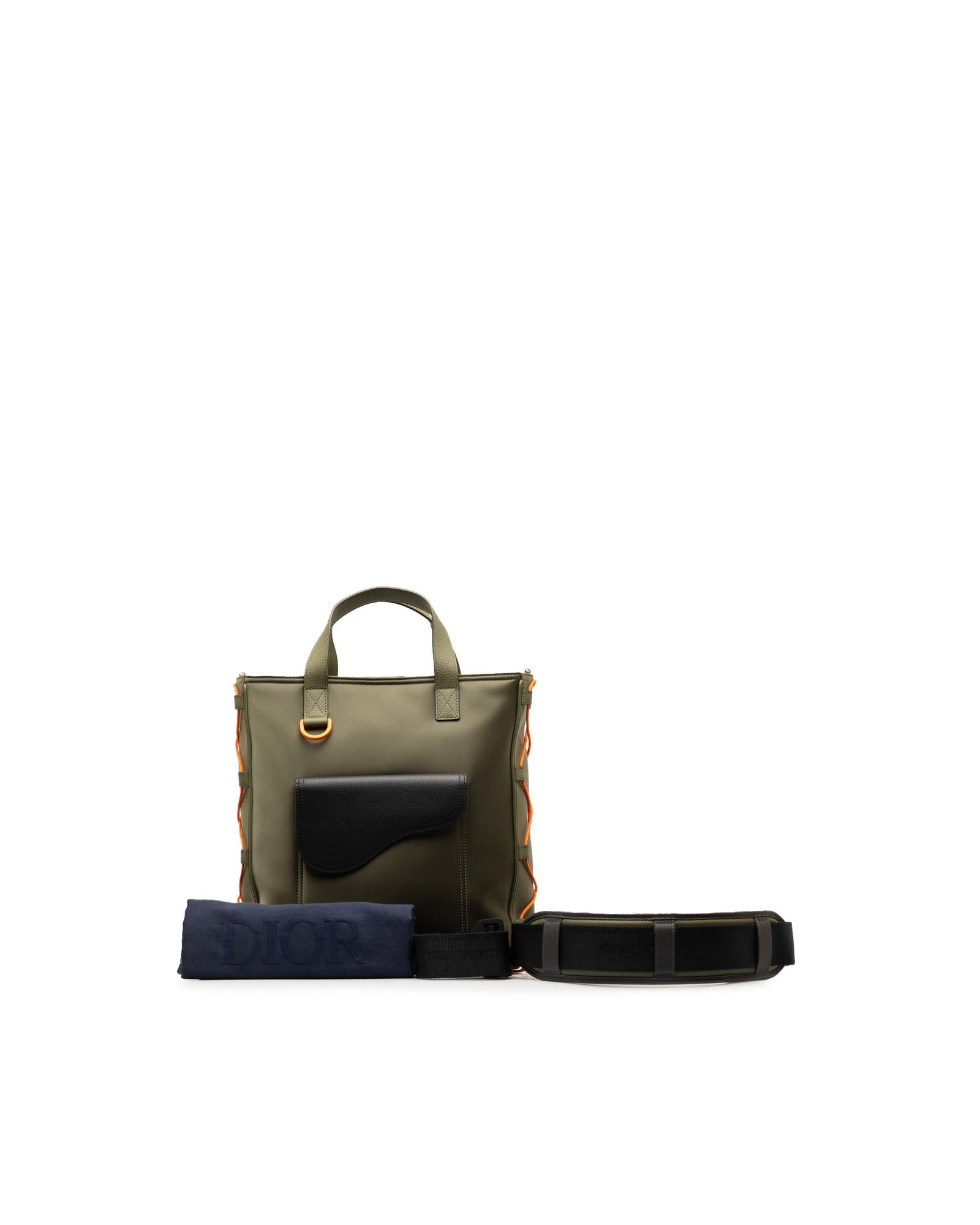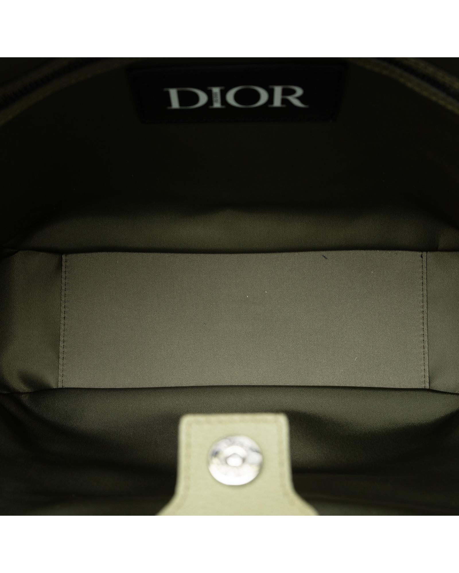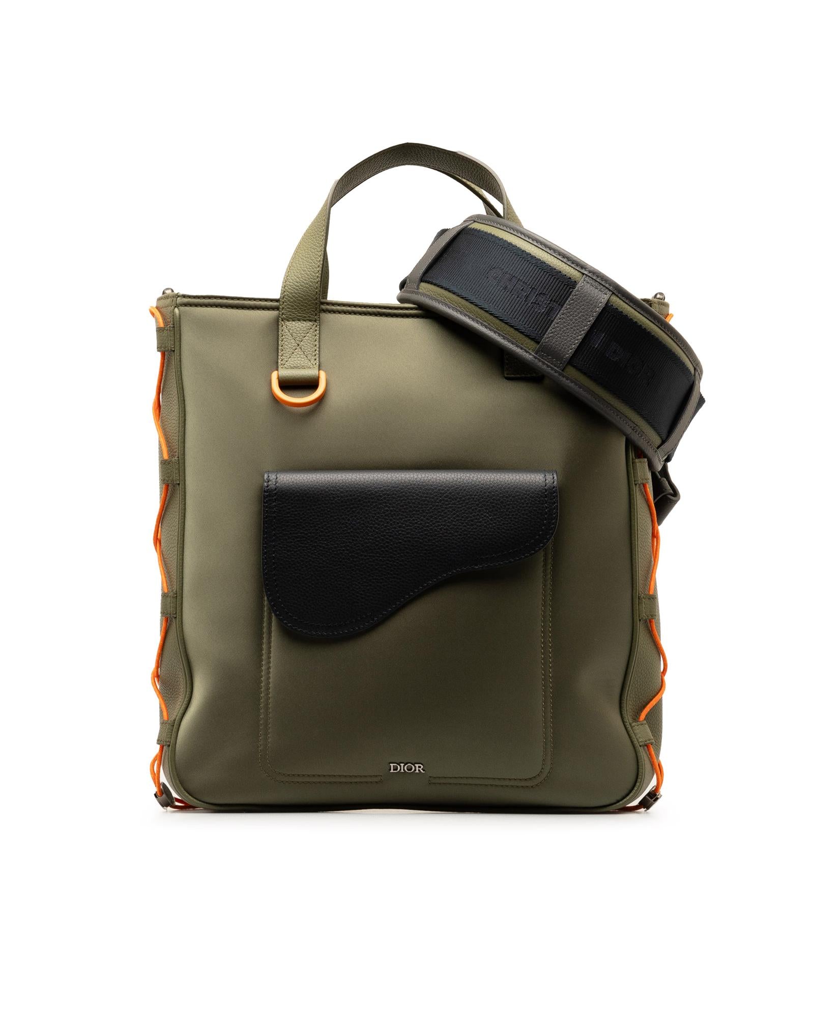 This satchel features a nylon body with leather trim flat leather handles an adjustable flat shoulder strap an open top with magnetic snap closure an exterior flap pocket and an interior zip pocket.Brand: Dior