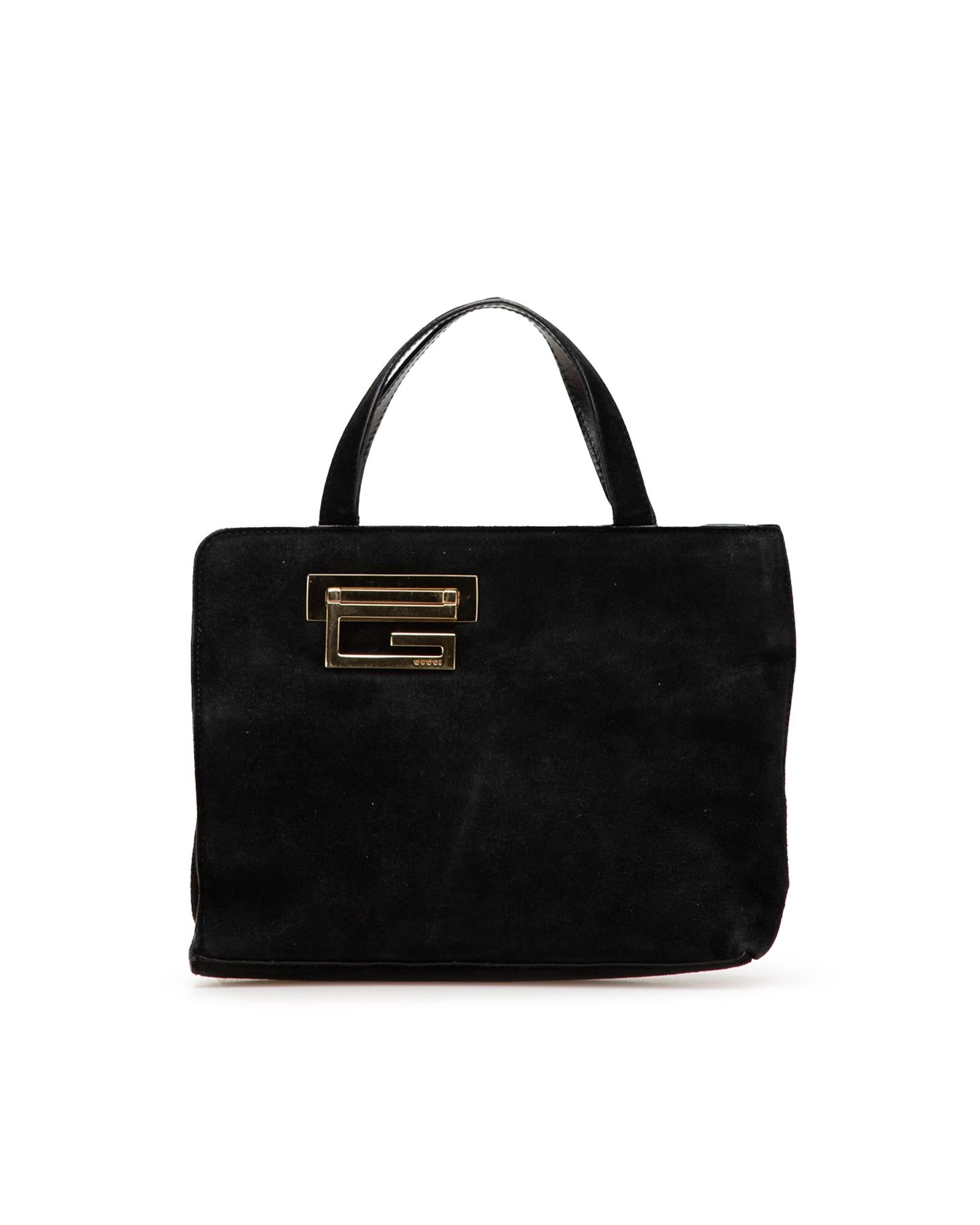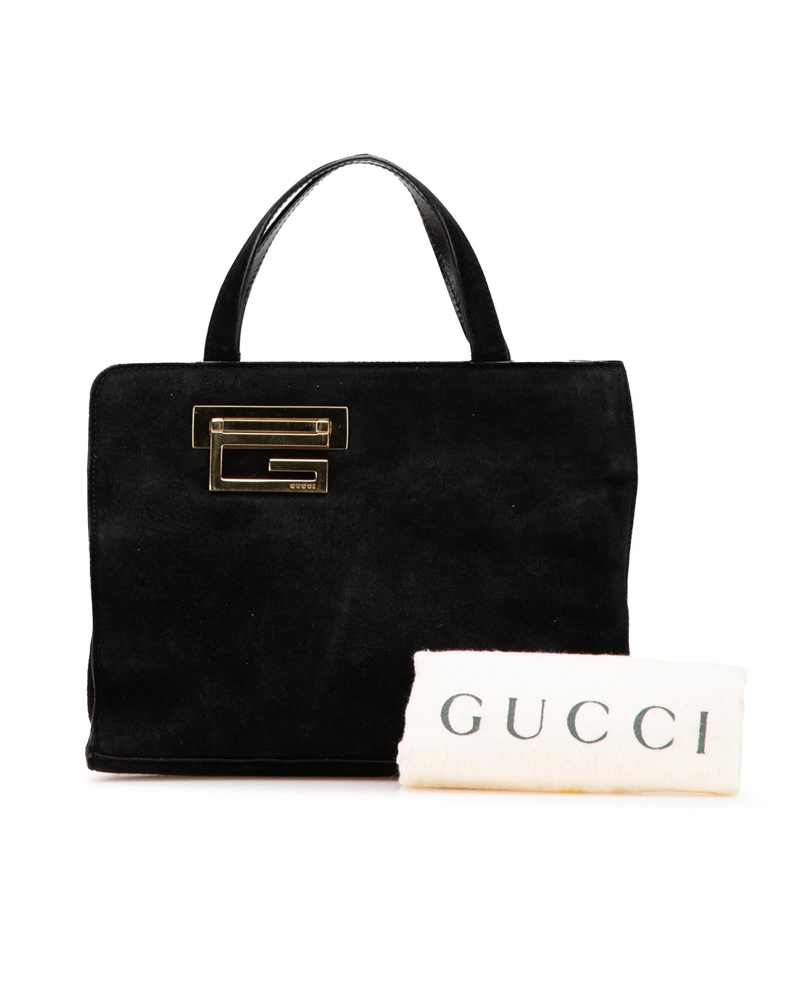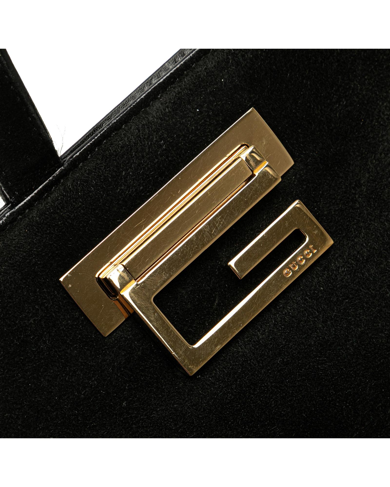 This handbag features a suede body a gold-tone detail flat leather handles an open top with a metal closure and an interior zip pocket.Brand: Gucci