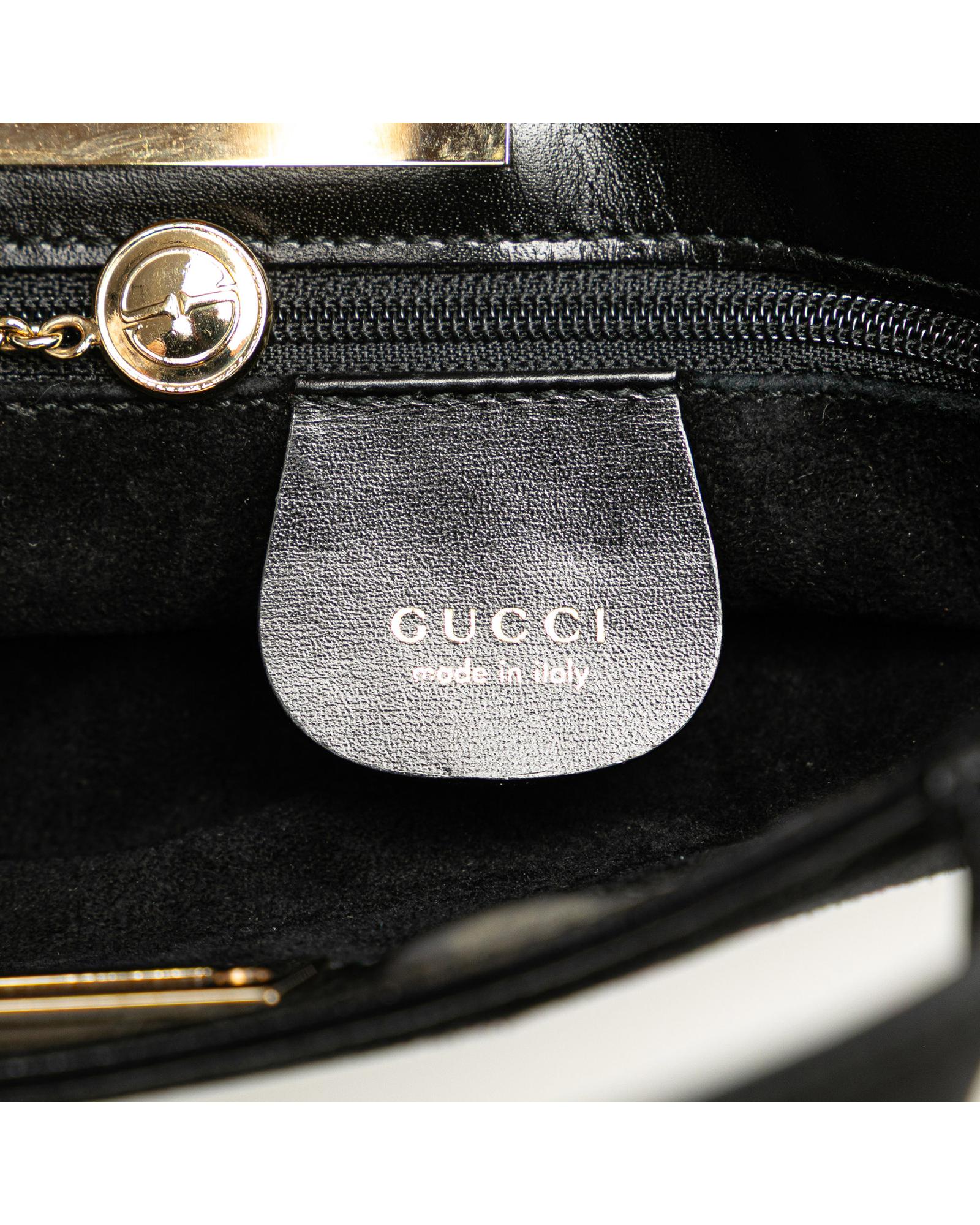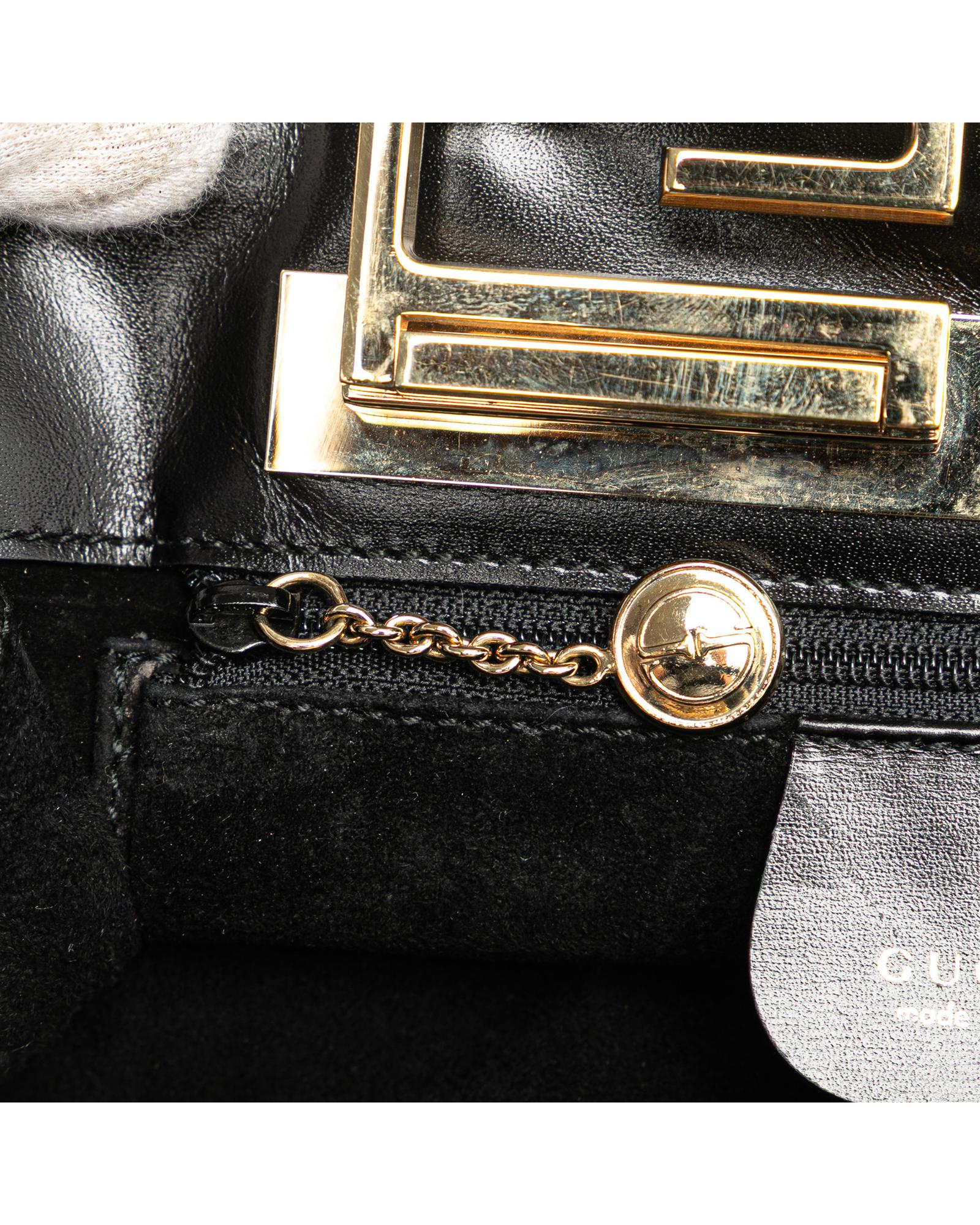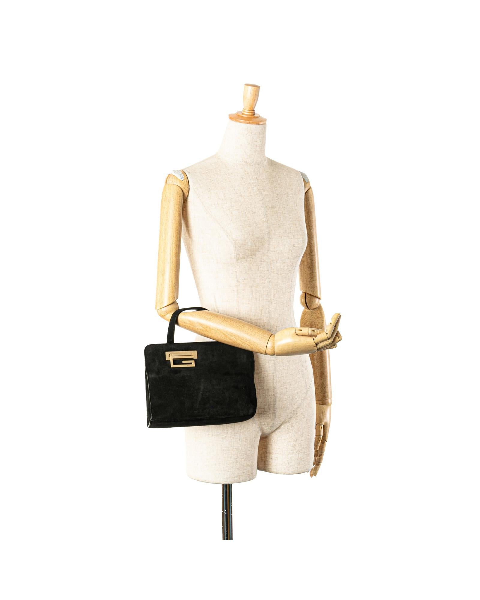 This handbag features a suede body a gold-tone detail flat leather handles an open top with a metal closure and an interior zip pocket.Brand: Gucci