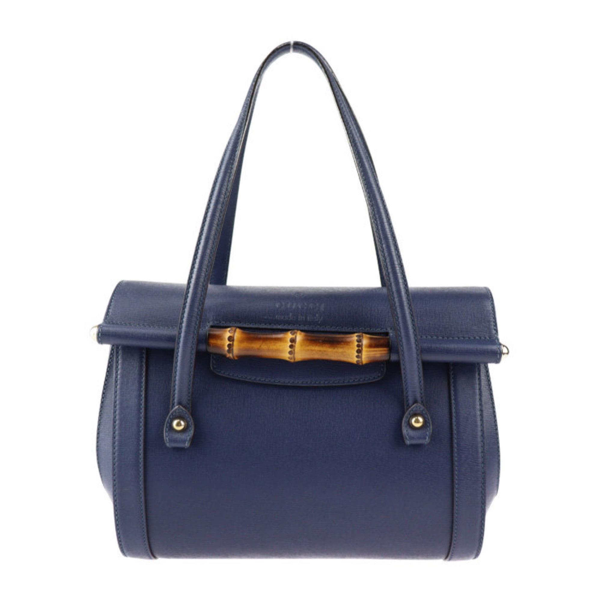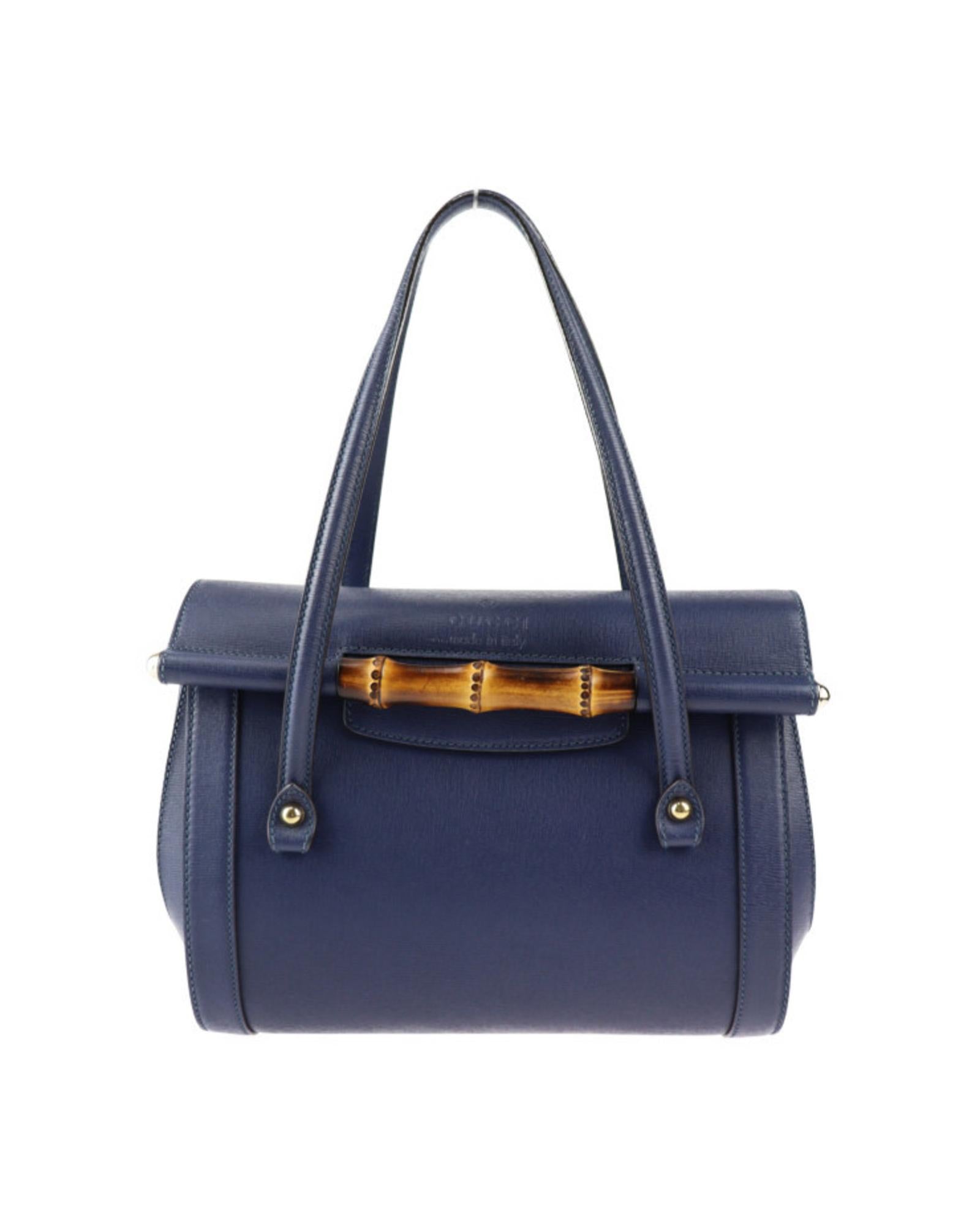 Brand: Gucci Model: Bamboo Color: Navy Material: Leather Inclusions: / Dimensions: 21cm x 27cm x 13.5cm Serial number: 338989 Country of origin: Italy Condition: AB - good condition. Gucci's Bamboo line offers a versatile selection of handbags shoulder bags and tote bags in navy leather accentuated with gold hardware delivering an elegant touch to any ensemble. Secured with a magnetic closure these accessories cater specifically to women. The item is in good condition overall with no notable damage to the exterior although there are some creases and cracks along the edges. The interior remains intact without any visible issues maintaining its quality and functionality. We recommend that you look at all the pictures before making your purchase to ensure that you are satisfied with the condition of the item.