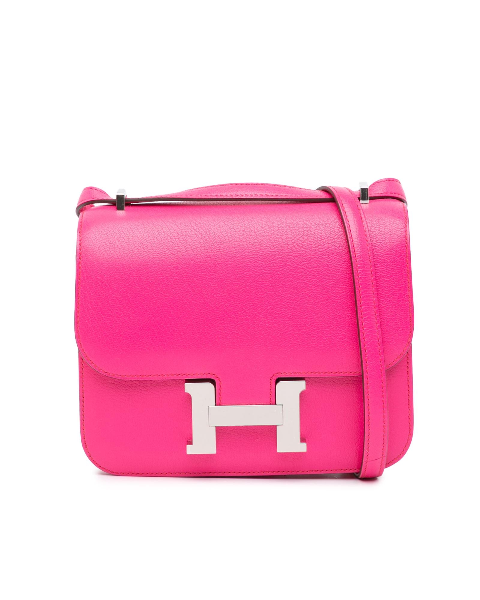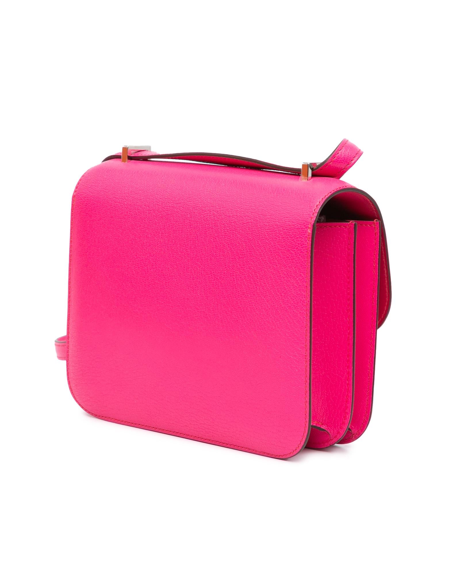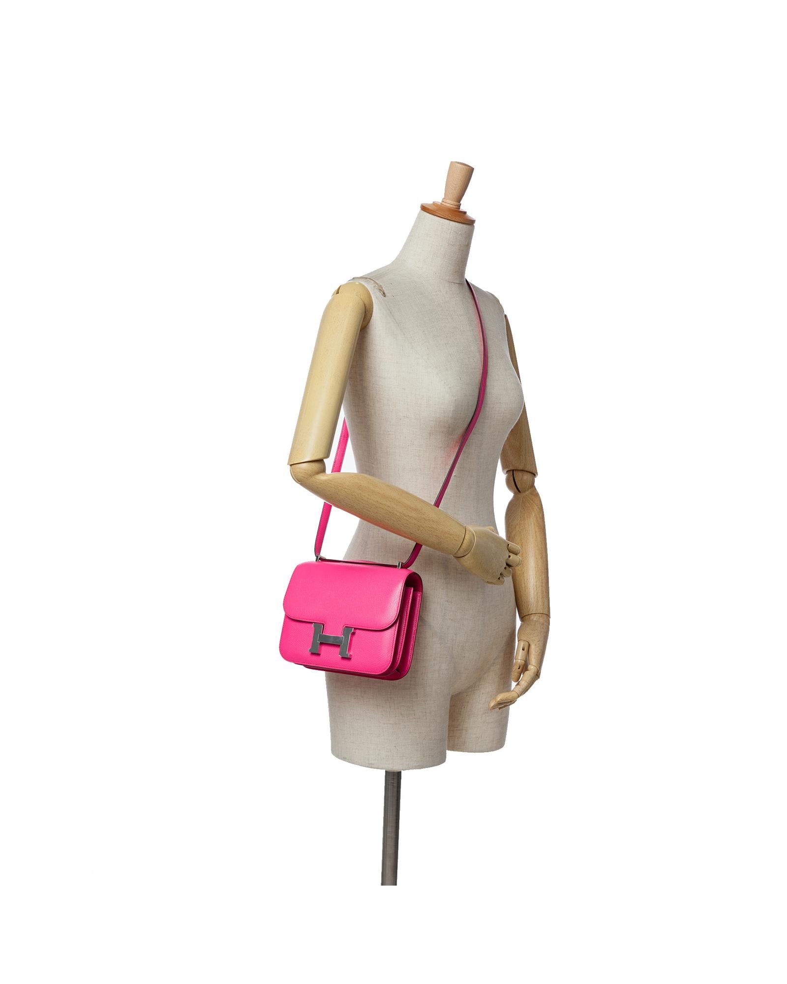 The Constance 18 Mini features a Chevre Chamkila leather body in Rose Pop color an adjustable shoulder strap a clasp closure and interior slip pockets.Brand: Hermes