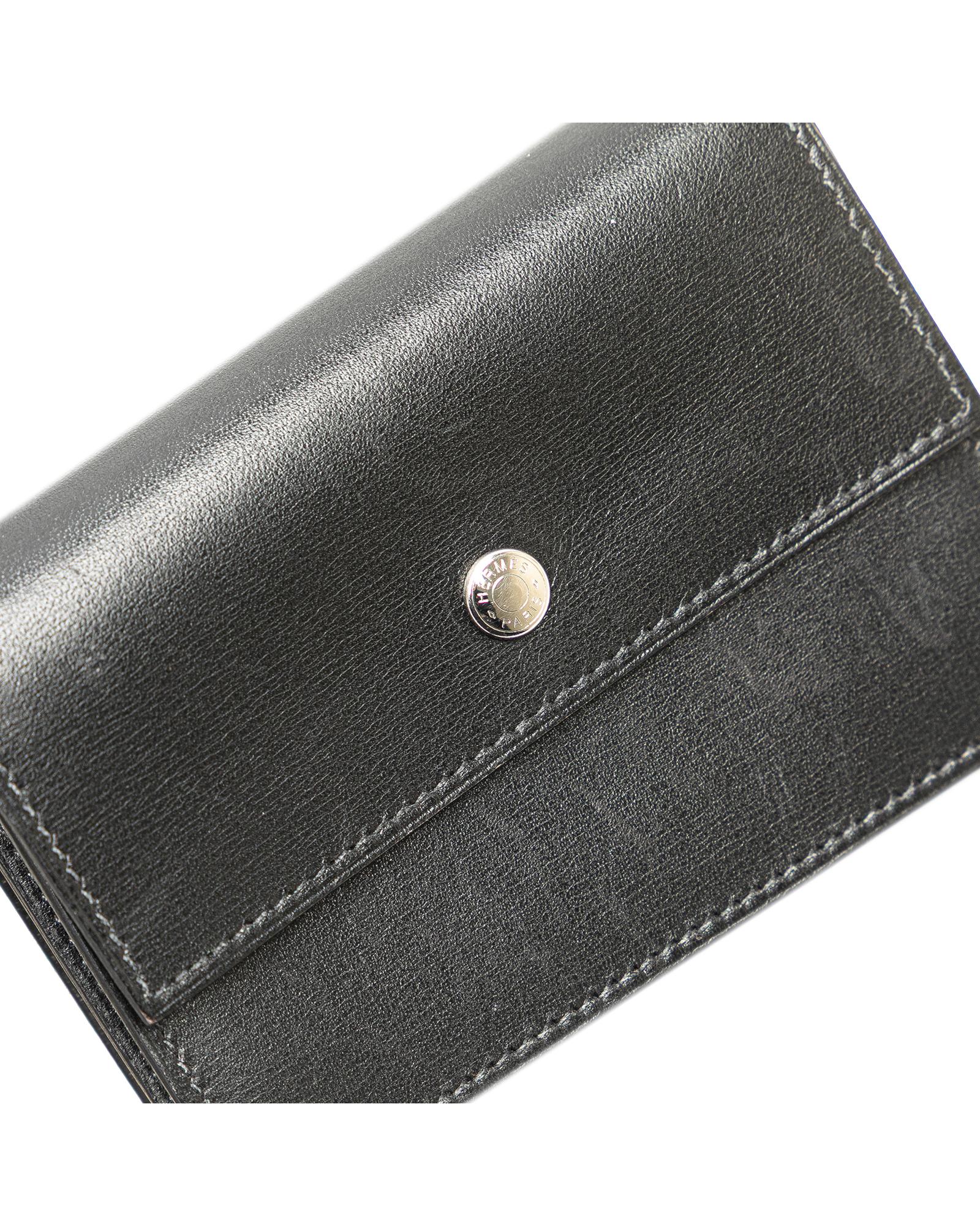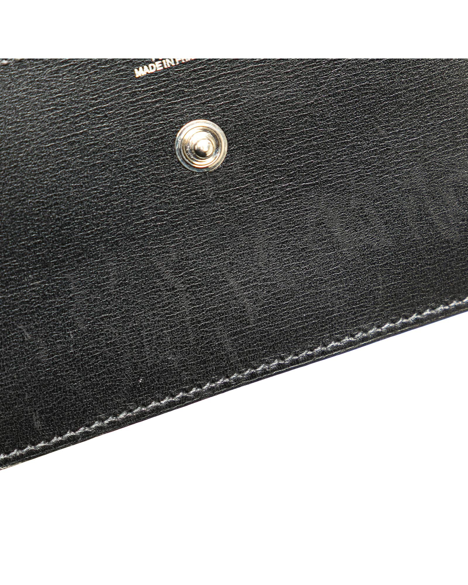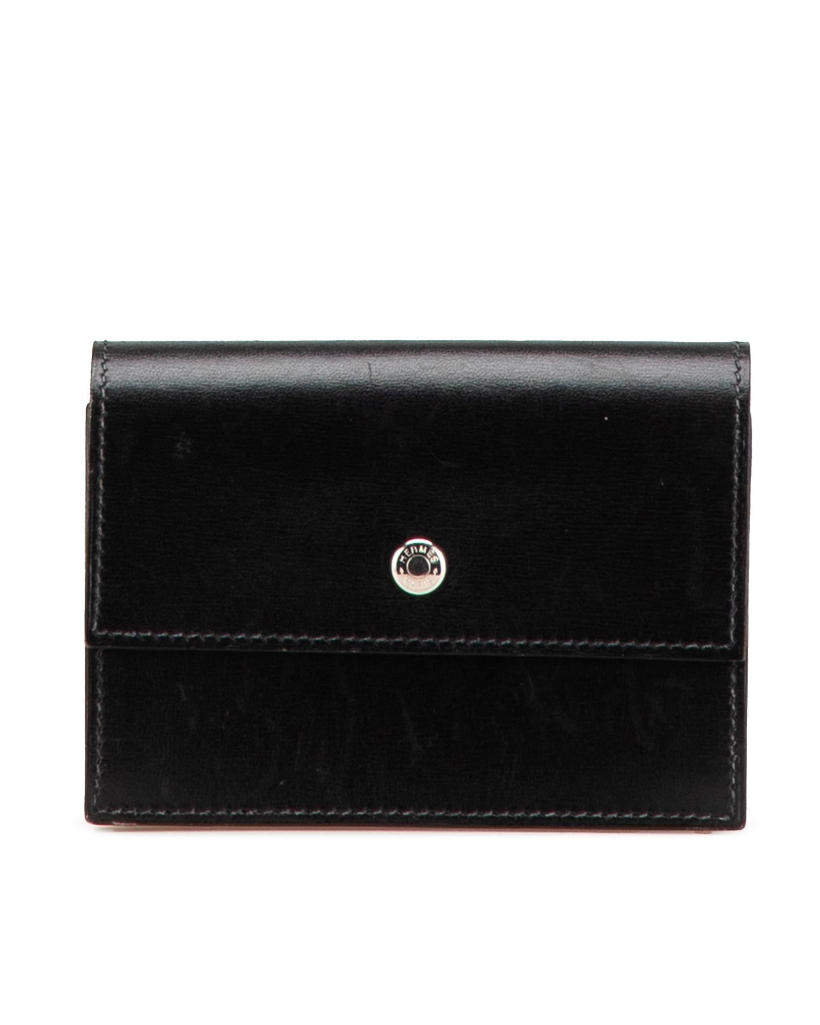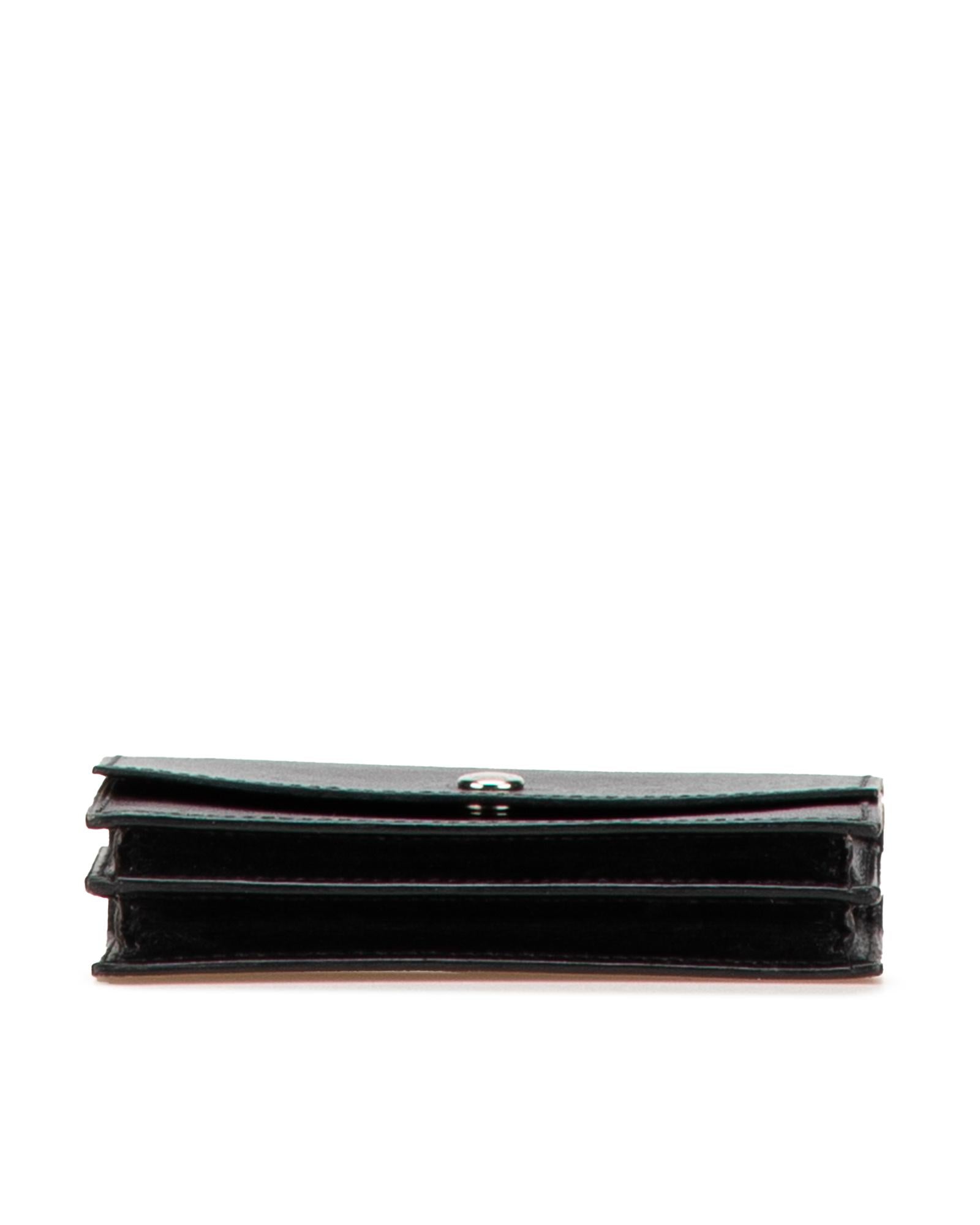 This card holder features a leather body a front flap with snap closure and interior slip compartments