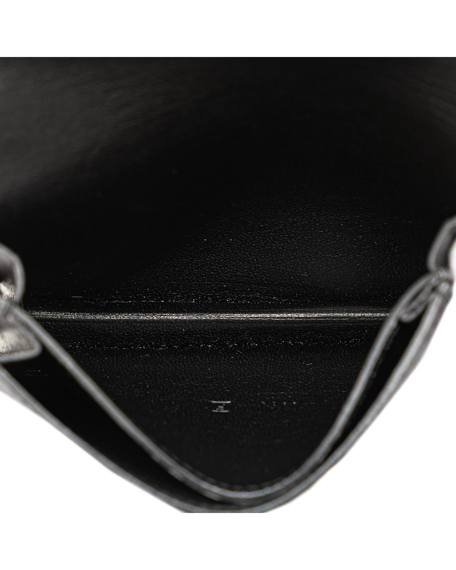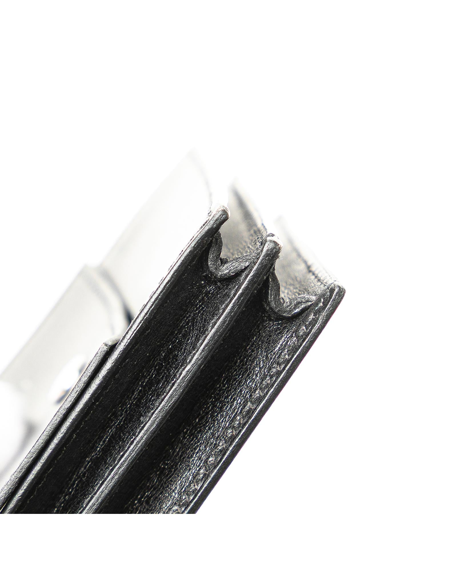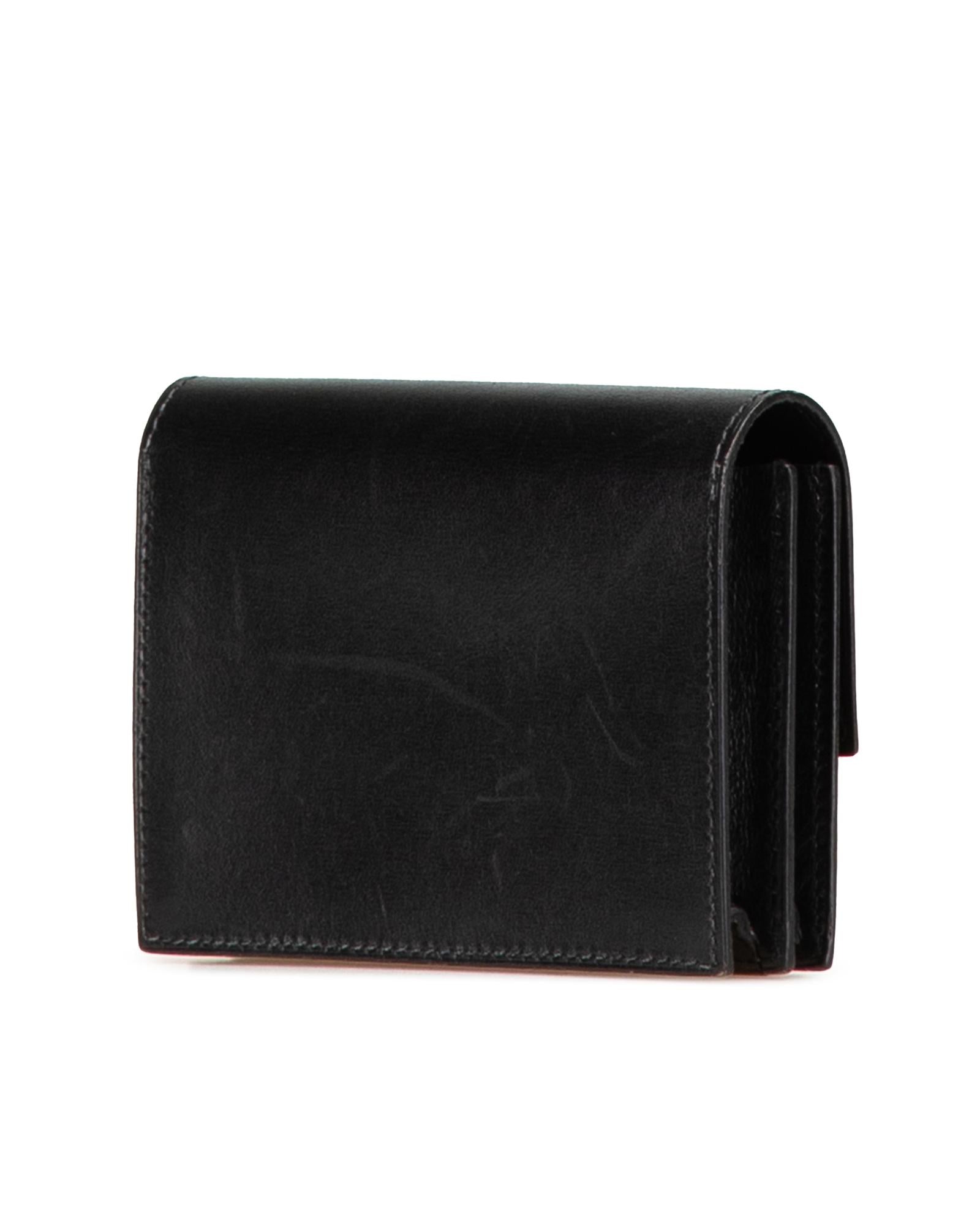 This card holder features a leather body a front flap with snap closure and interior slip compartments