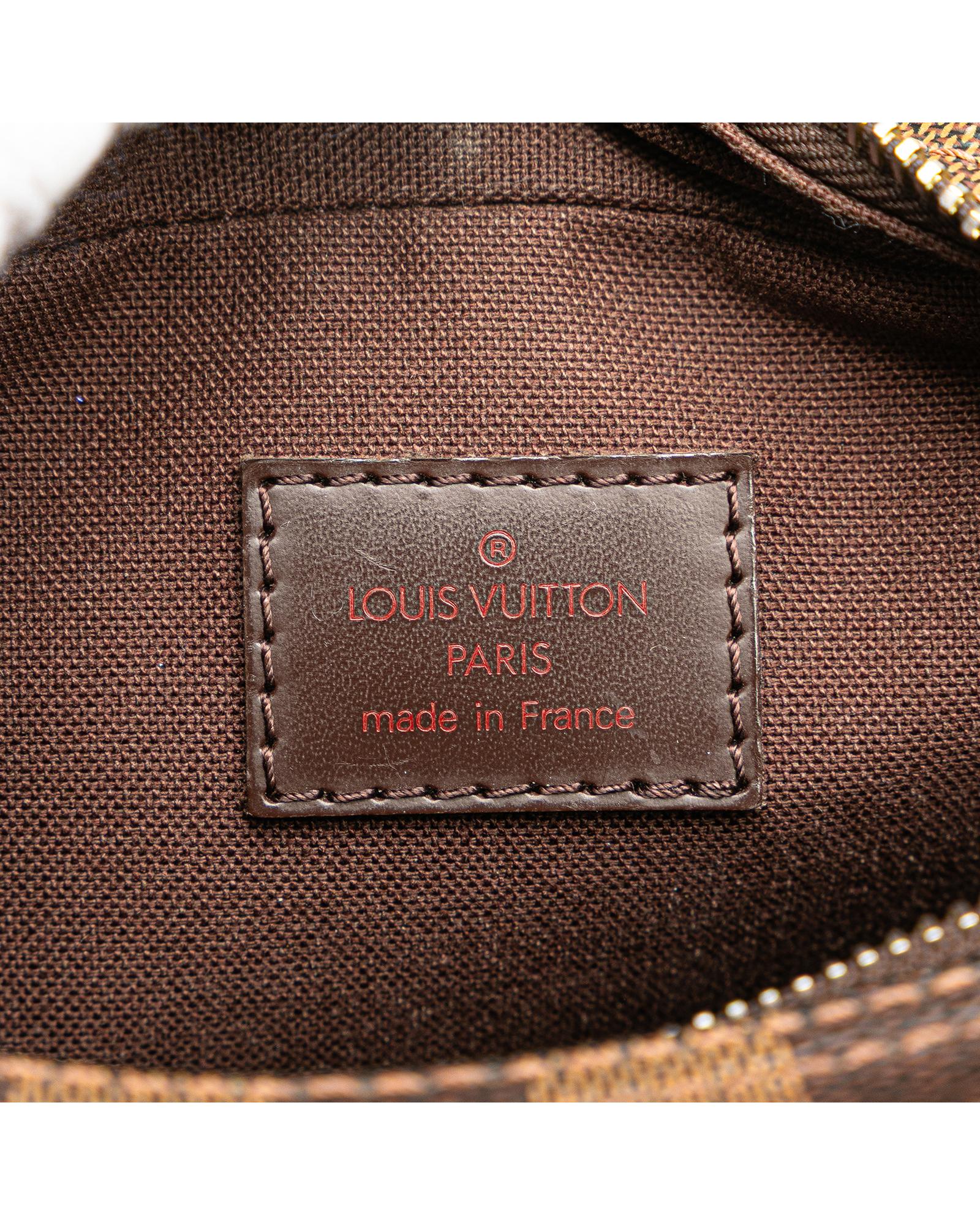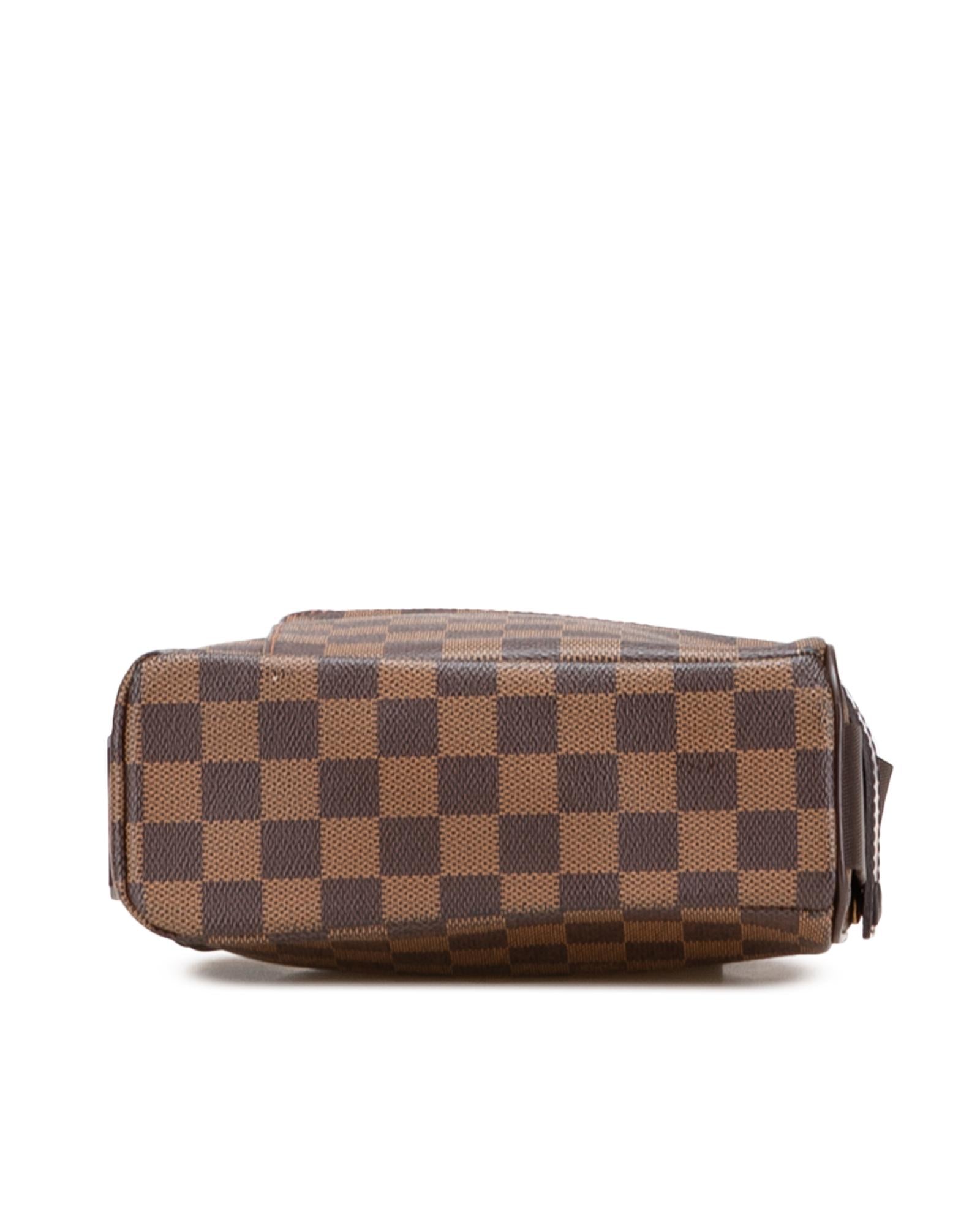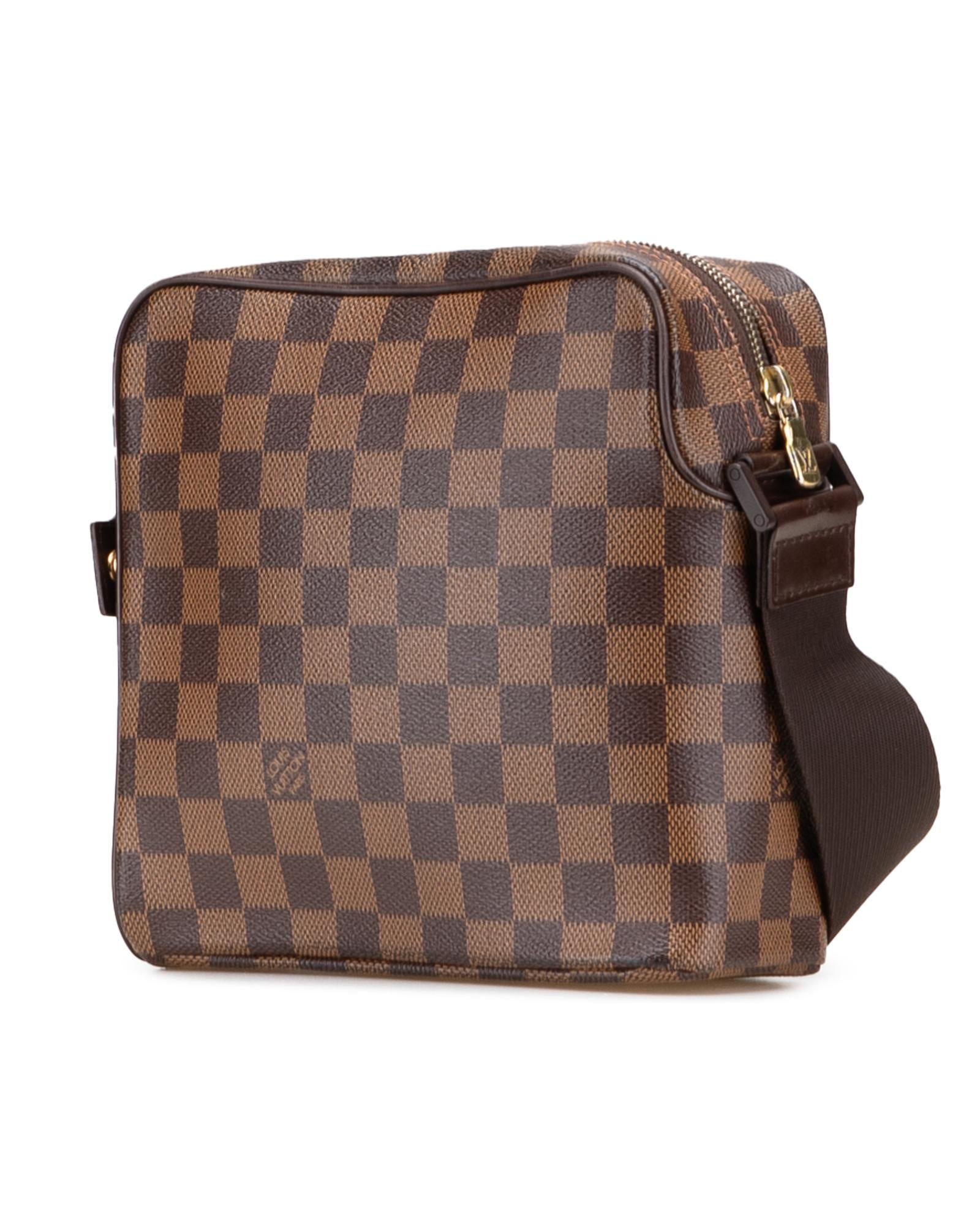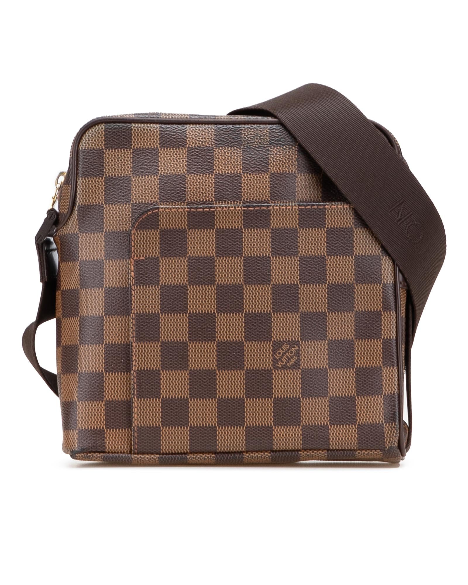 The Olav PM features a damier ebene canvas body with leather trim an adjustable flat strap a top zip closure a front exterior slip pocket and an interior slip pocket.Brand: Louis Vuitton