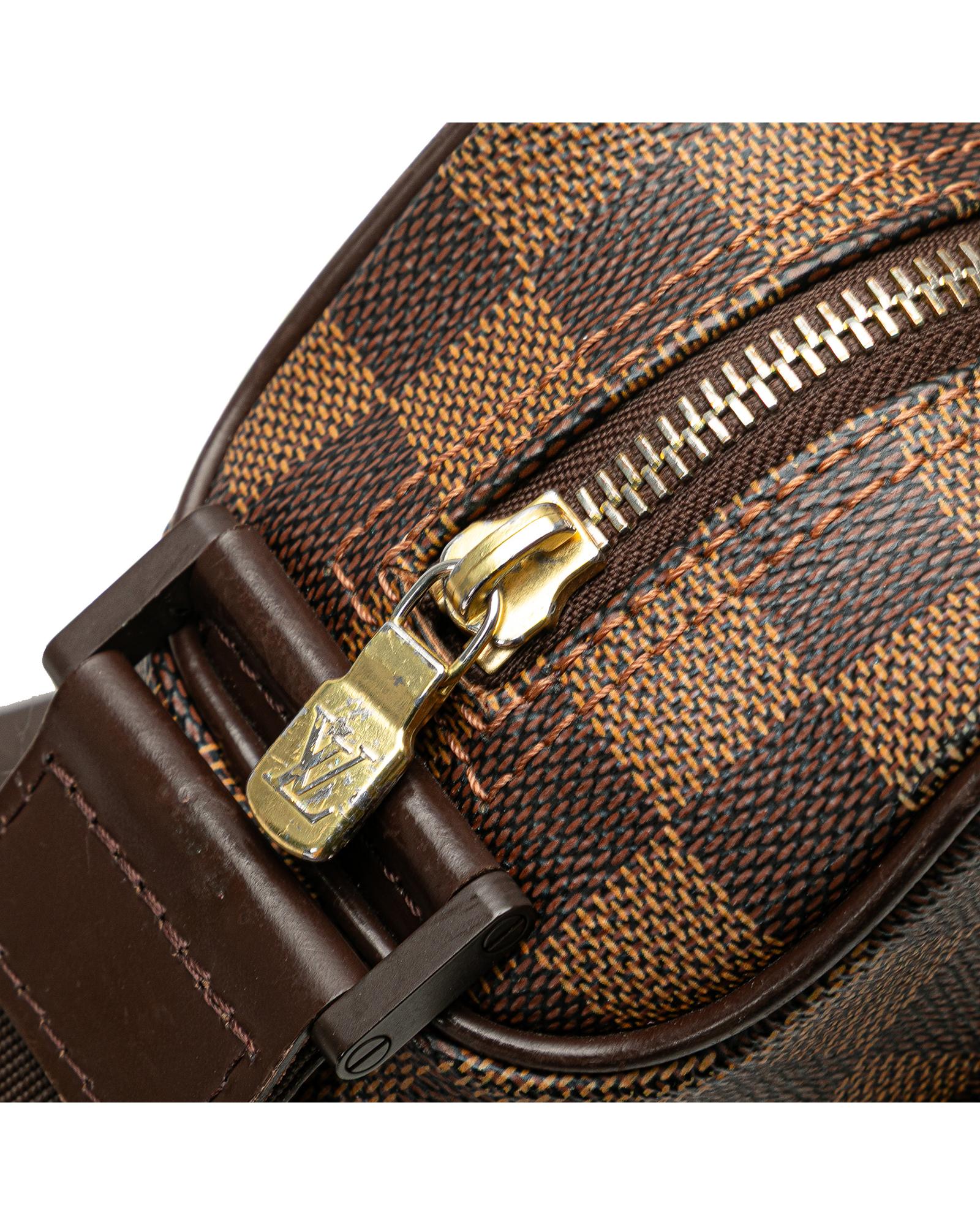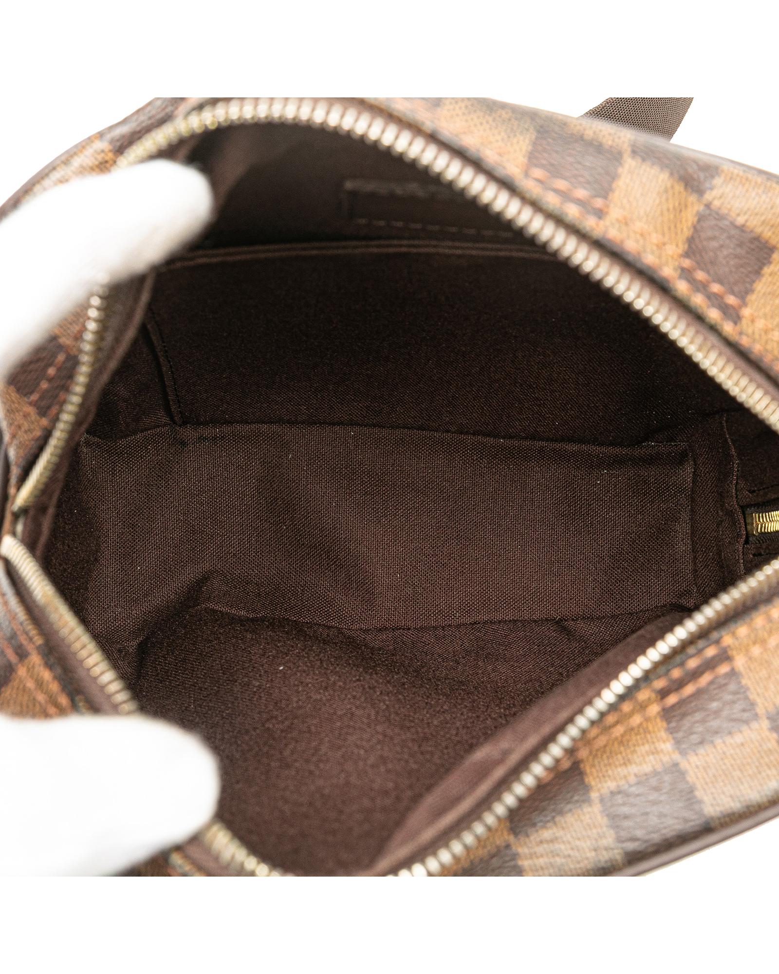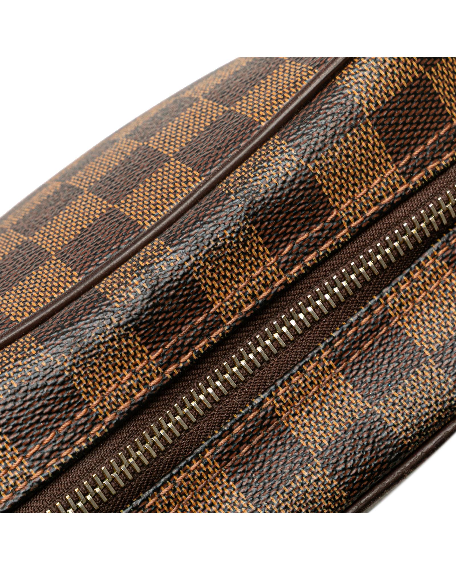 The Olav PM features a damier ebene canvas body with leather trim an adjustable flat strap a top zip closure a front exterior slip pocket and an interior slip pocket.Brand: Louis Vuitton