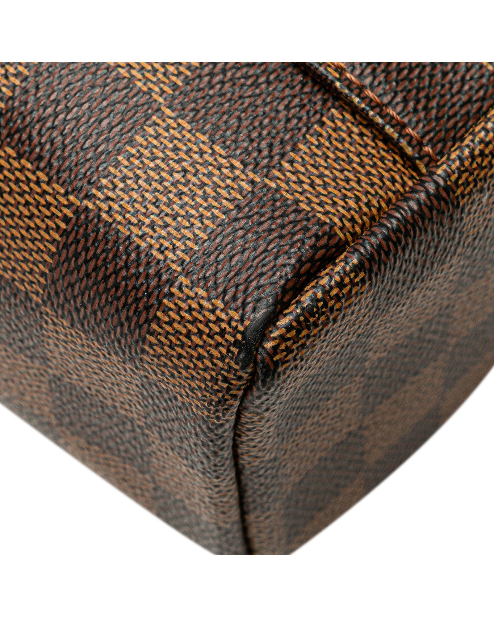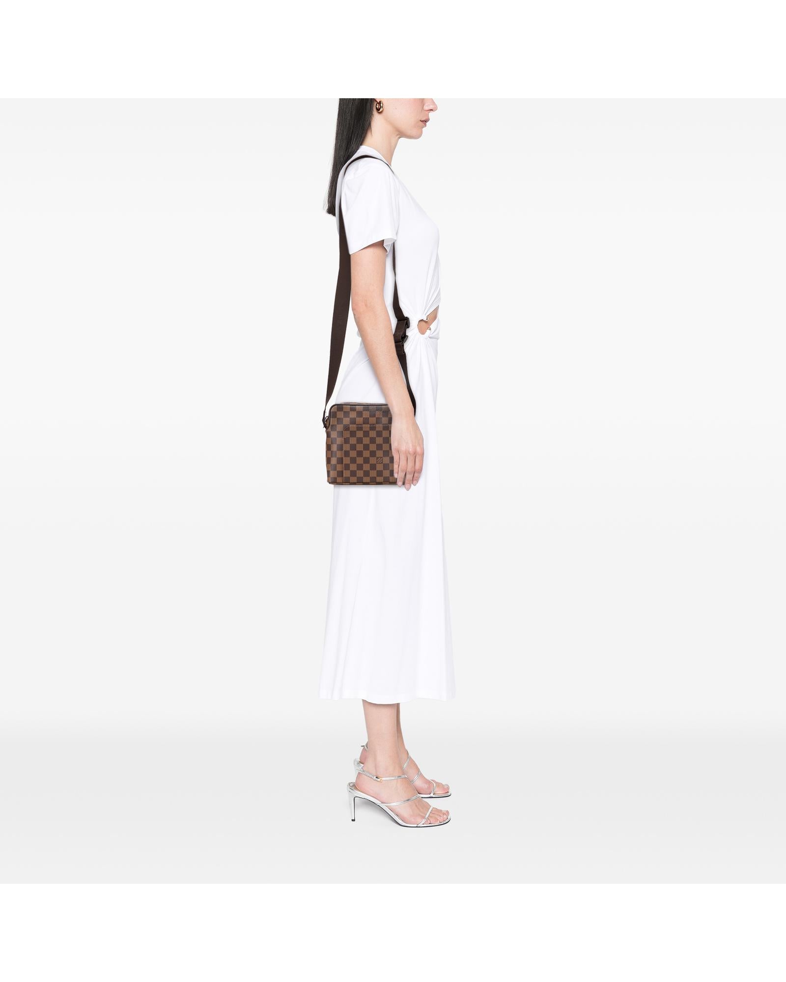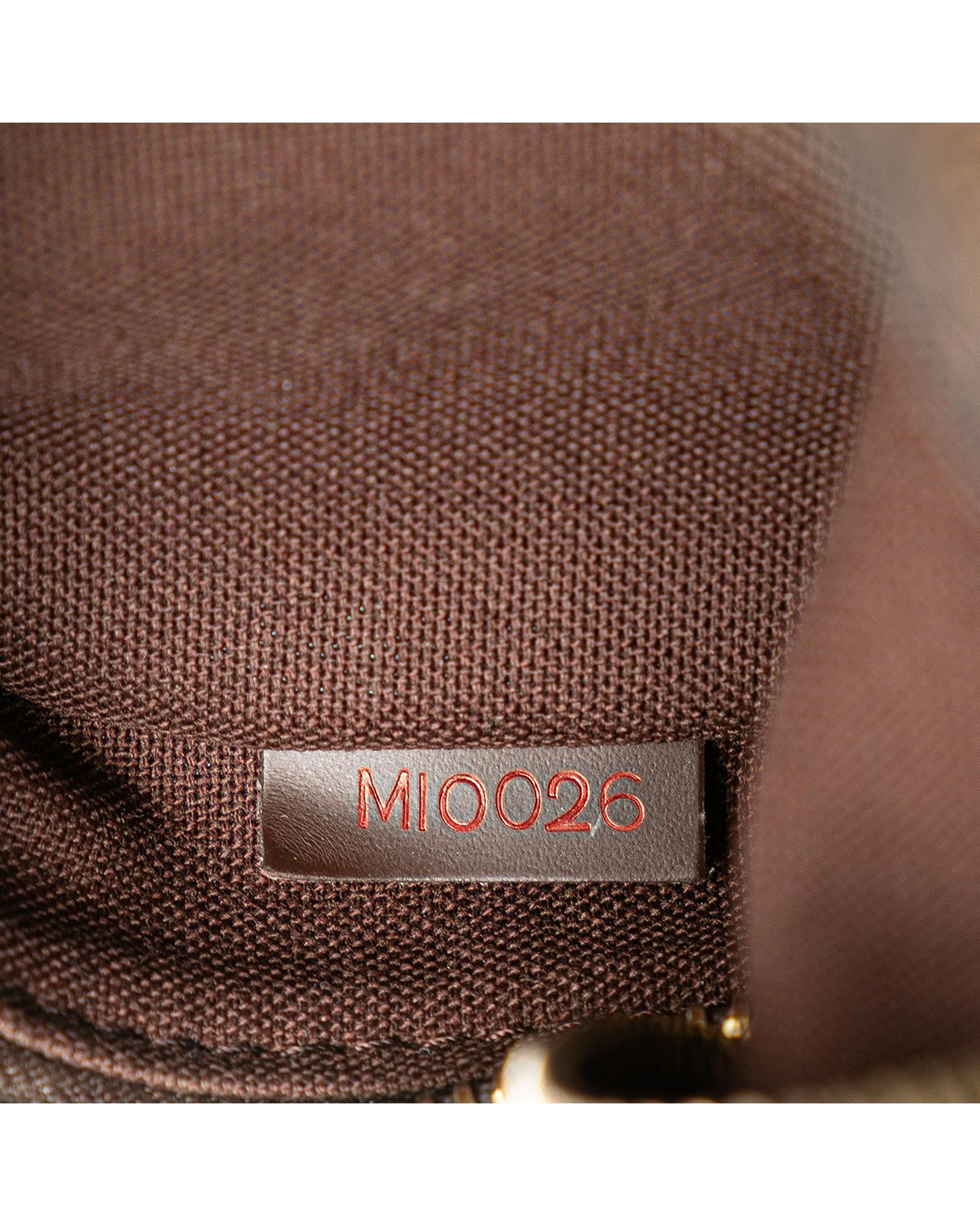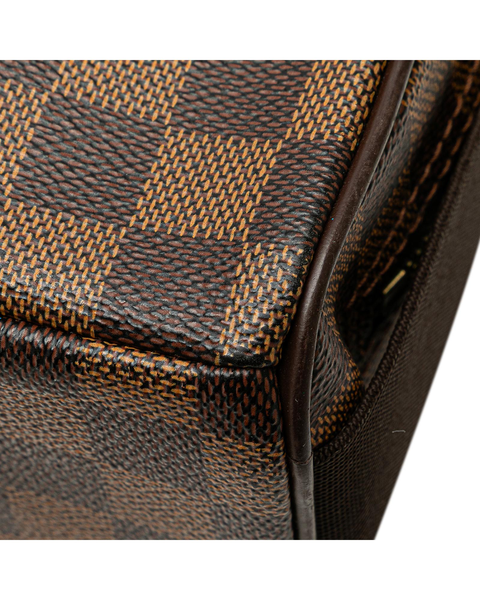 The Olav PM features a damier ebene canvas body with leather trim an adjustable flat strap a top zip closure a front exterior slip pocket and an interior slip pocket.Brand: Louis Vuitton