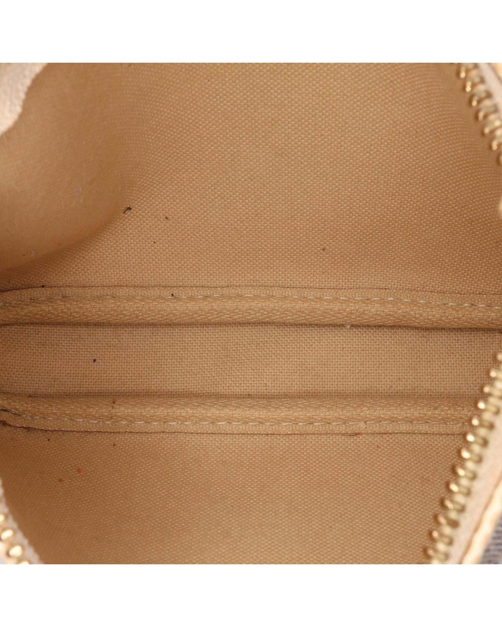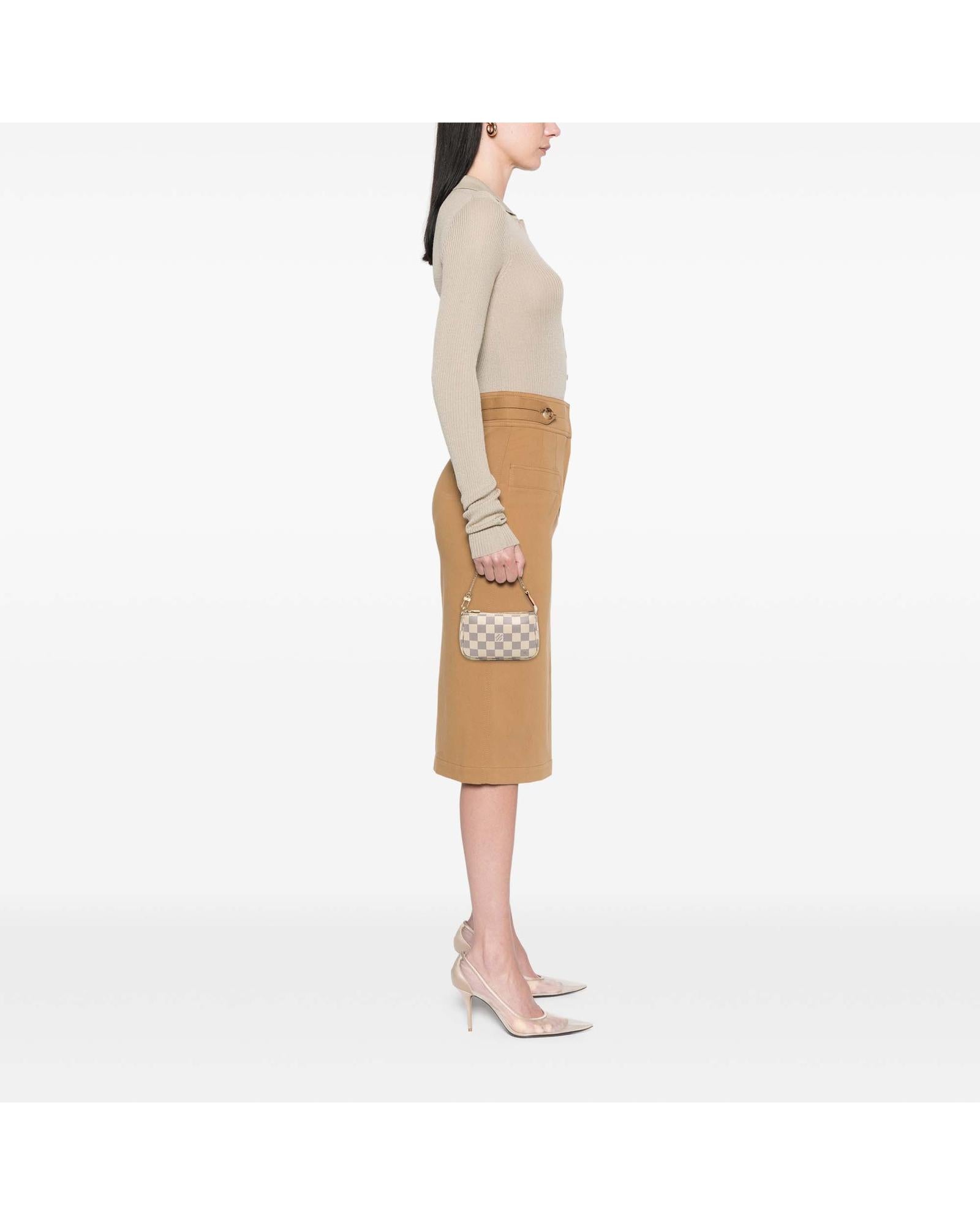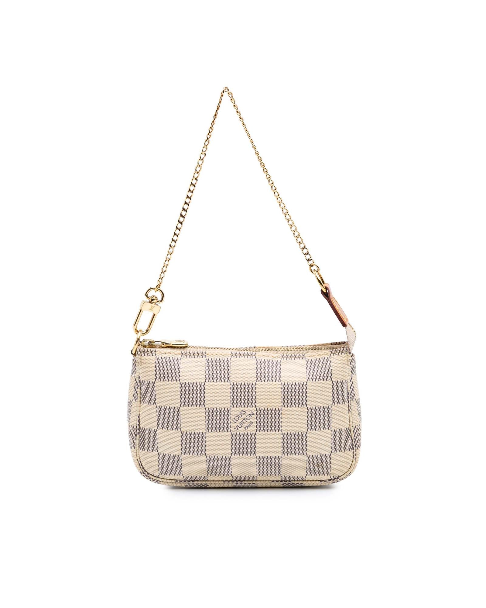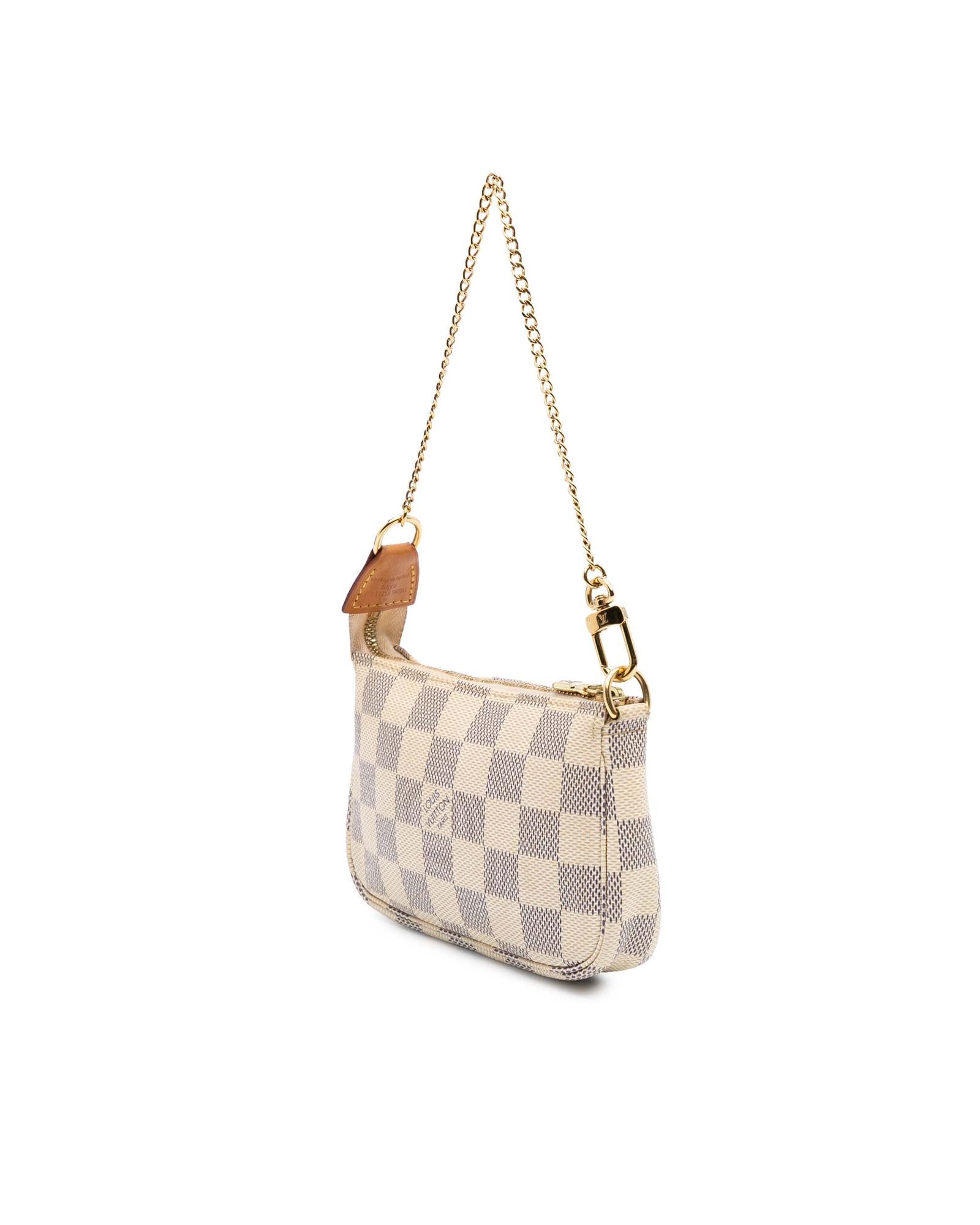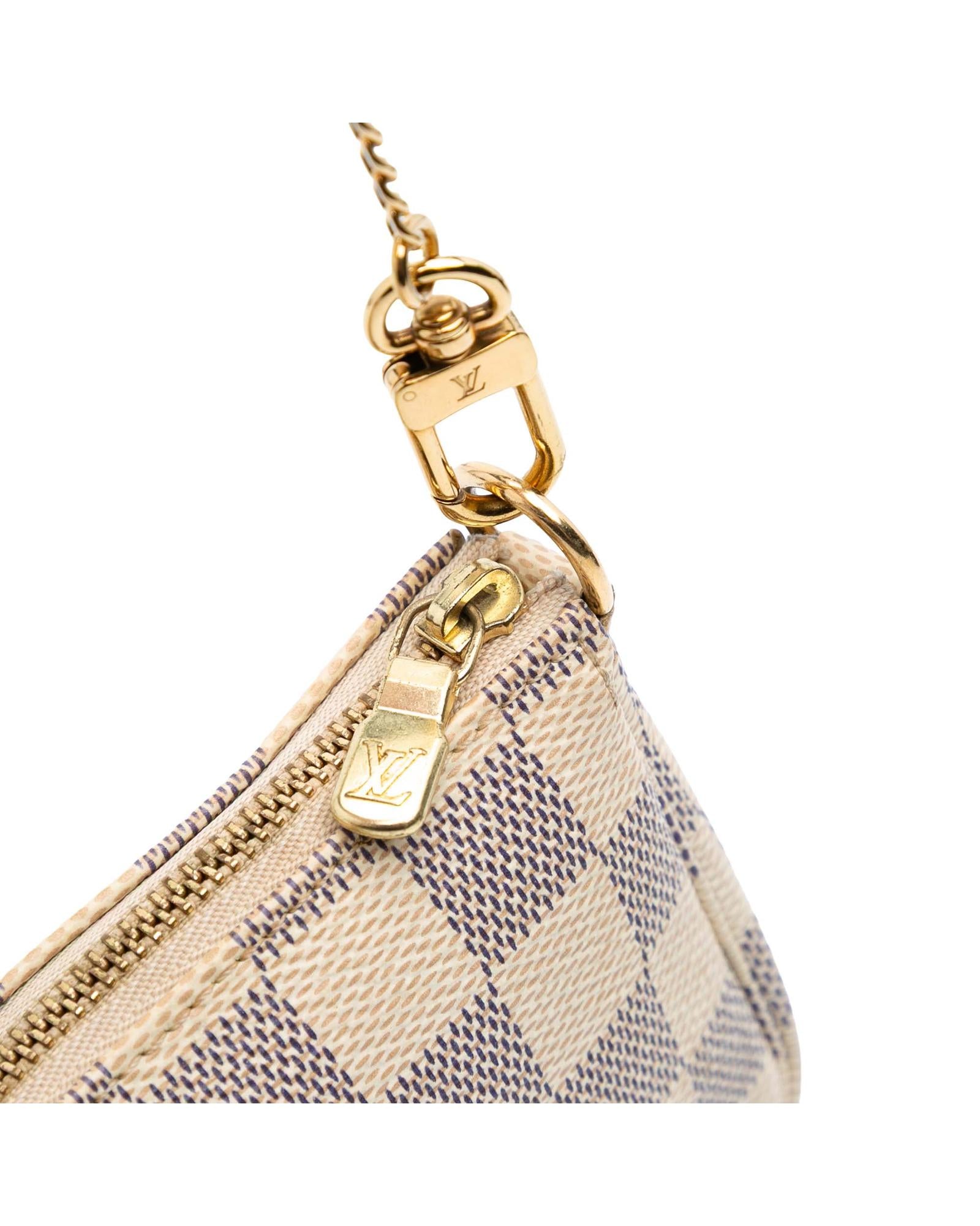 The Mini Pochette Accessoires features a damier azur canvas body a detachable chain link strap and a top zip closure.