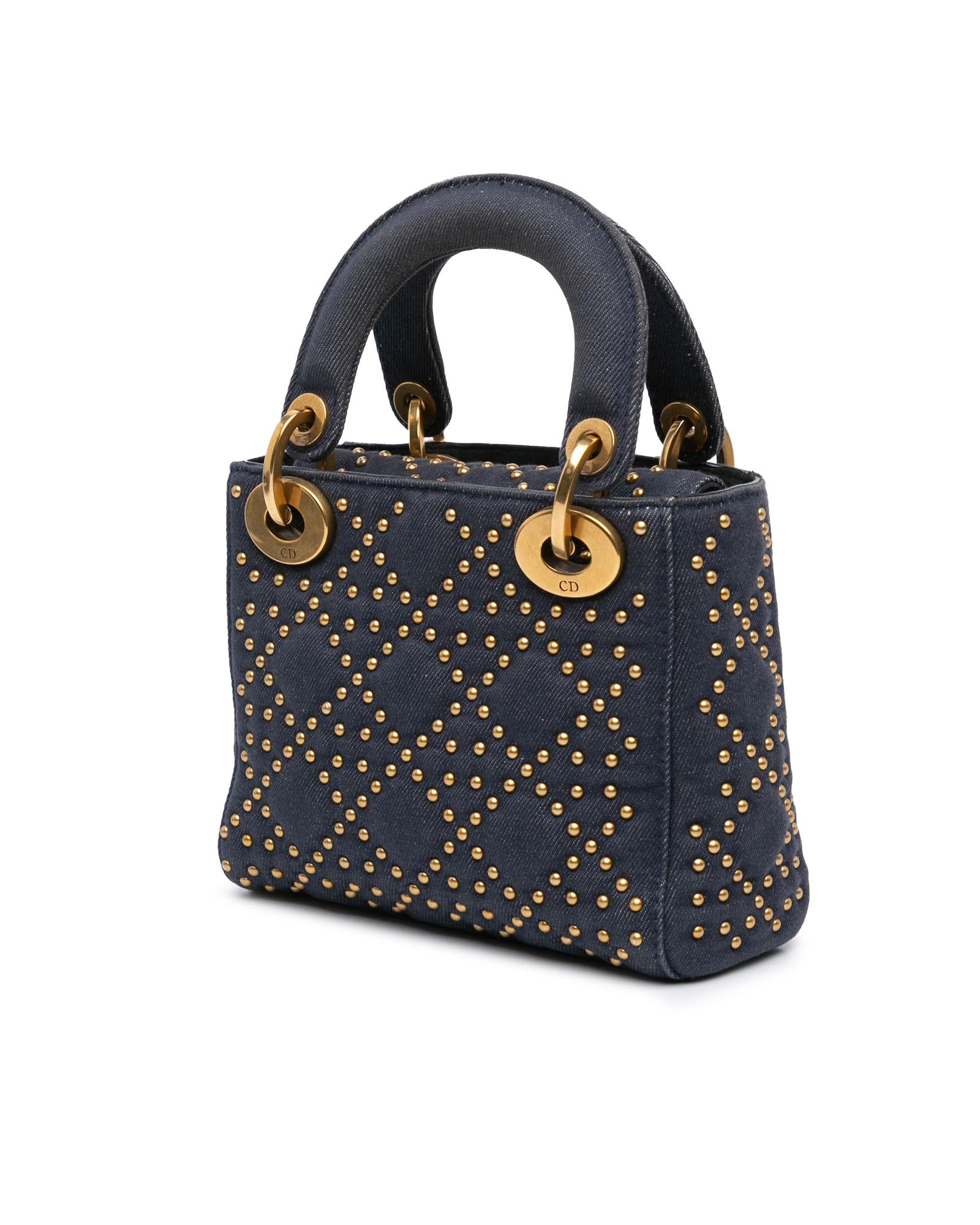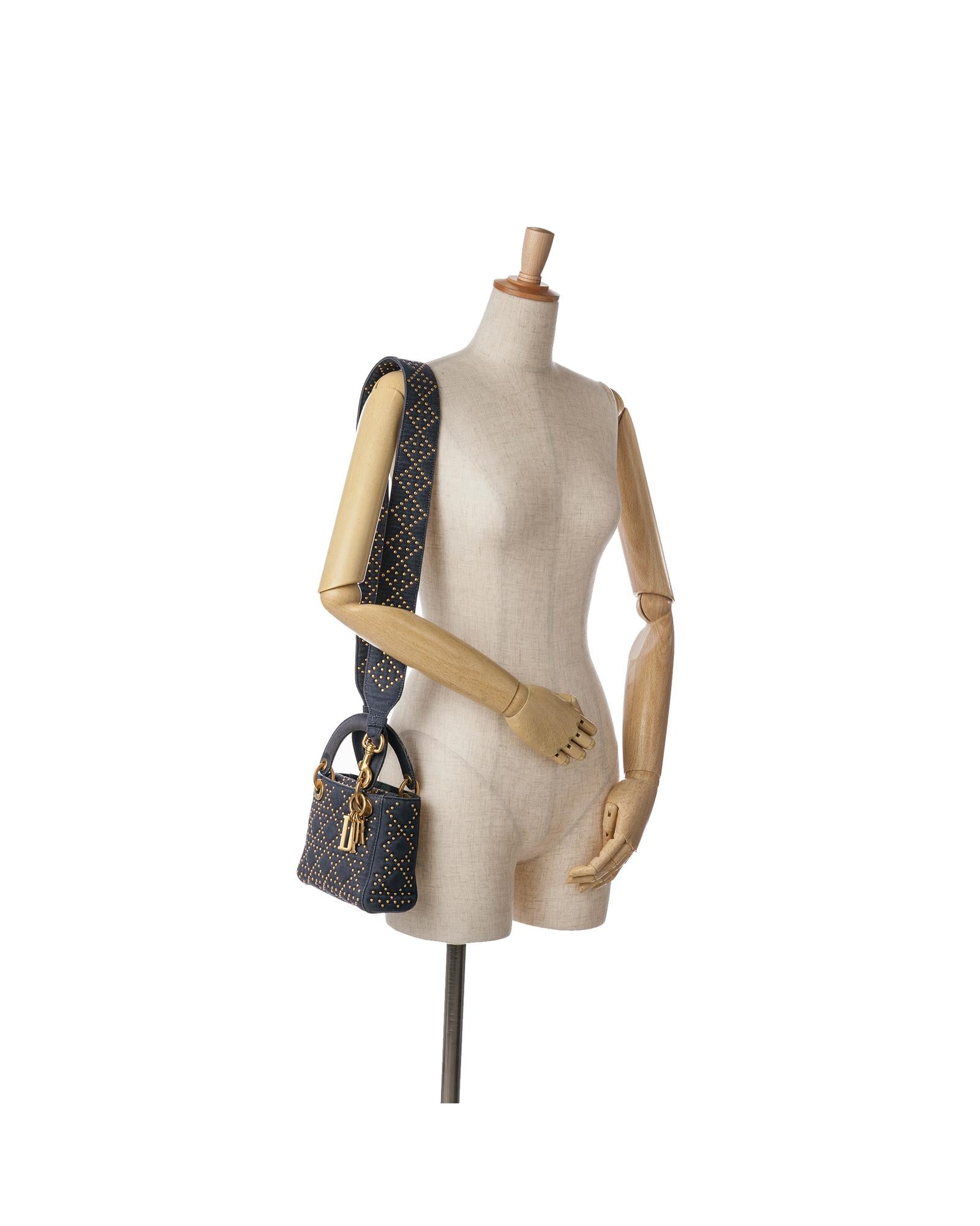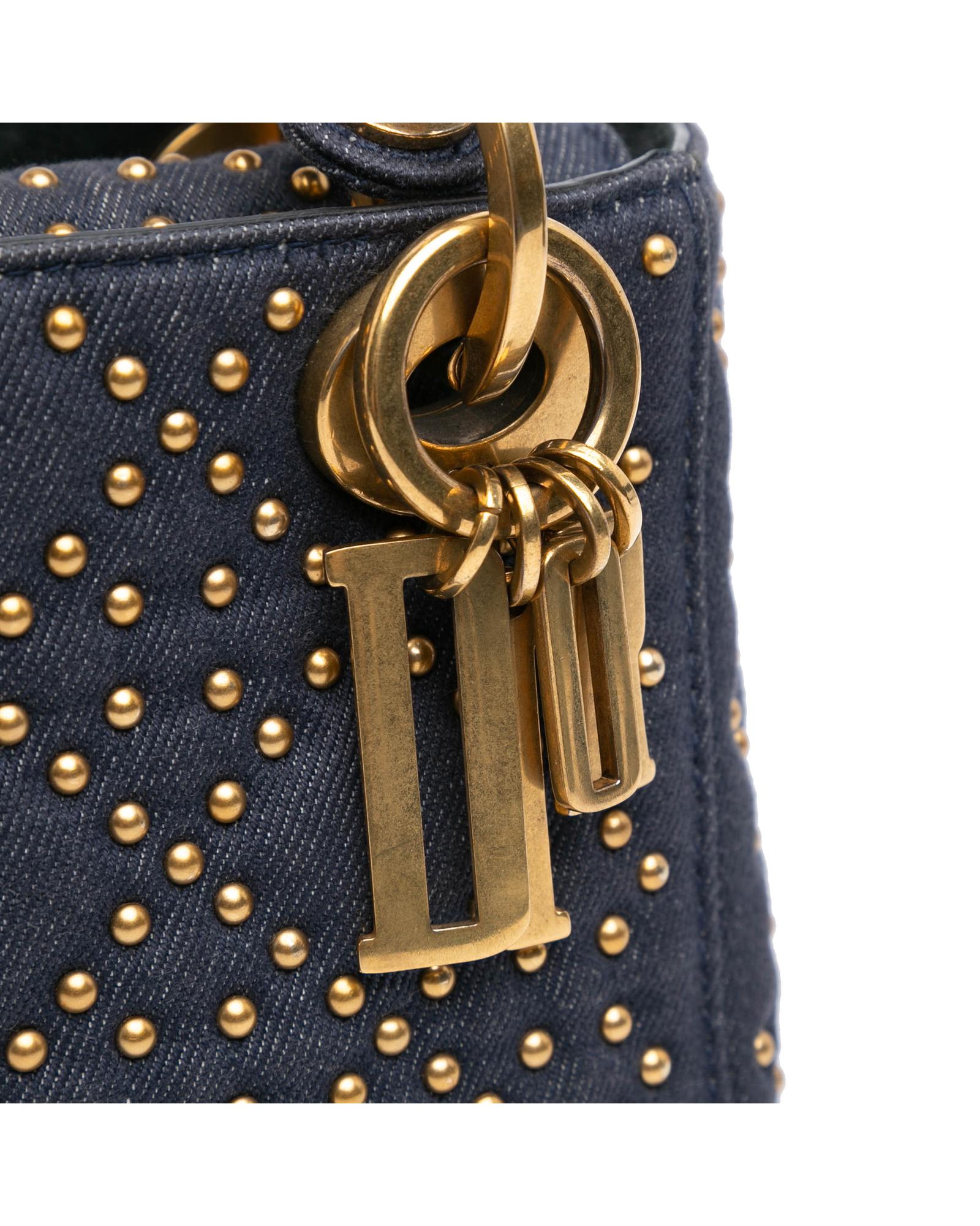 This Lady Dior satchel features a studded denim body flat handles a detachable flat strap a top fold-in flap closure and an interior zip pocket.Brand: Dior Vintage