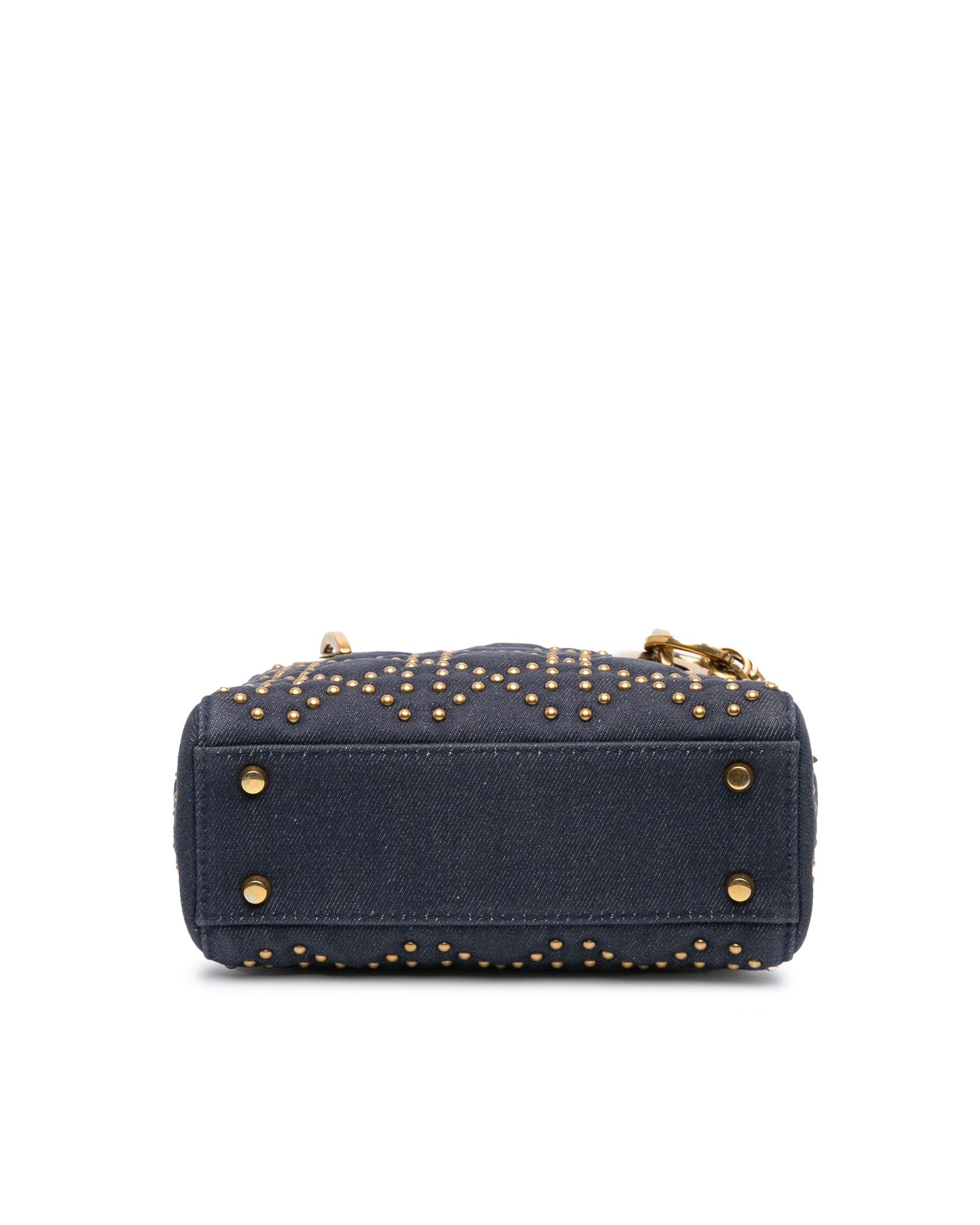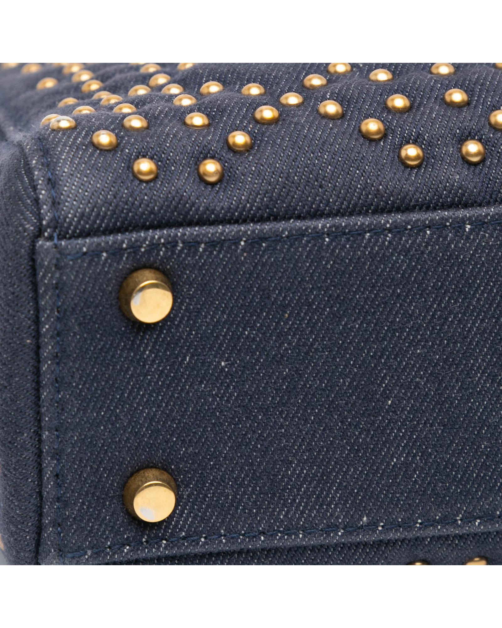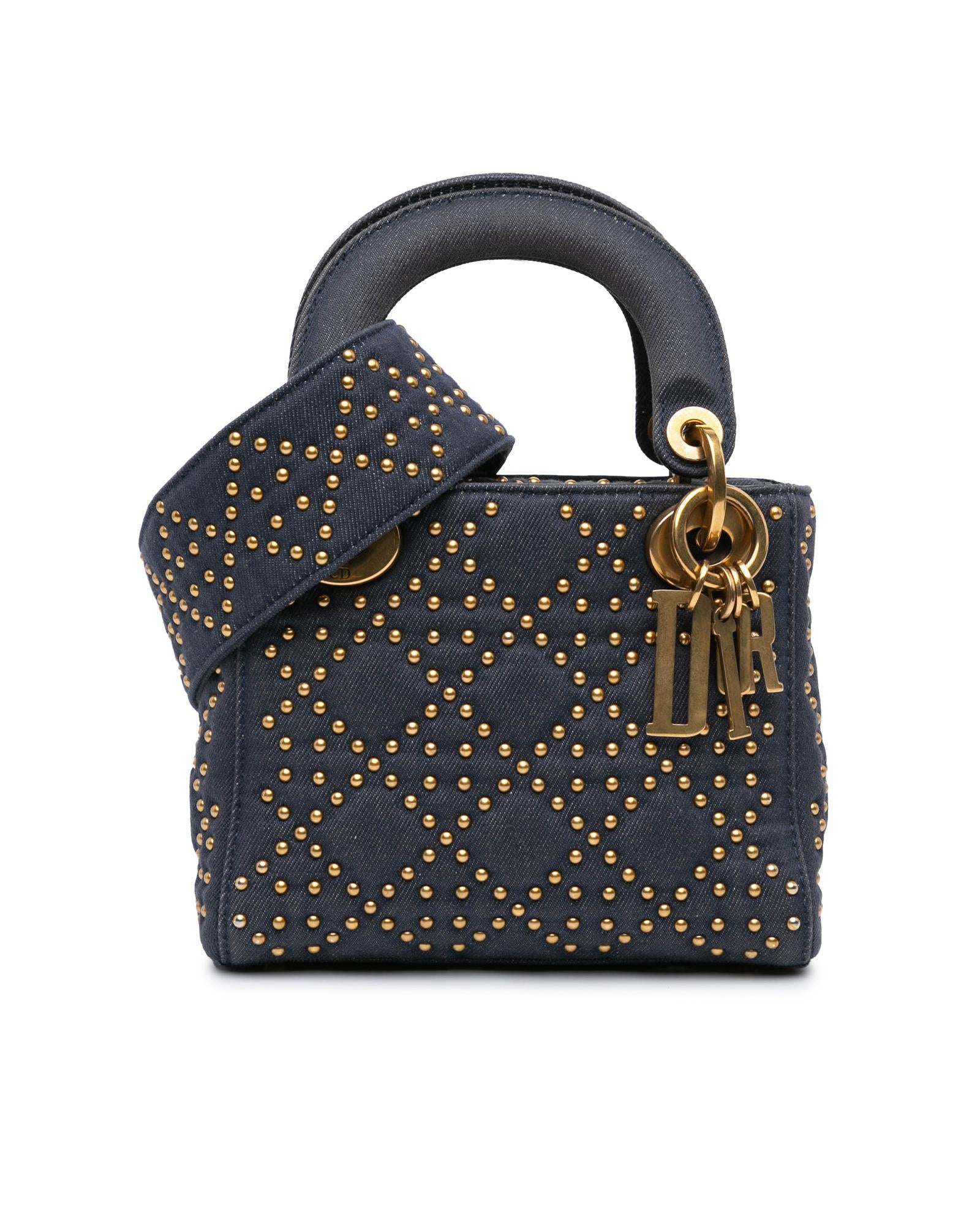 This Lady Dior satchel features a studded denim body flat handles a detachable flat strap a top fold-in flap closure and an interior zip pocket.Brand: Dior Vintage