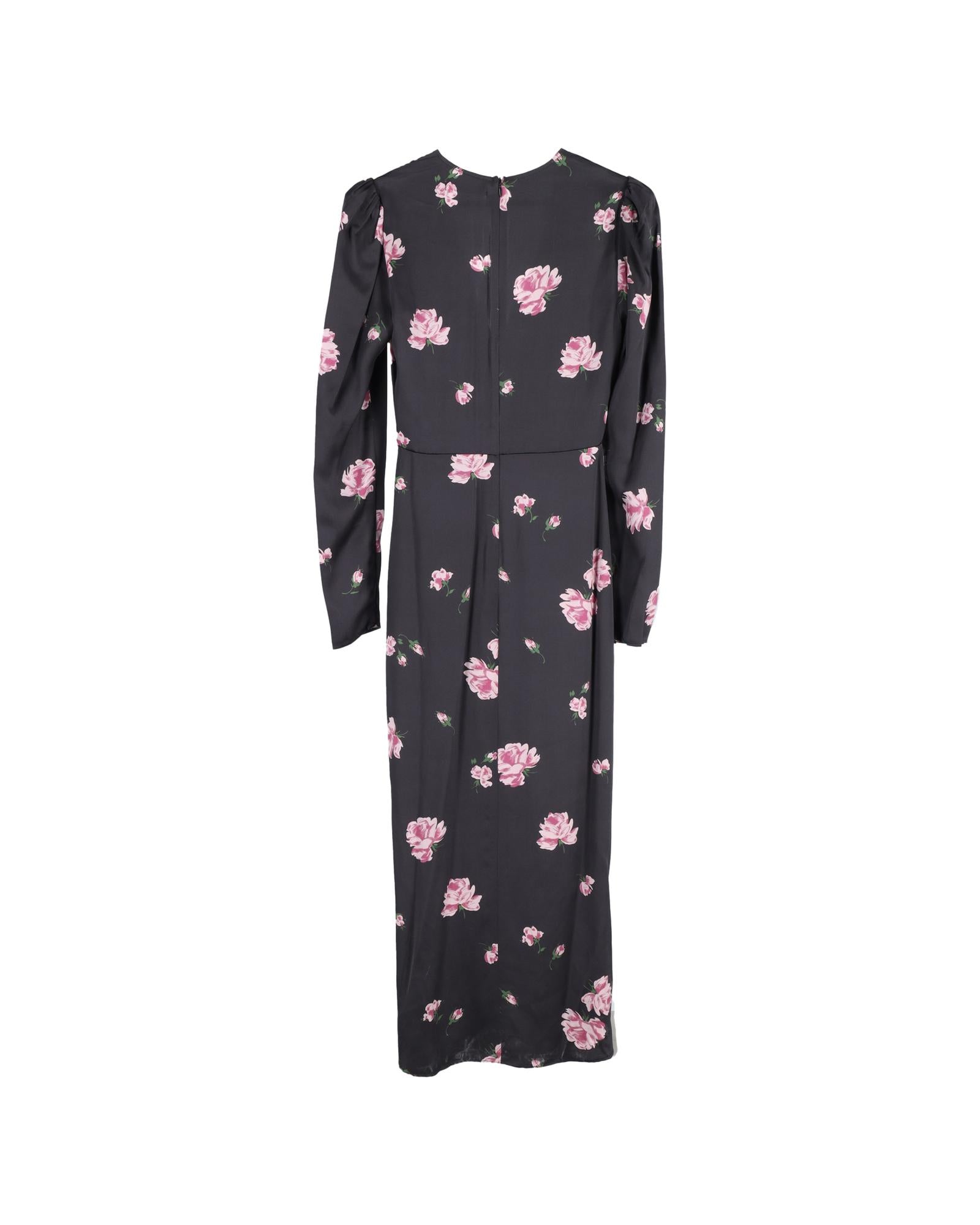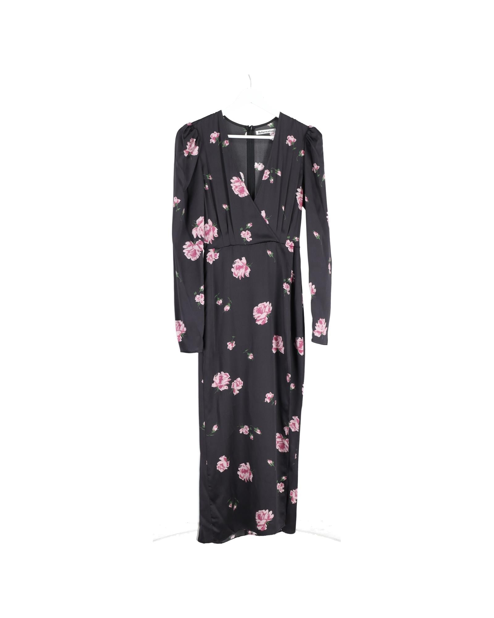 • Reformation Floral Print Long Sleeve Midi Dress in Black Silk