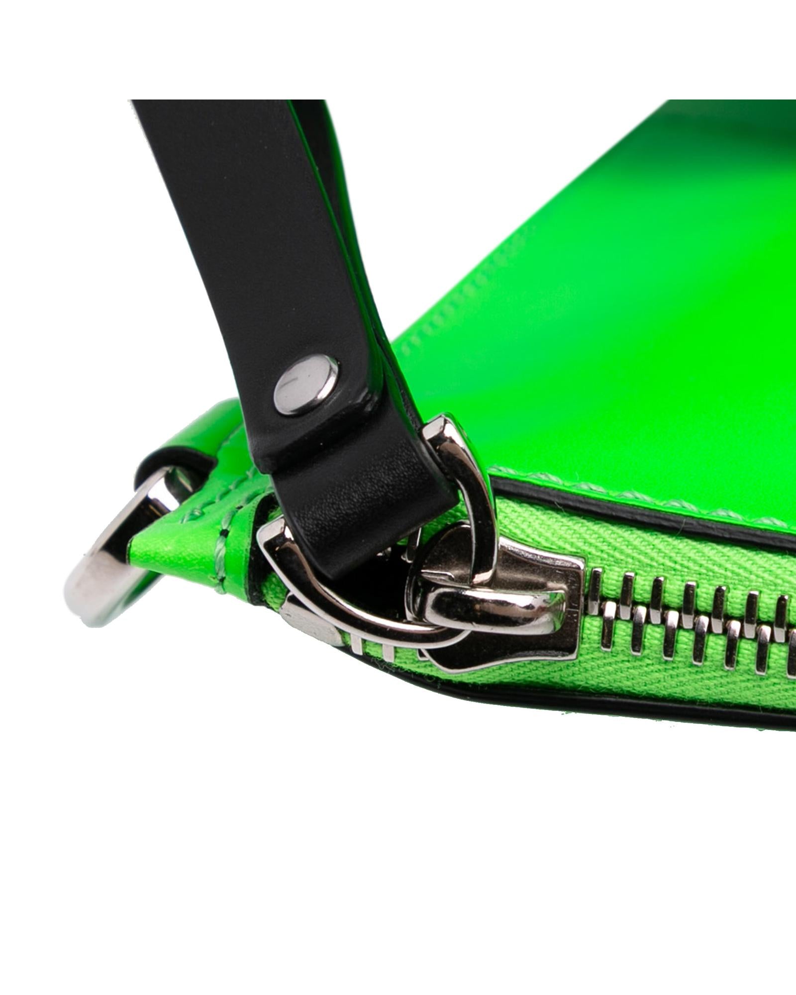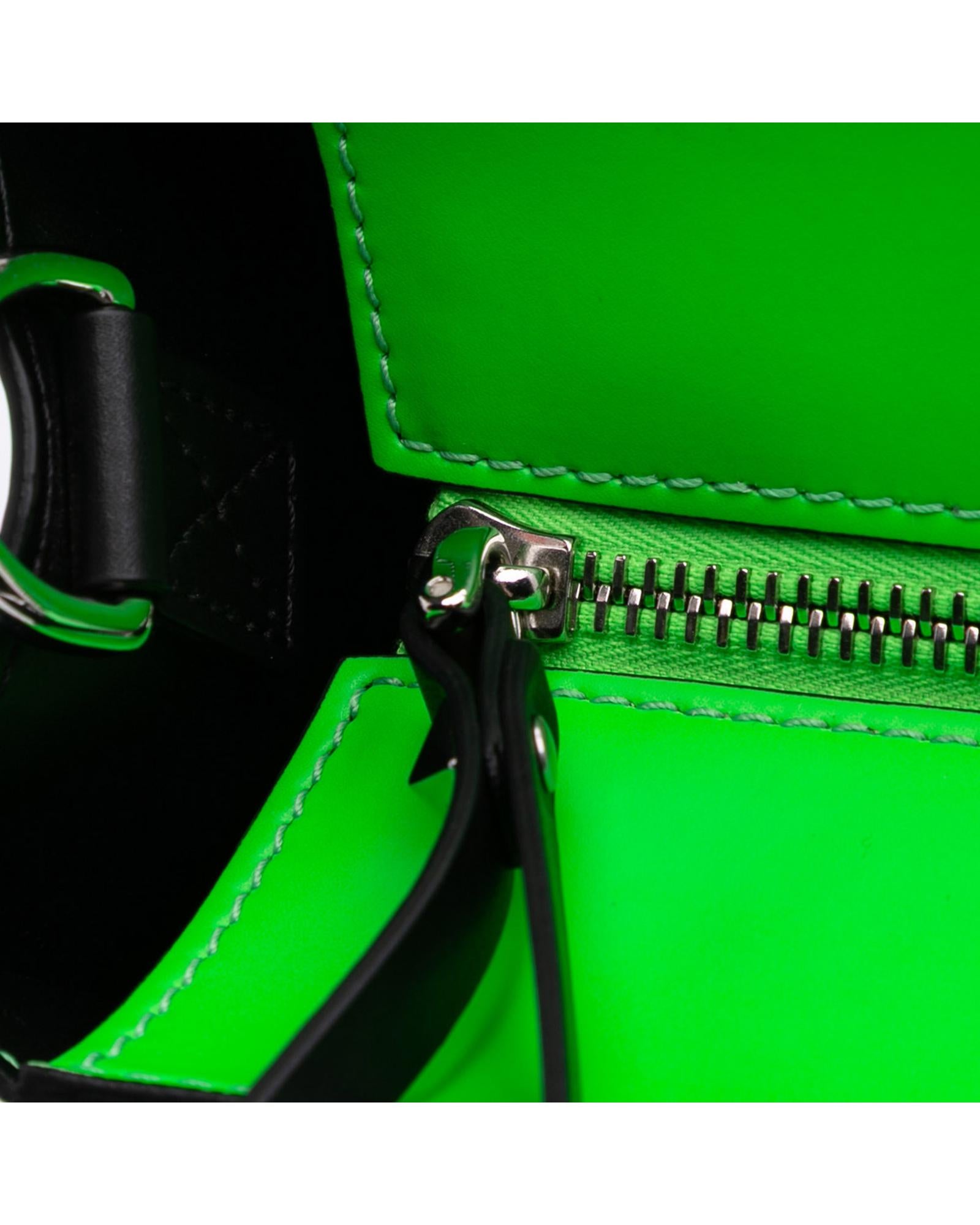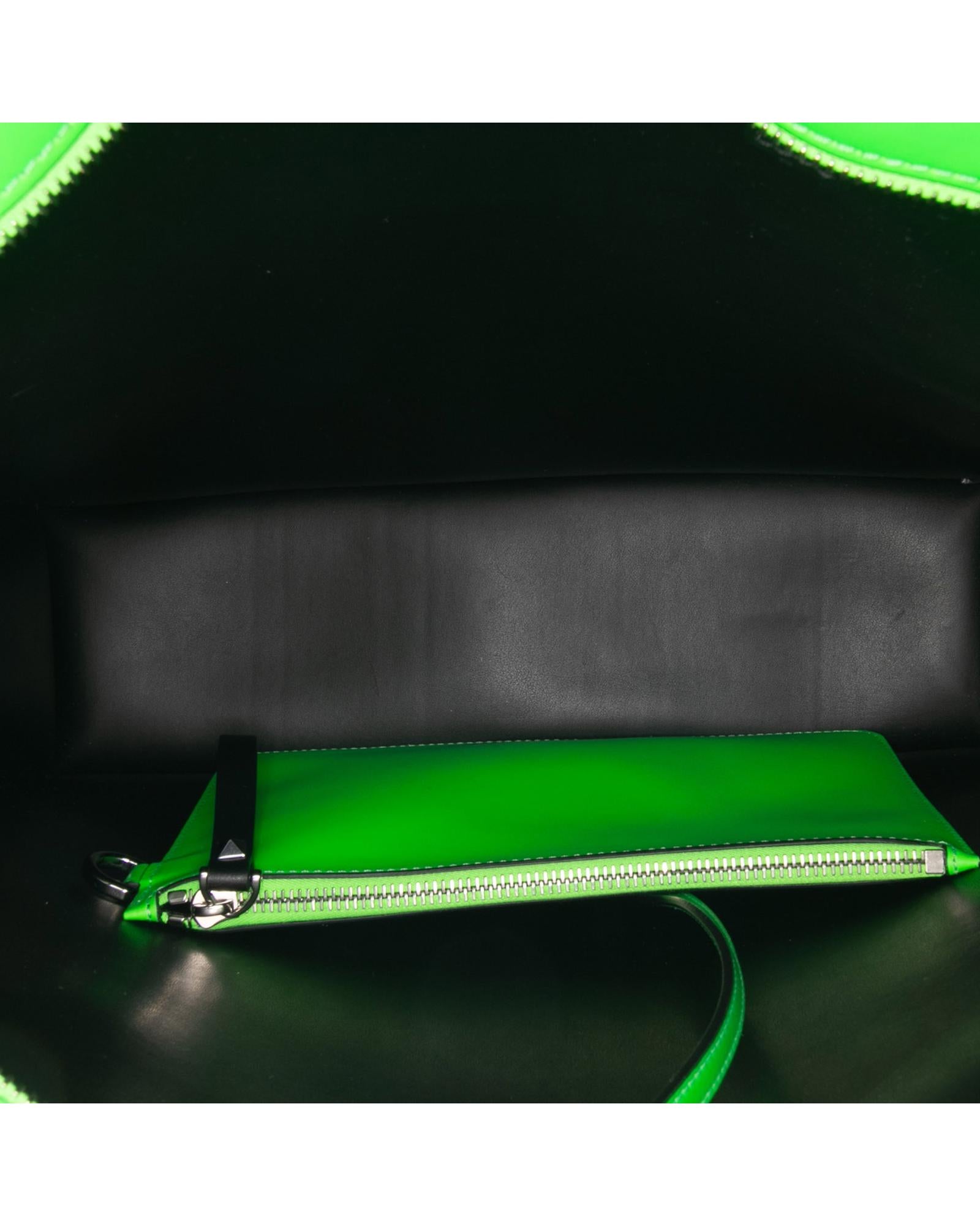 This satchel features a leather body flat handles an adjustable and detachable flat strap a top zip closure and a detachable zip pouch.