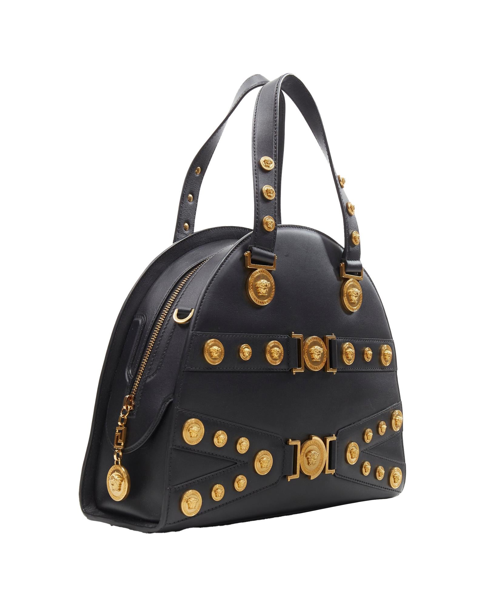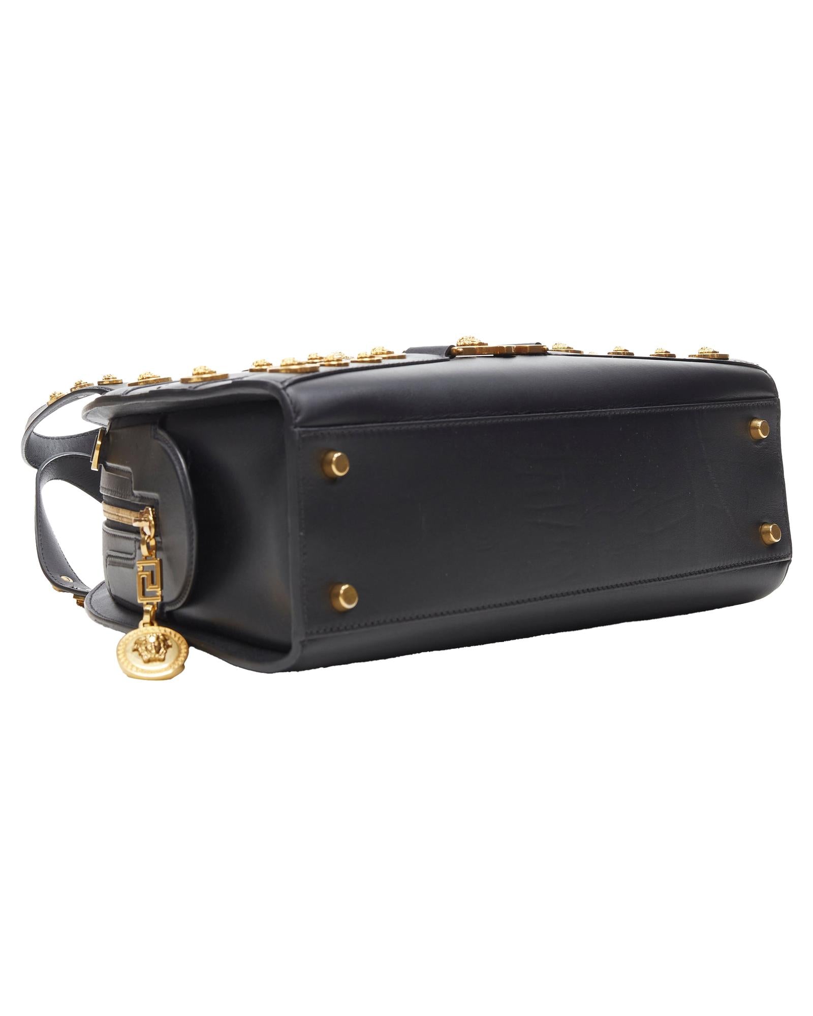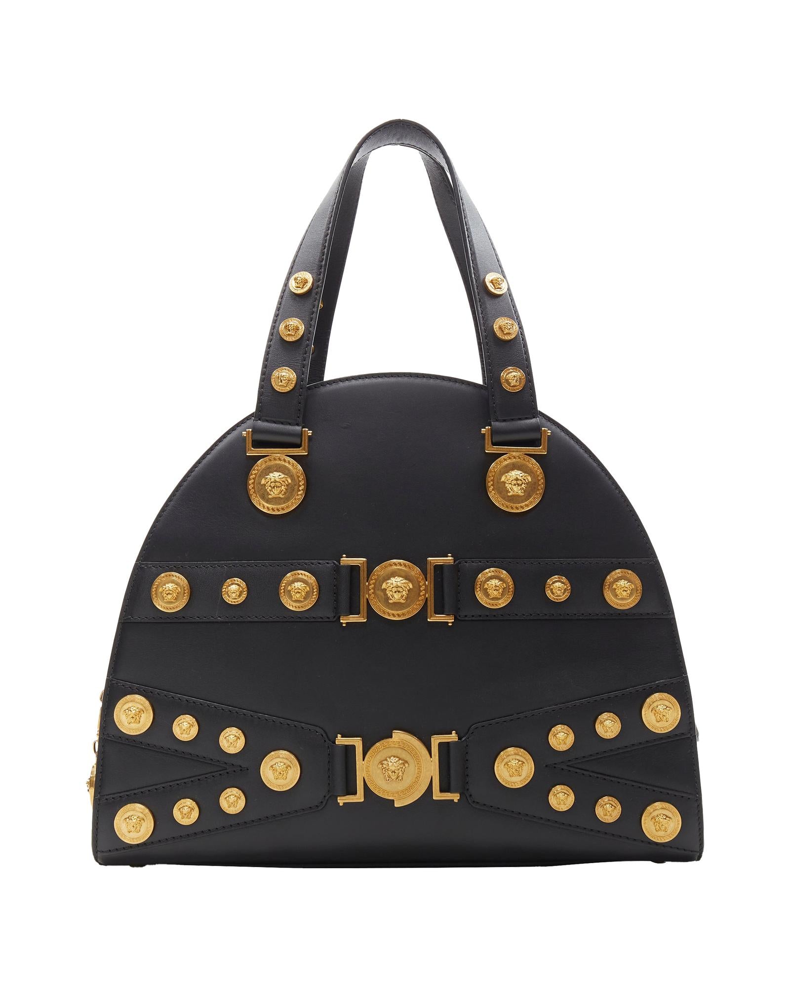 Structured Handbag with Medallion Embellishments and Top Handles
