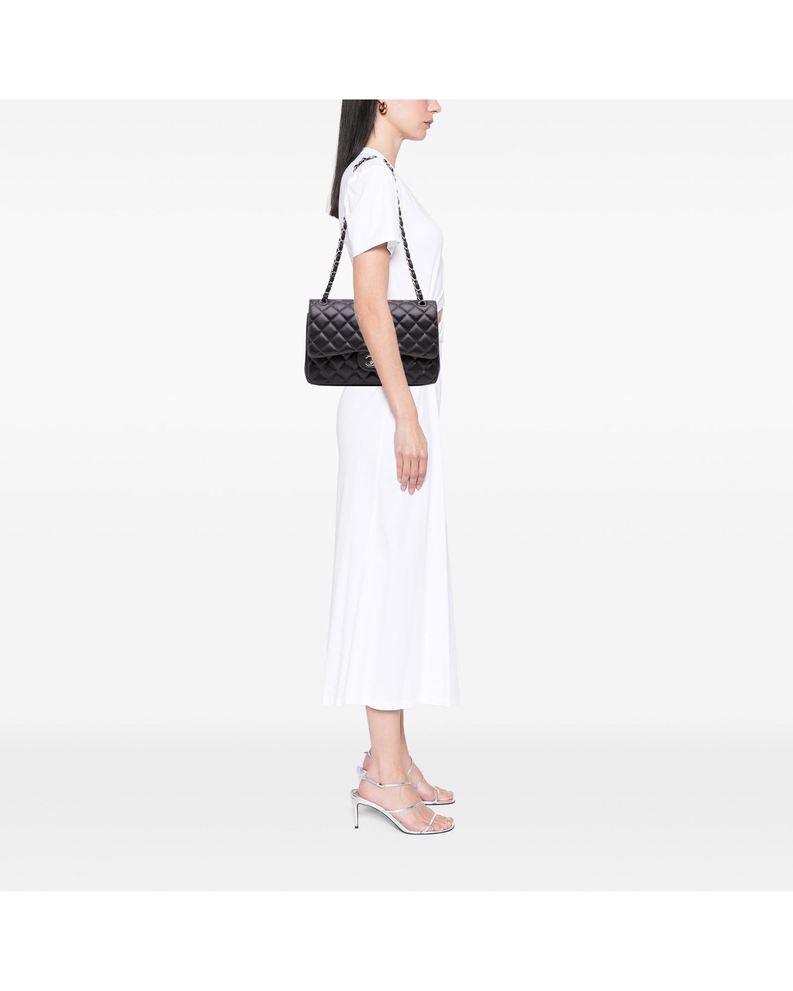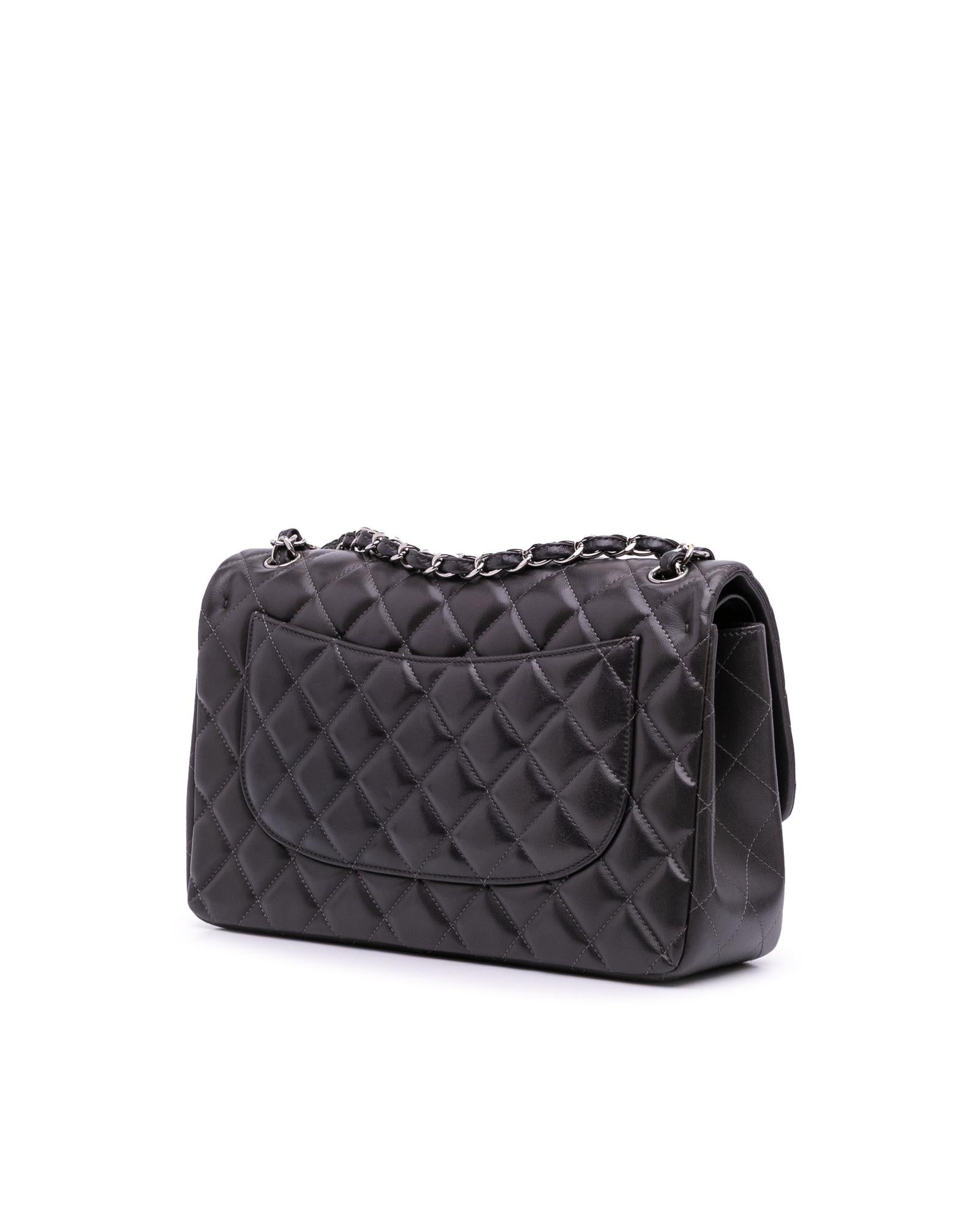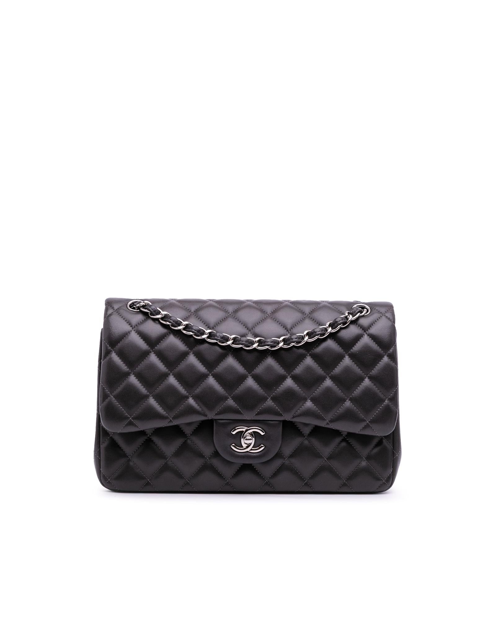 This shoulder bag features a quilted lambskin leather body leather-woven chain straps double front flaps with CC turn-lock closure an exterior back slip pocket and interior zip and slip pockets.Brand: Chanel Vintage