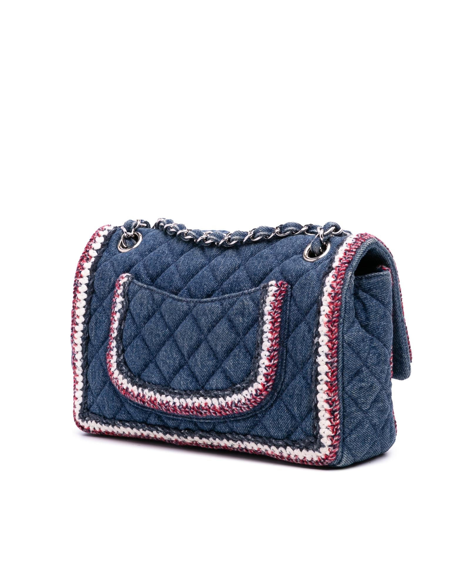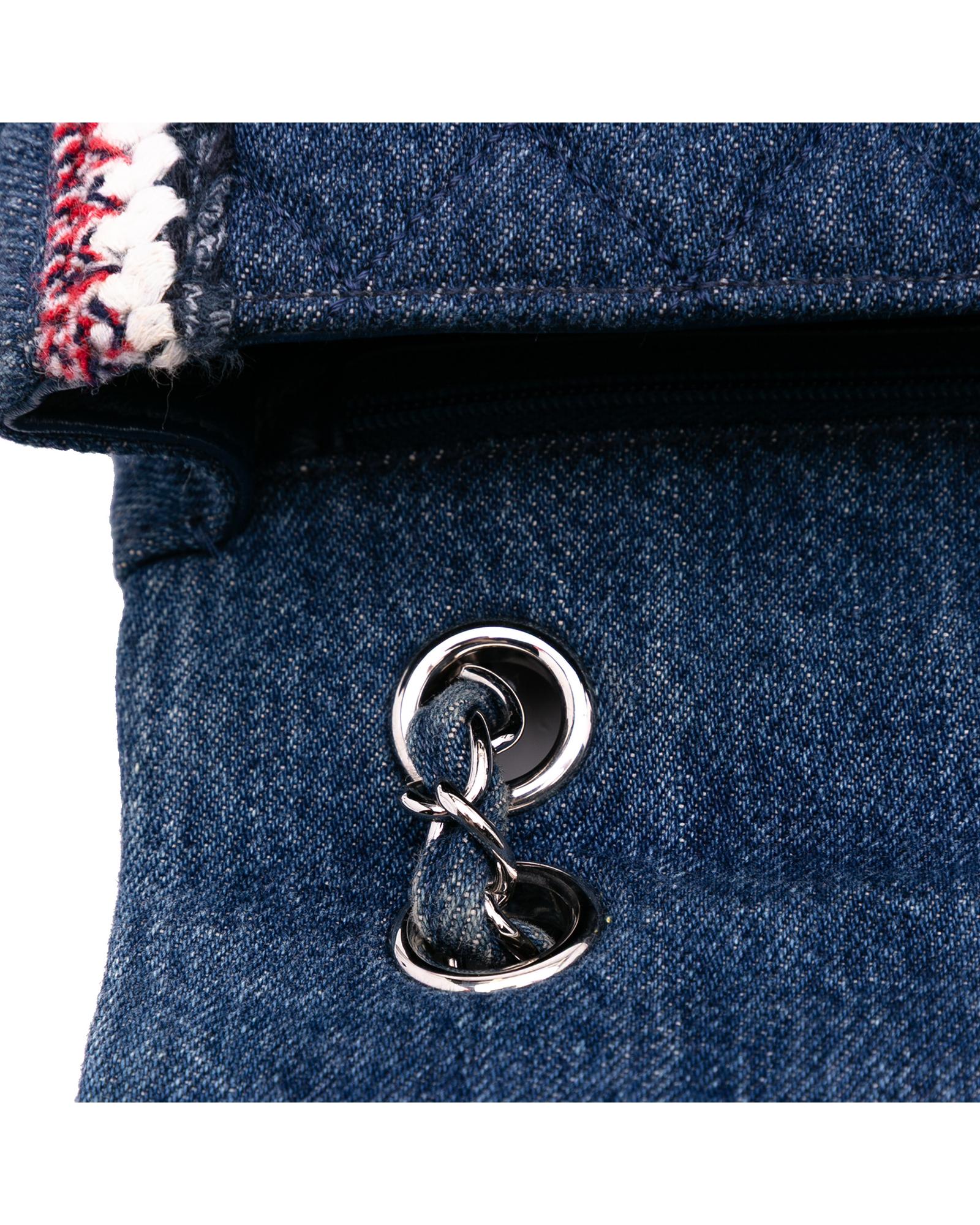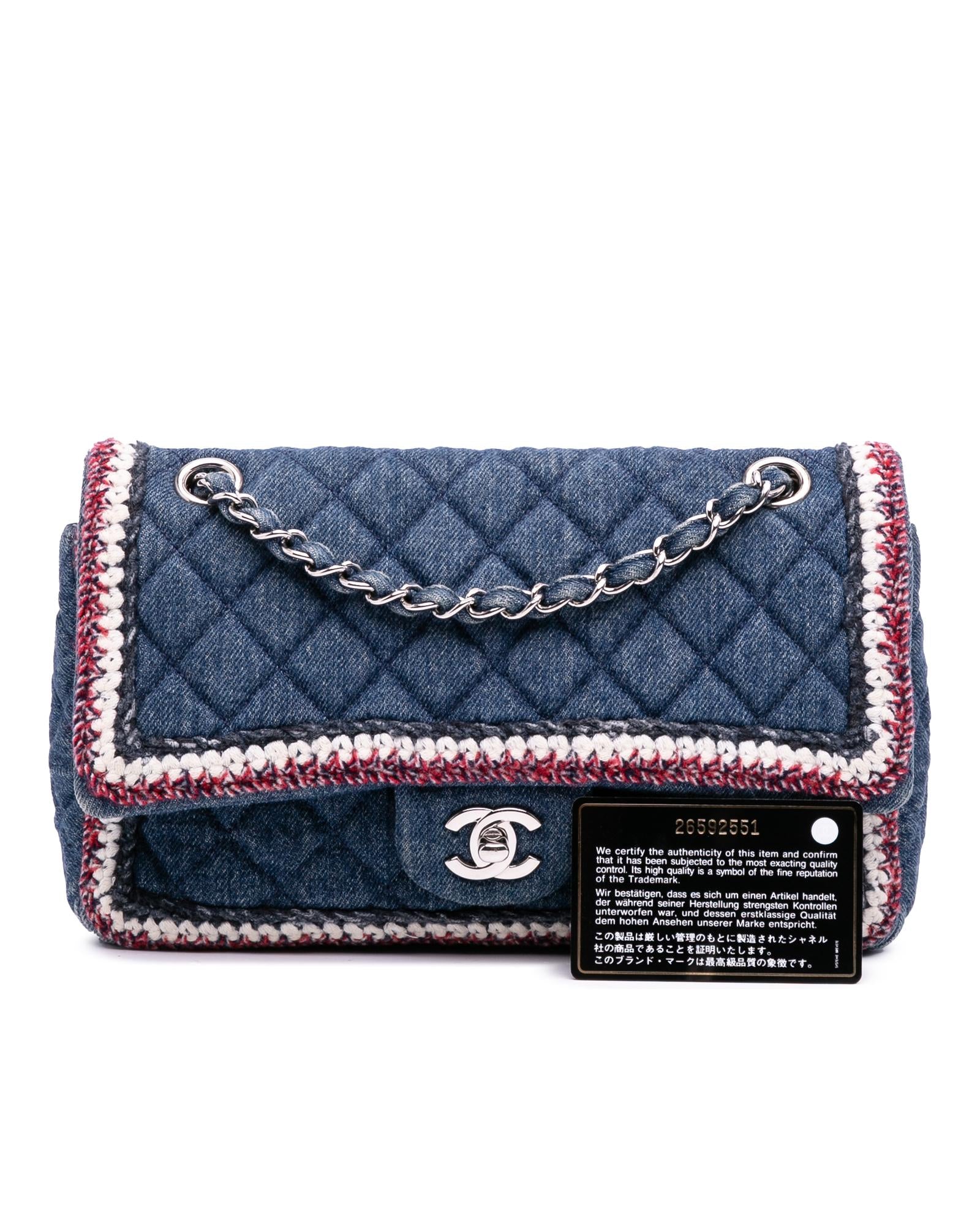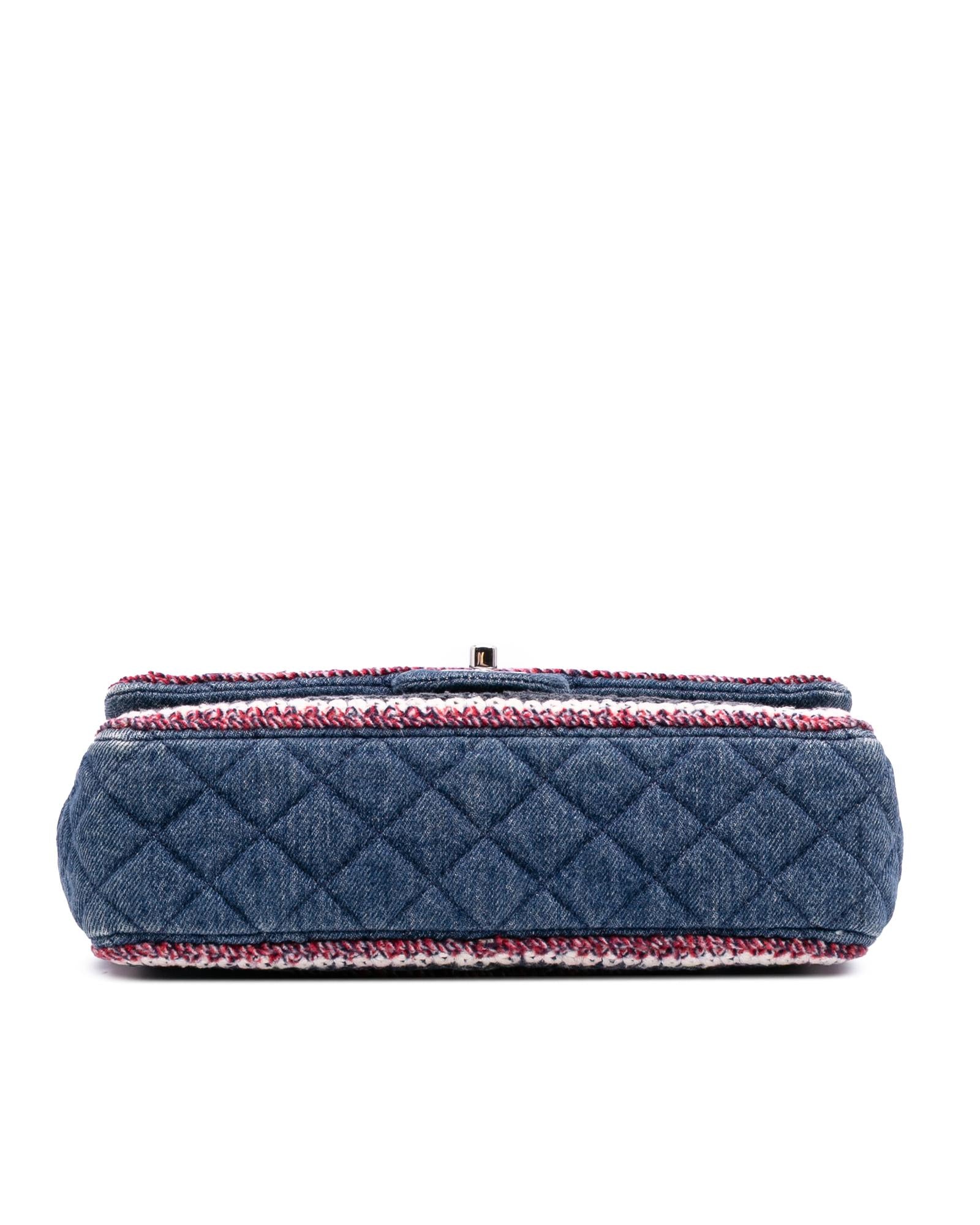 This shoulder bag features a quilted denim body with tweed trim a denim woven chain strap a front flap with turn lock closure and interior zip and slip pockets.Brand: Chanel Vintage