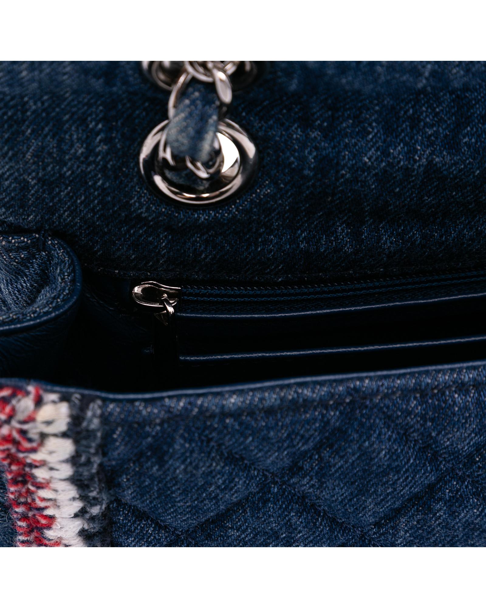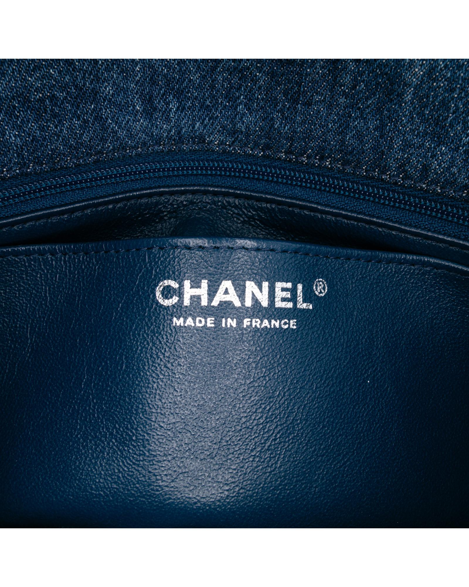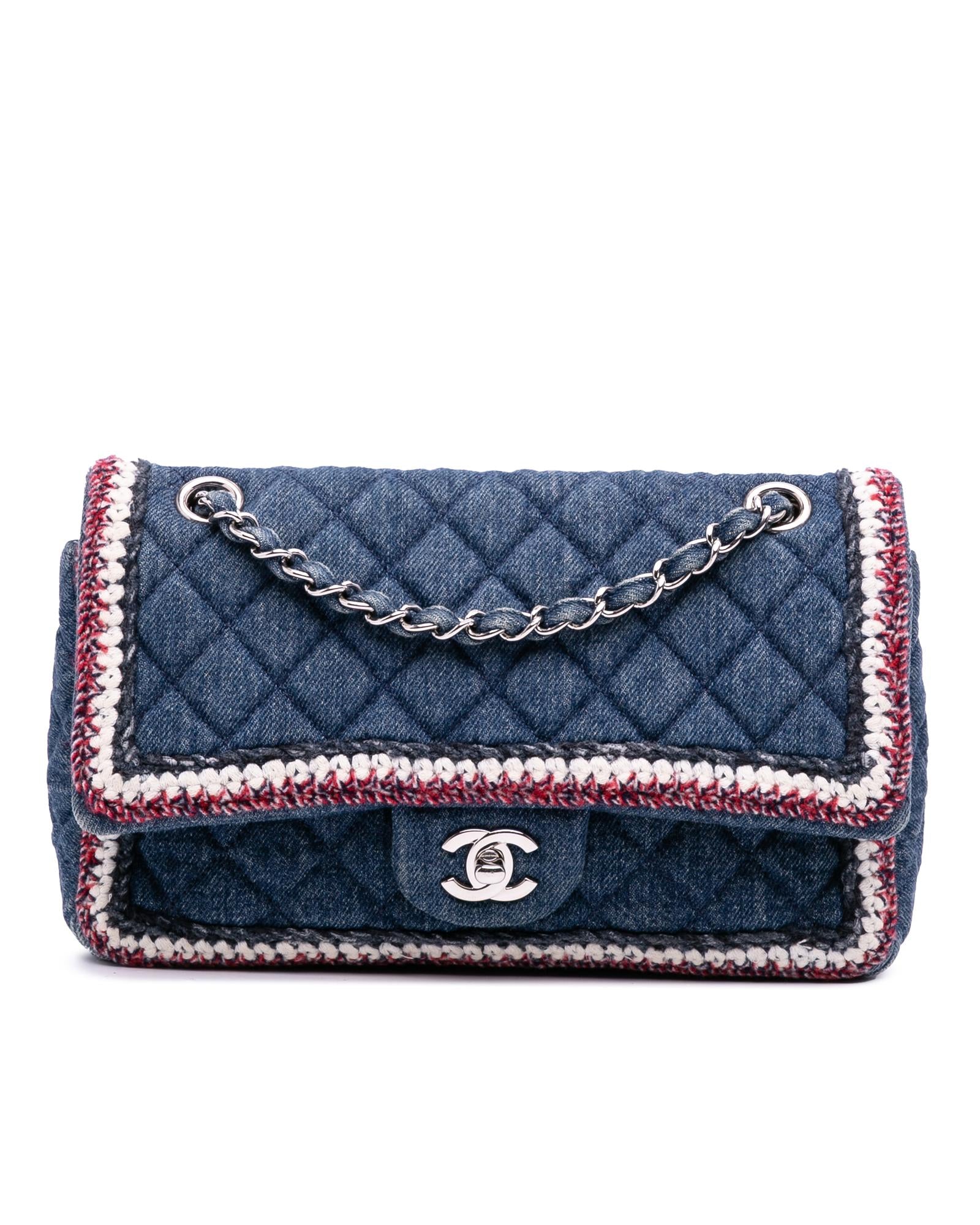 This shoulder bag features a quilted denim body with tweed trim a denim woven chain strap a front flap with turn lock closure and interior zip and slip pockets.Brand: Chanel Vintage
