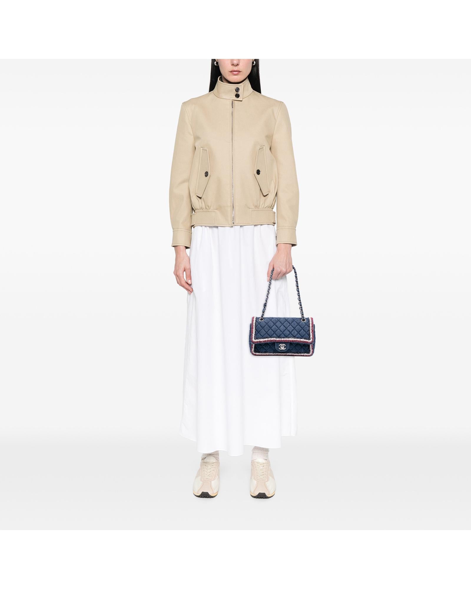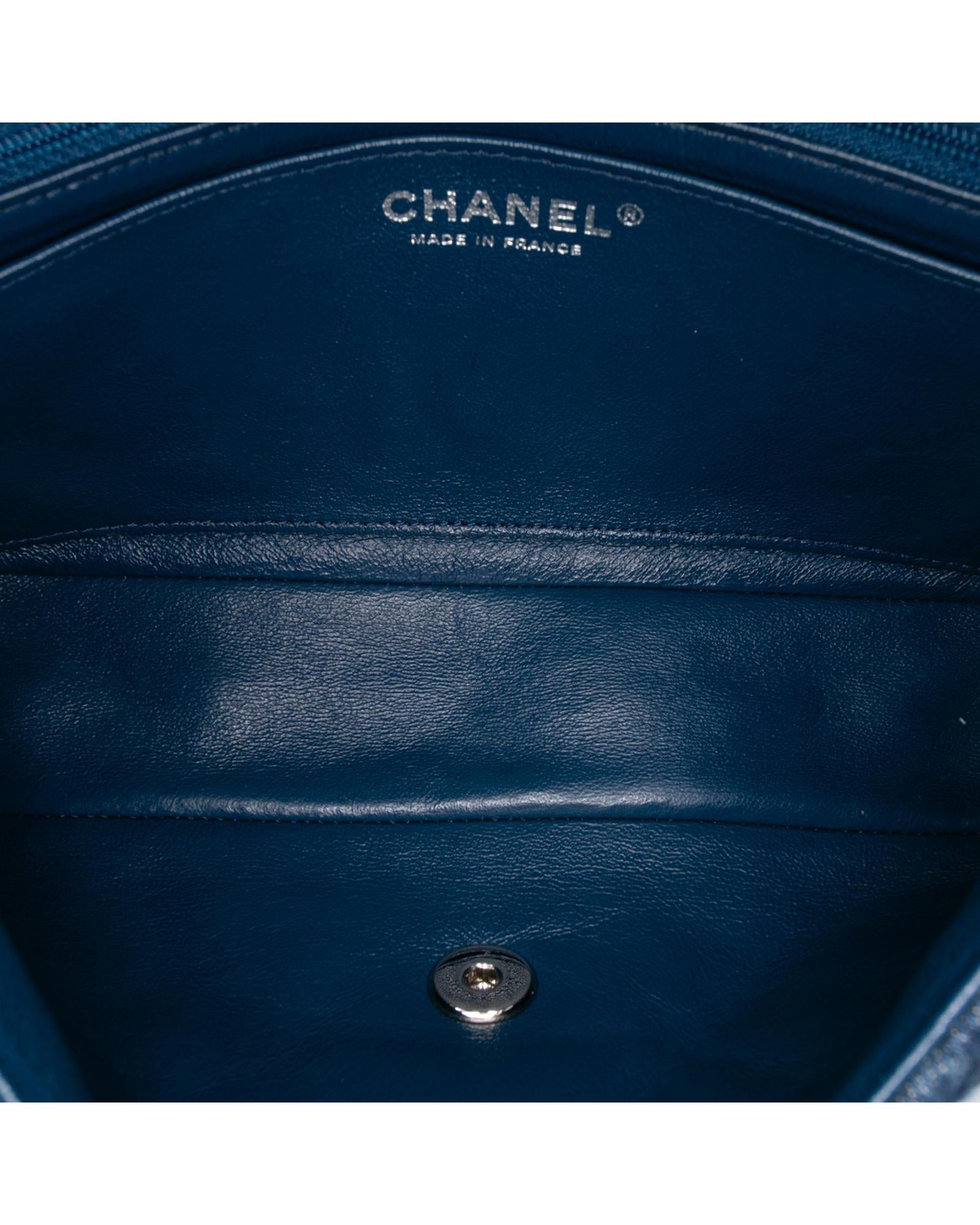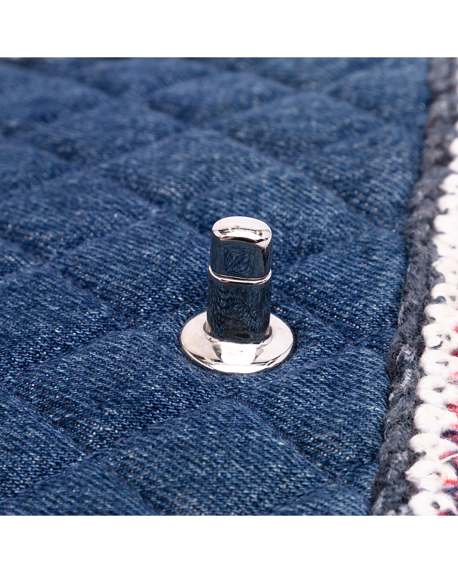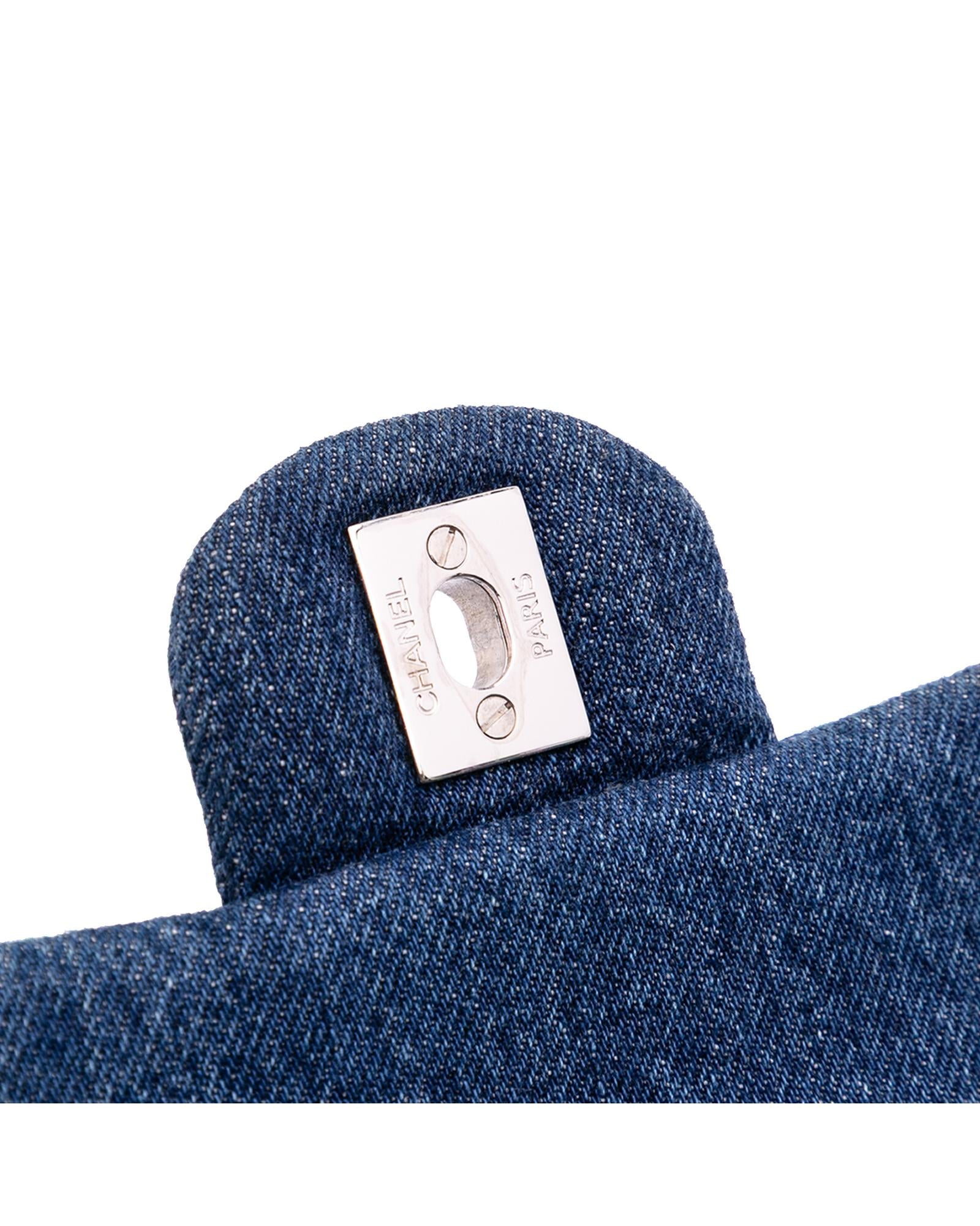 This shoulder bag features a quilted denim body with tweed trim a denim woven chain strap a front flap with turn lock closure and interior zip and slip pockets.Brand: Chanel Vintage