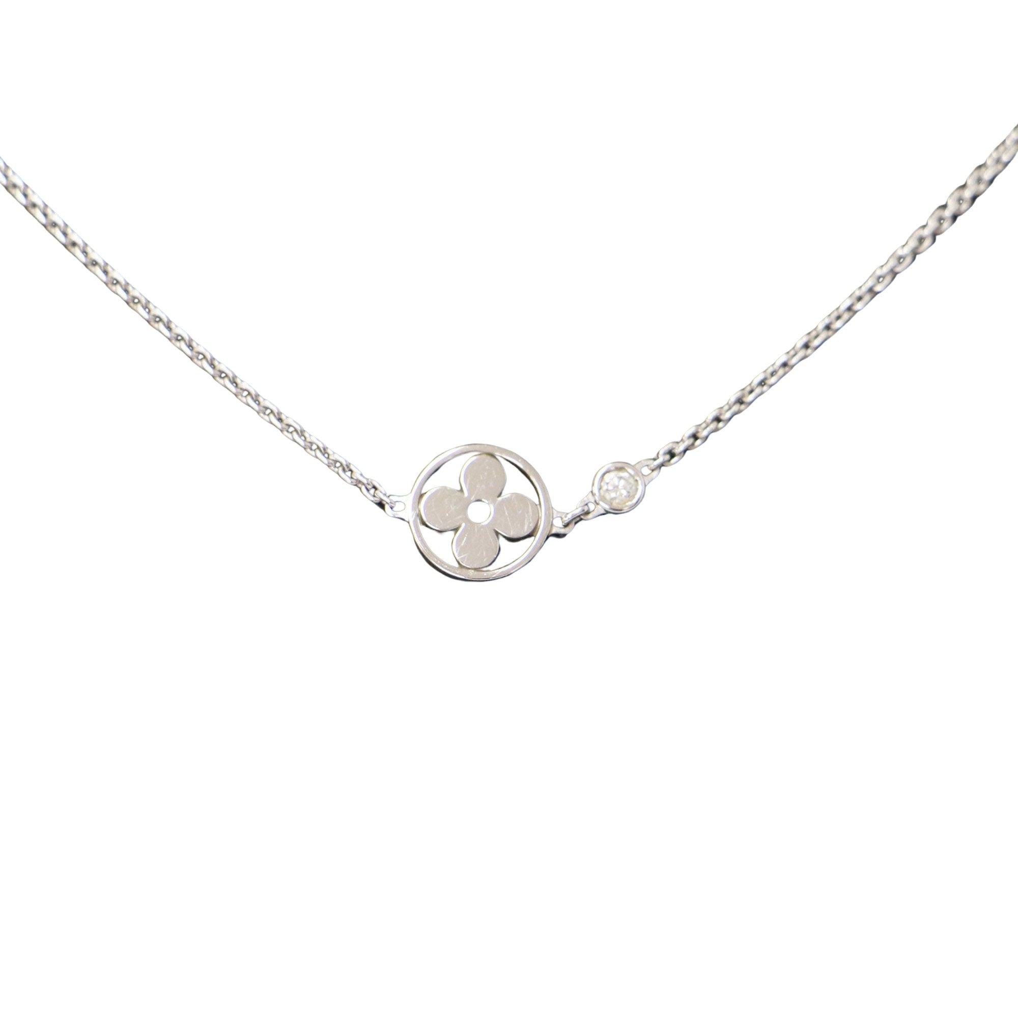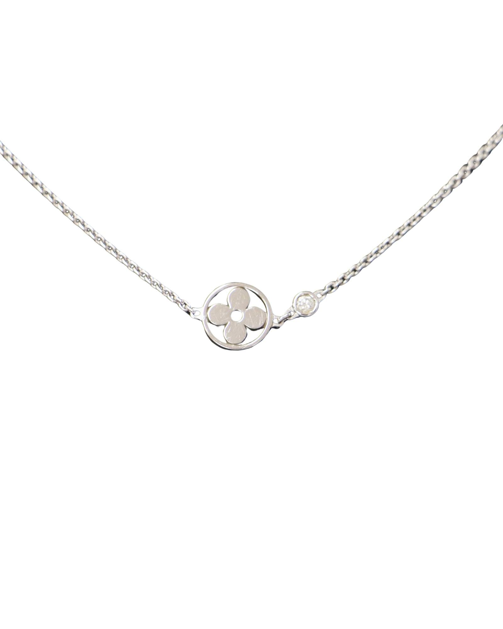 Introducing the Louis Vuitton Blossom Women's Necklace an exquisite piece that epitomizes luxury and sophistication. Crafted from shimmering 18K white gold this necklace radiates elegance and glamour making it the perfect accessory for any occasion. Adorned with sparkling diamonds it adds a touch of brilliance to your ensemble elevating your style to new heights.