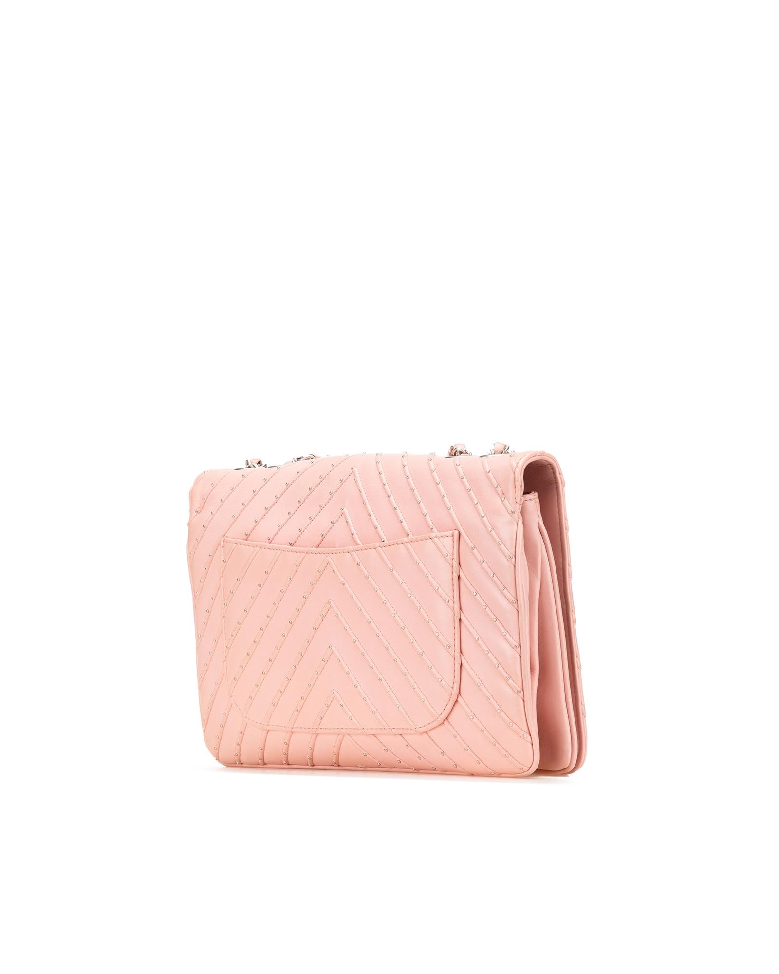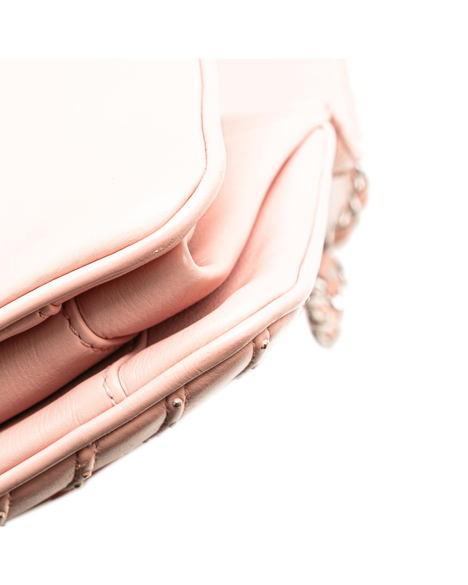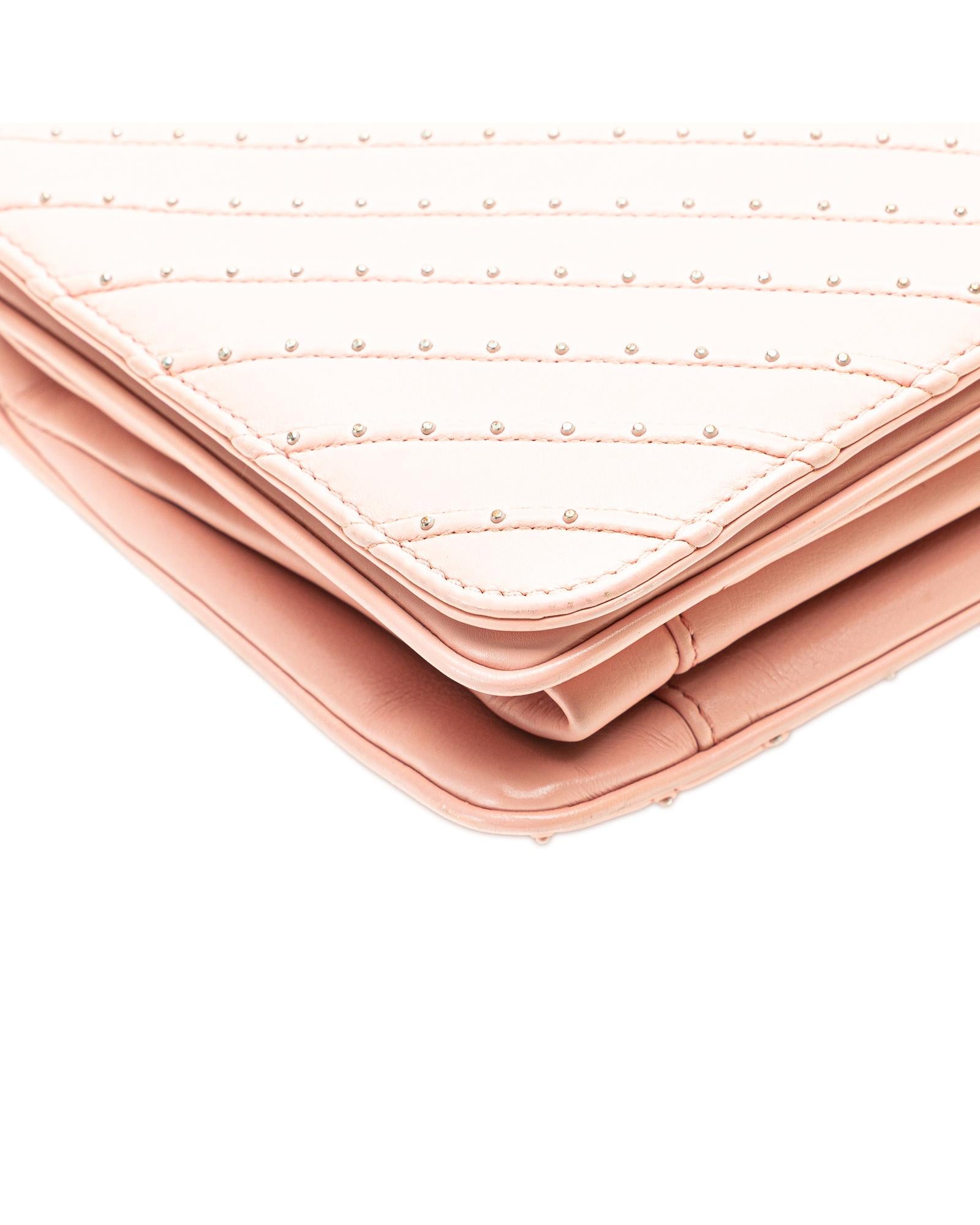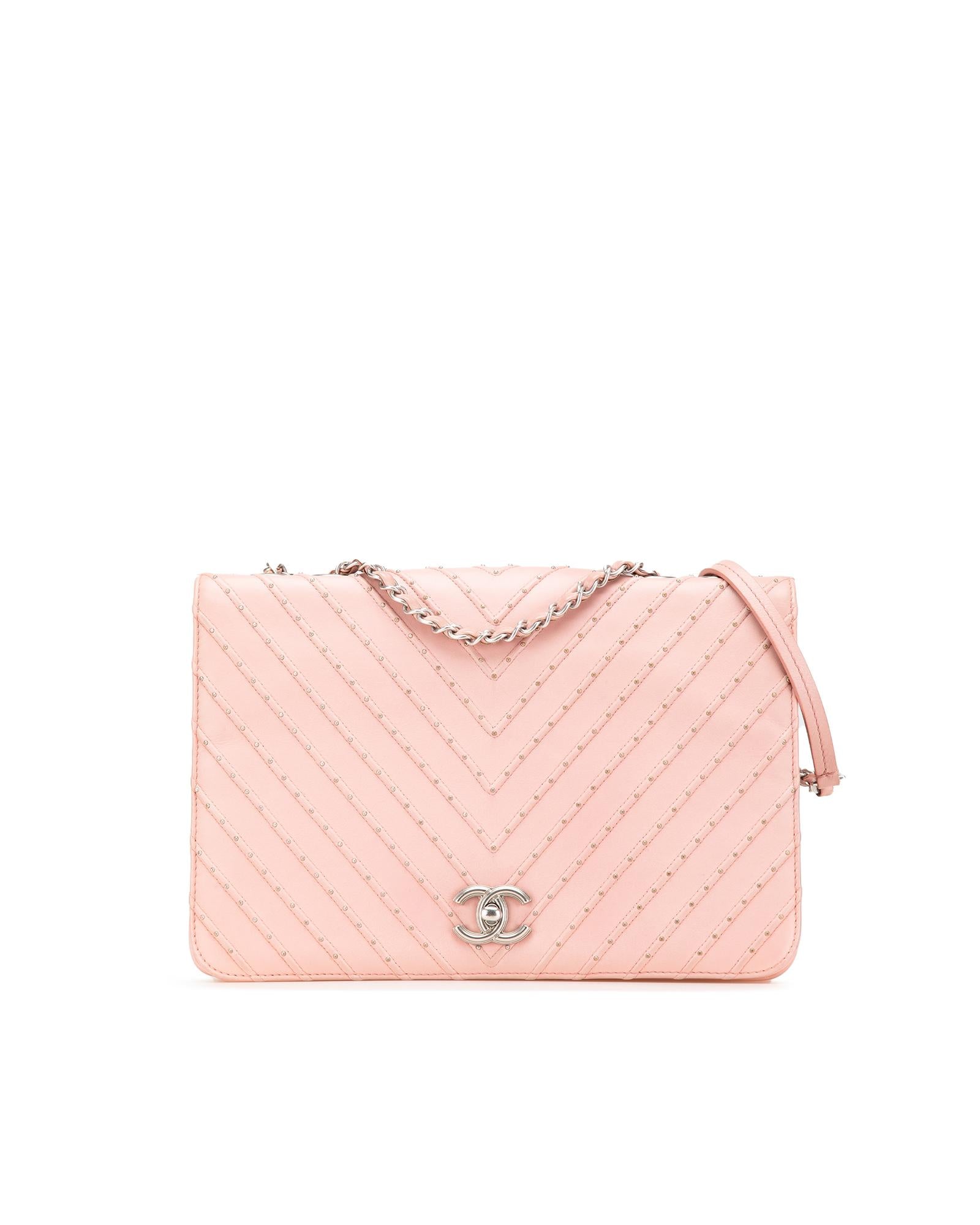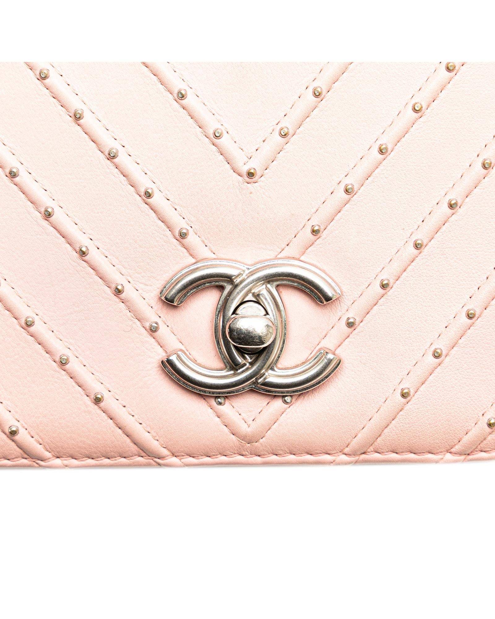 This flap bag features a studded leather body a leather-woven chain strap with leather guard a front flap with CC turn lock closure an exterior back slip pocket and an interior zip pocket.Brand: Chanel