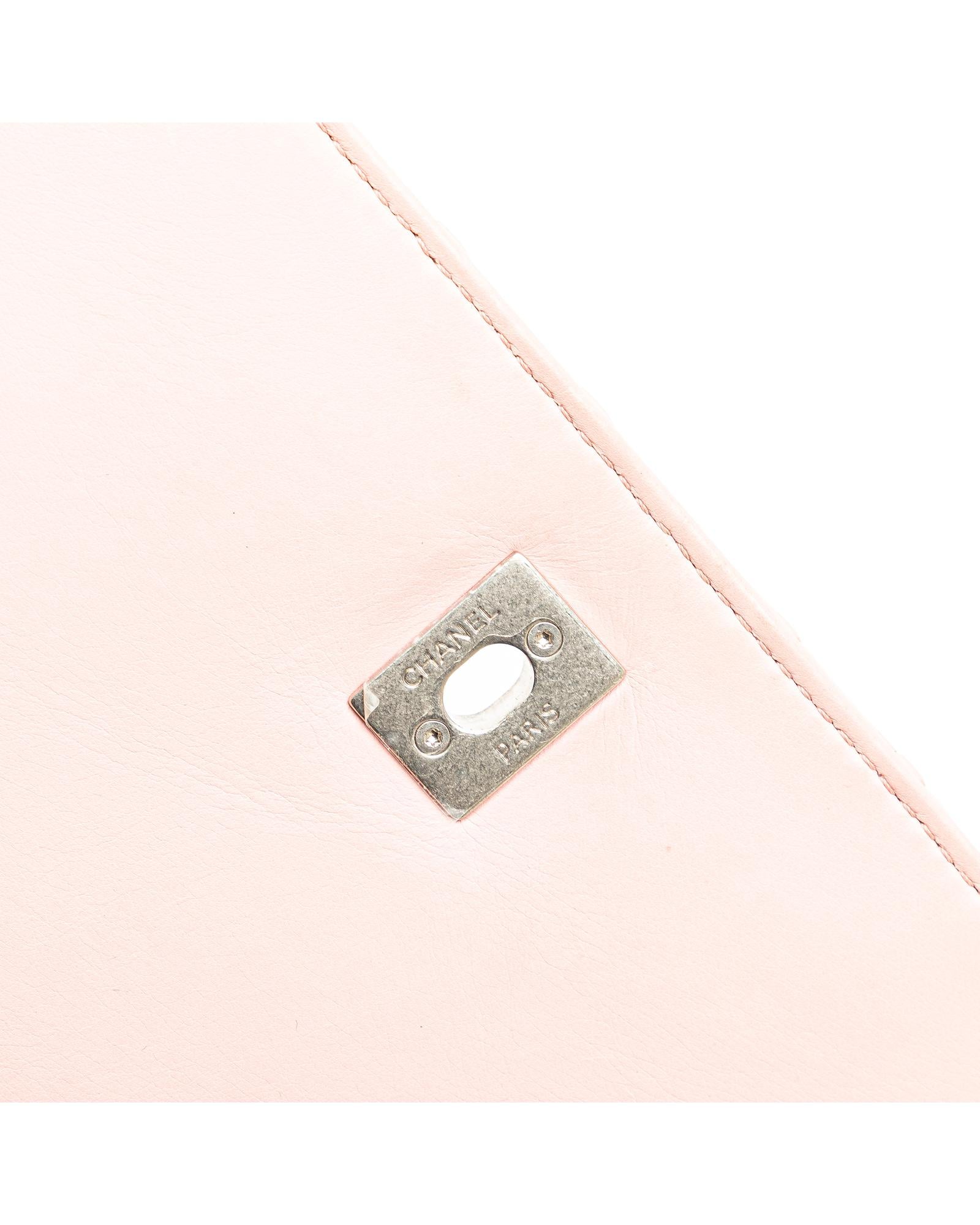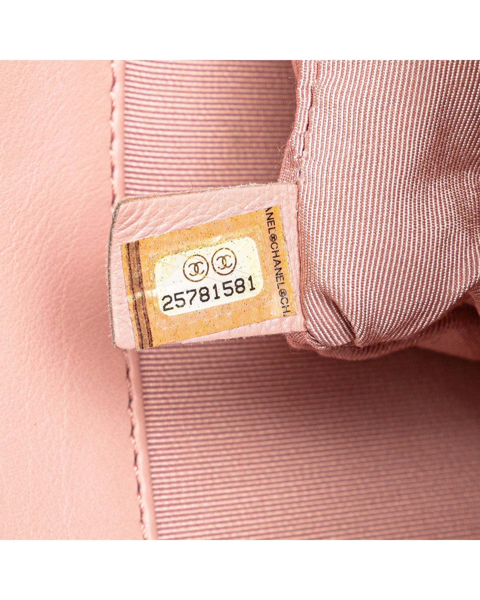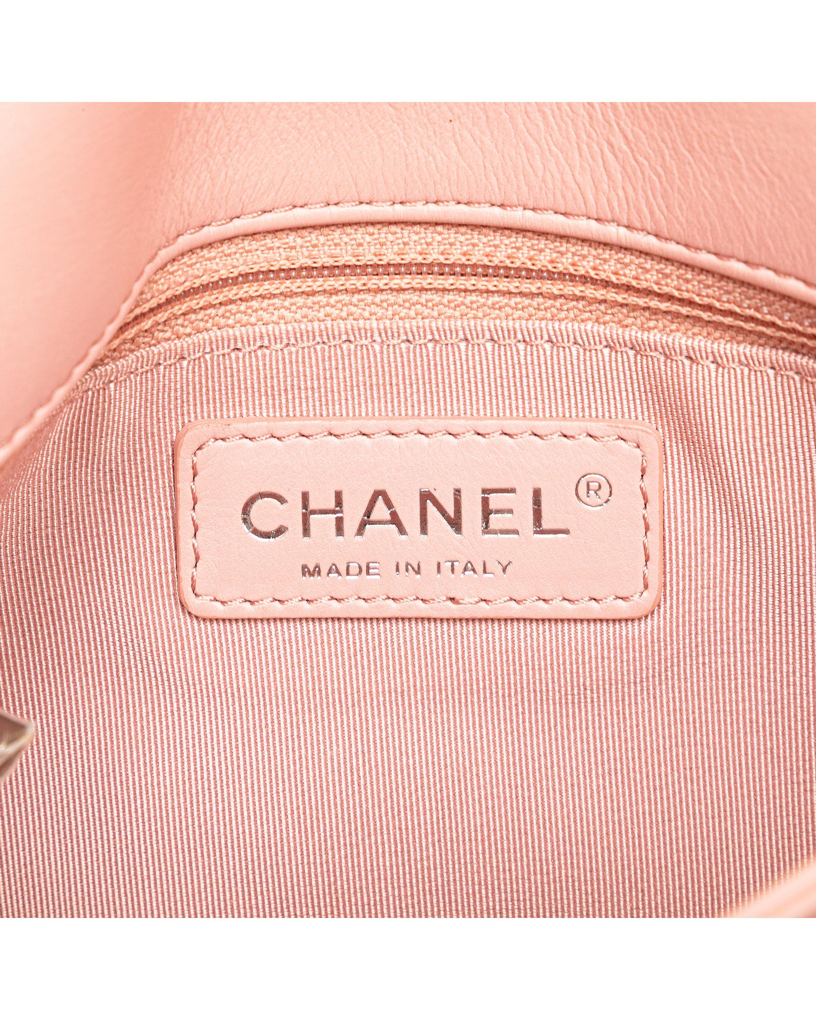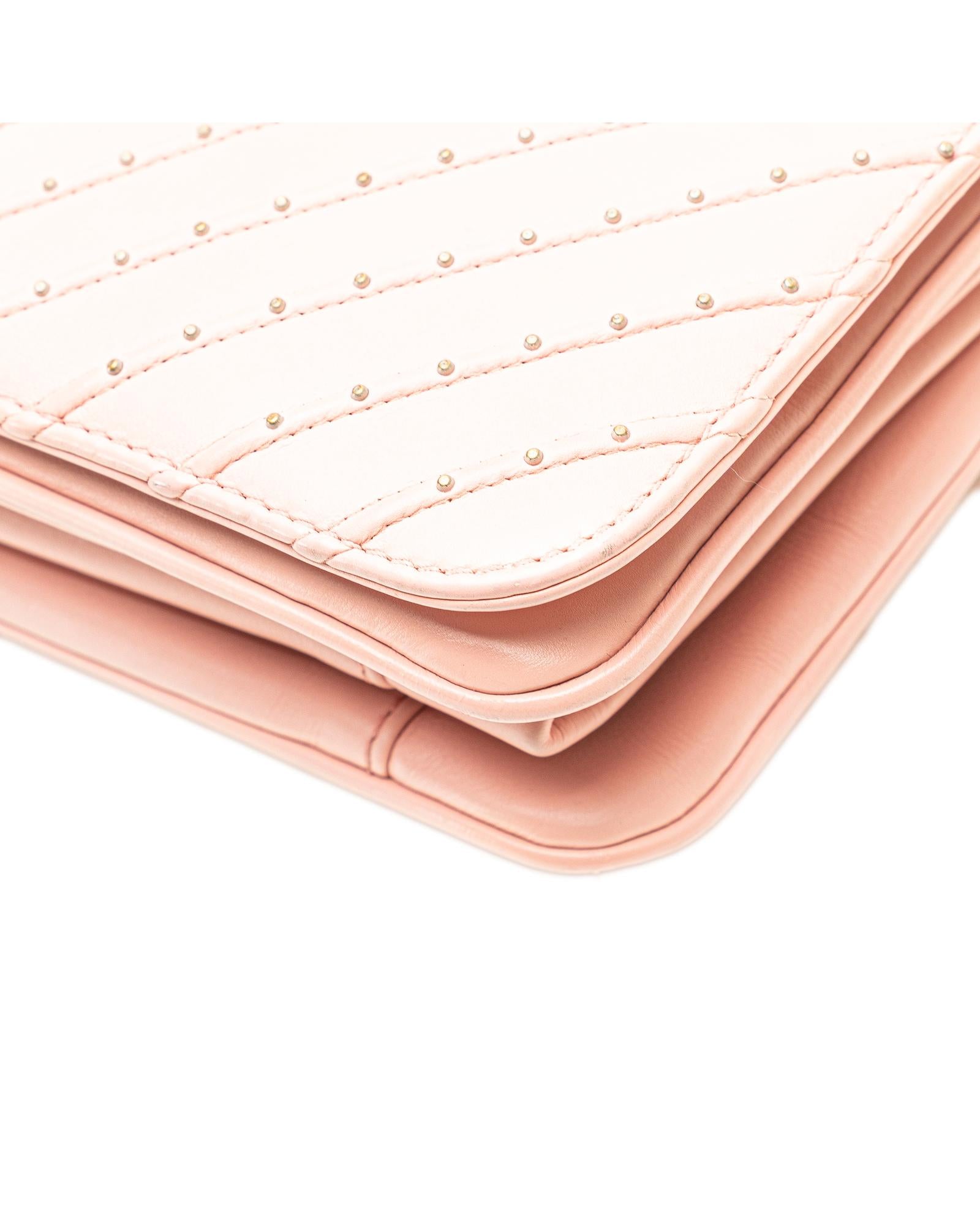 This flap bag features a studded leather body a leather-woven chain strap with leather guard a front flap with CC turn lock closure an exterior back slip pocket and an interior zip pocket.Brand: Chanel