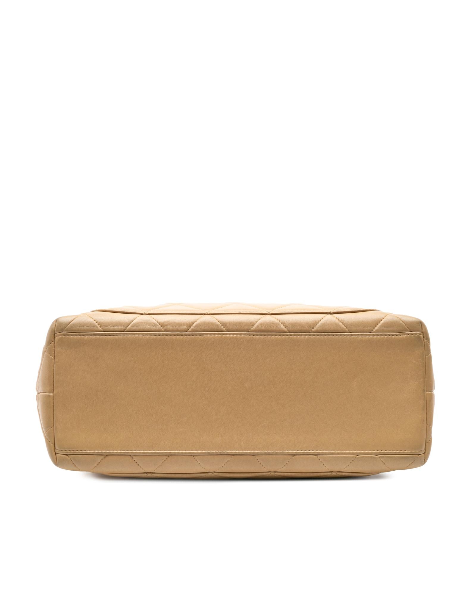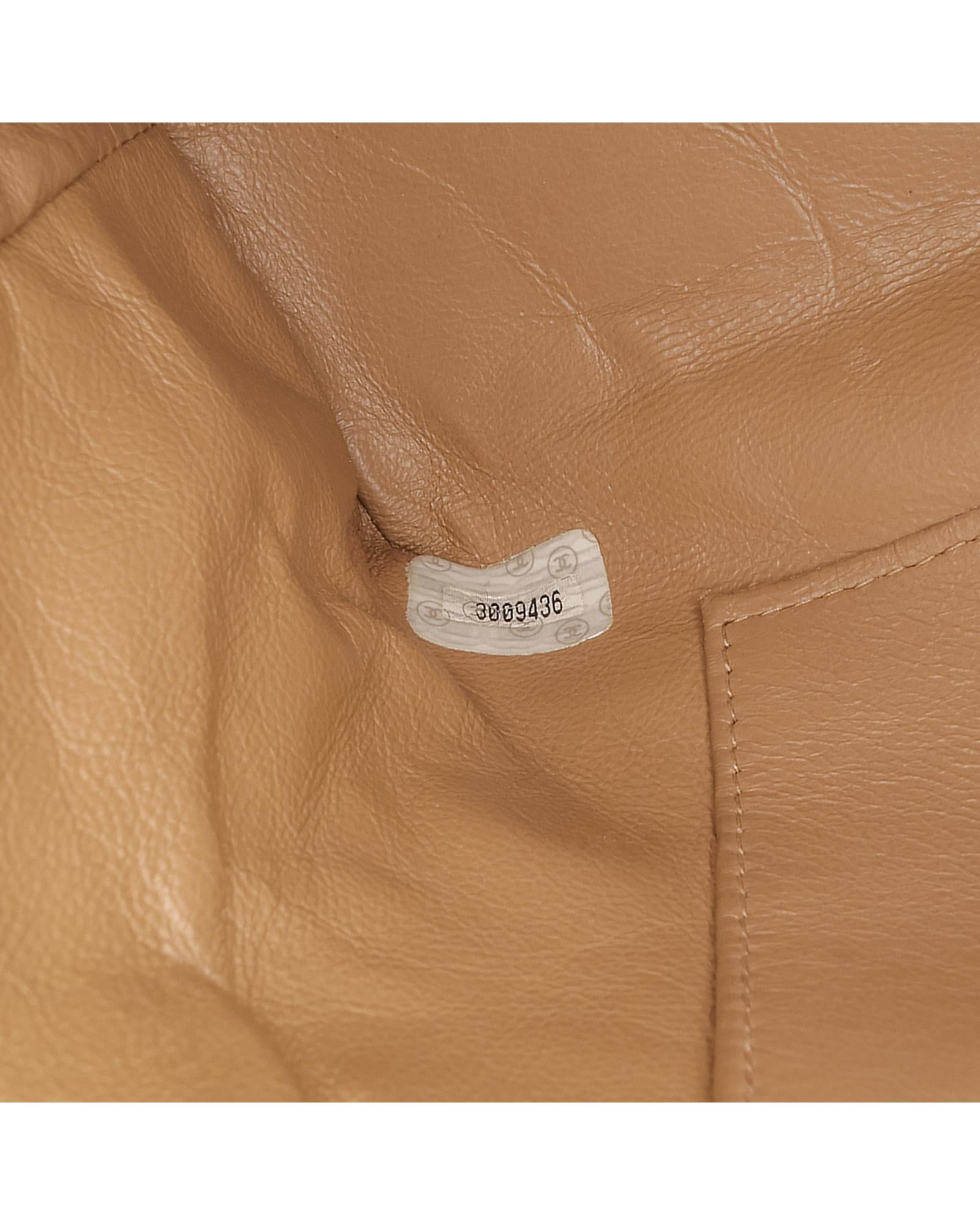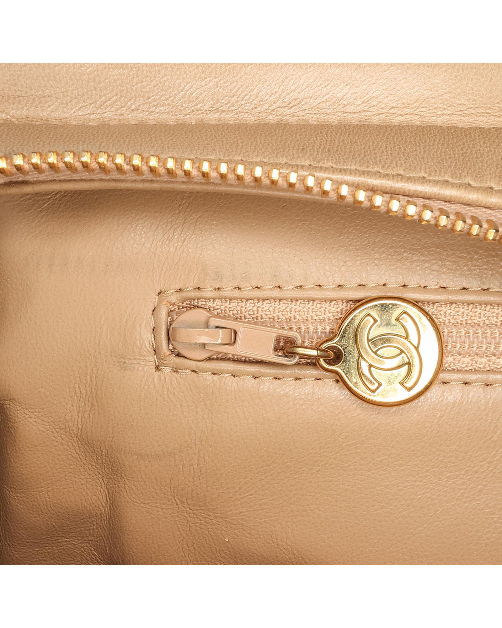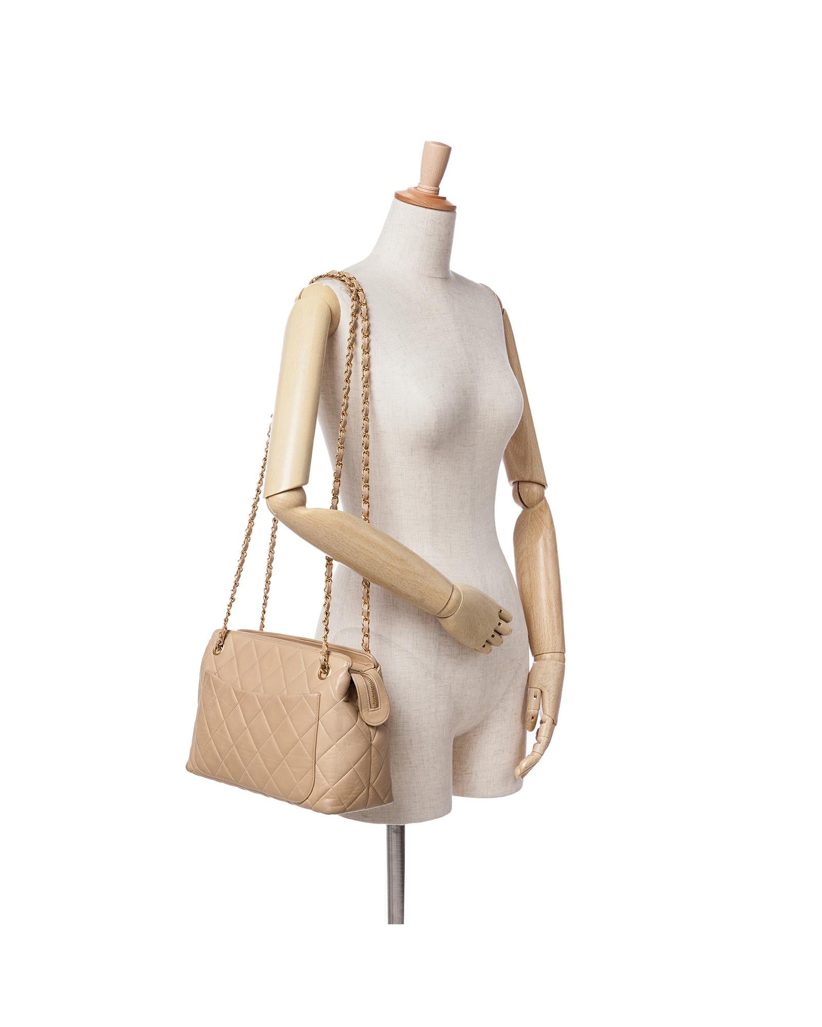This crossbody bag features a quilted lambskin body leather-woven chain straps a top zip closure exterior slip pockets and interior zip and slip pockets.