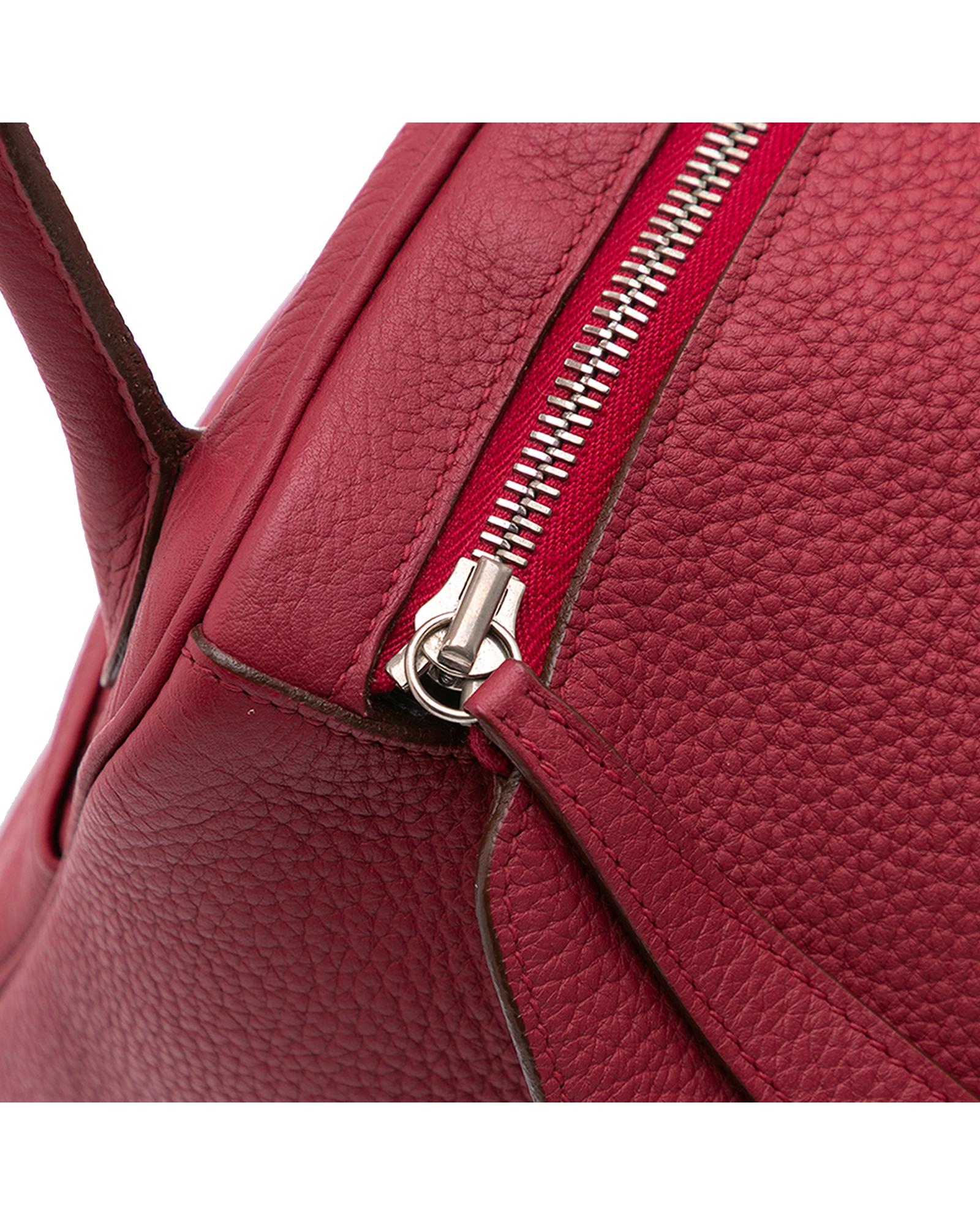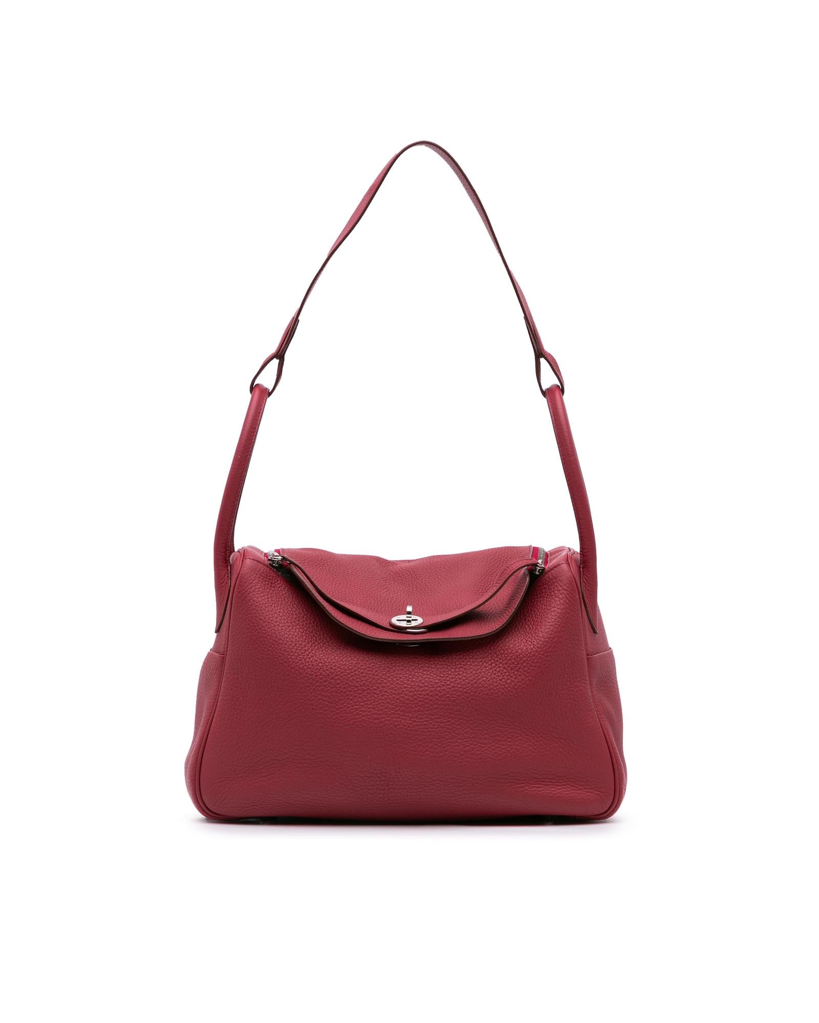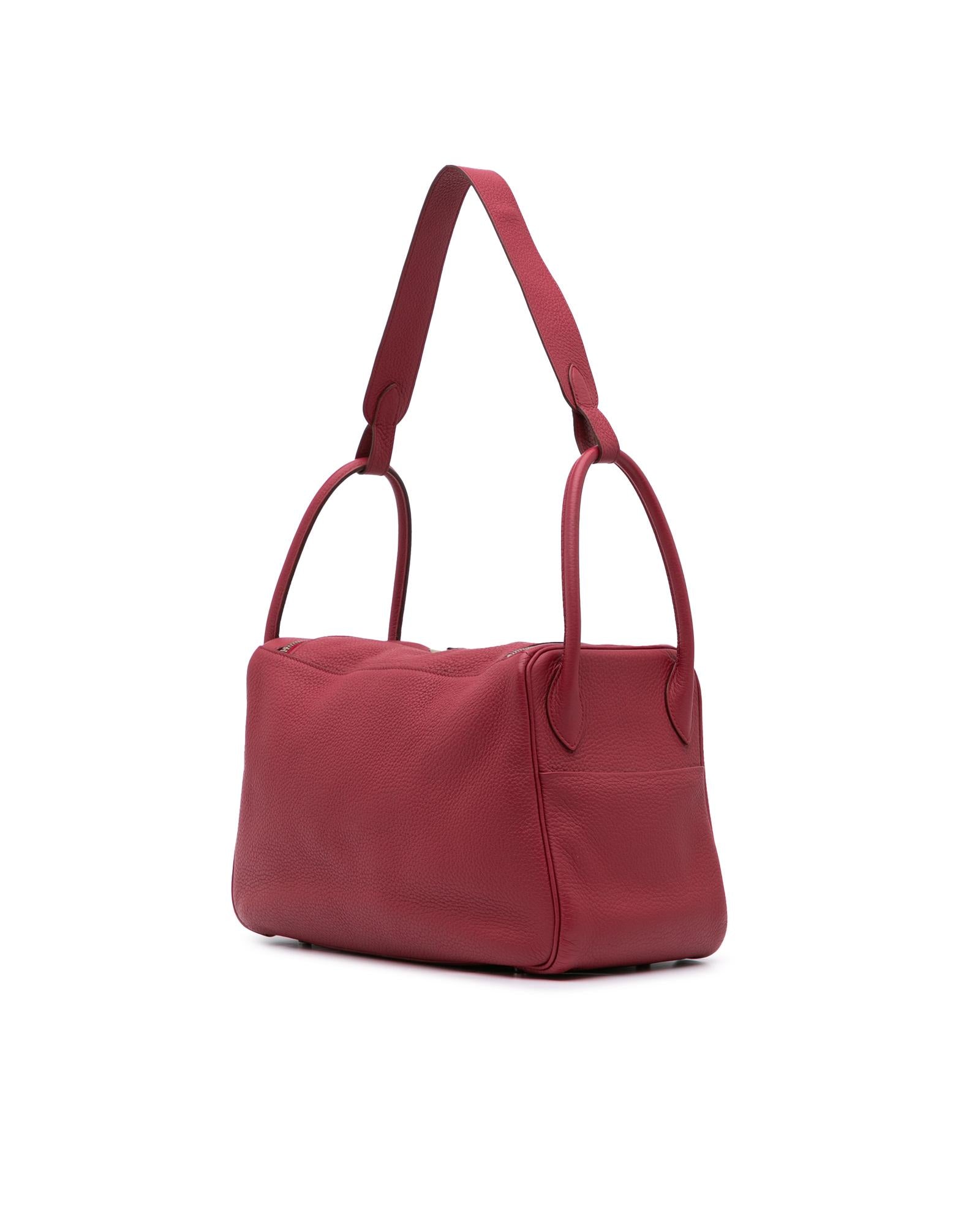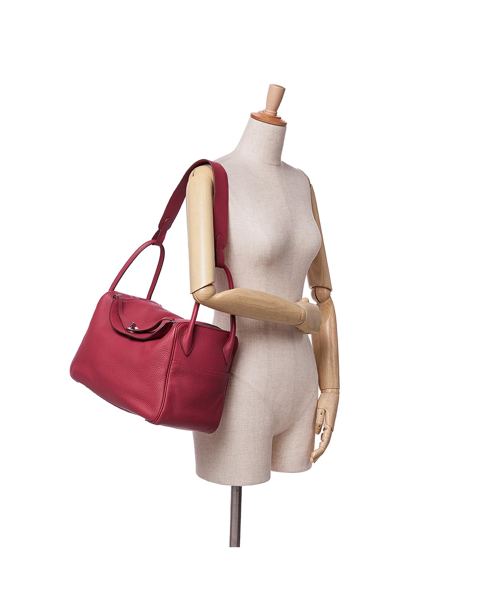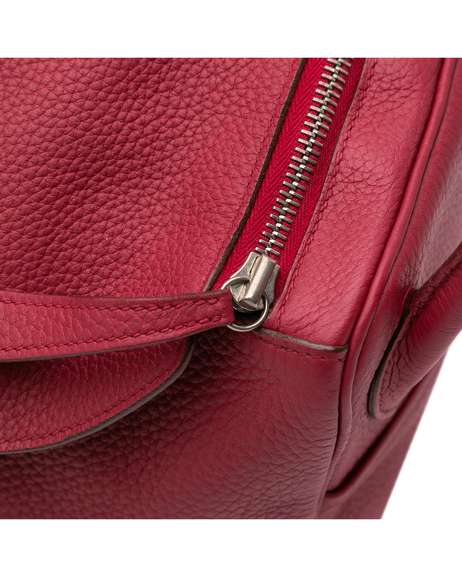 The Lindy features a Clemence leather body in Rubis color rolled handles a flat strap and double top zip closures with a top flap and metal turnlock closure. Parts of the exterior top flap are repainted.Brand: Hermes