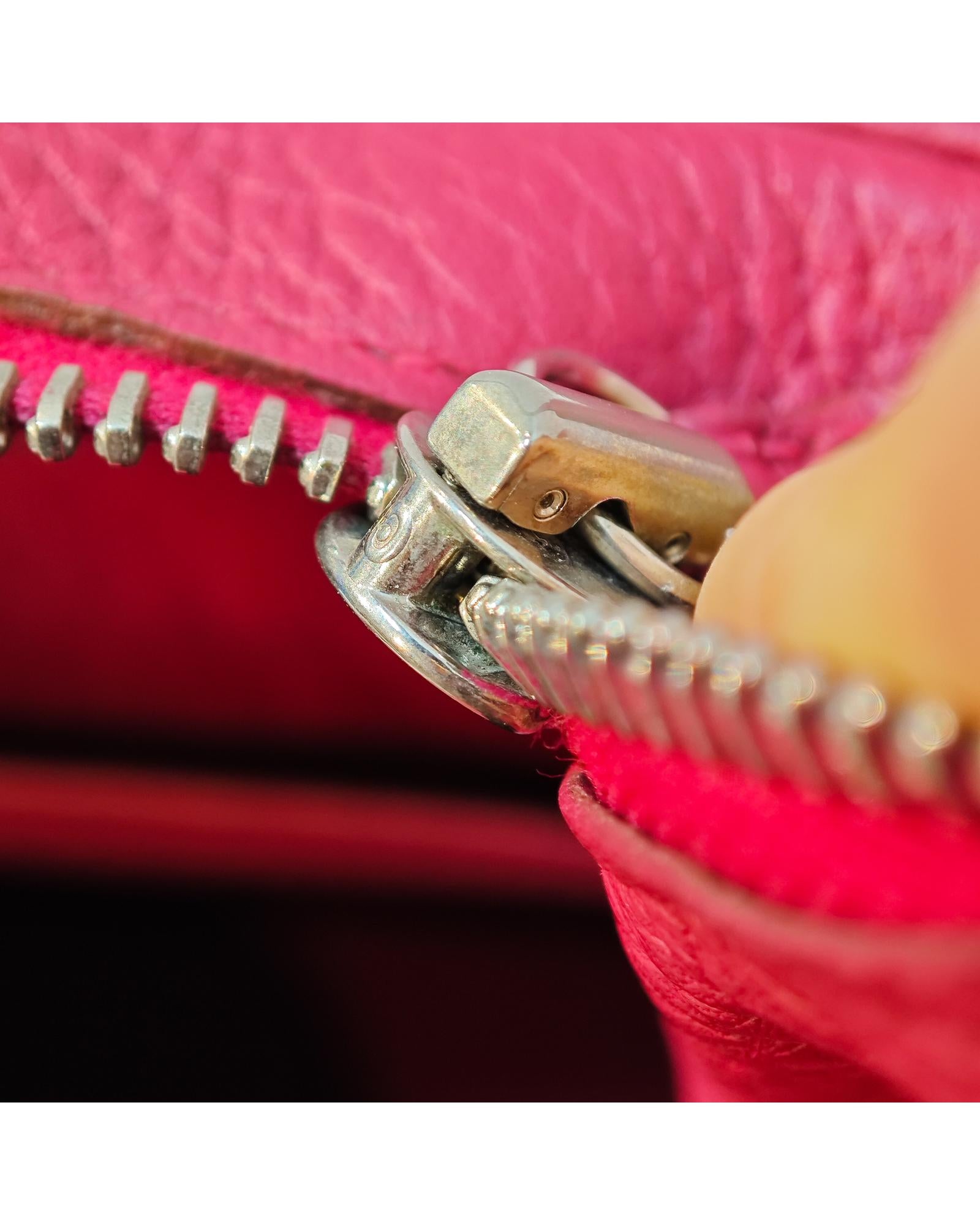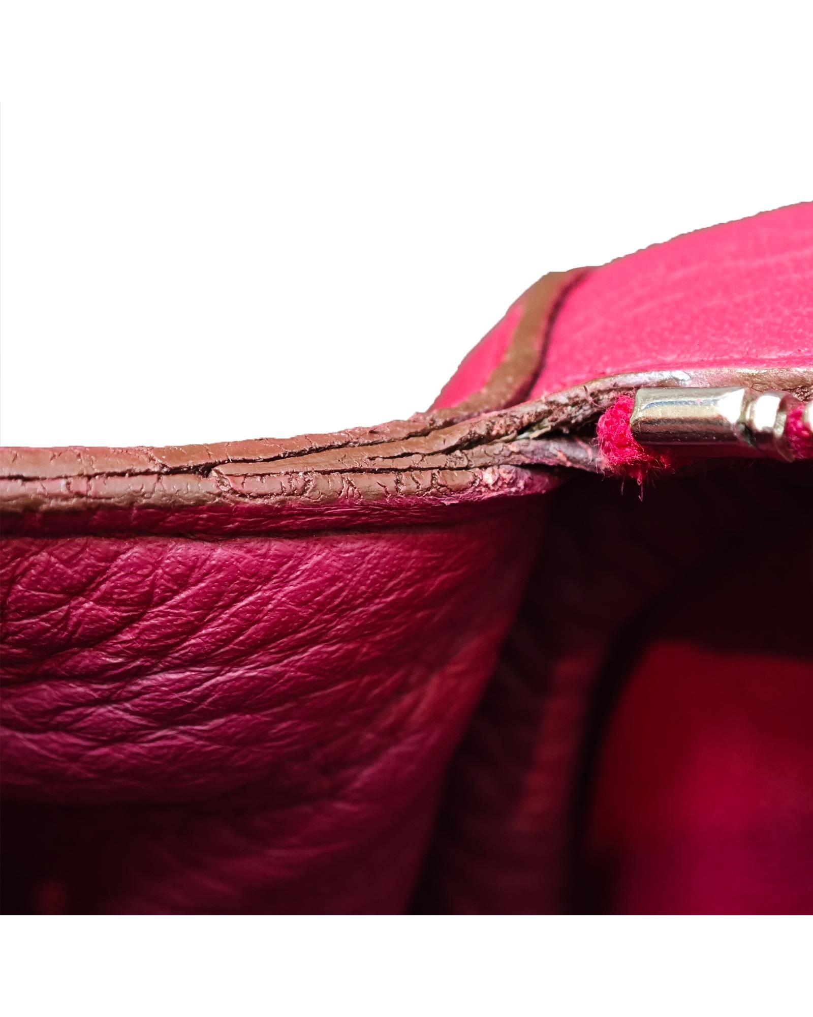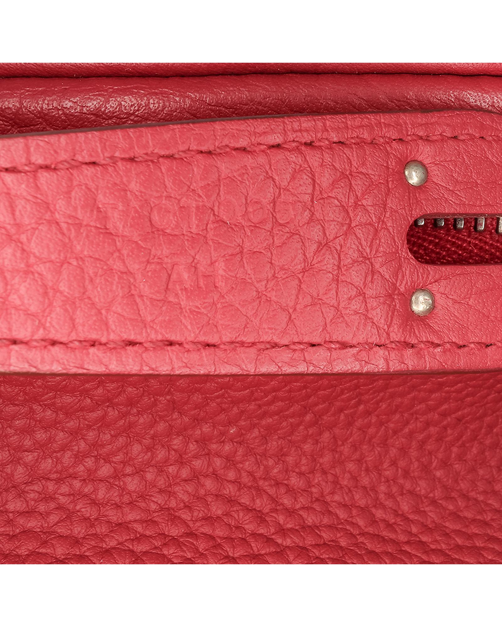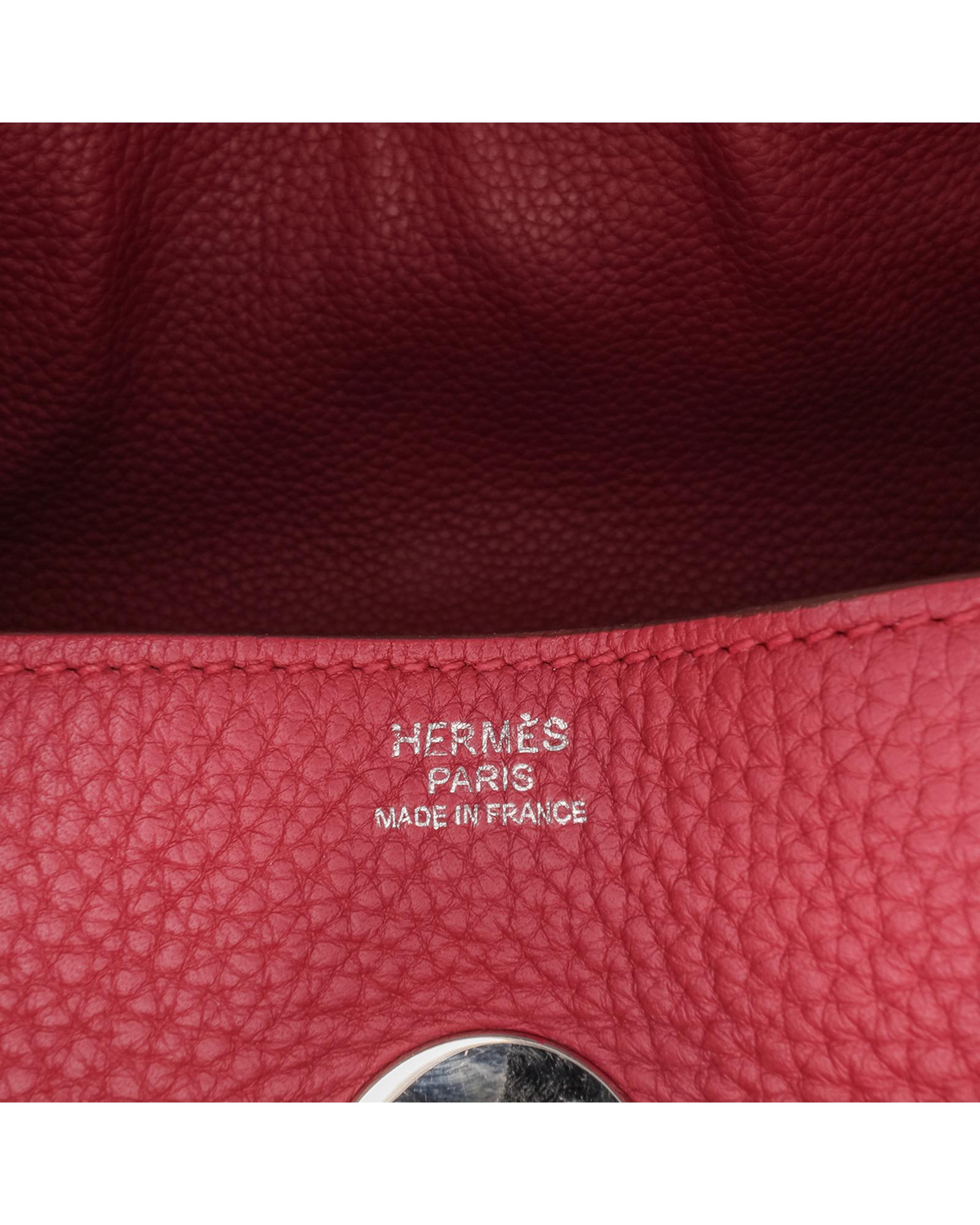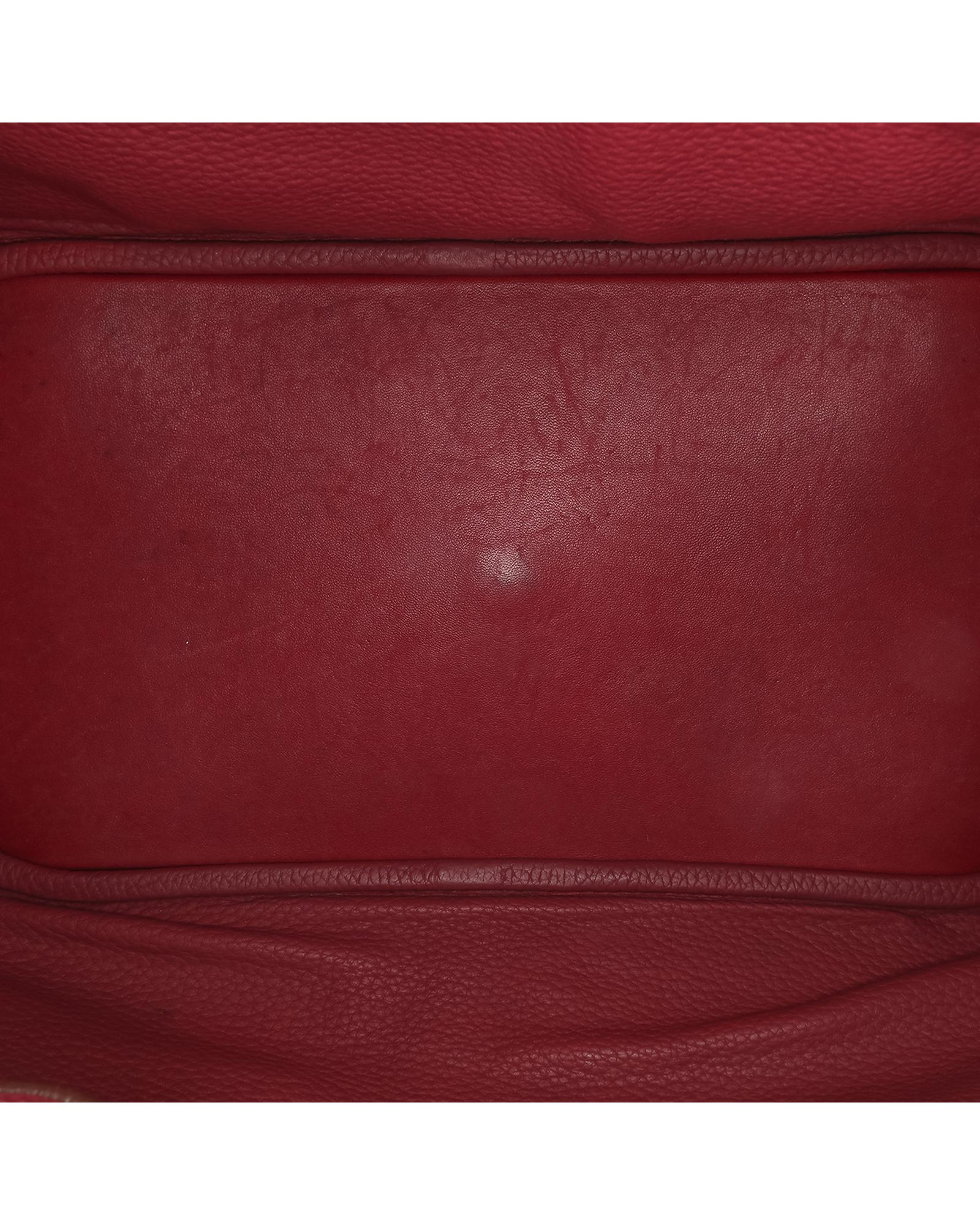 The Lindy features a Clemence leather body in Rubis color rolled handles a flat strap and double top zip closures with a top flap and metal turnlock closure. Parts of the exterior top flap are repainted.Brand: Hermes