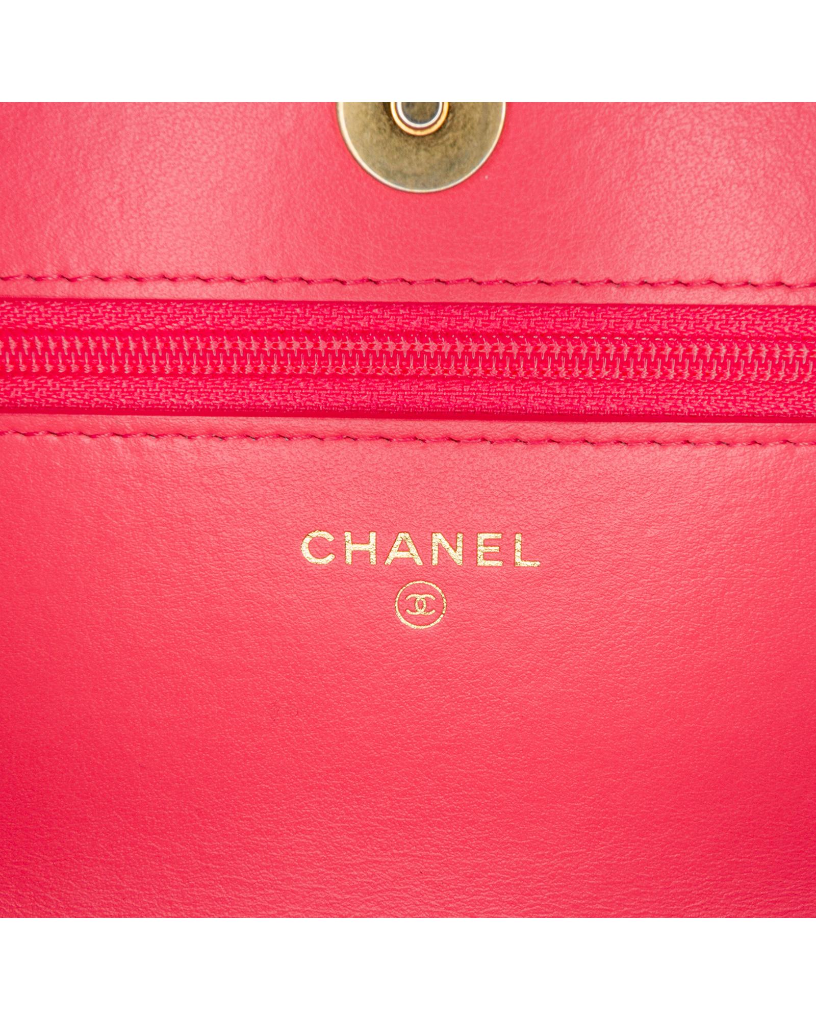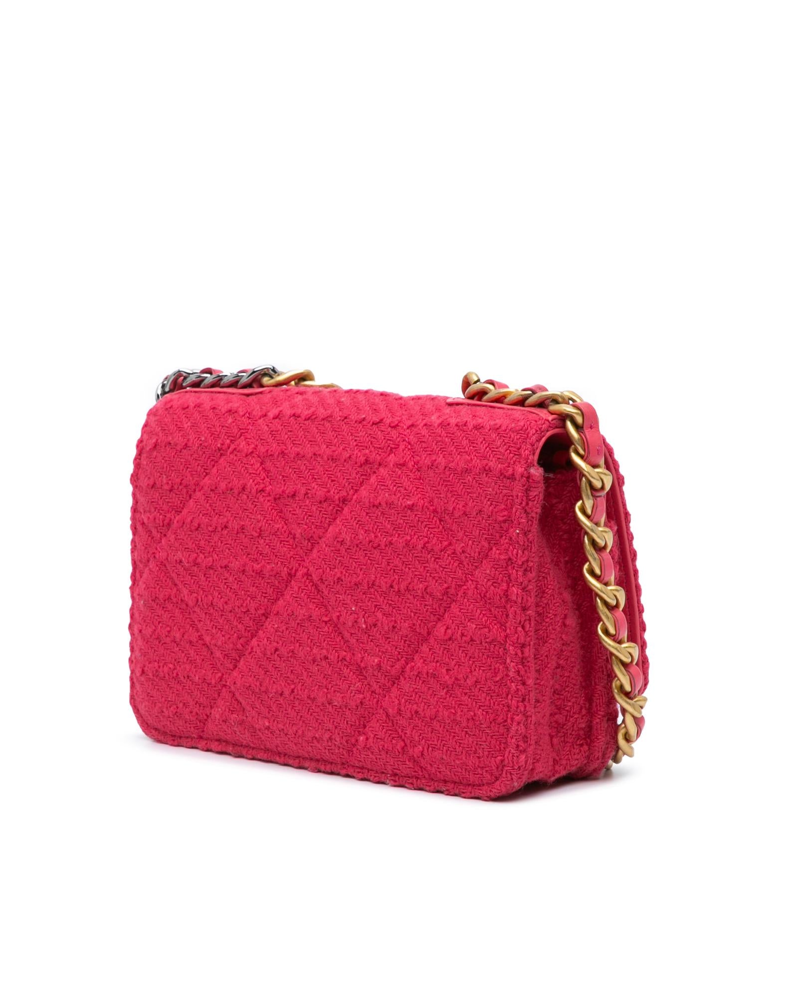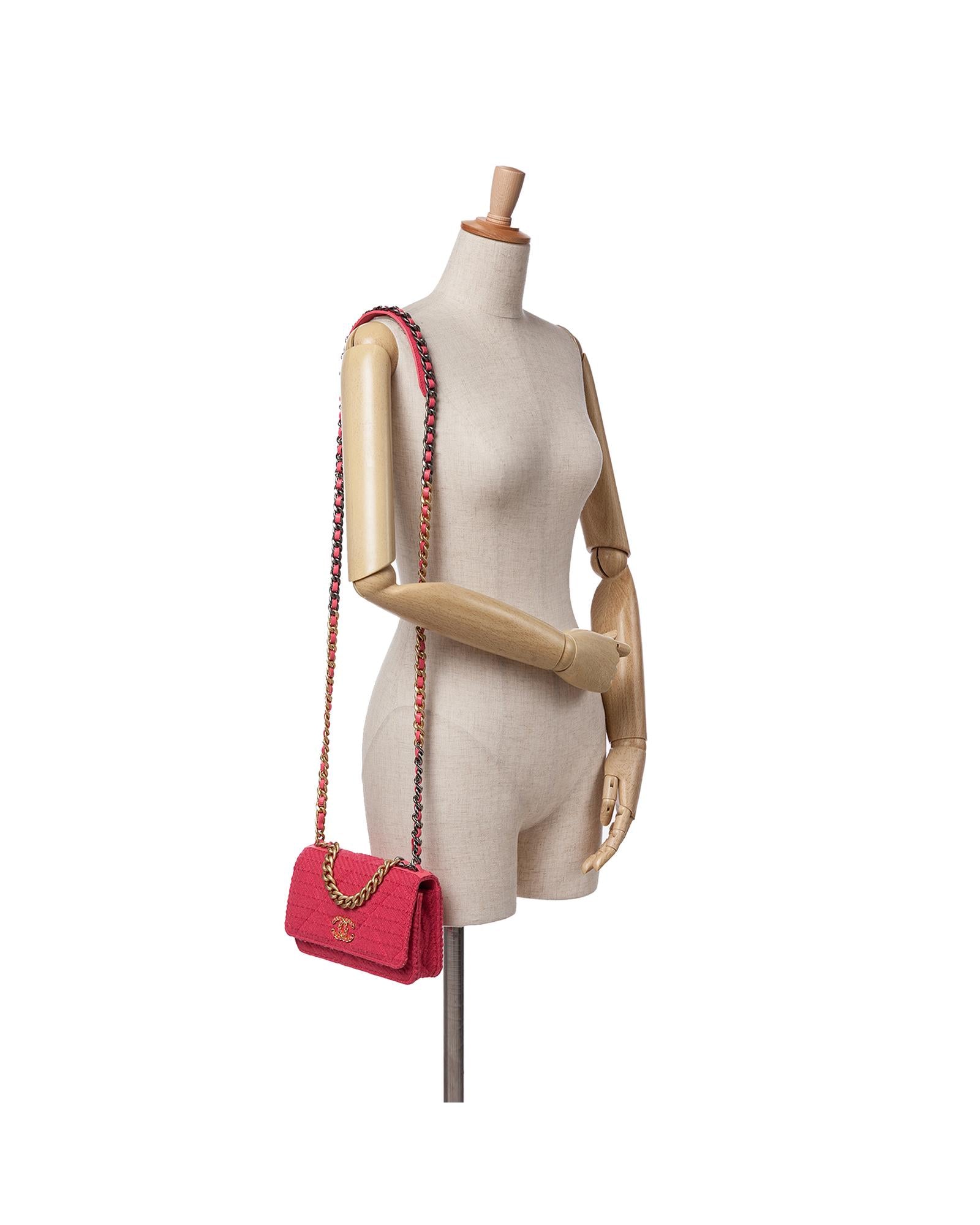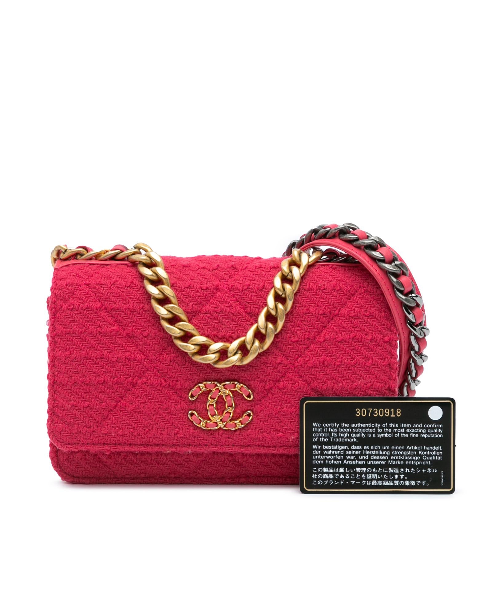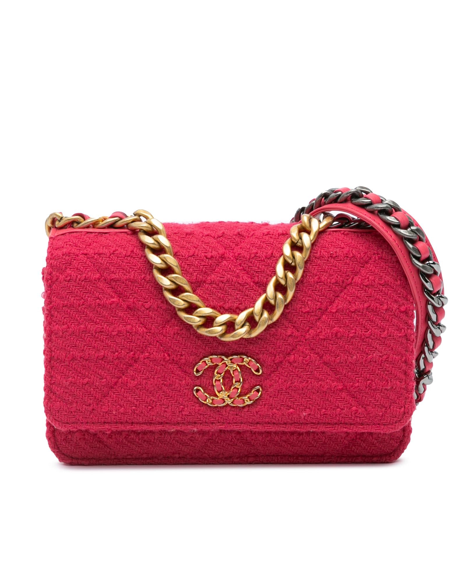 The 19 wallet on chain features a tweed body a chain-link handle a leather woven-in chain strap with a leather shoulder guard a front flap with snap button closure and interior zip and slip pockets.Brand: Chanel