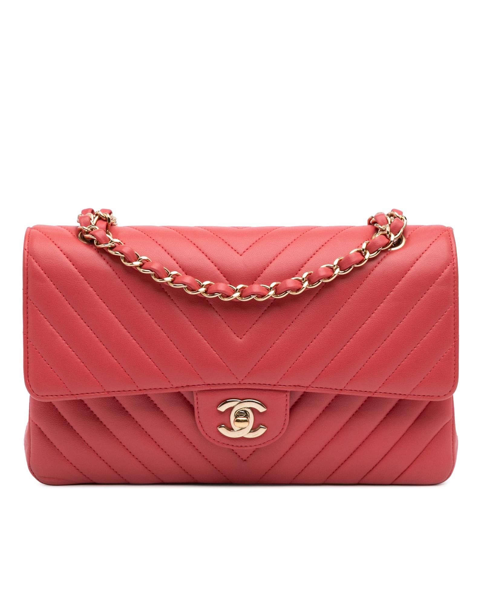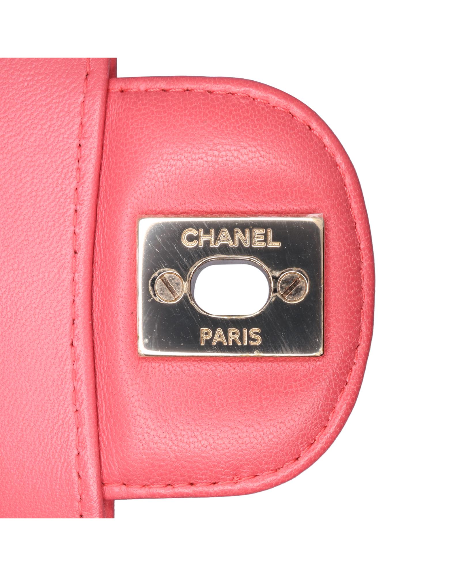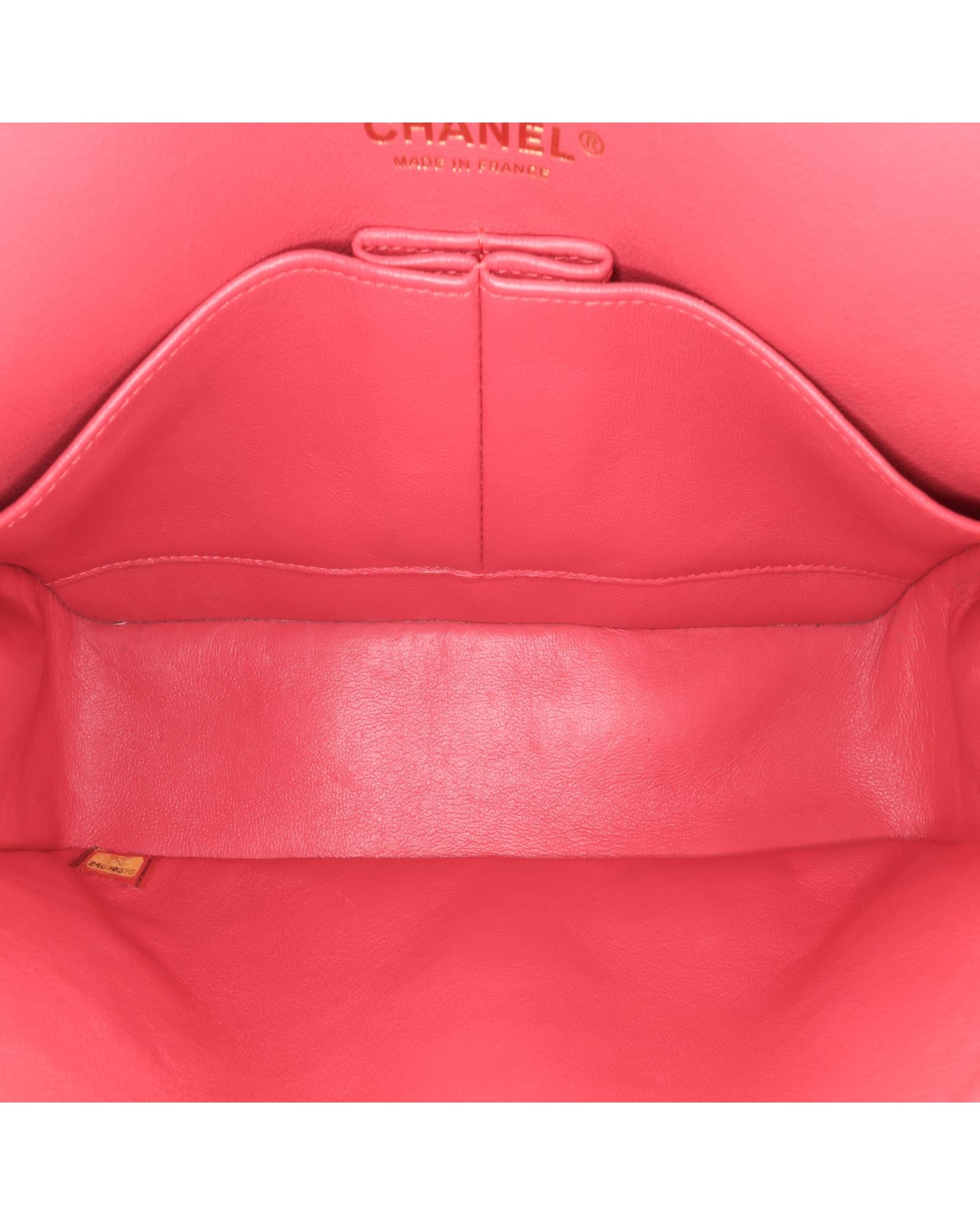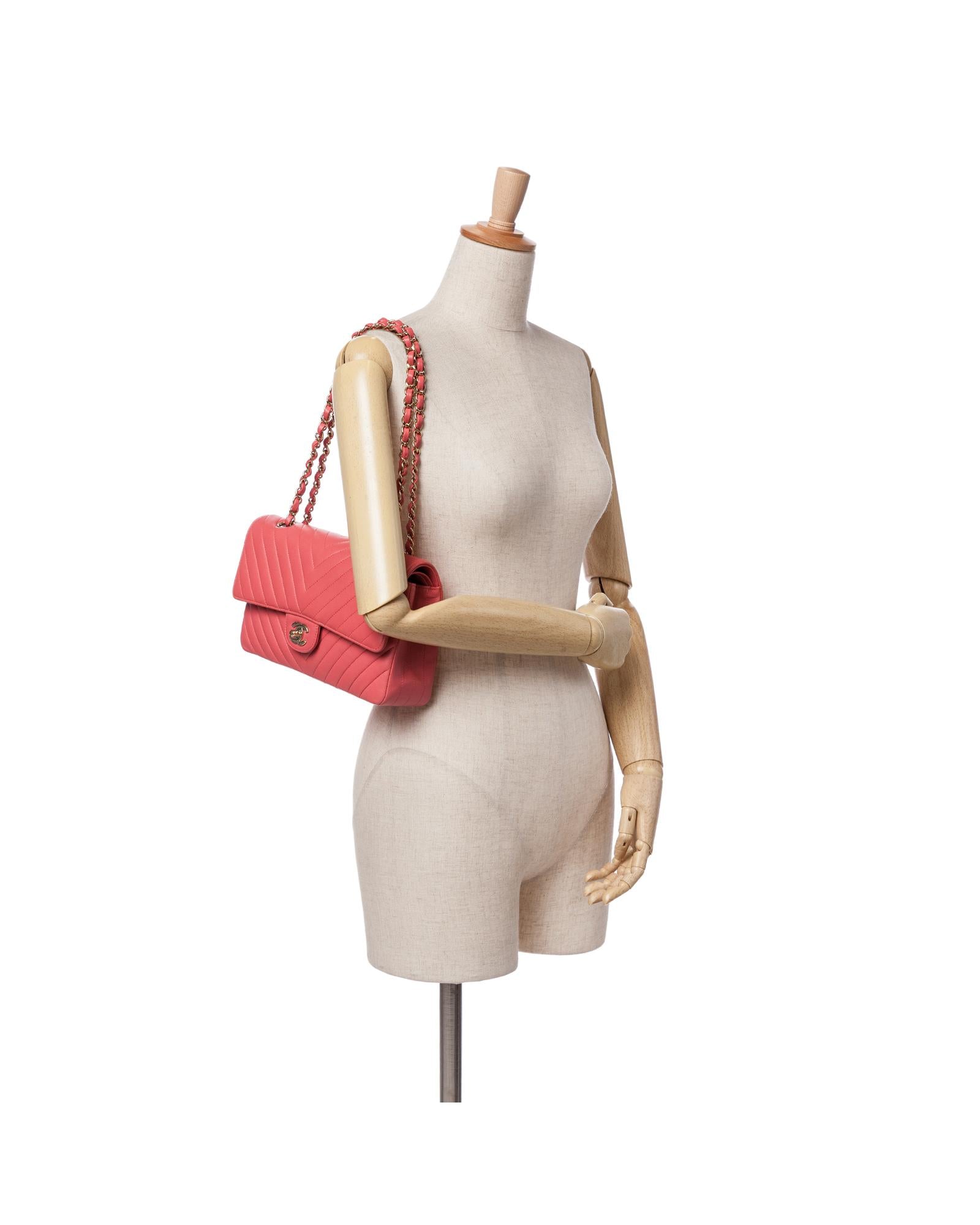 This shoulder bag features a quilted lambskin leather body a leather woven chain shoulder strap front flaps with interlocking Cs and twist lock closure an exterior back slip pocket and interior zip and slip pockets.