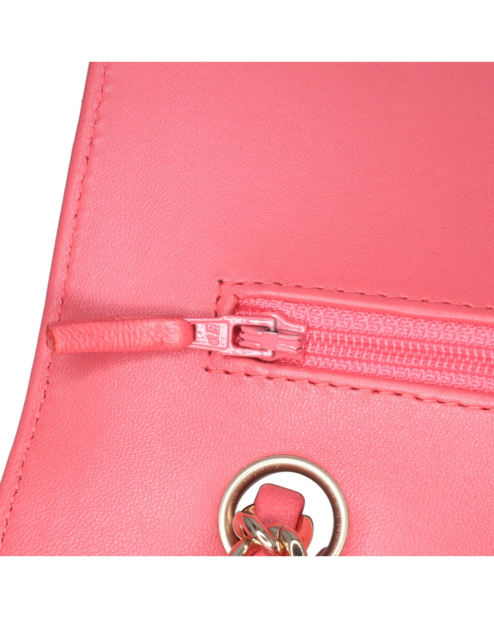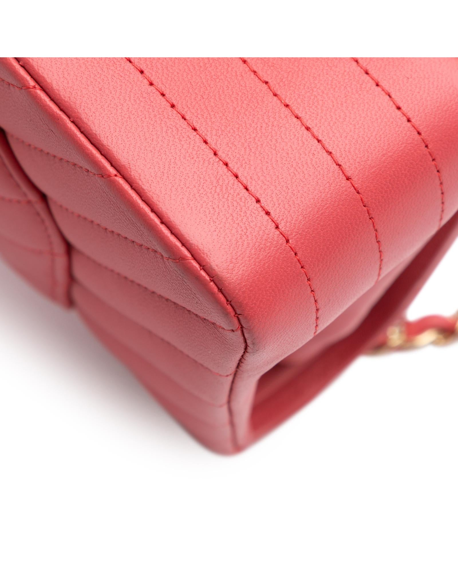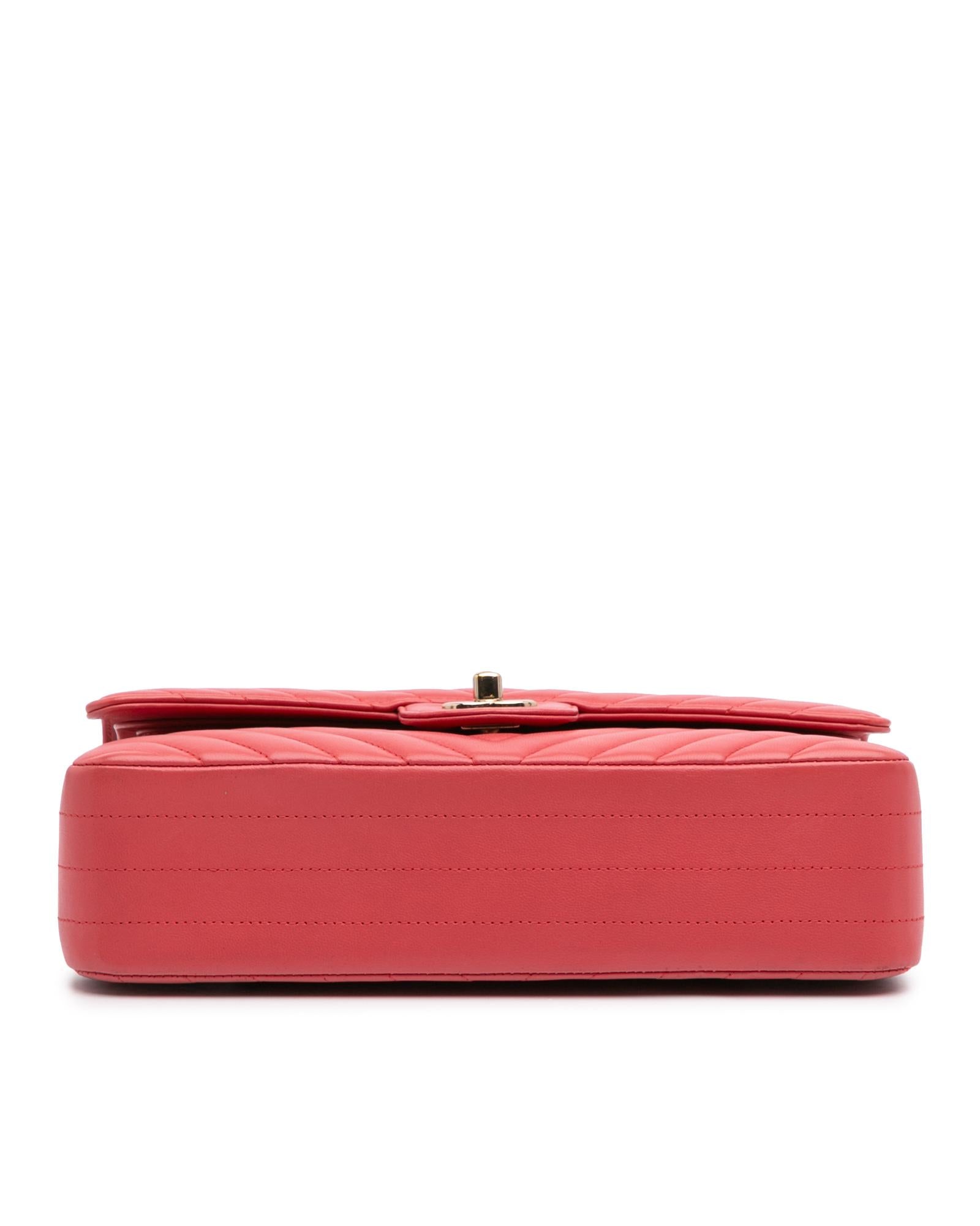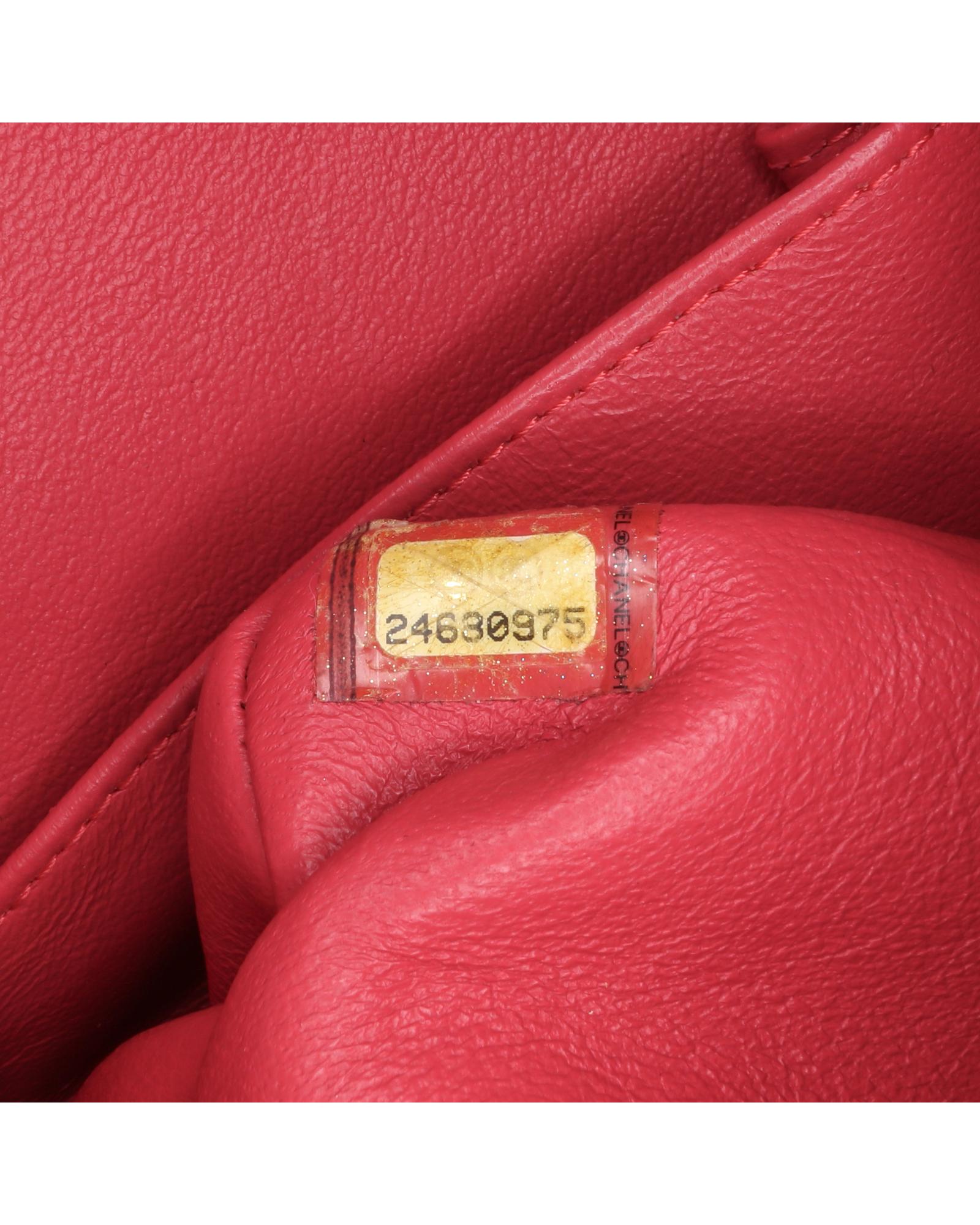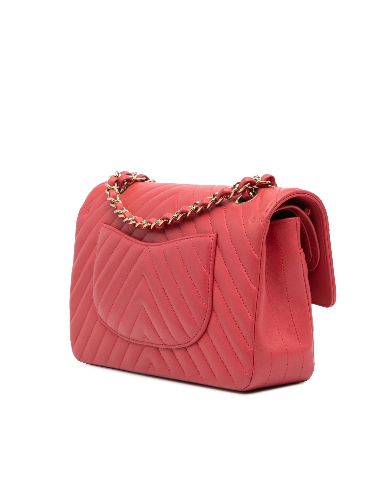 This shoulder bag features a quilted lambskin leather body a leather woven chain shoulder strap front flaps with interlocking Cs and twist lock closure an exterior back slip pocket and interior zip and slip pockets.