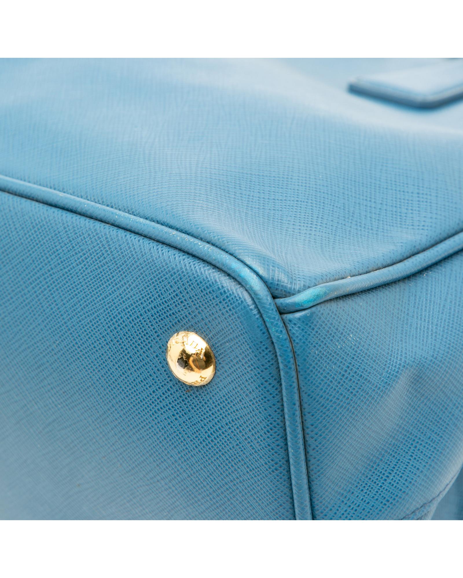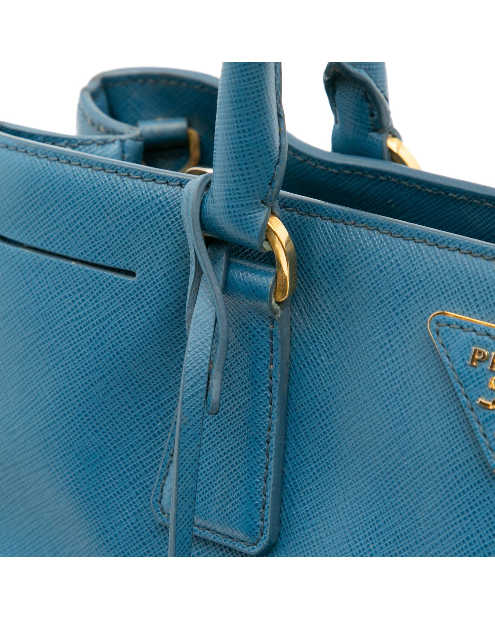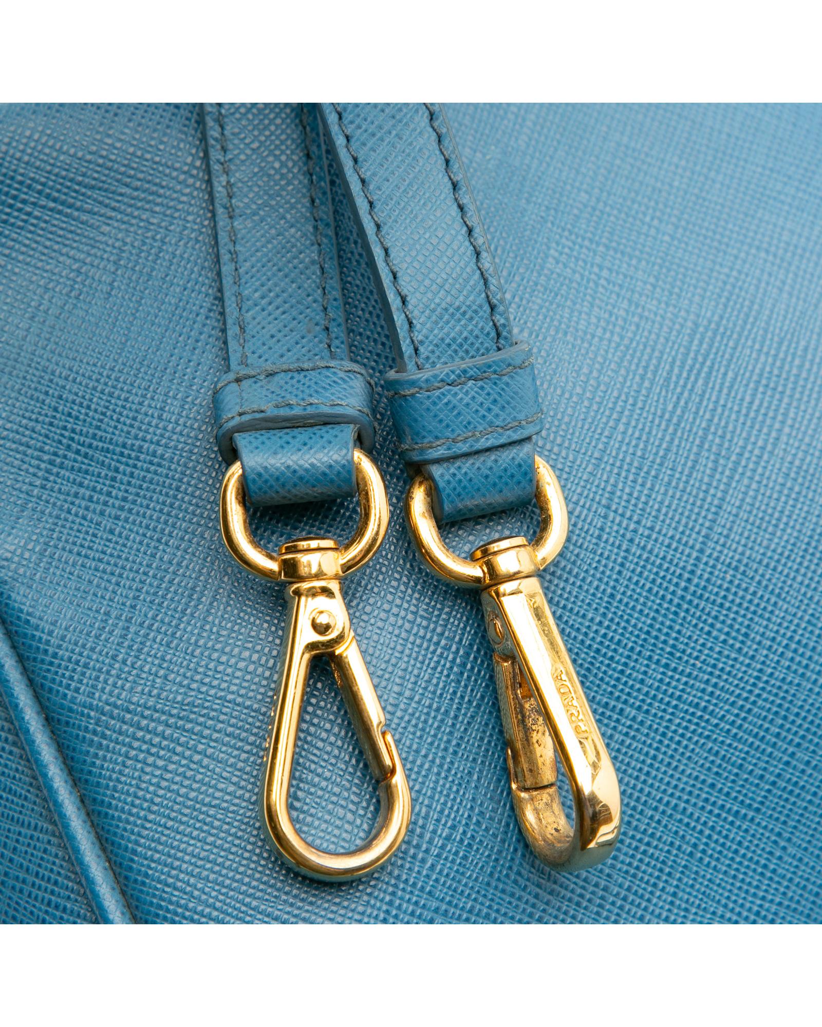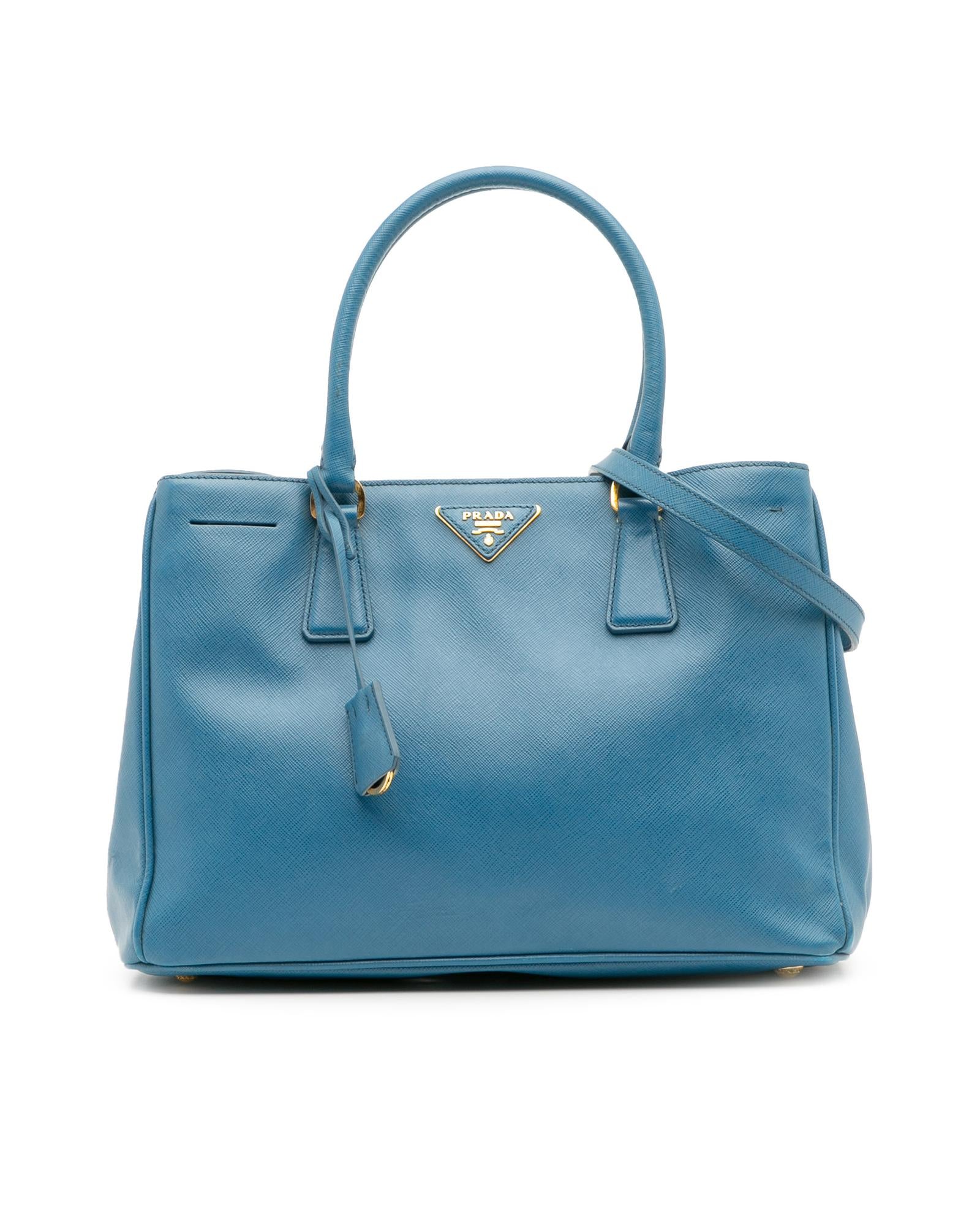 The Galleria satchel features a saffiano leather body rolled leather handles a detachable flat leather shoulder strap an open top with snap closure an interior zip compartment and interior zip and slip pockets.Brand: Prada Vintage