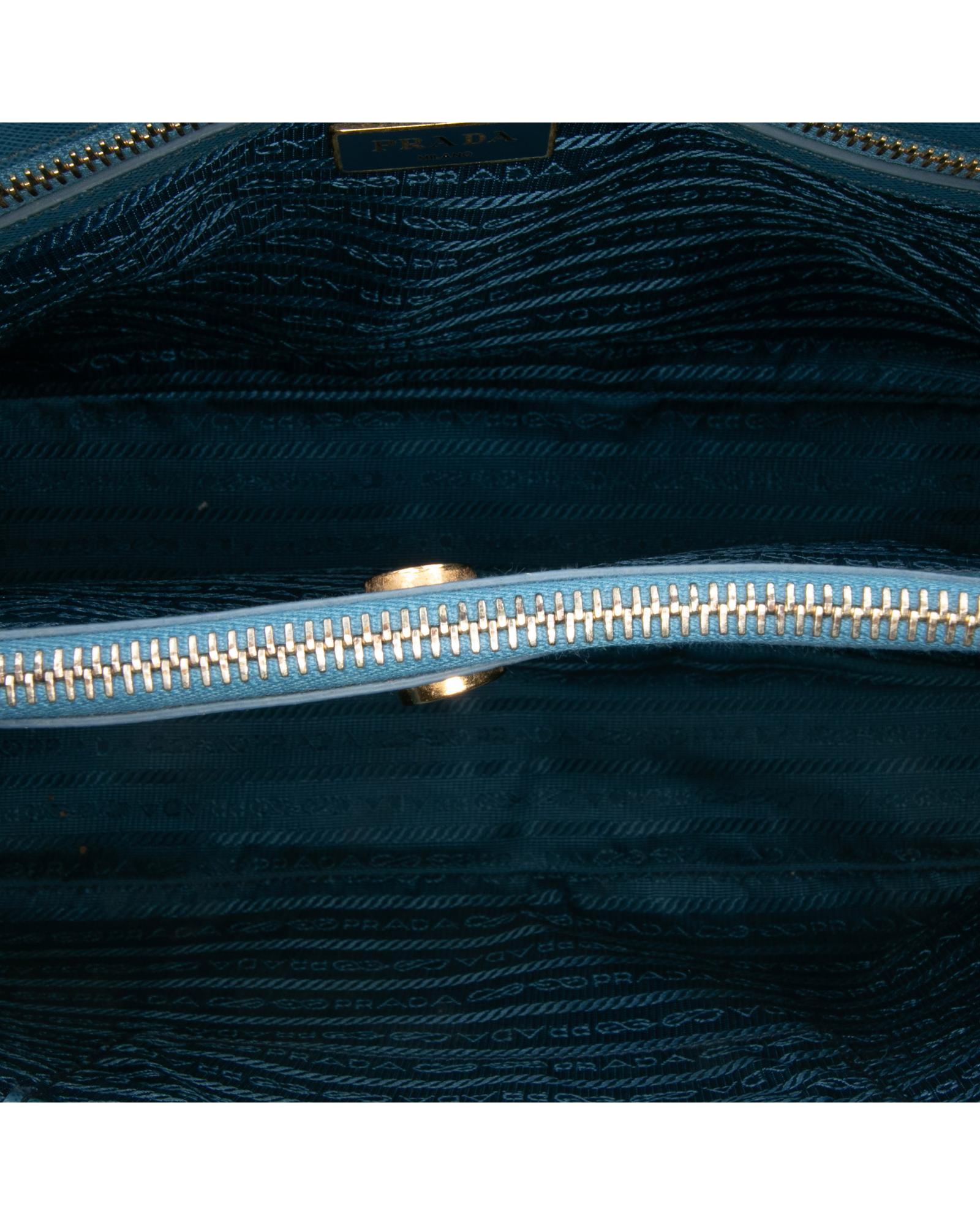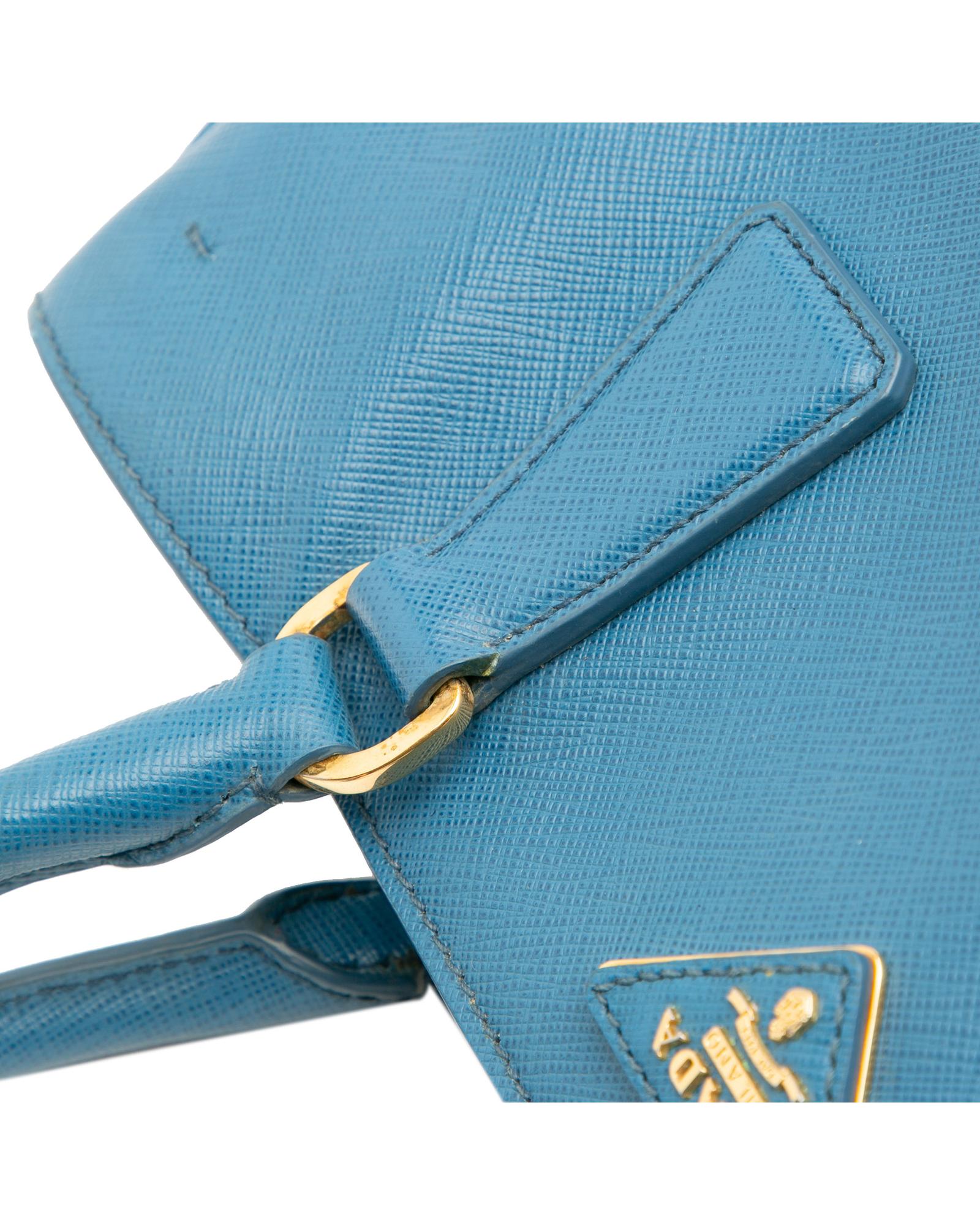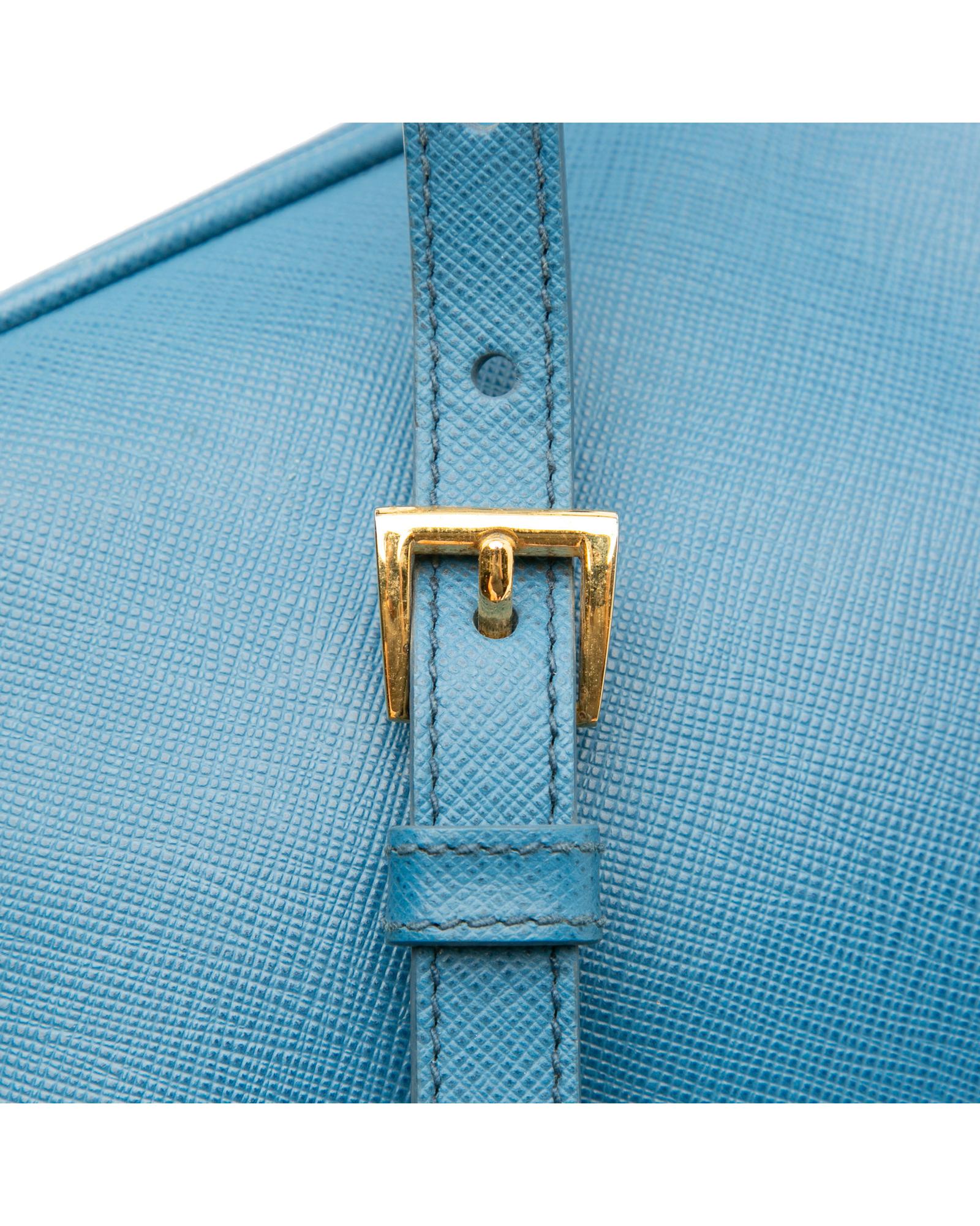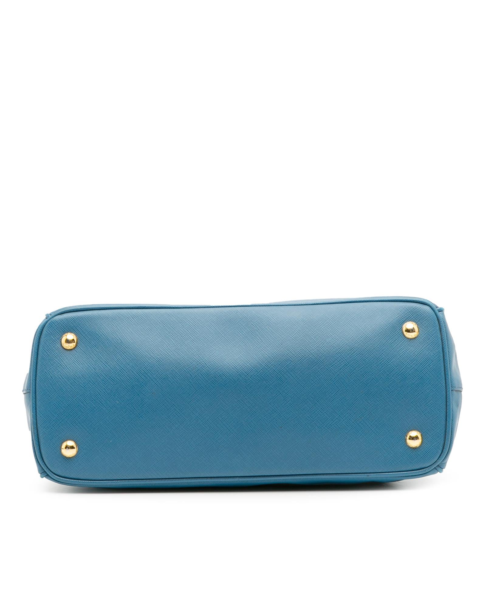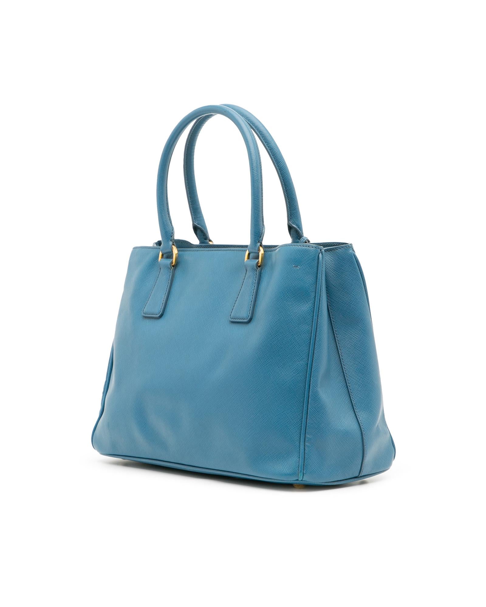 The Galleria satchel features a saffiano leather body rolled leather handles a detachable flat leather shoulder strap an open top with snap closure an interior zip compartment and interior zip and slip pockets.Brand: Prada Vintage