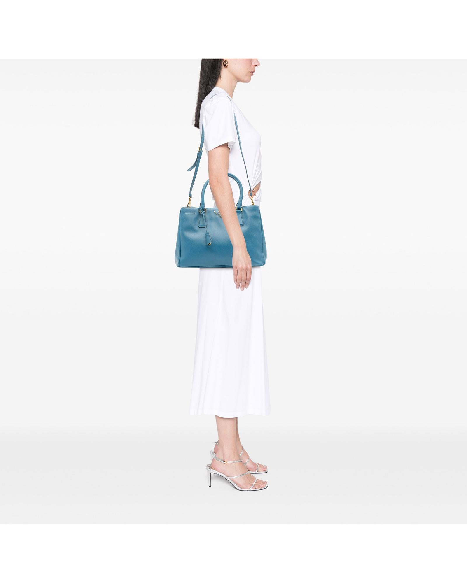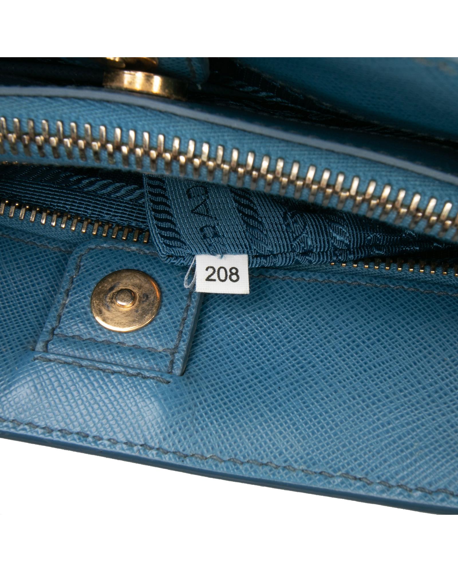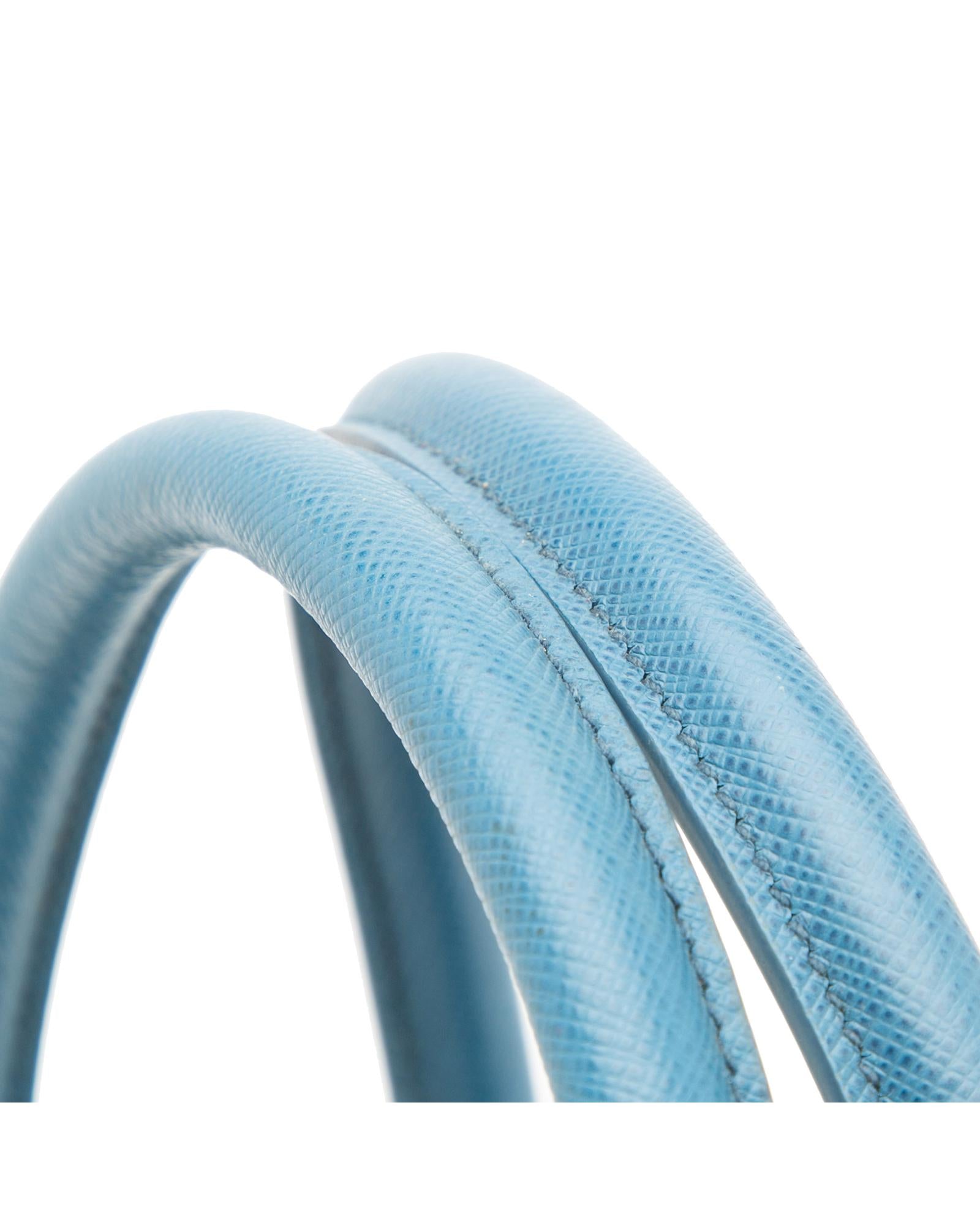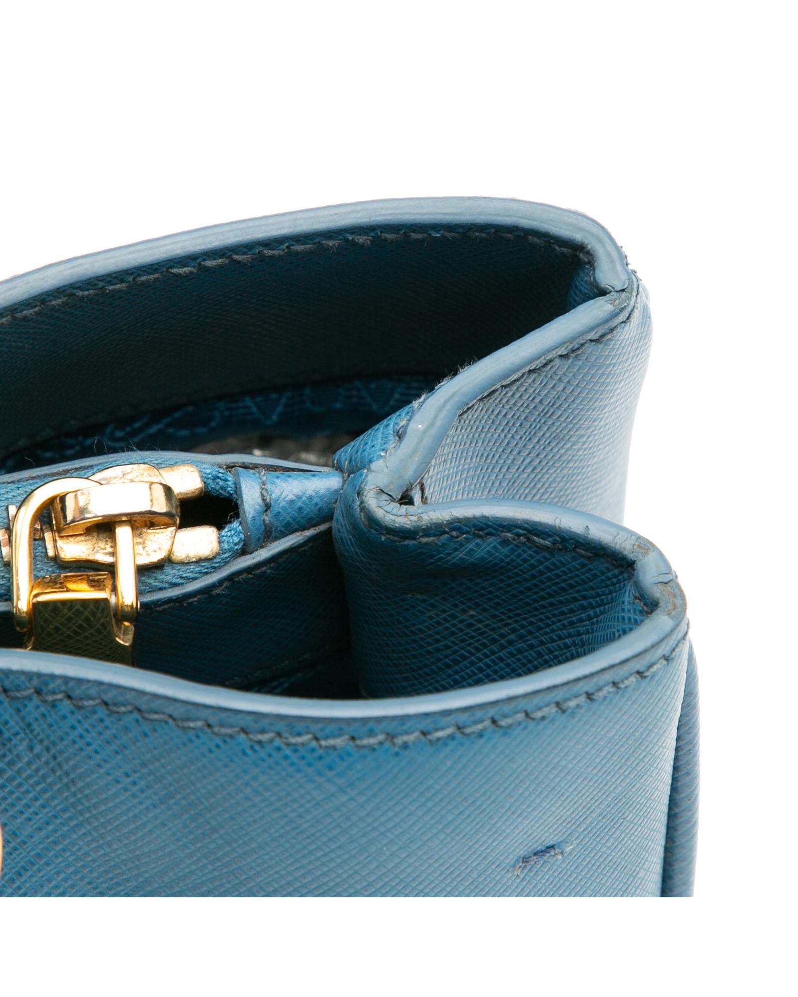 The Galleria satchel features a saffiano leather body rolled leather handles a detachable flat leather shoulder strap an open top with snap closure an interior zip compartment and interior zip and slip pockets.Brand: Prada Vintage