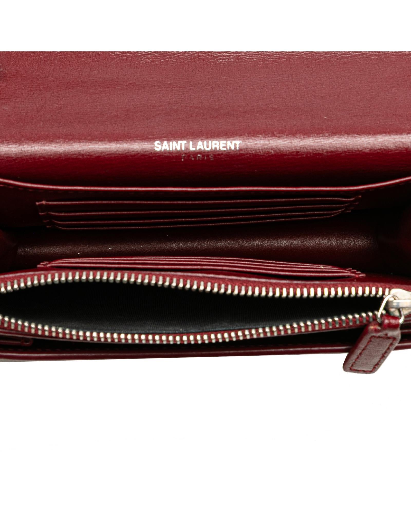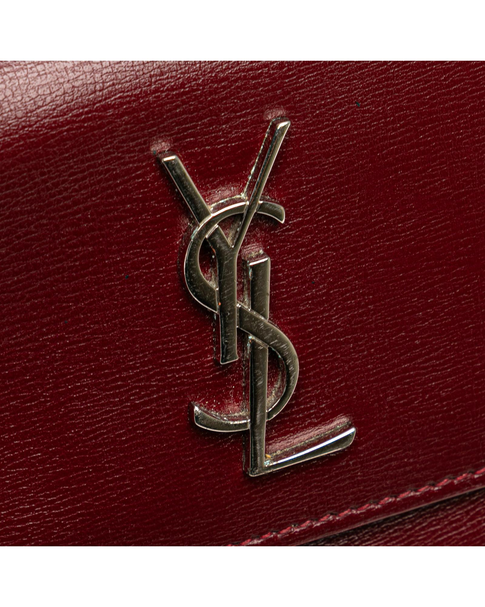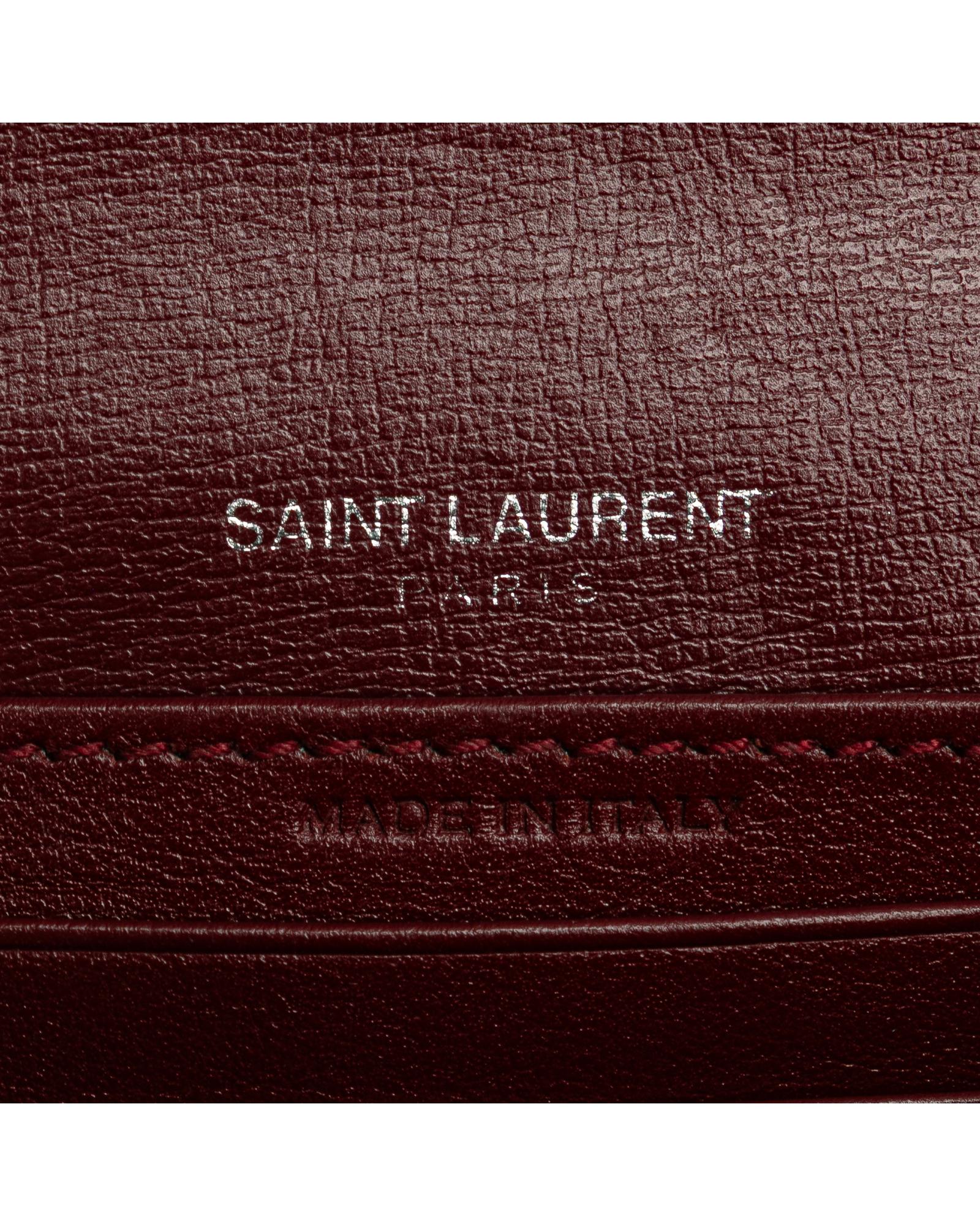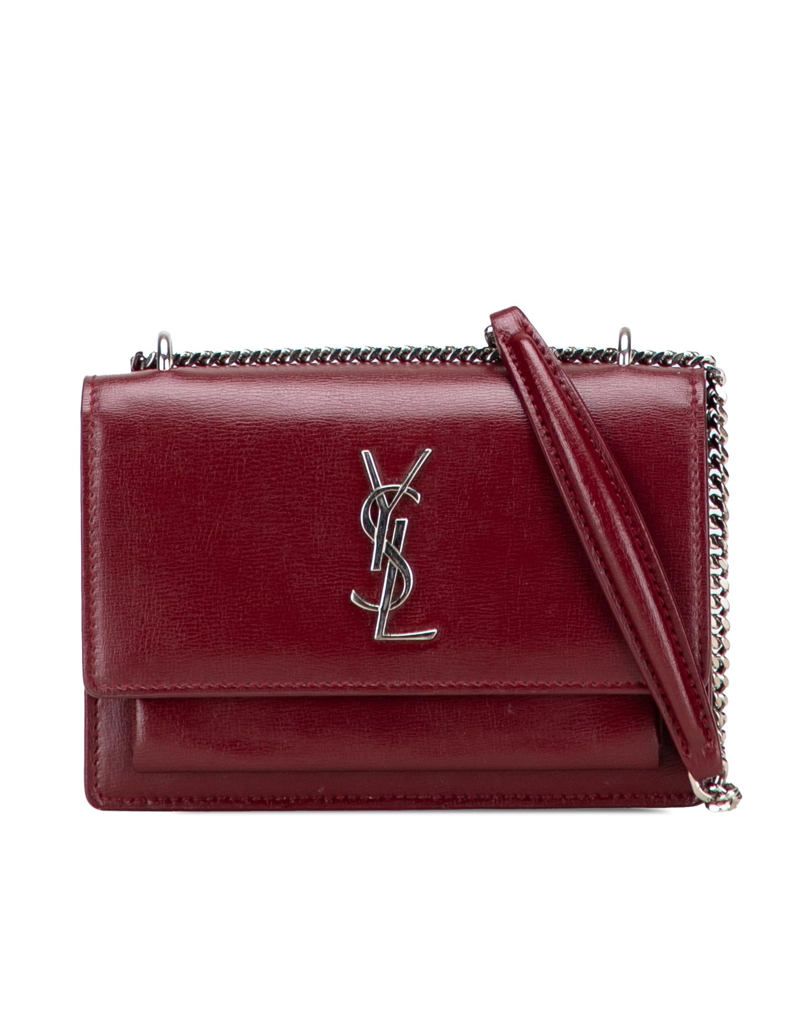 The Sunset chain wallet features a leather body a chain link shoulder strap with leather guard a top flap with magnetic snap button closure an exterior front open pocket and interior zip and slip compartments.Brand: Saint Laurent Vintage